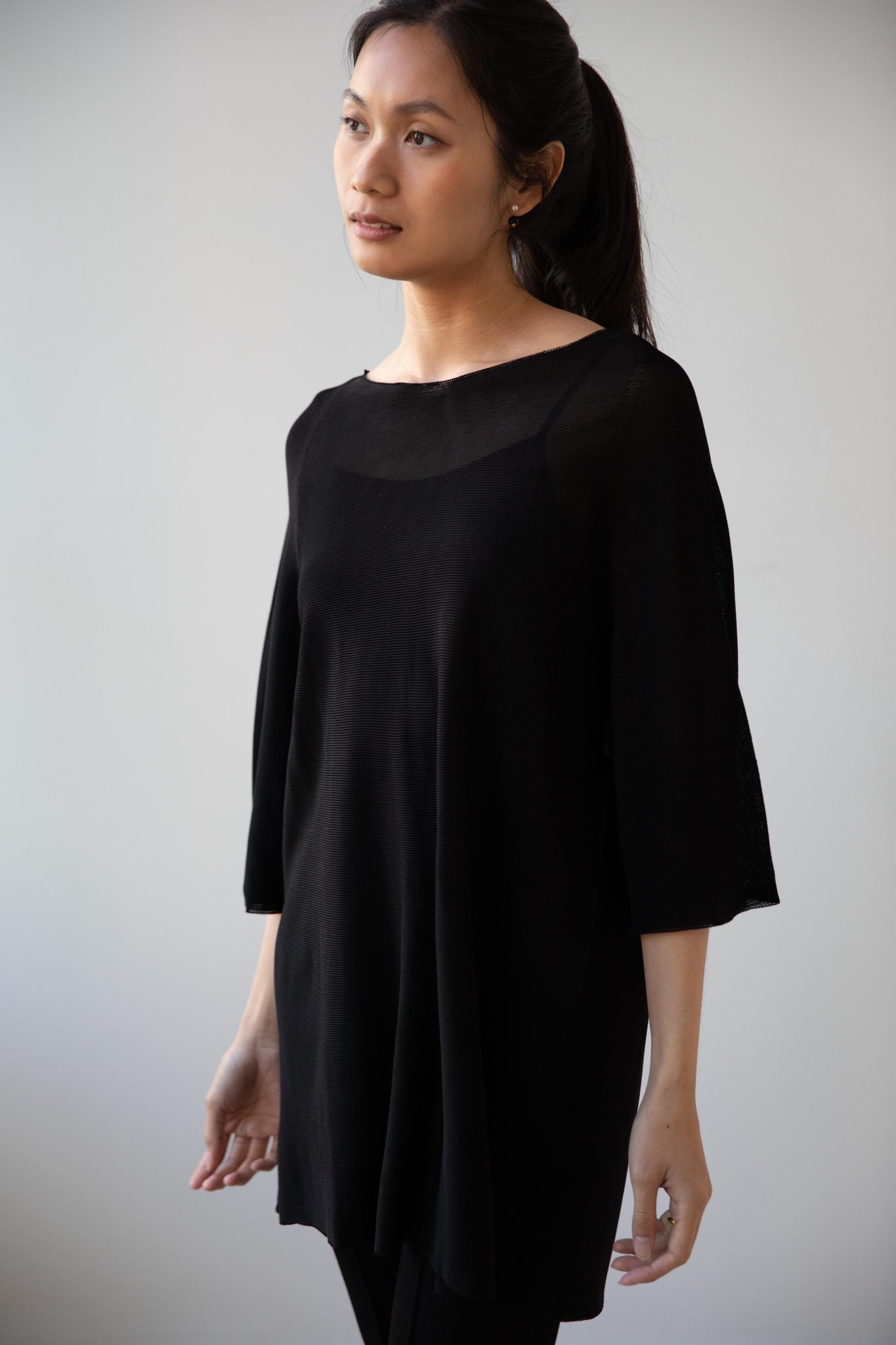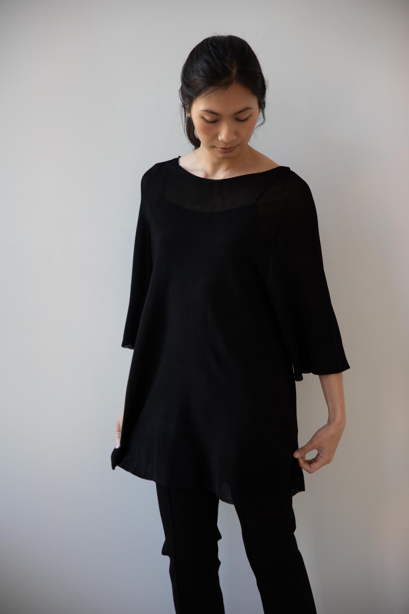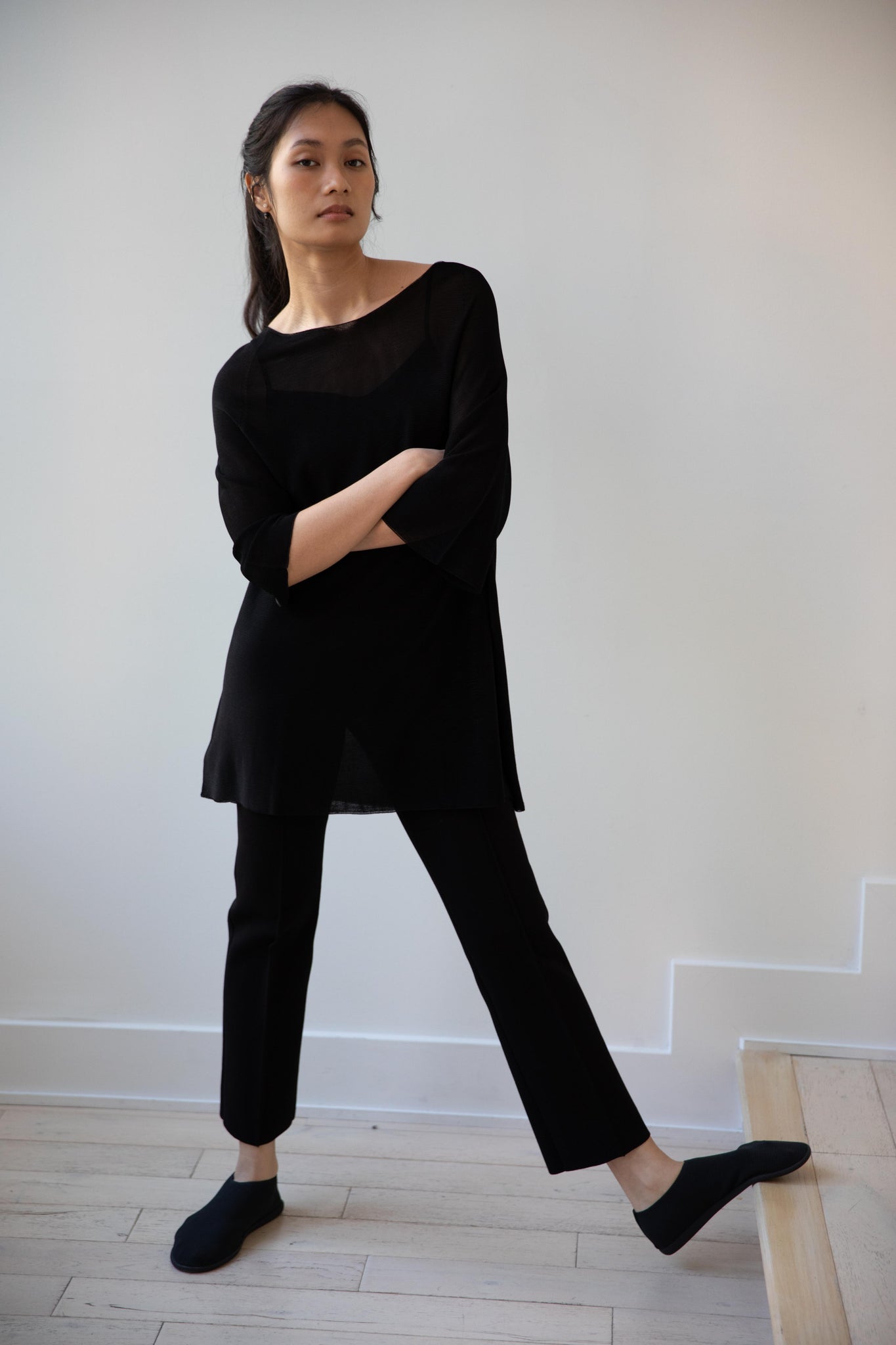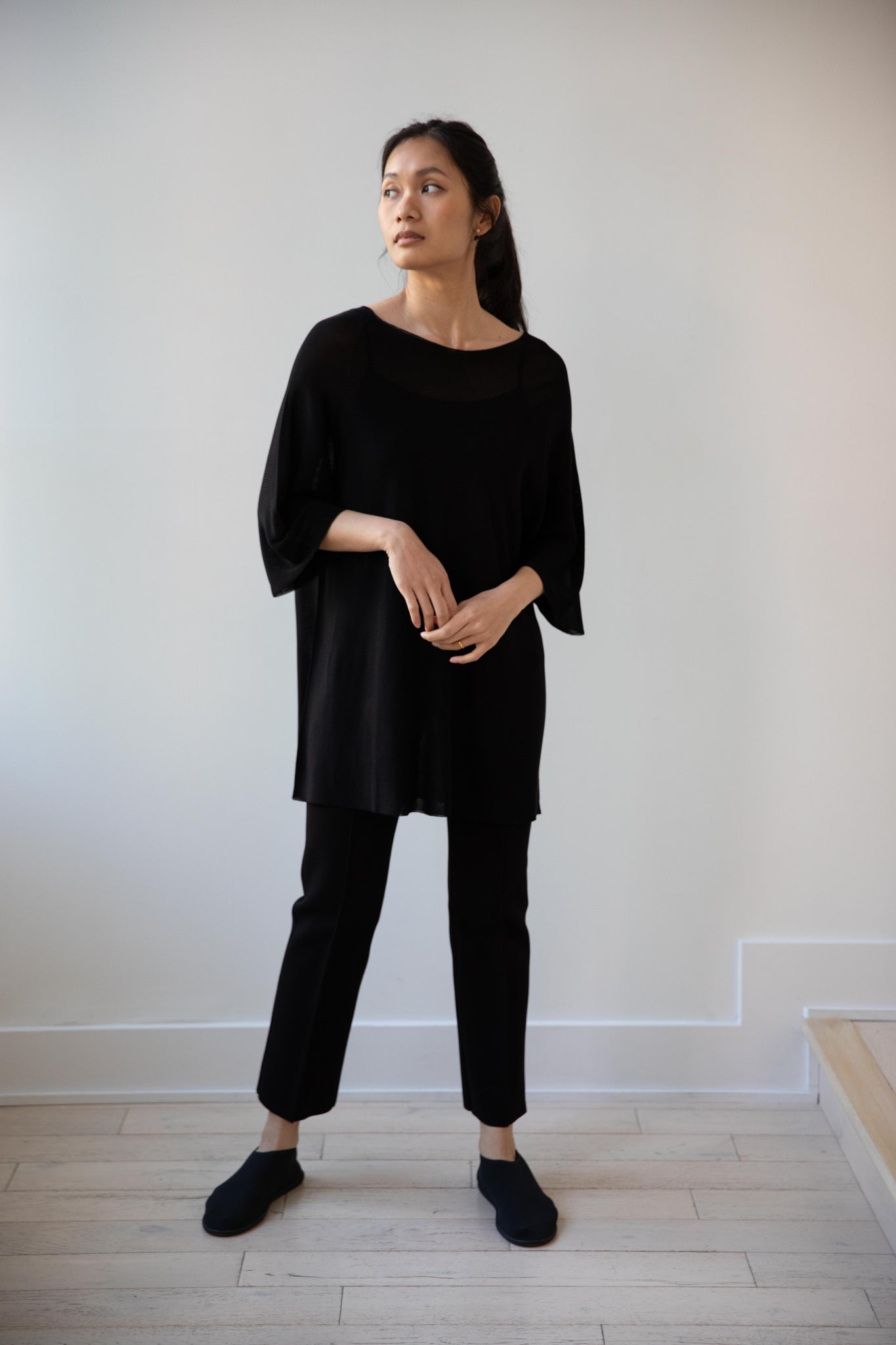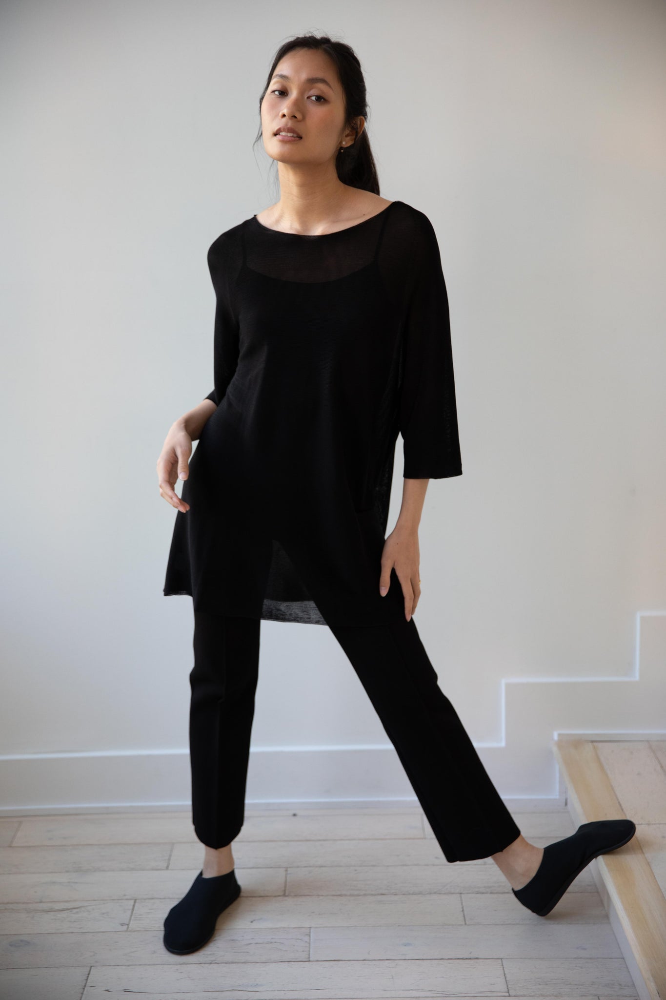 Cancellato Uniform's viscose knits are perfect for summer. Made from a lightweight yarn that very breathable, we are happy to have many styles in it this season so you can mix and match to get an ideal layered look, something the line is so good at. This elongated tunic is a great style over one of their loose trousers, or a narrow trouser, like this High Sport one.