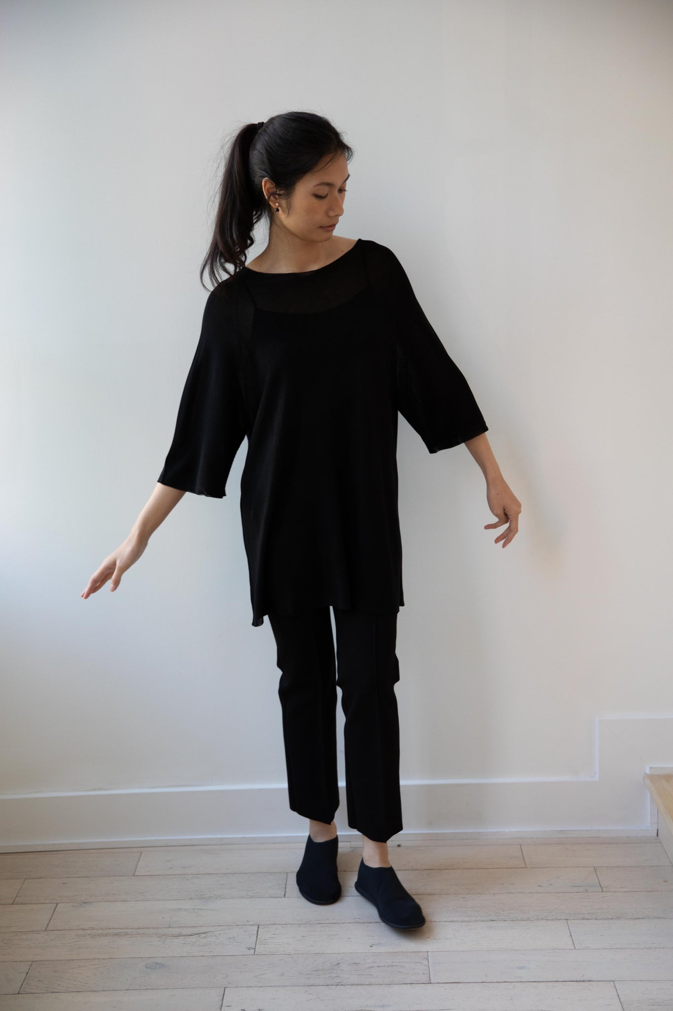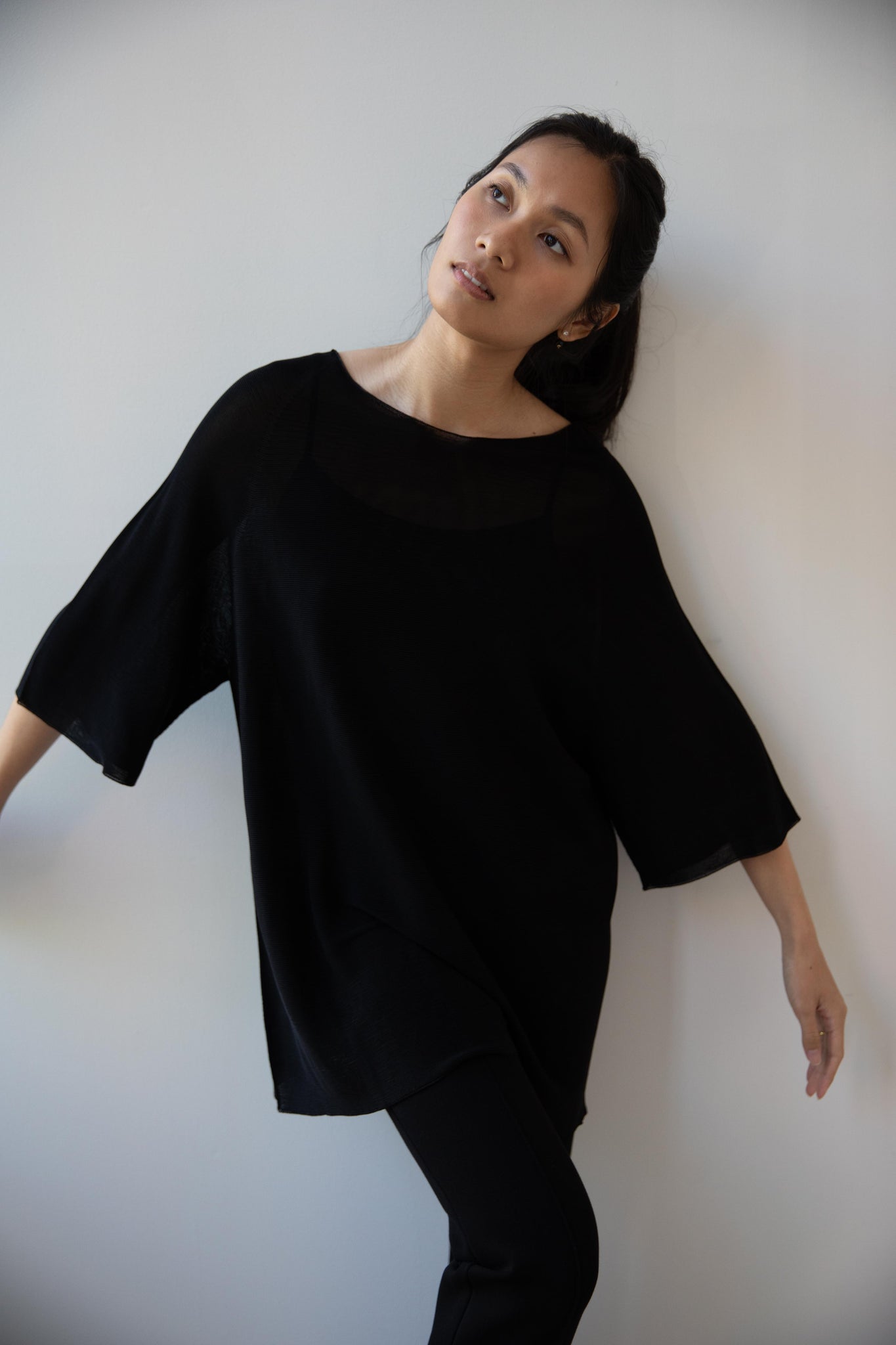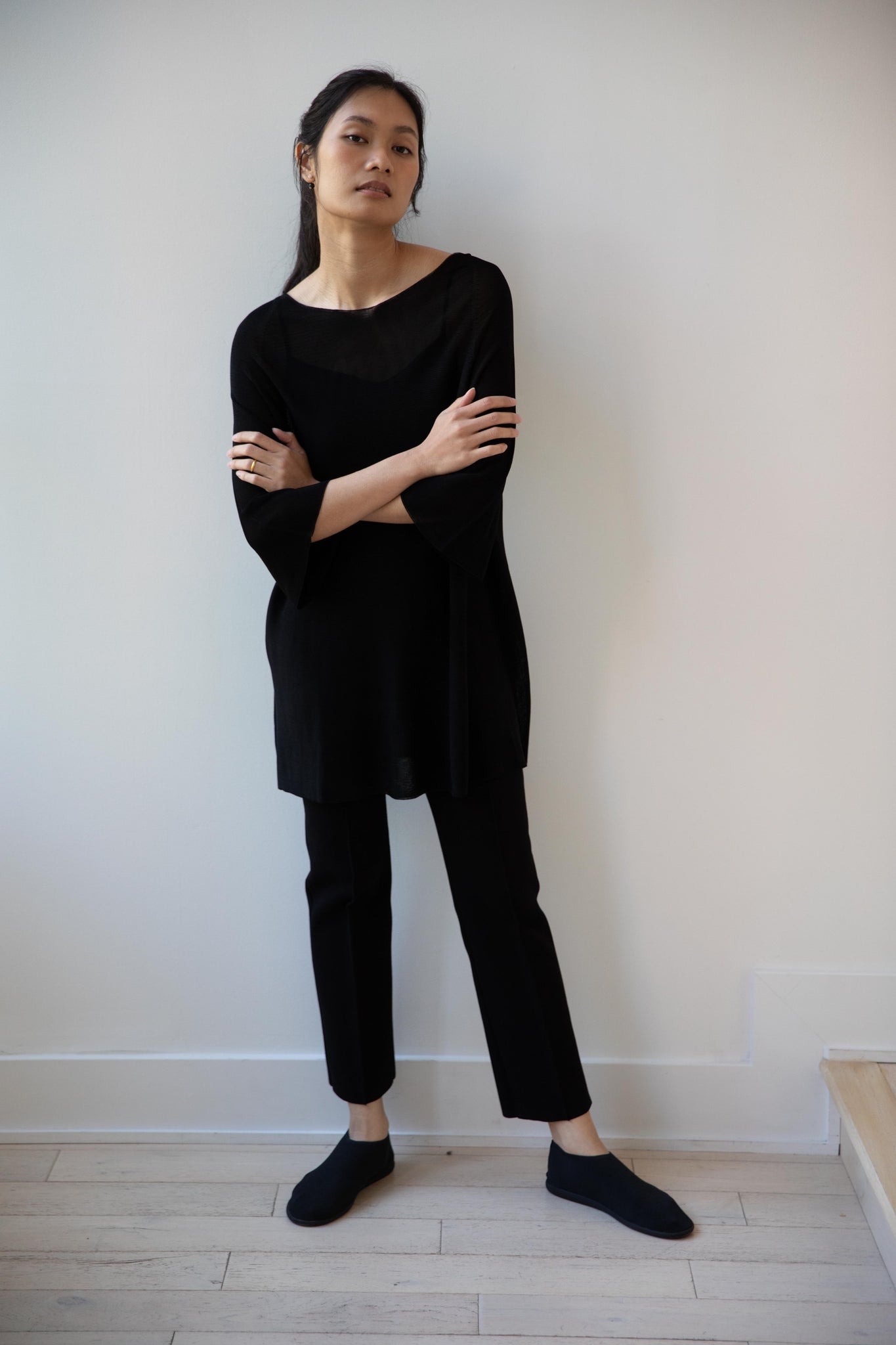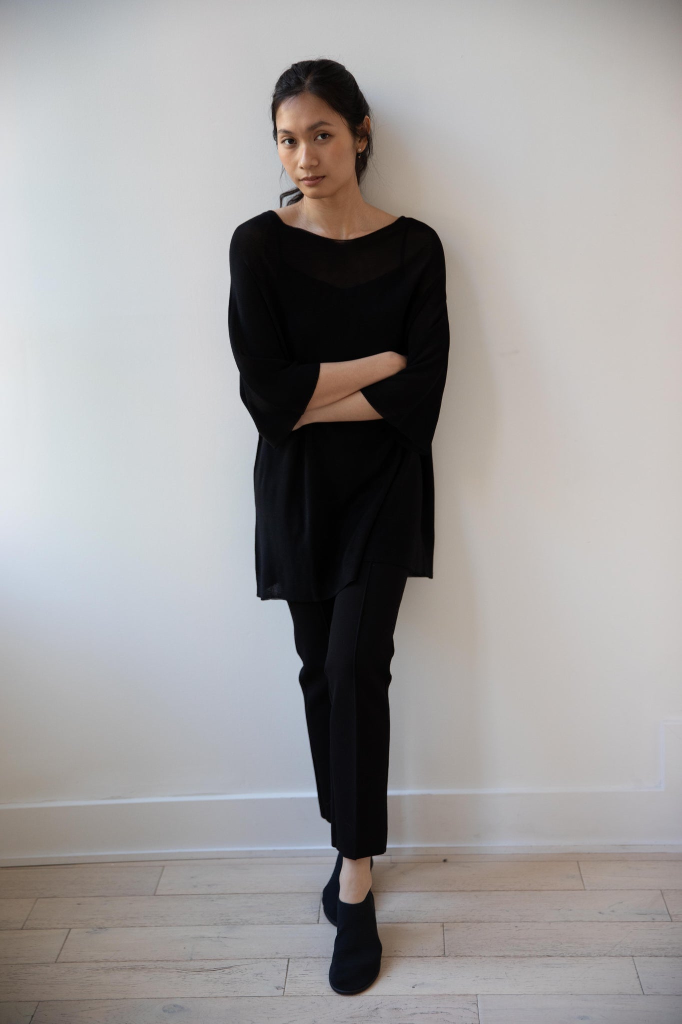 Cancellato Uniform's viscose knits are perfect for summer. Made from a lightweight yarn that very breathable, we are happy to have many styles in it this season so you can mix and match to get an ideal layered look, something the line is so good at. This elongated tunic is a great style over one of their loose trousers, or a narrow trouser, like this High Sport one.