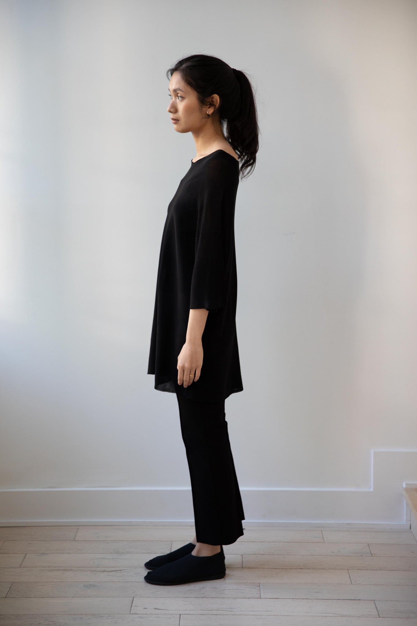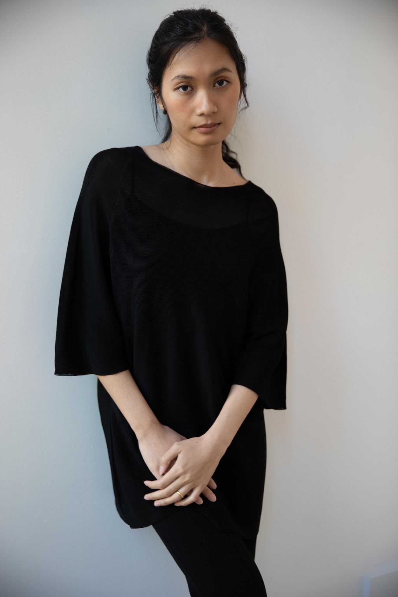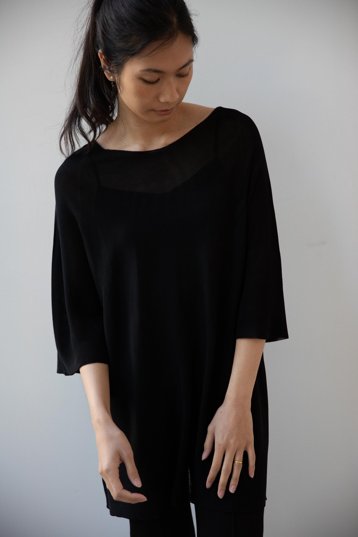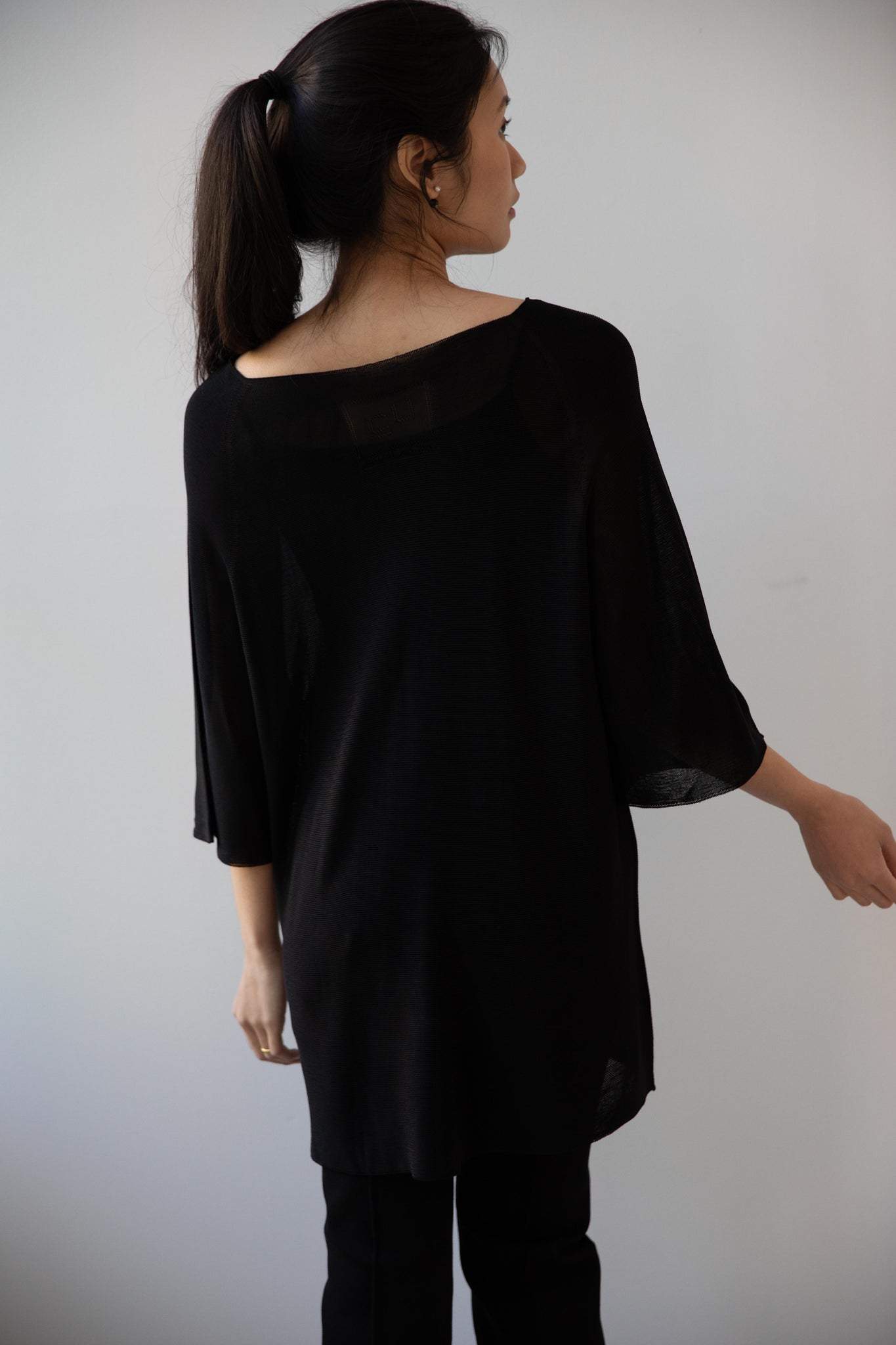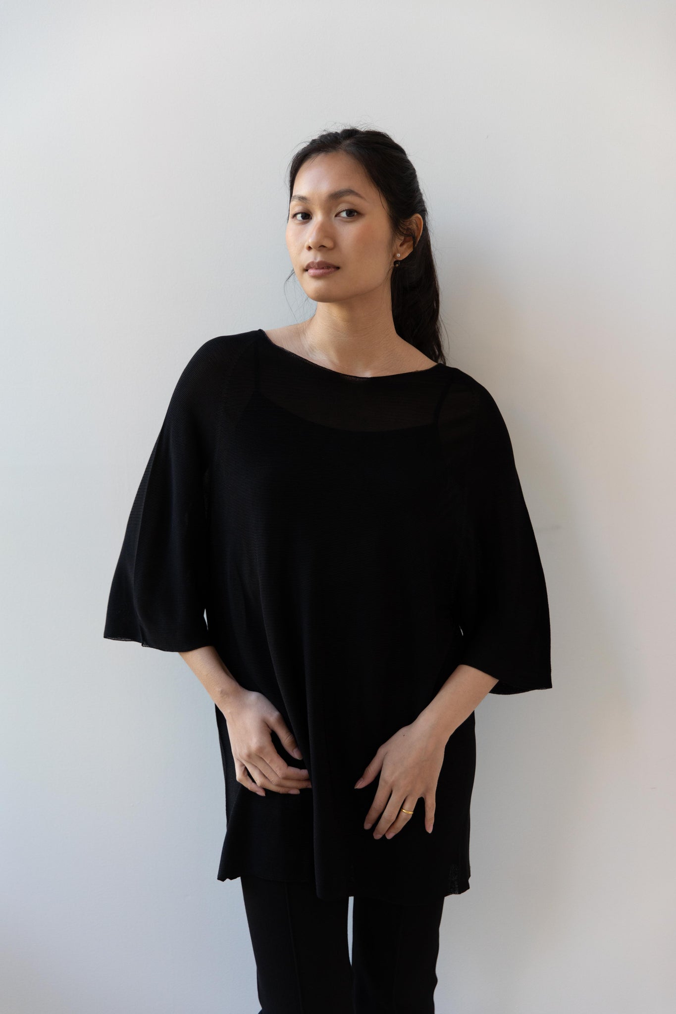 Cancellato Uniform's viscose knits are perfect for summer. Made from a lightweight yarn that very breathable, we are happy to have many styles in it this season so you can mix and match to get an ideal layered look, something the line is so good at. This elongated tunic is a great style over one of their loose trousers, or a narrow trouser, like this High Sport one.
