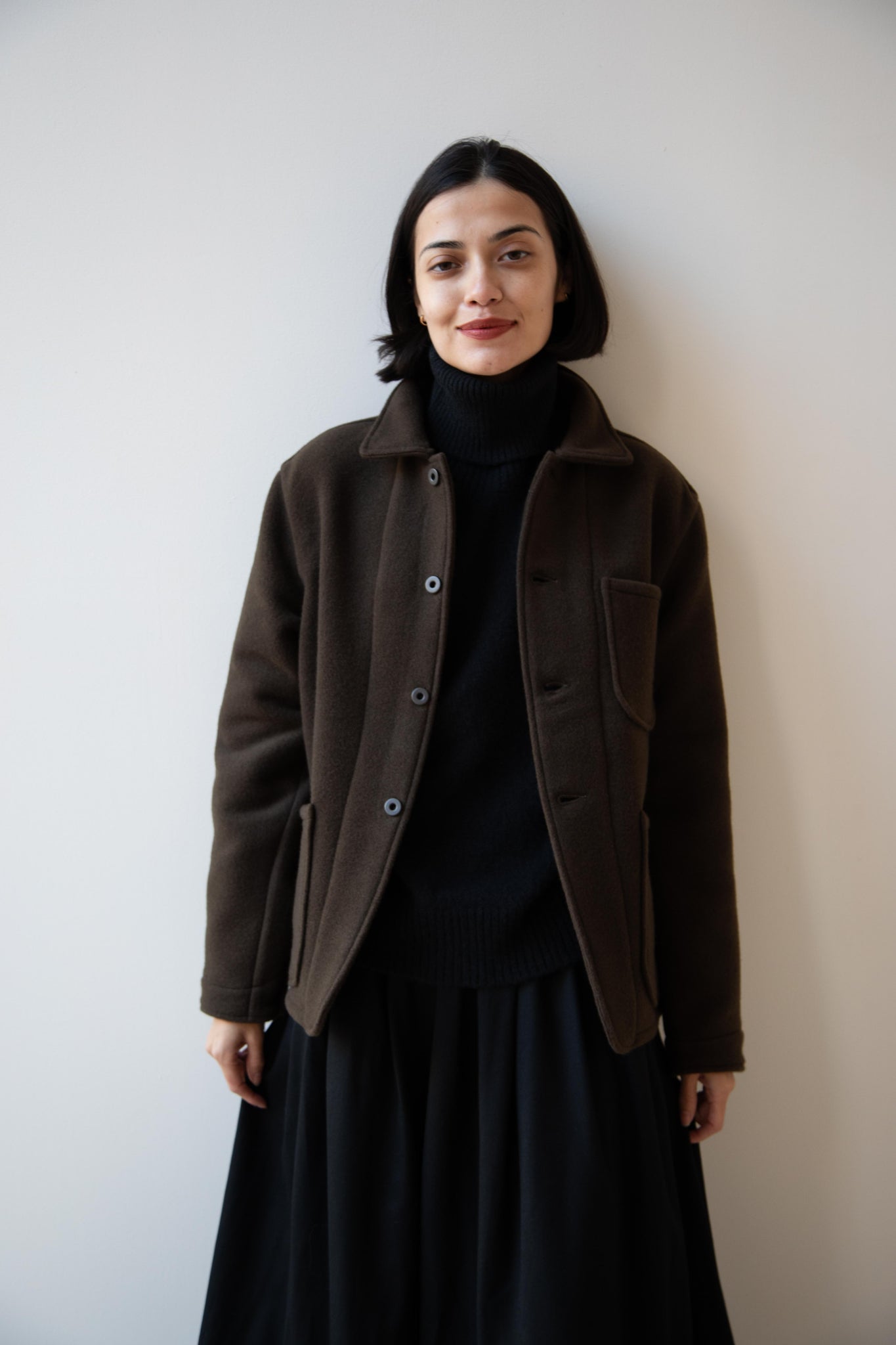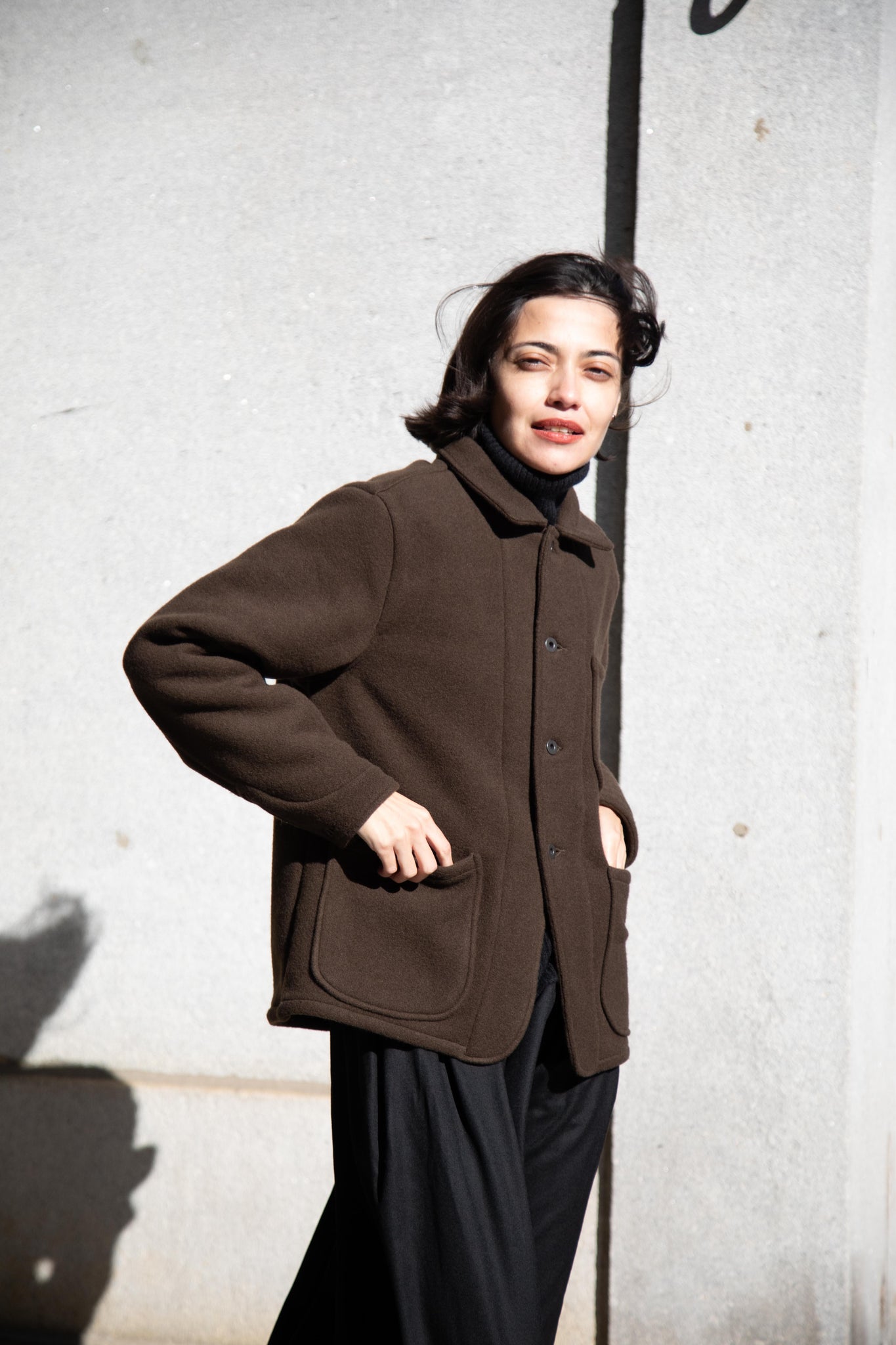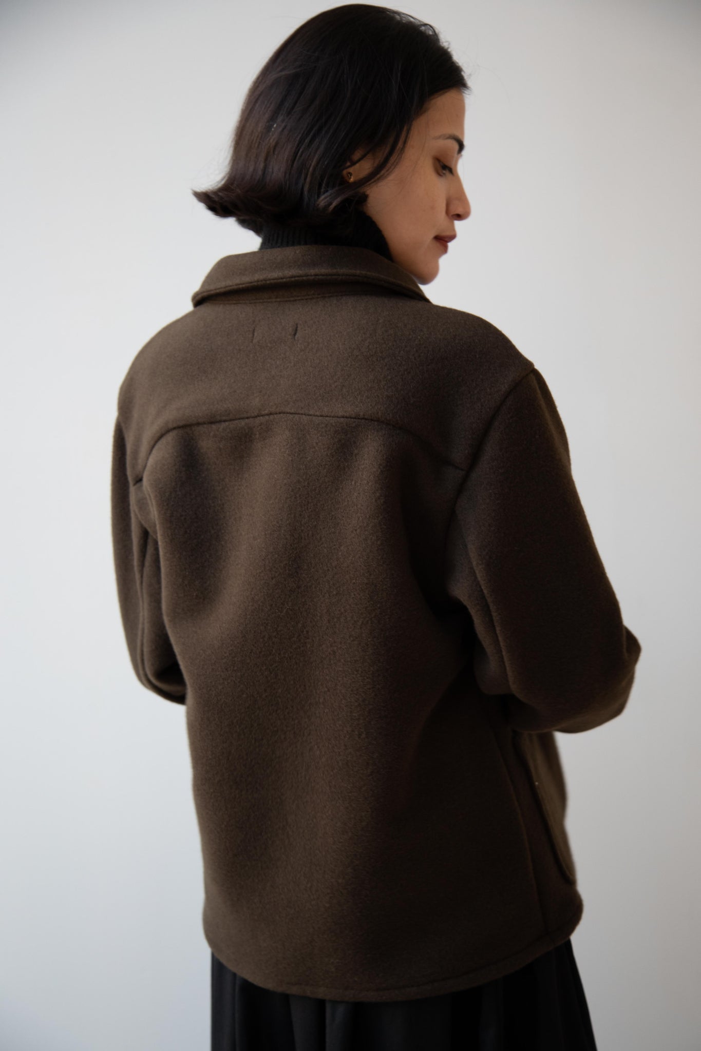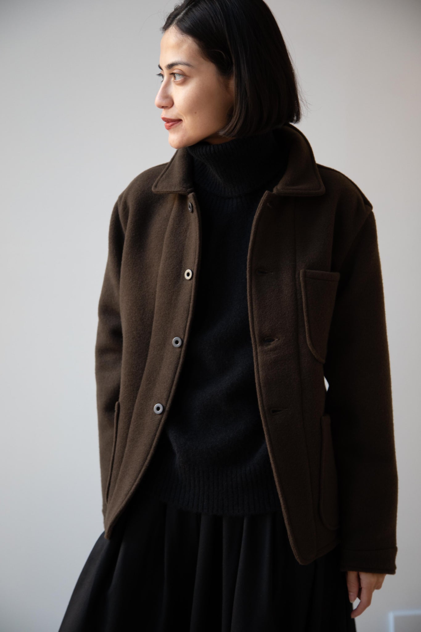 This jacket is made from a lofty and soft wool cotton fabric. The color is a beautiful dark olive, appearing more olive and sometimes more brown in different light. There is a button up front and three pockets as well. There are buttons at the cuffs and the back yoke adds a nice structure and silhouette to the piece.
