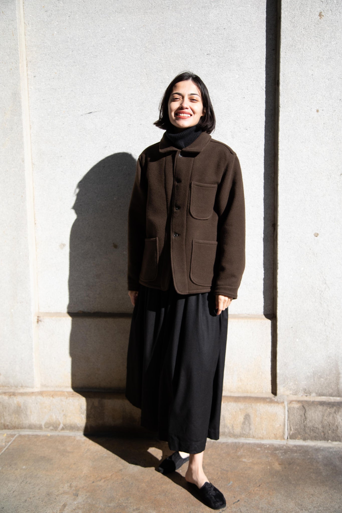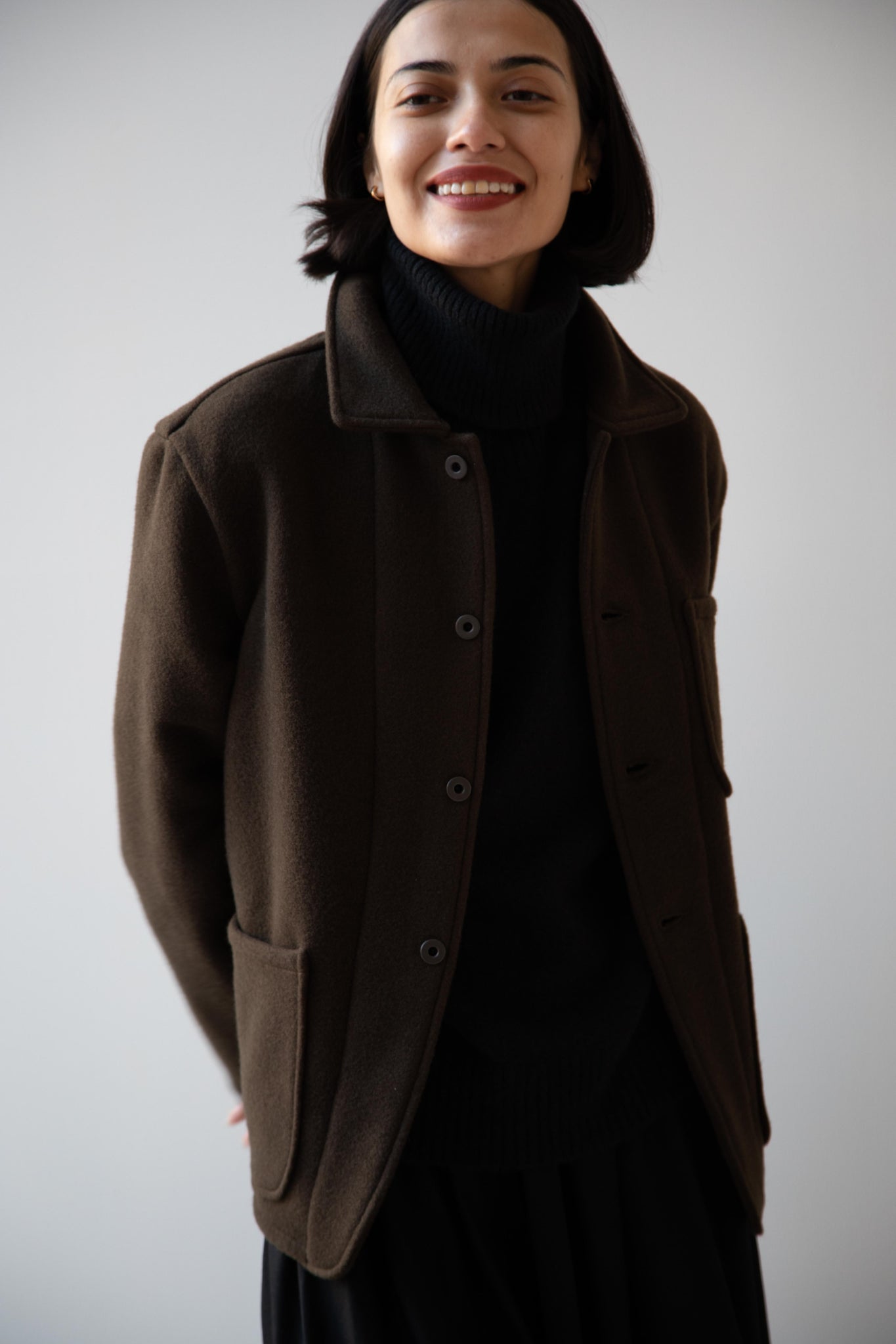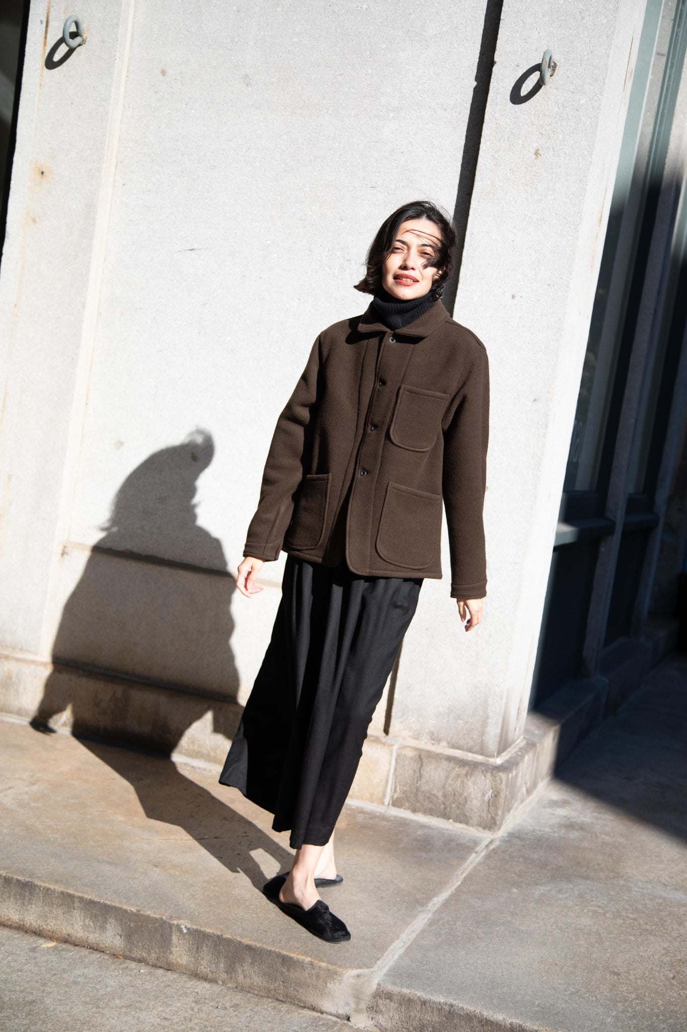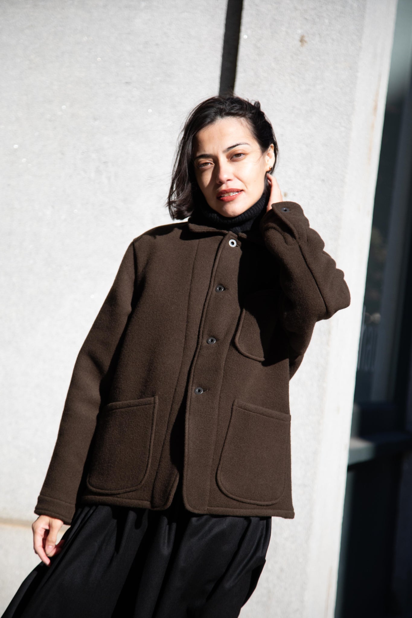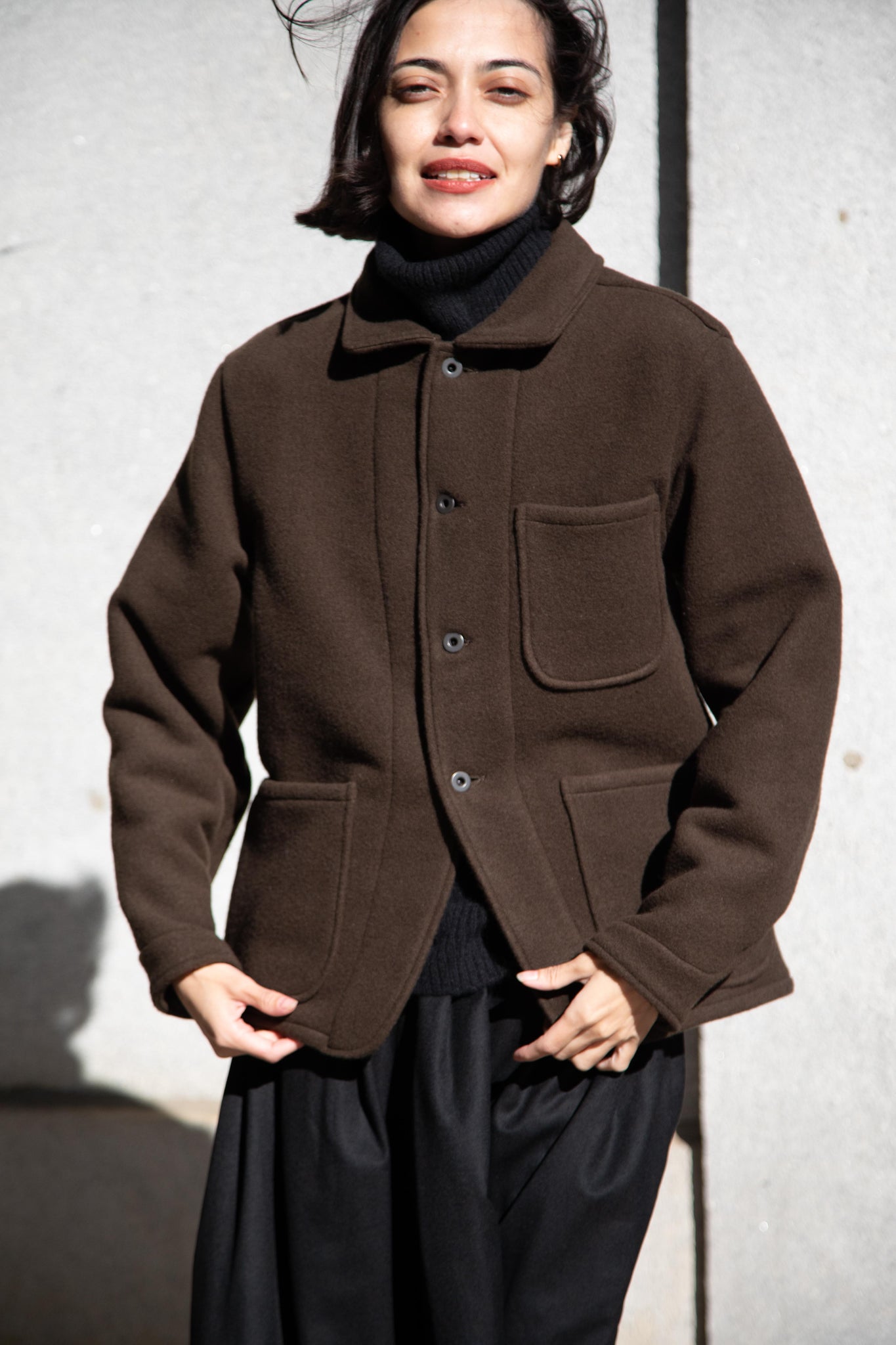 This jacket is made from a lofty and soft wool cotton fabric. The color is a beautiful dark olive, appearing more olive and sometimes more brown in different light. There is a button up front and three pockets as well. There are buttons at the cuffs and the back yoke adds a nice structure and silhouette to the piece.