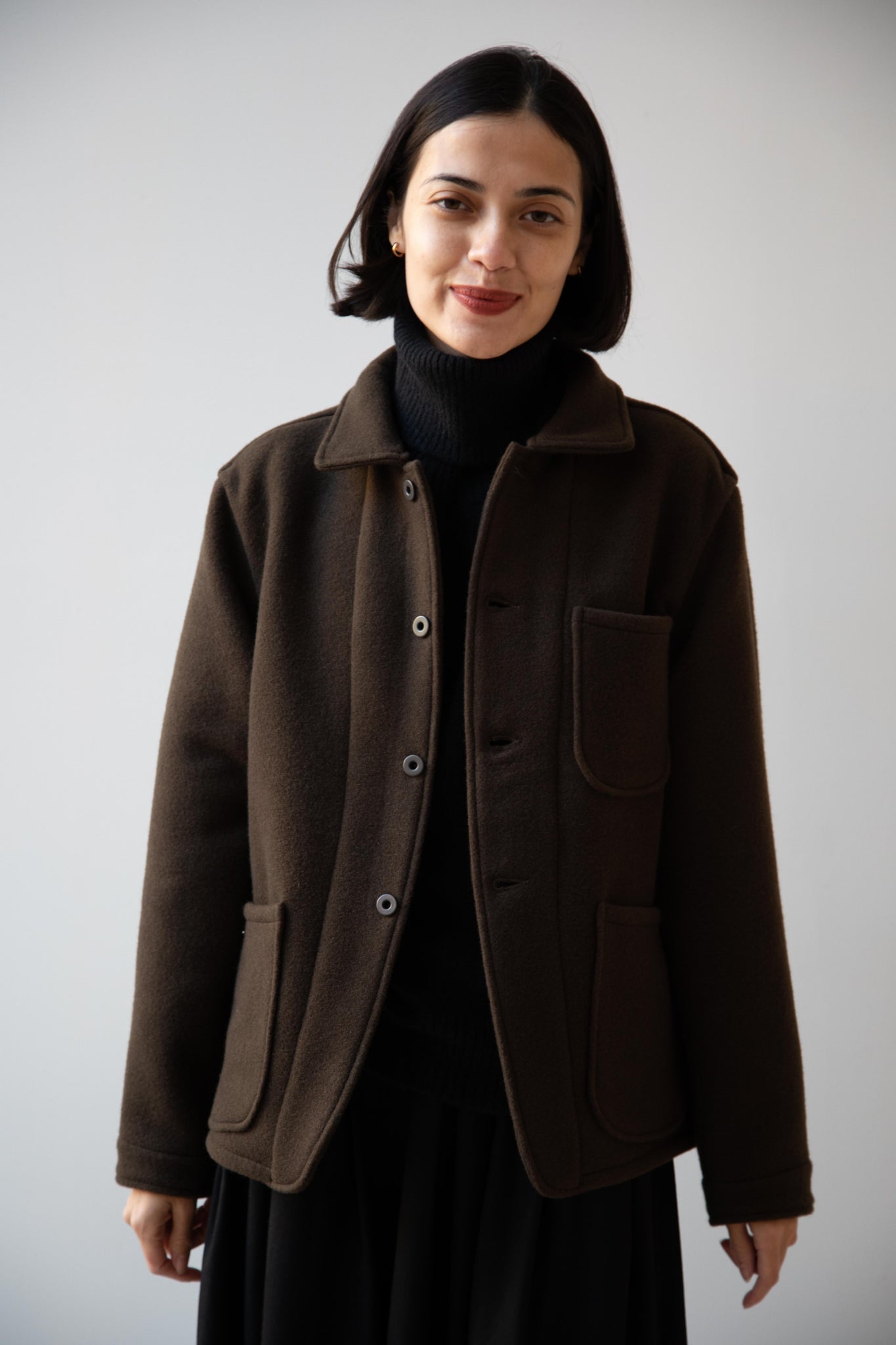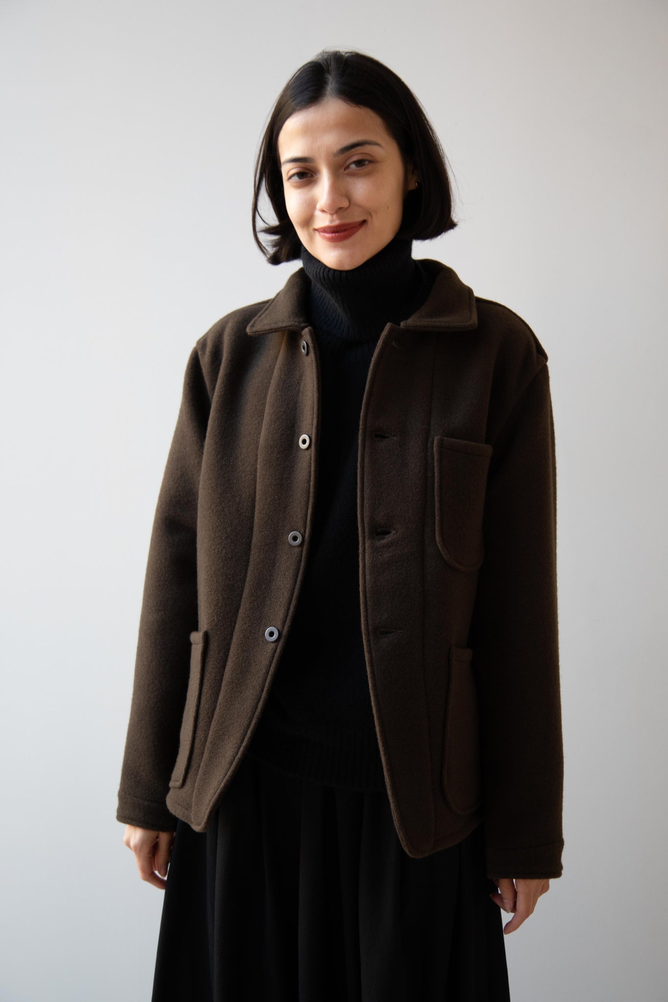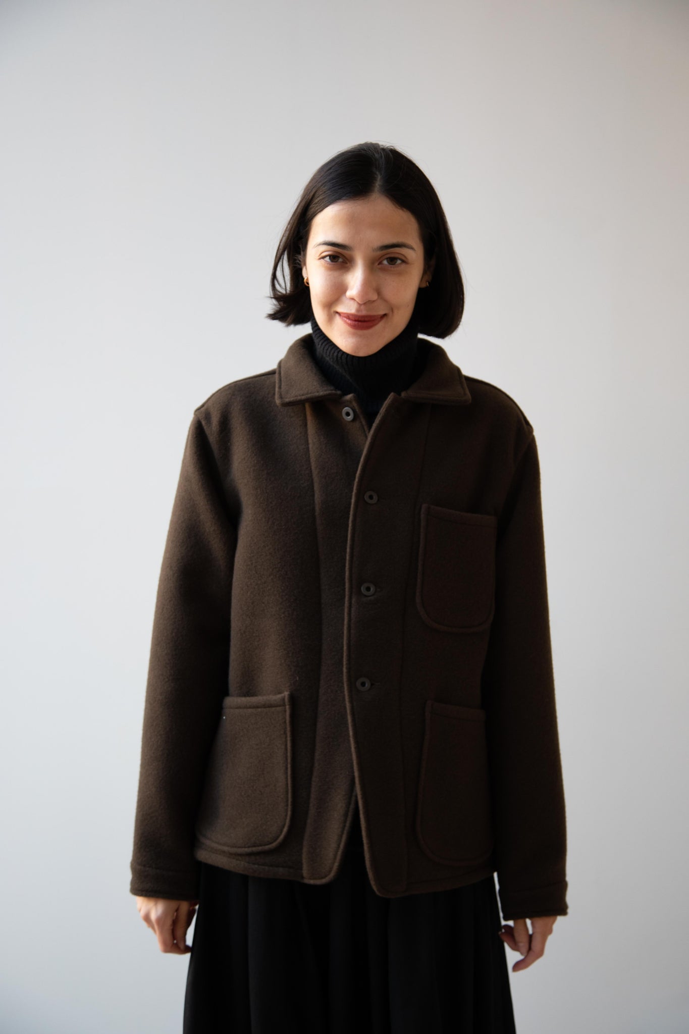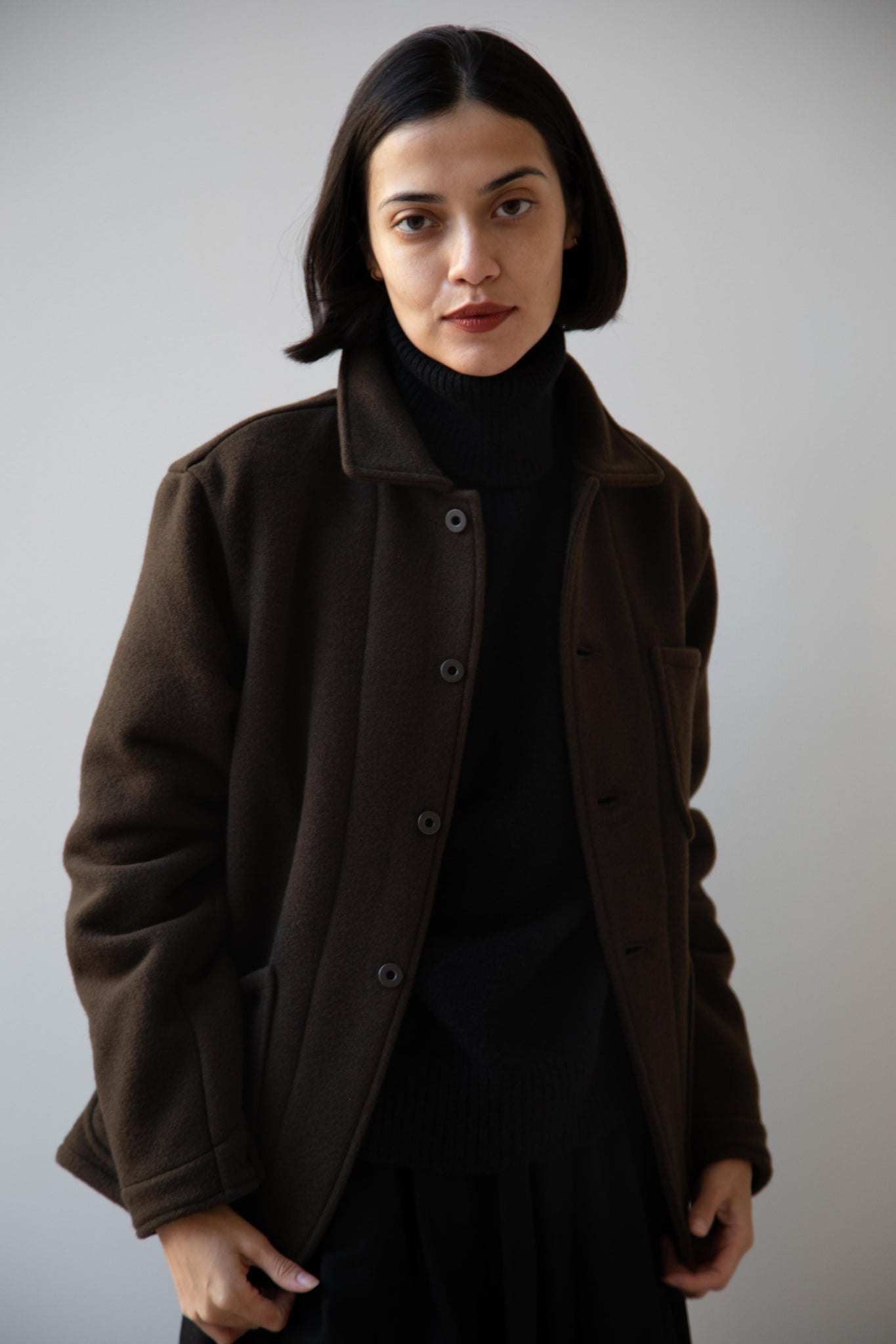 This jacket is made from a lofty and soft wool cotton fabric. The color is a beautiful dark olive, appearing more olive and sometimes more brown in different light. There is a button up front and three pockets as well. There are buttons at the cuffs and the back yoke adds a nice structure and silhouette to the piece.