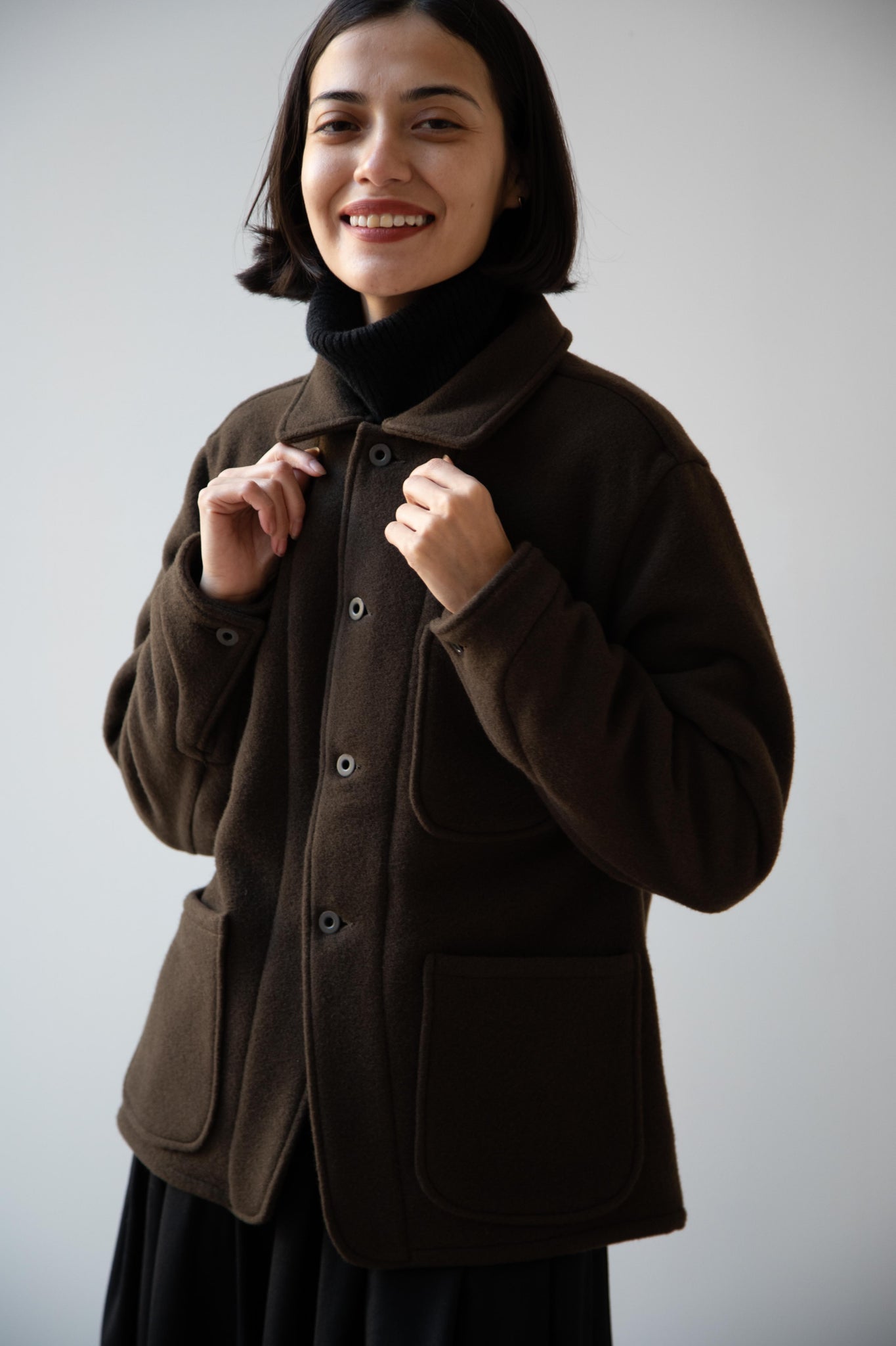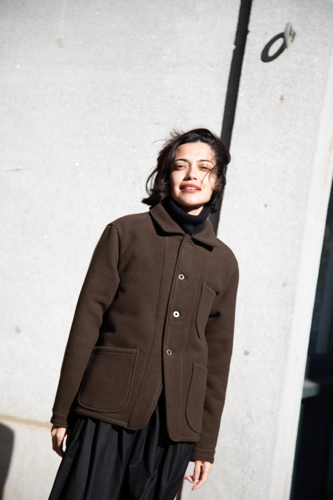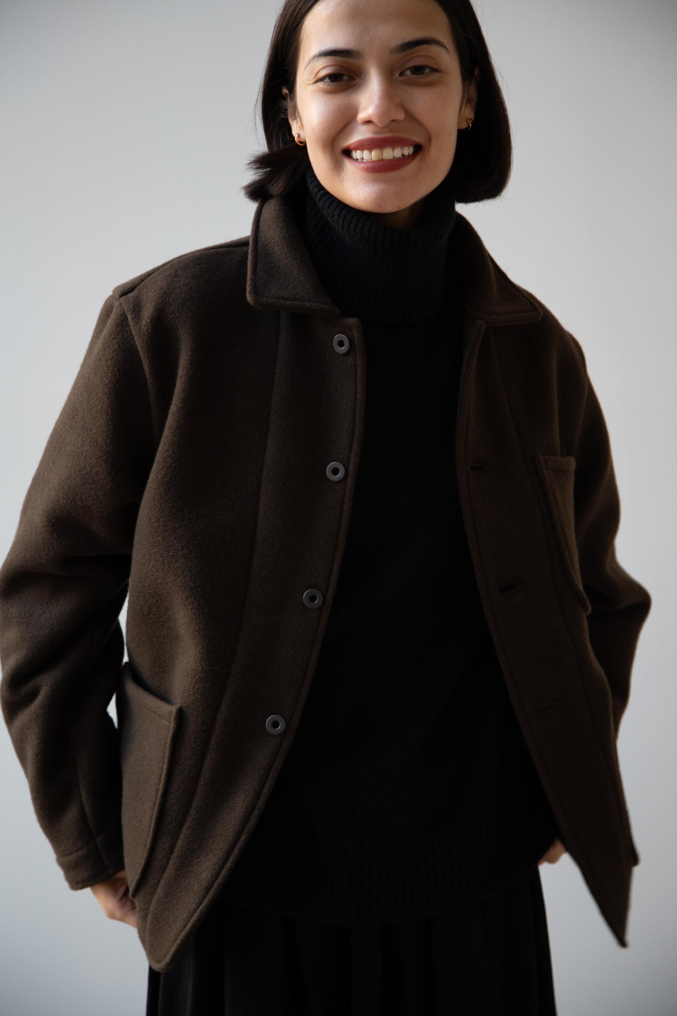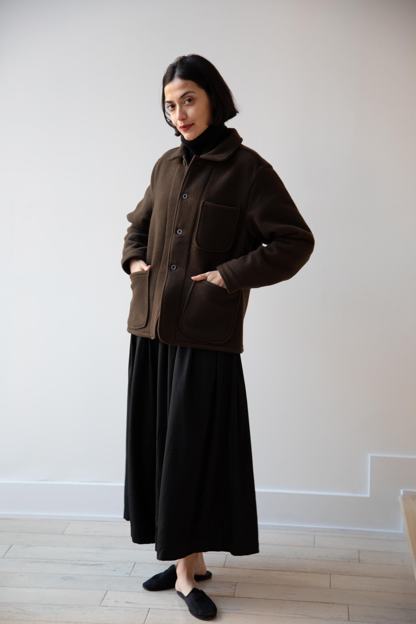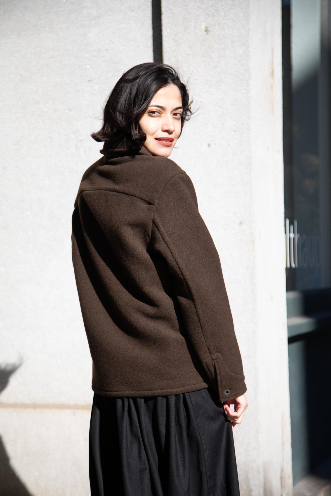 This jacket is made from a lofty and soft wool cotton fabric. The color is a beautiful dark olive, appearing more olive and sometimes more brown in different light. There is a button up front and three pockets as well. There are buttons at the cuffs and the back yoke adds a nice structure and silhouette to the piece.