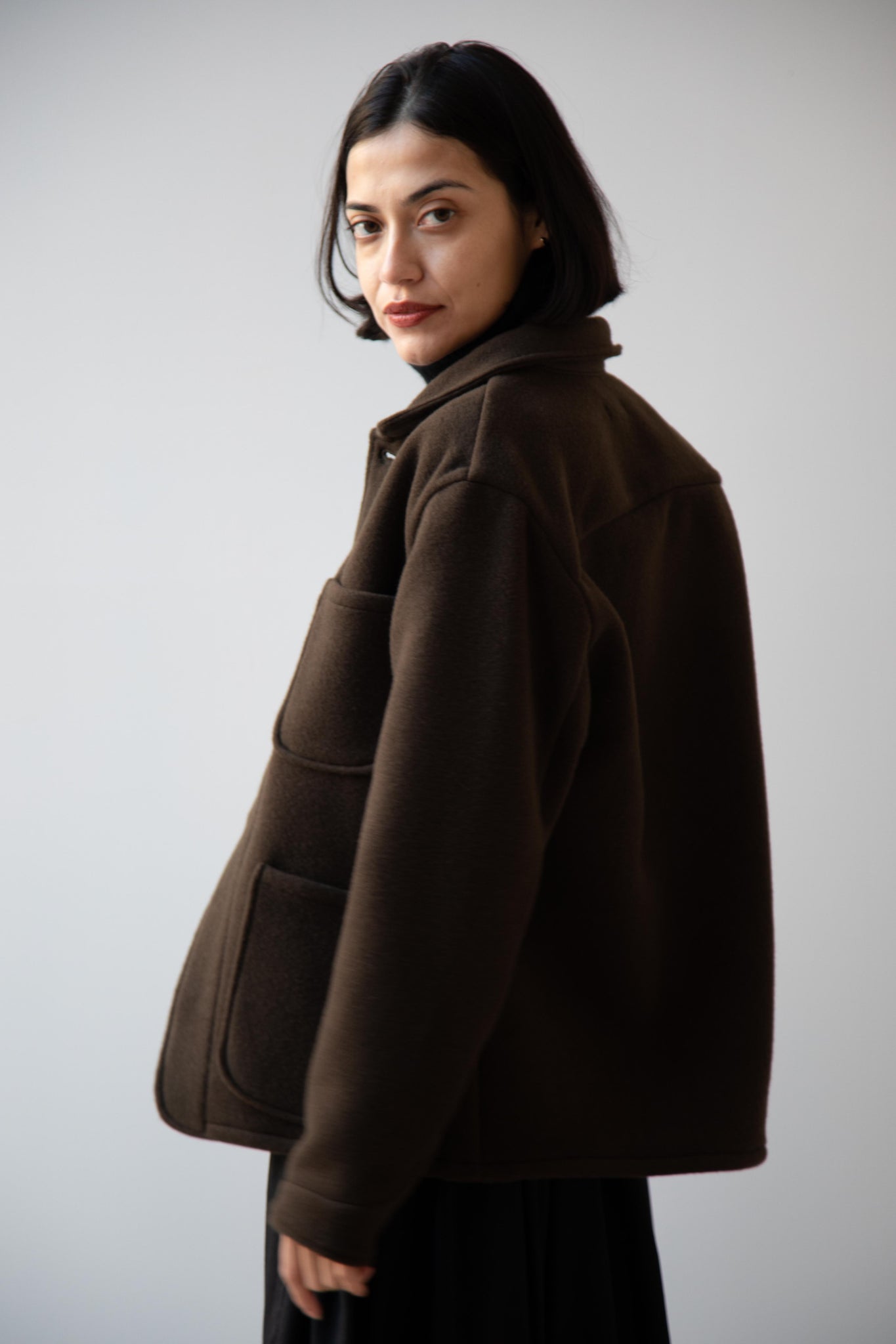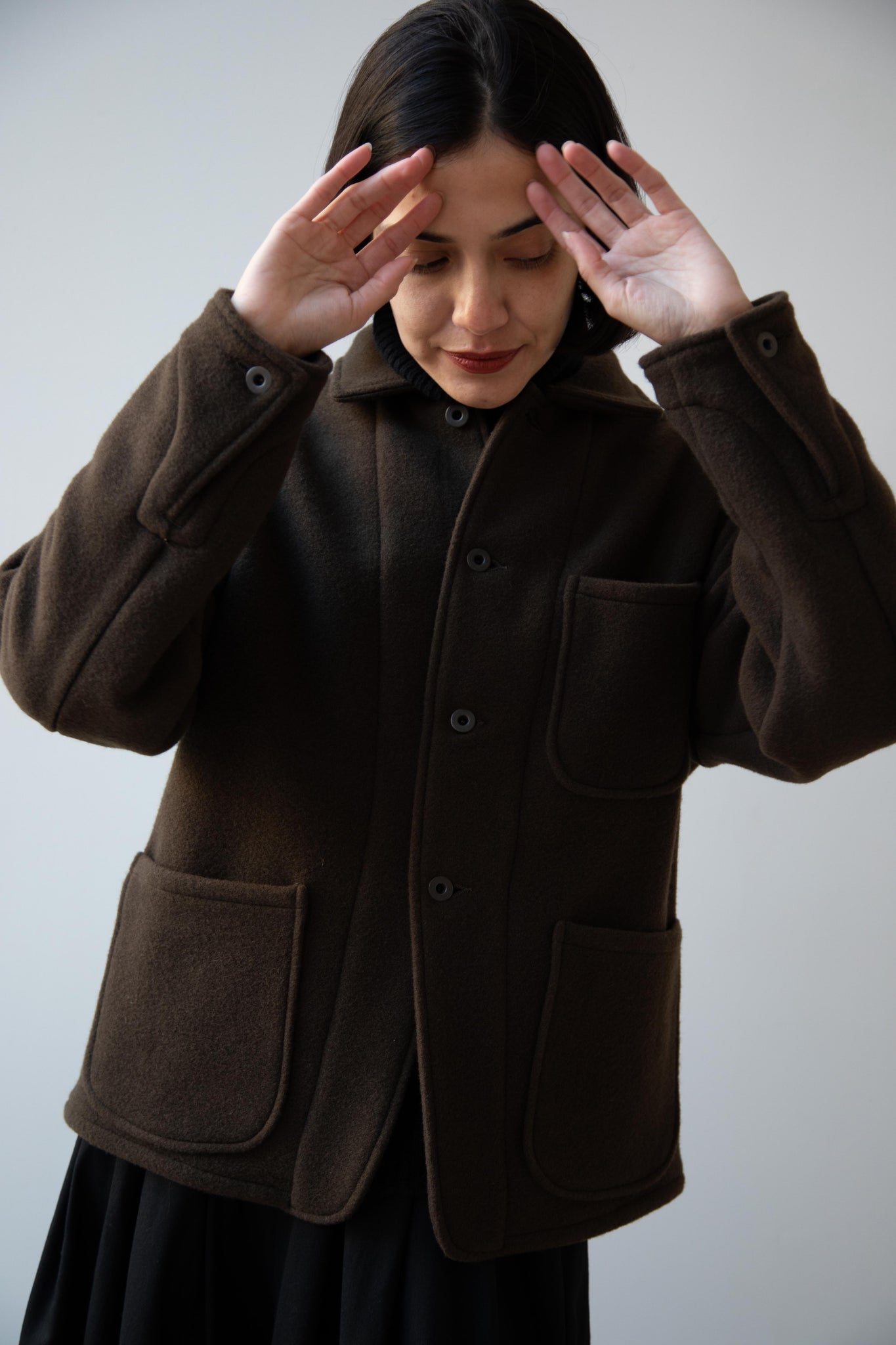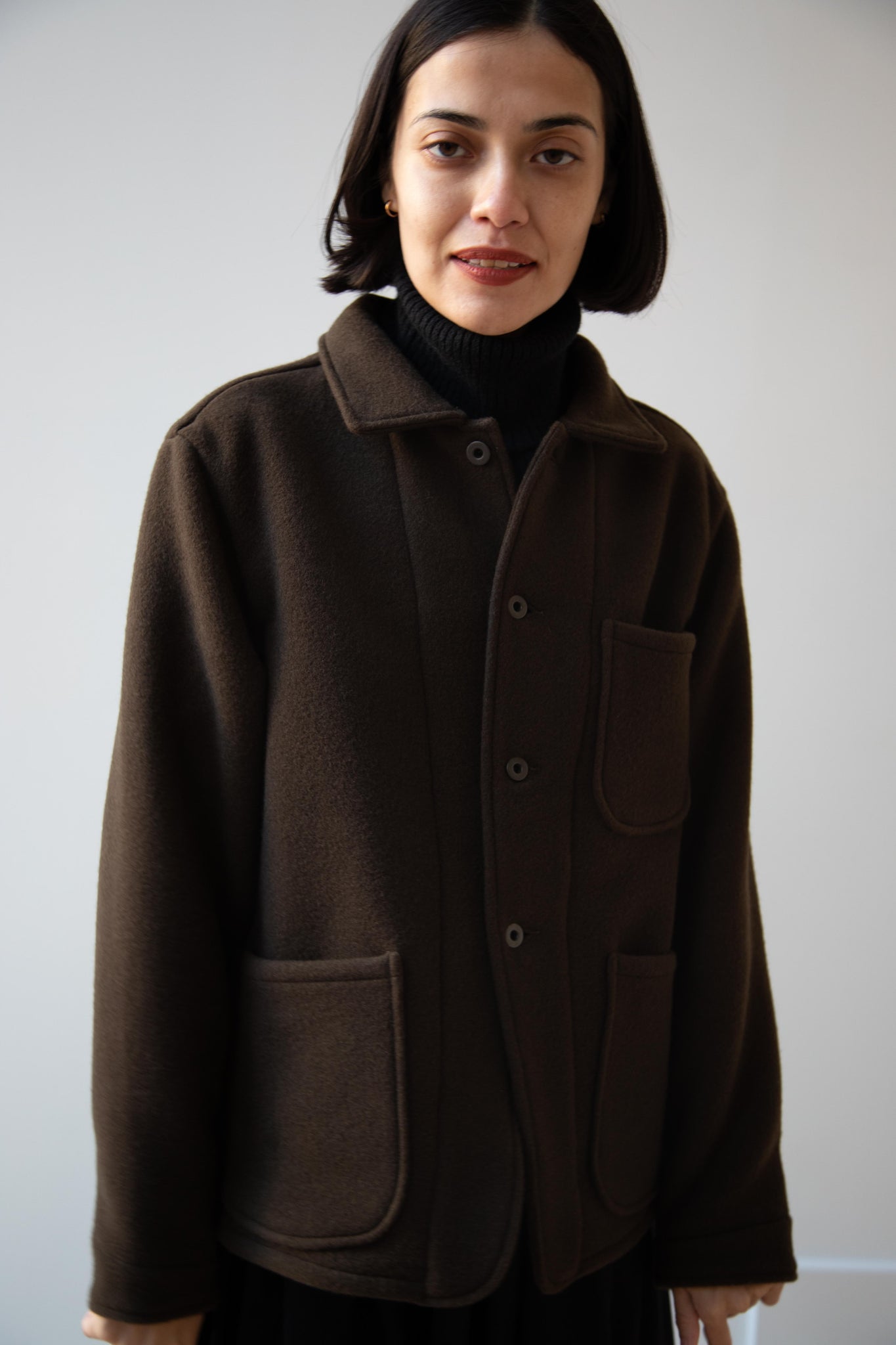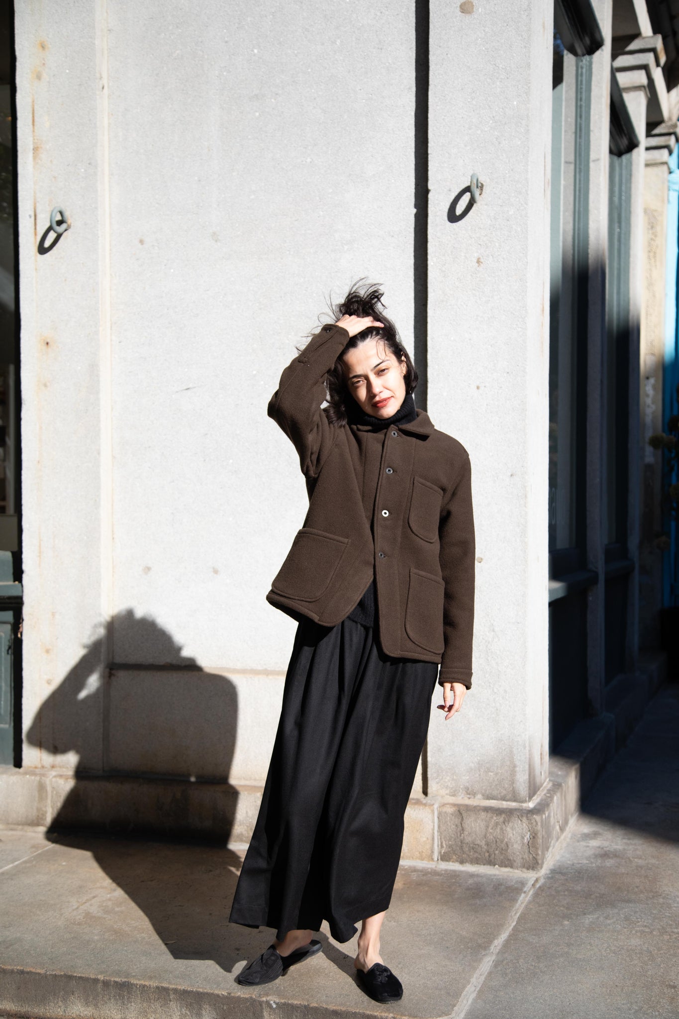 This jacket is made from a lofty and soft wool cotton fabric. The color is a beautiful dark olive, appearing more olive and sometimes more brown in different light. There is a button up front and three pockets as well. There are buttons at the cuffs and the back yoke adds a nice structure and silhouette to the piece.
