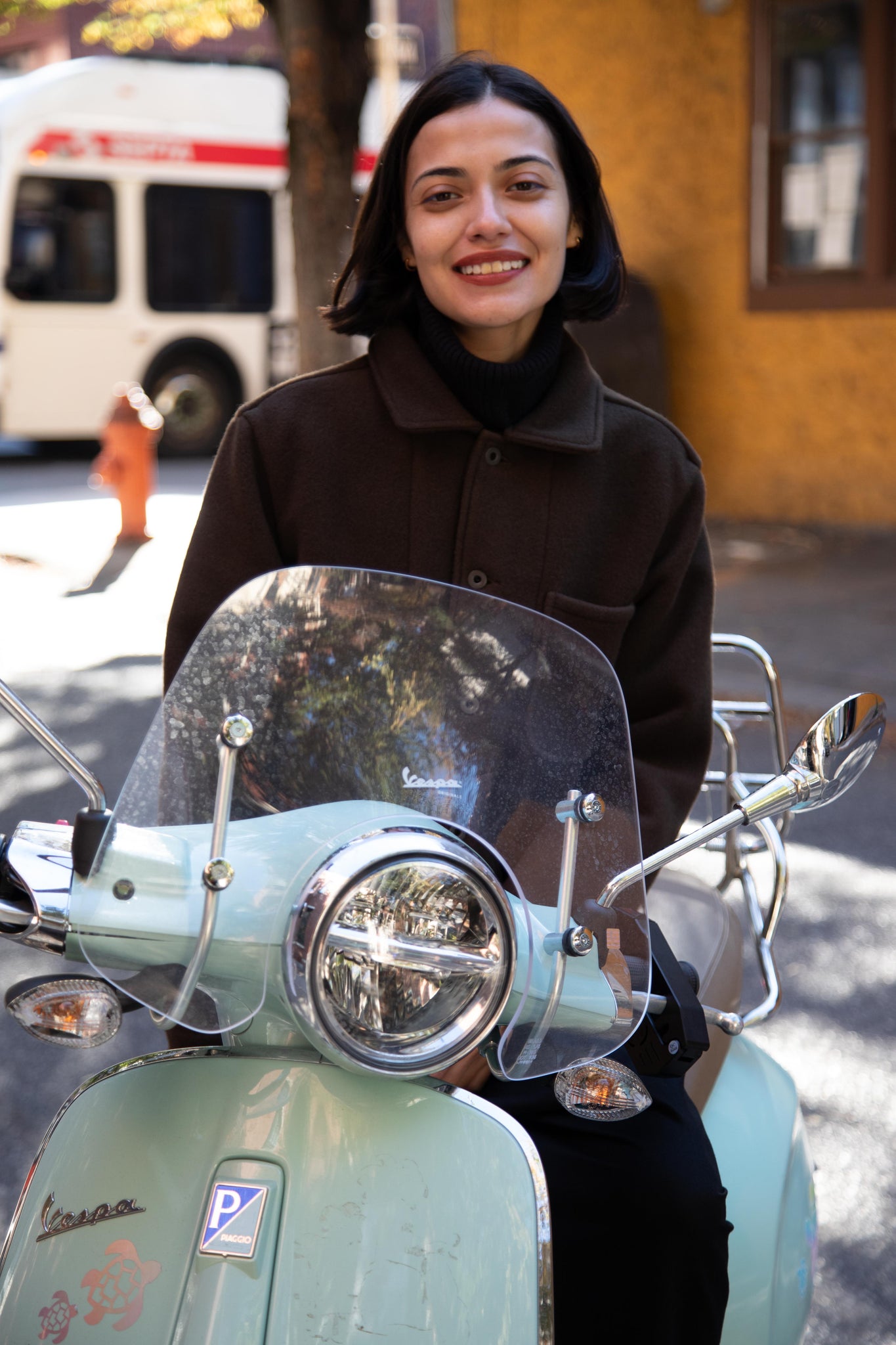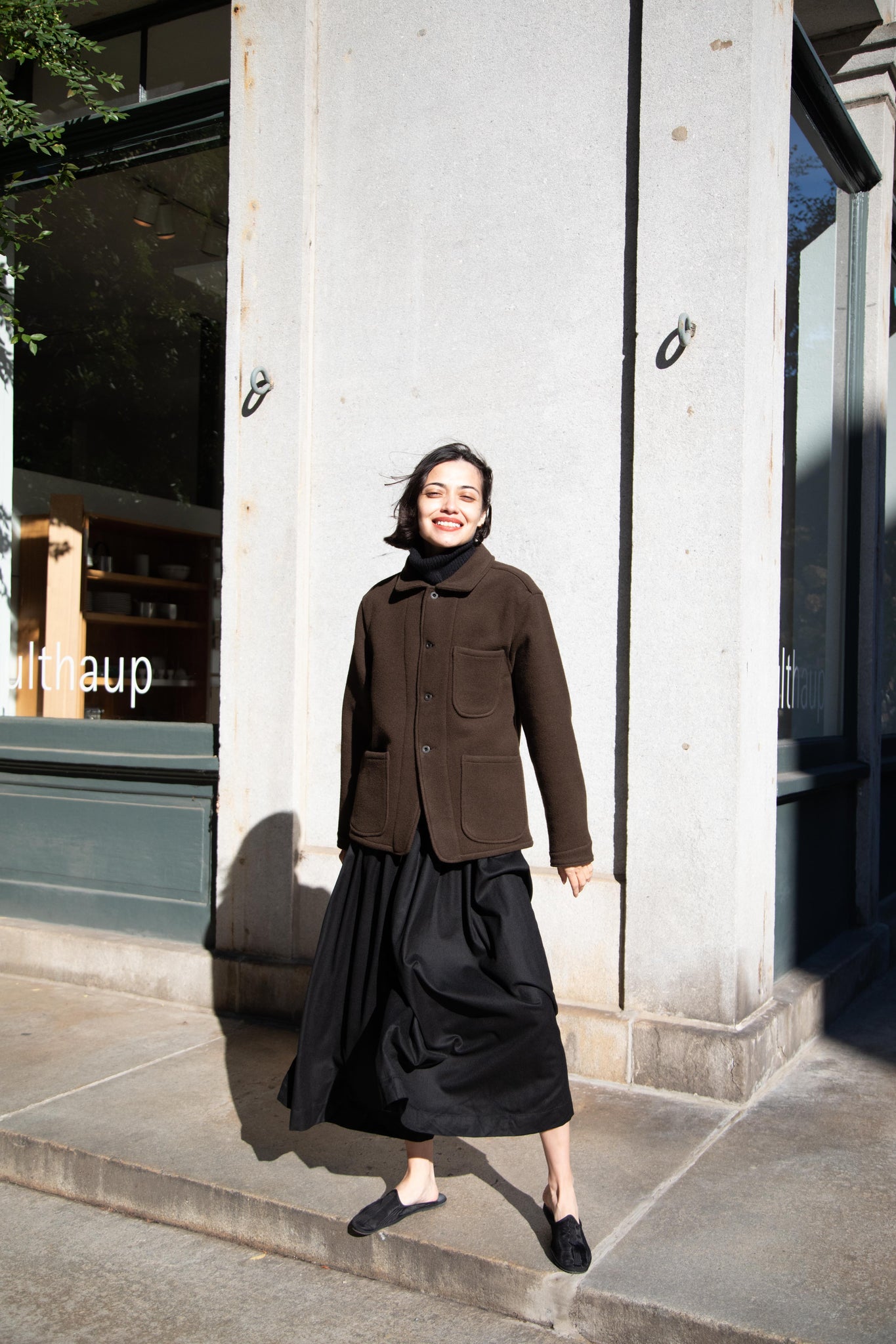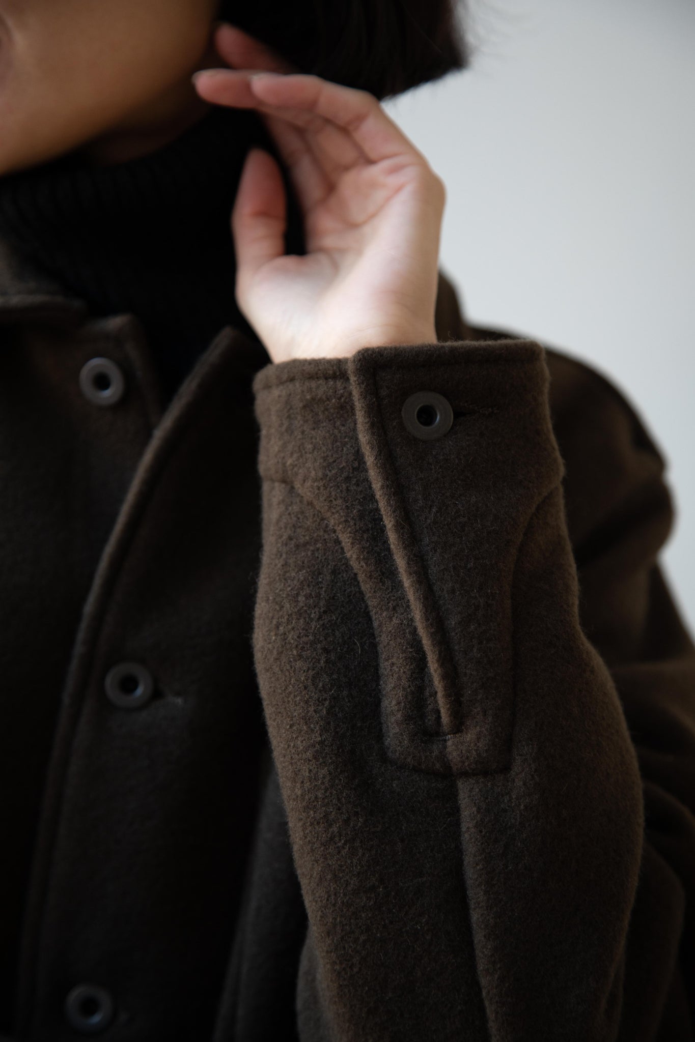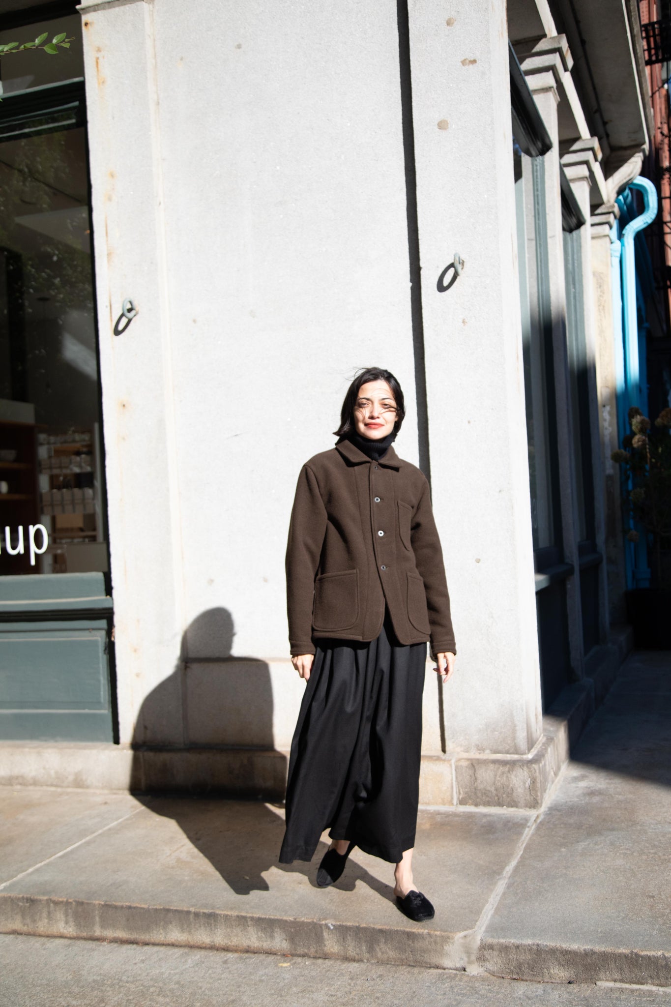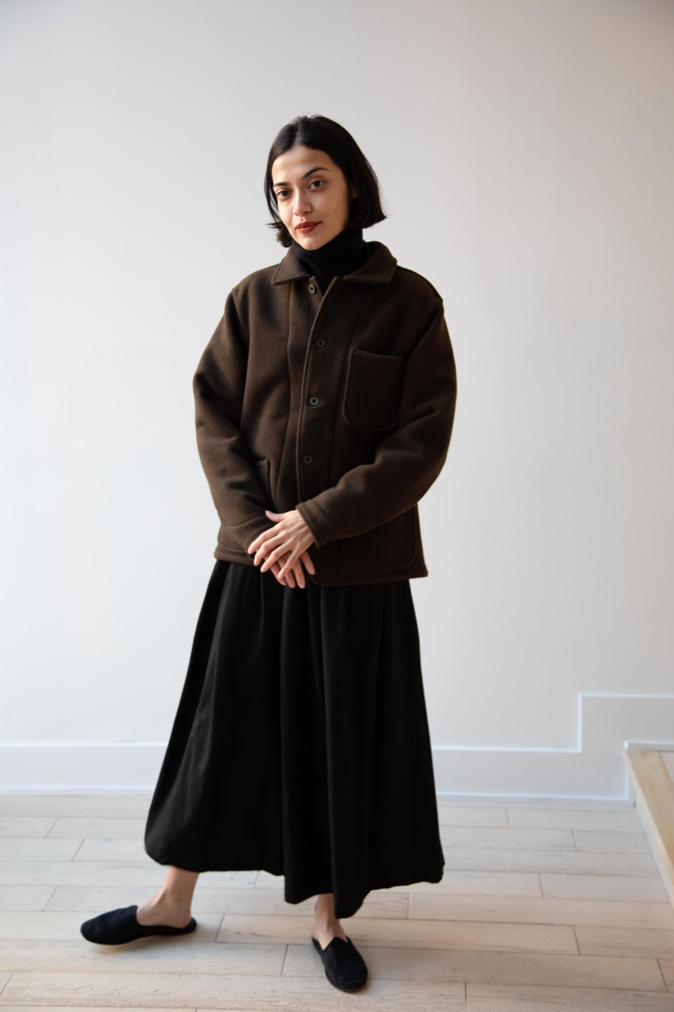 This jacket is made from a lofty and soft wool cotton fabric. The color is a beautiful dark olive, appearing more olive and sometimes more brown in different light. There is a button up front and three pockets as well. There are buttons at the cuffs and the back yoke adds a nice structure and silhouette to the piece.