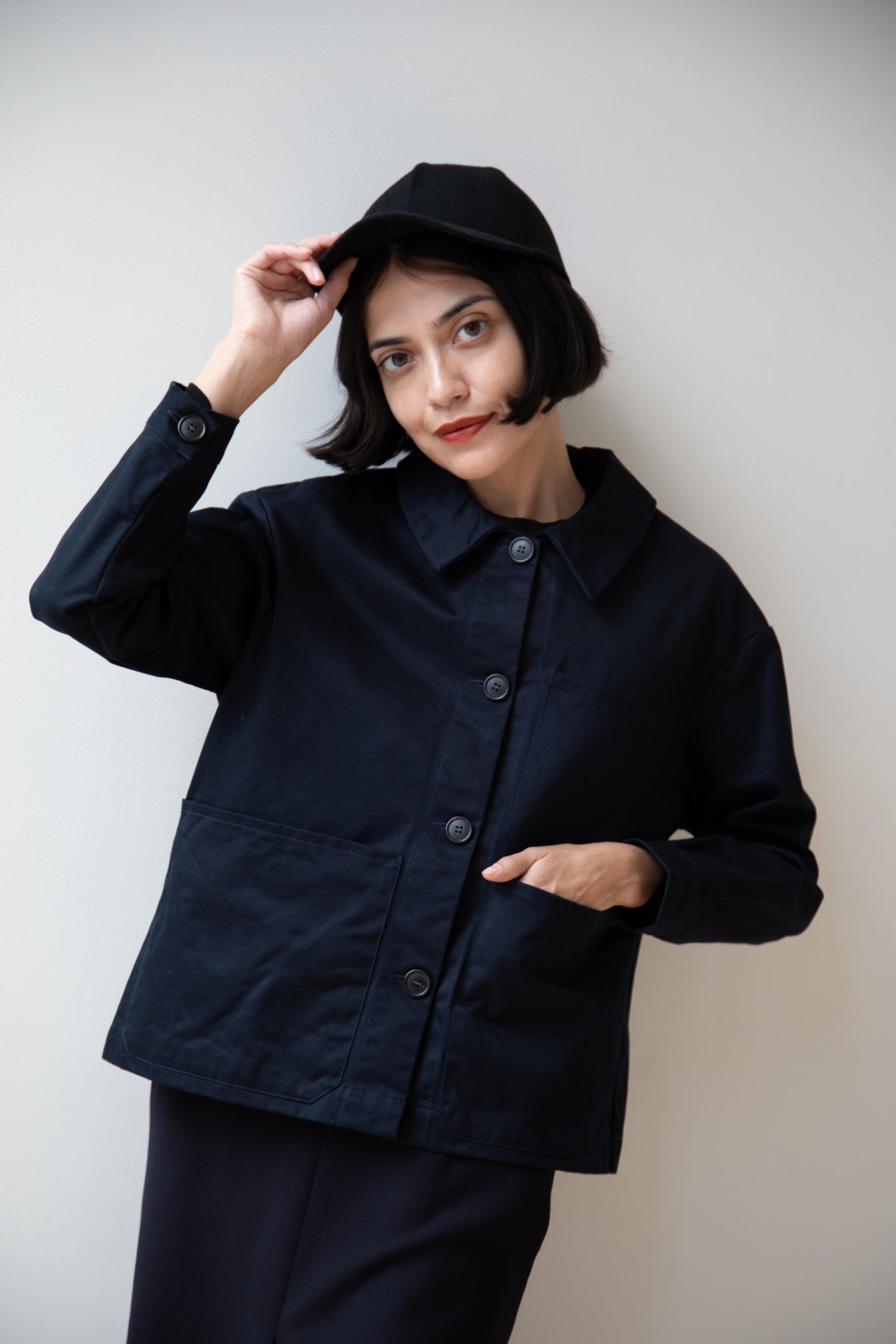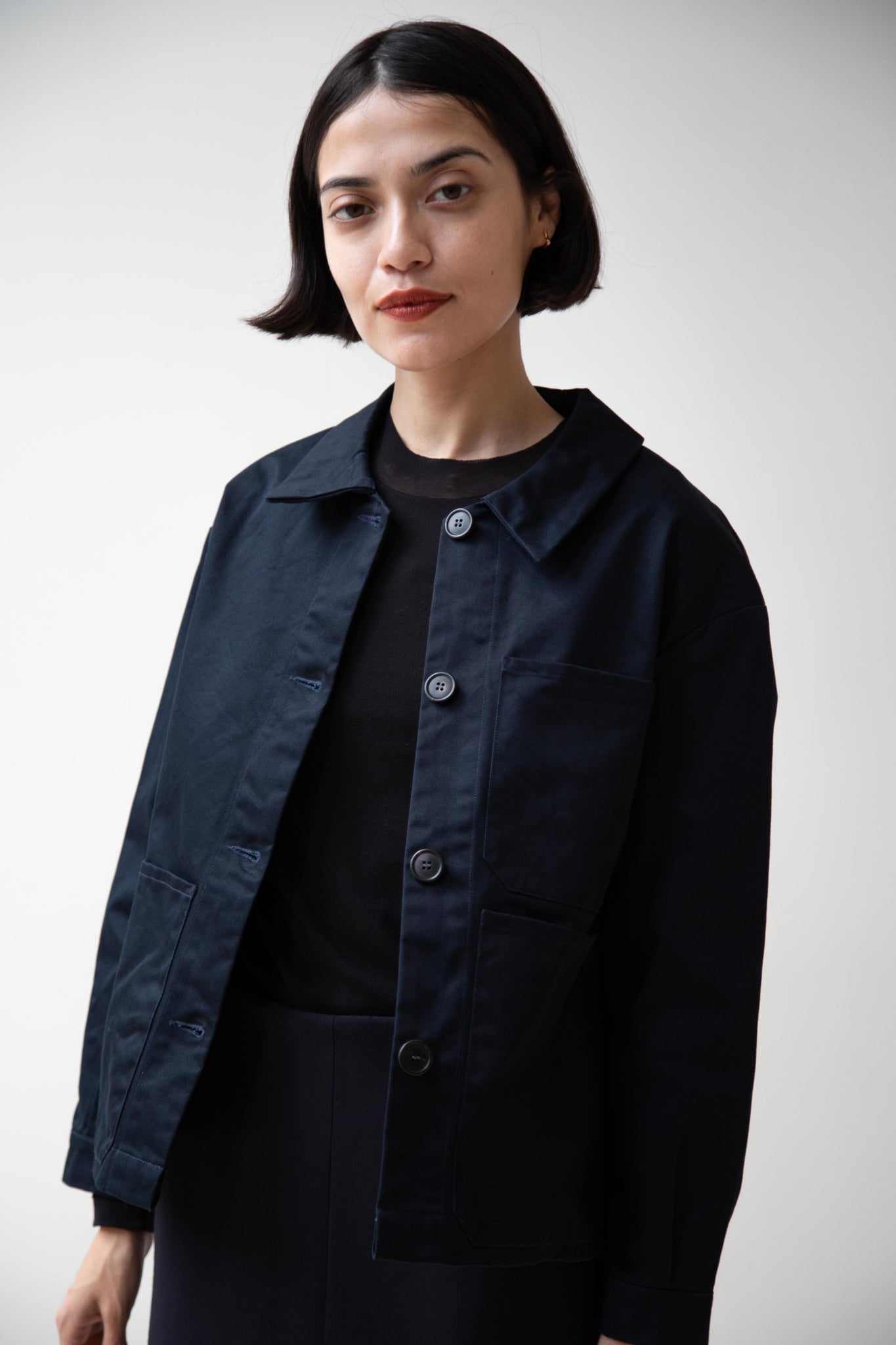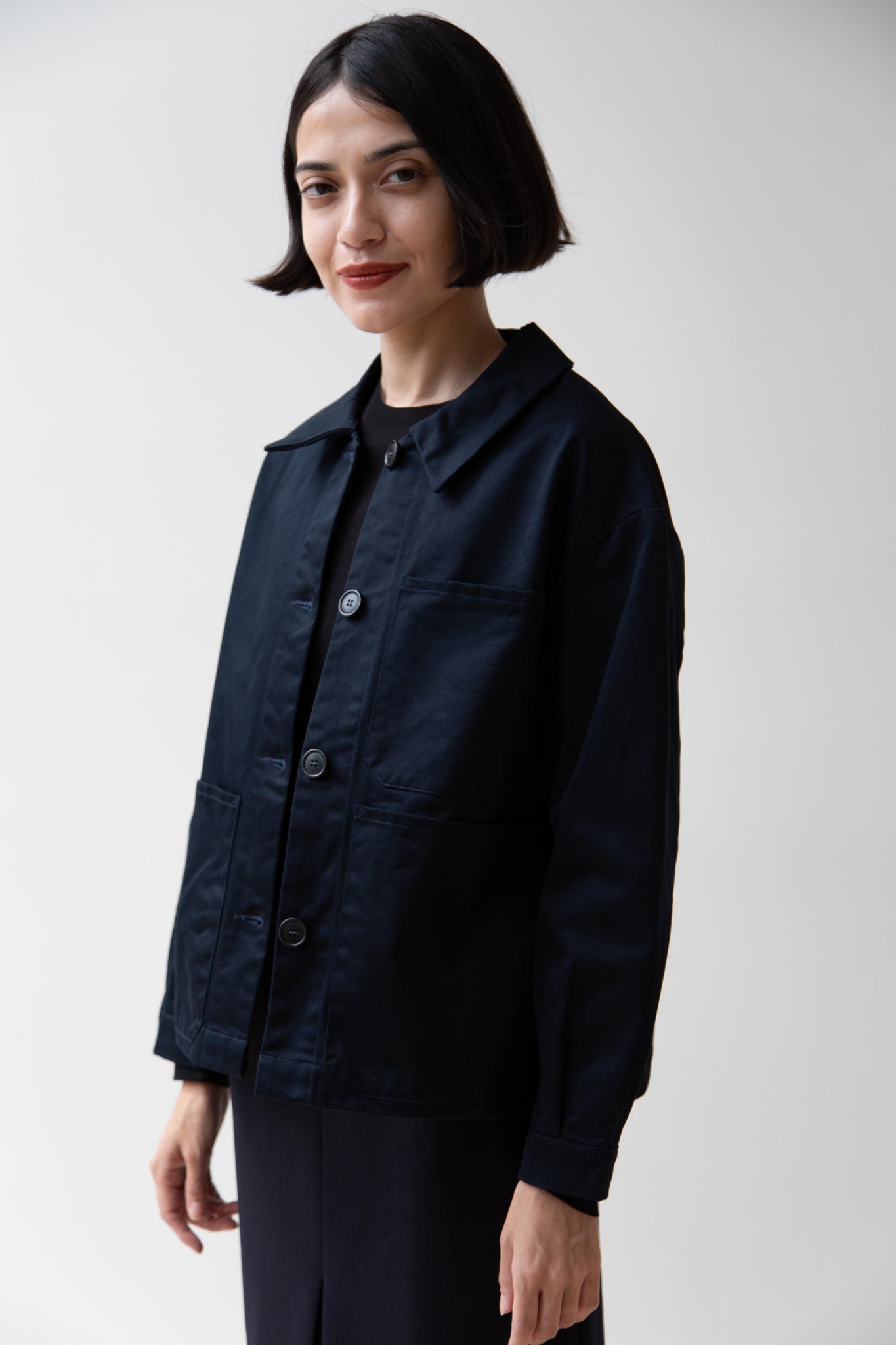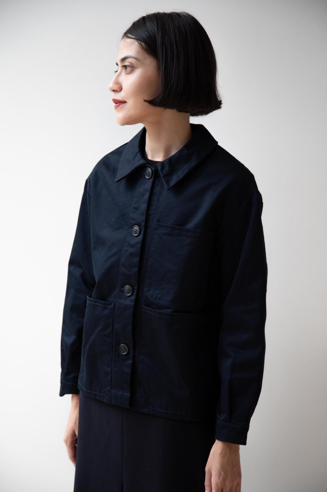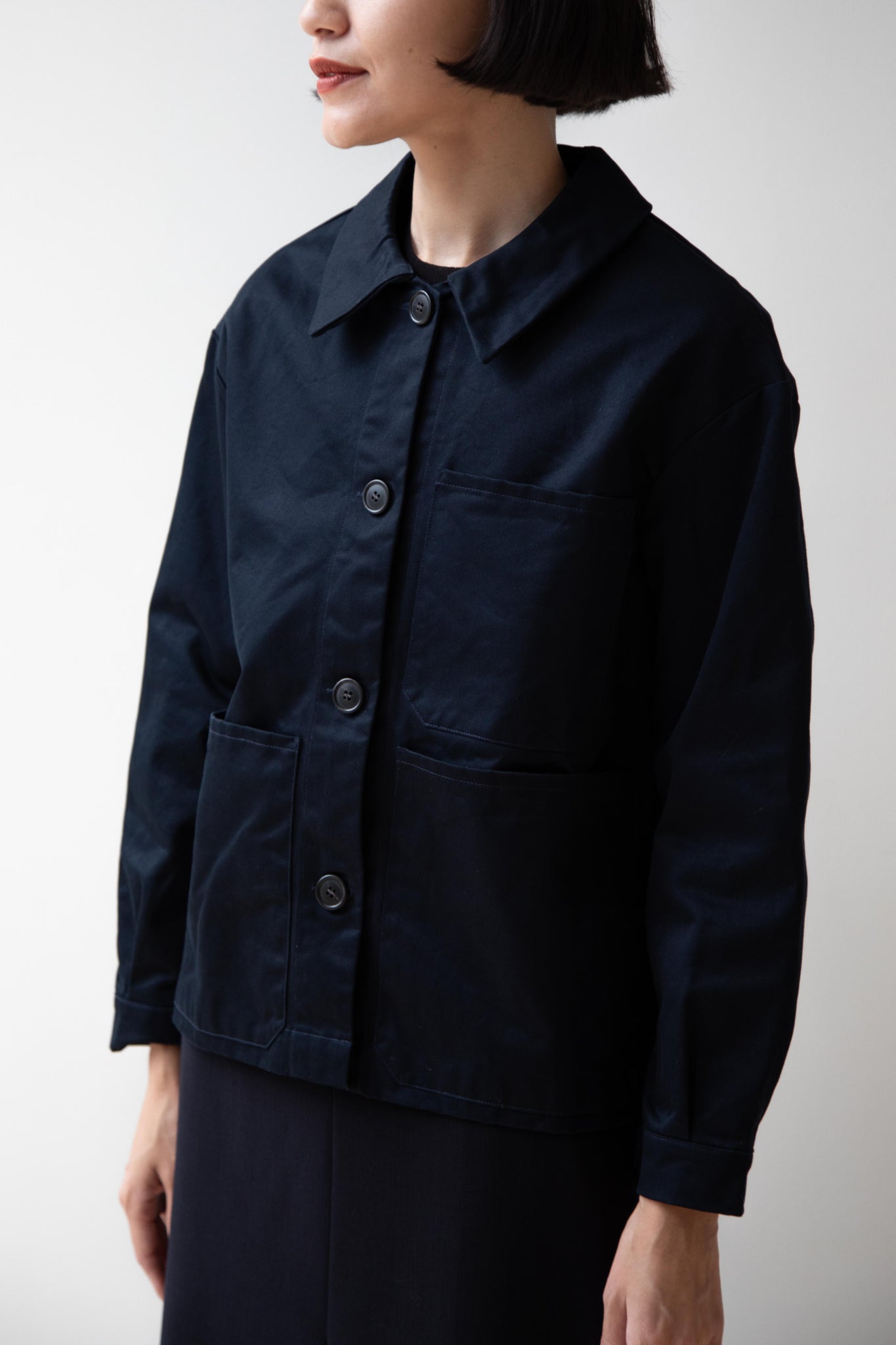 This navy chore coat is a perfect piece to reach for this fall. It's made of a structured gaberdine and has multiple patch pockets on the front and a back inverted pleat with make for a subtle swing shape when worn. There are buttons on the sleeve cuffs too.