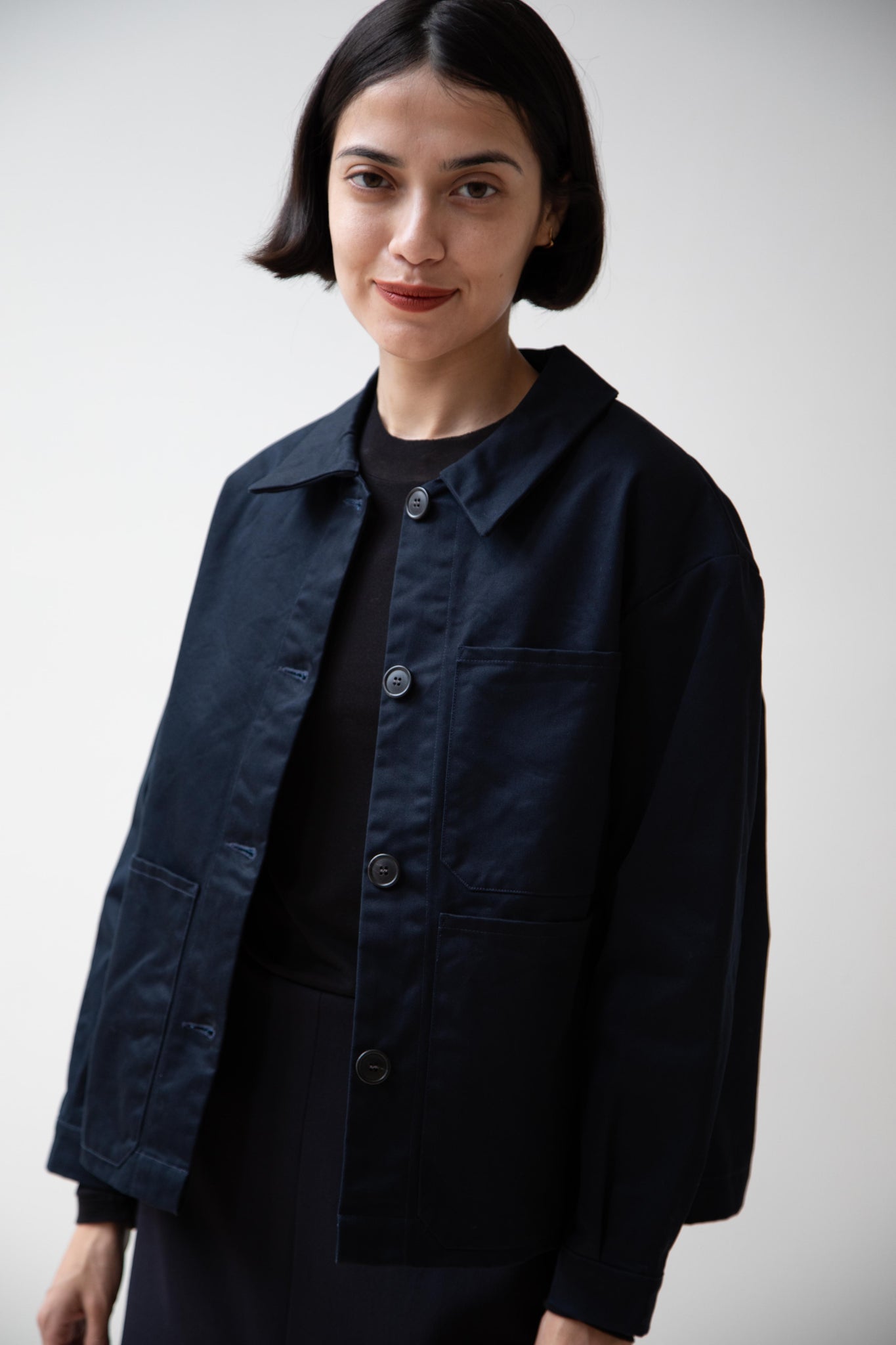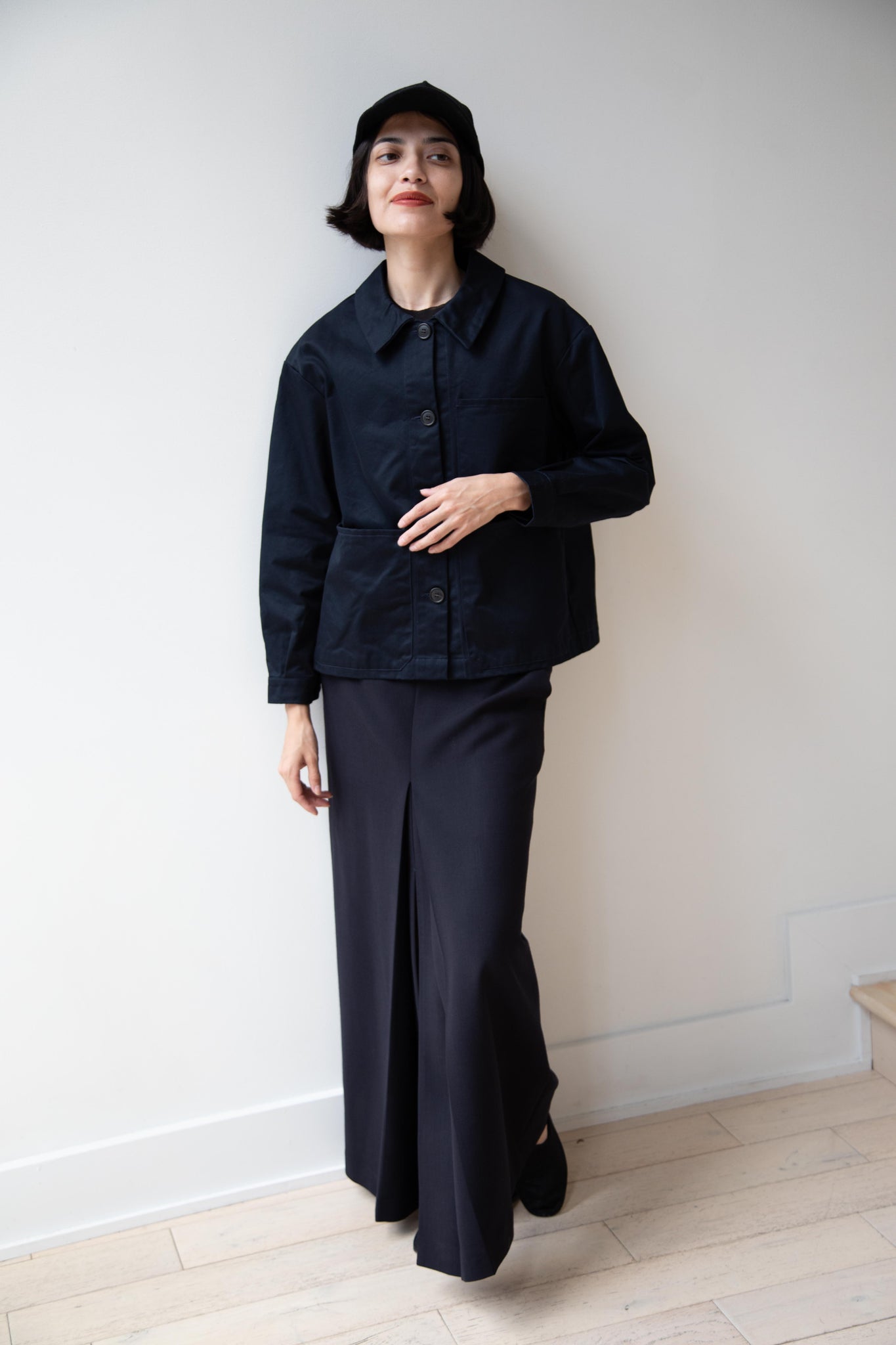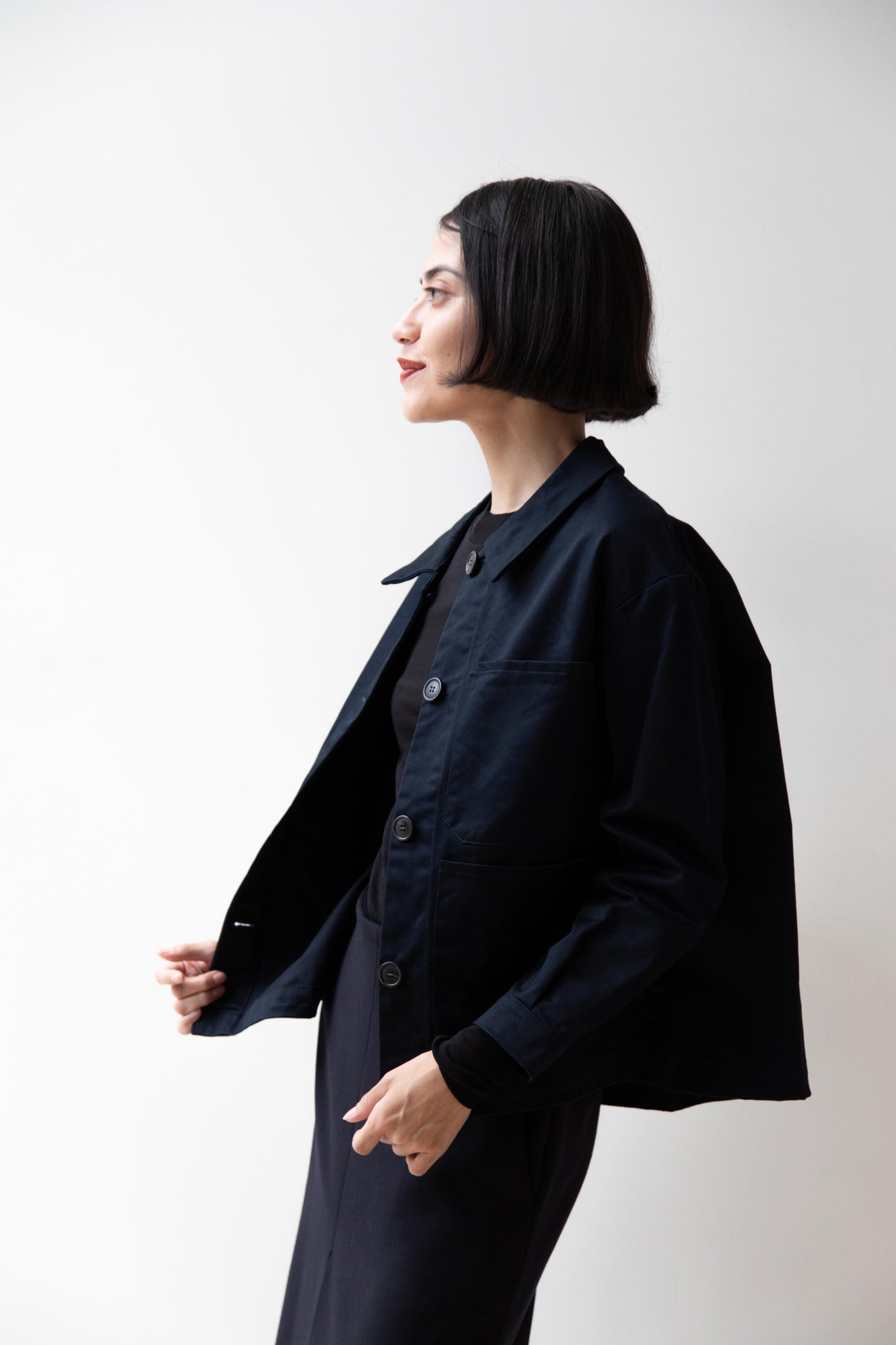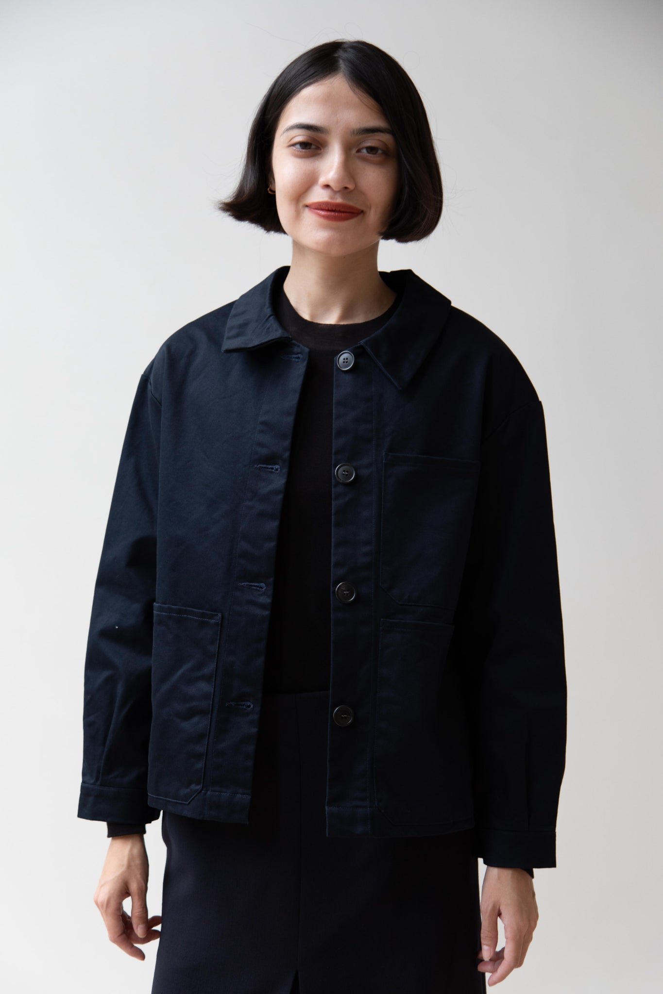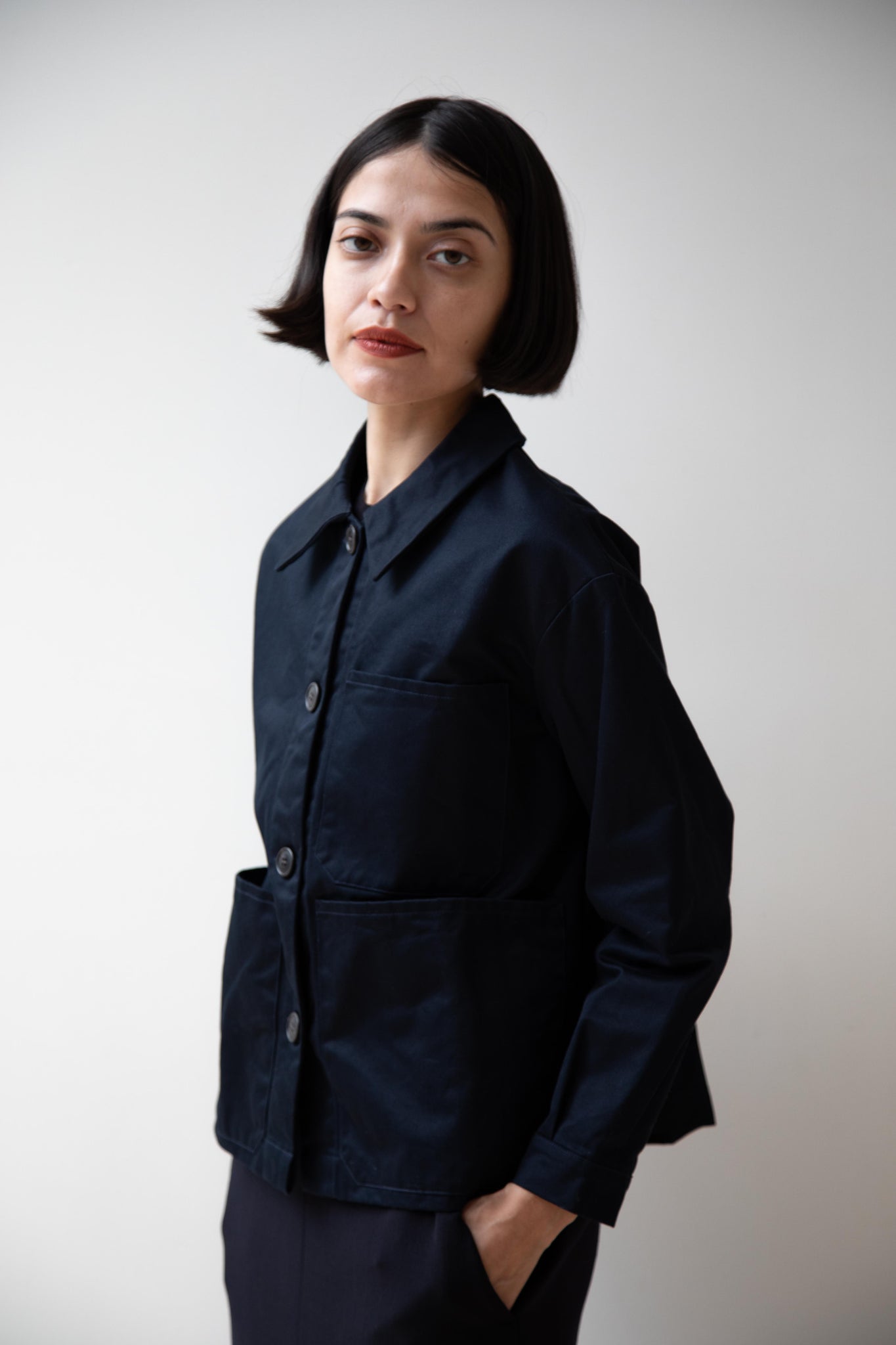 This navy chore coat is a perfect piece to reach for this fall. It's made of a structured gaberdine and has multiple patch pockets on the front and a back inverted pleat with make for a subtle swing shape when worn. There are buttons on the sleeve cuffs too.