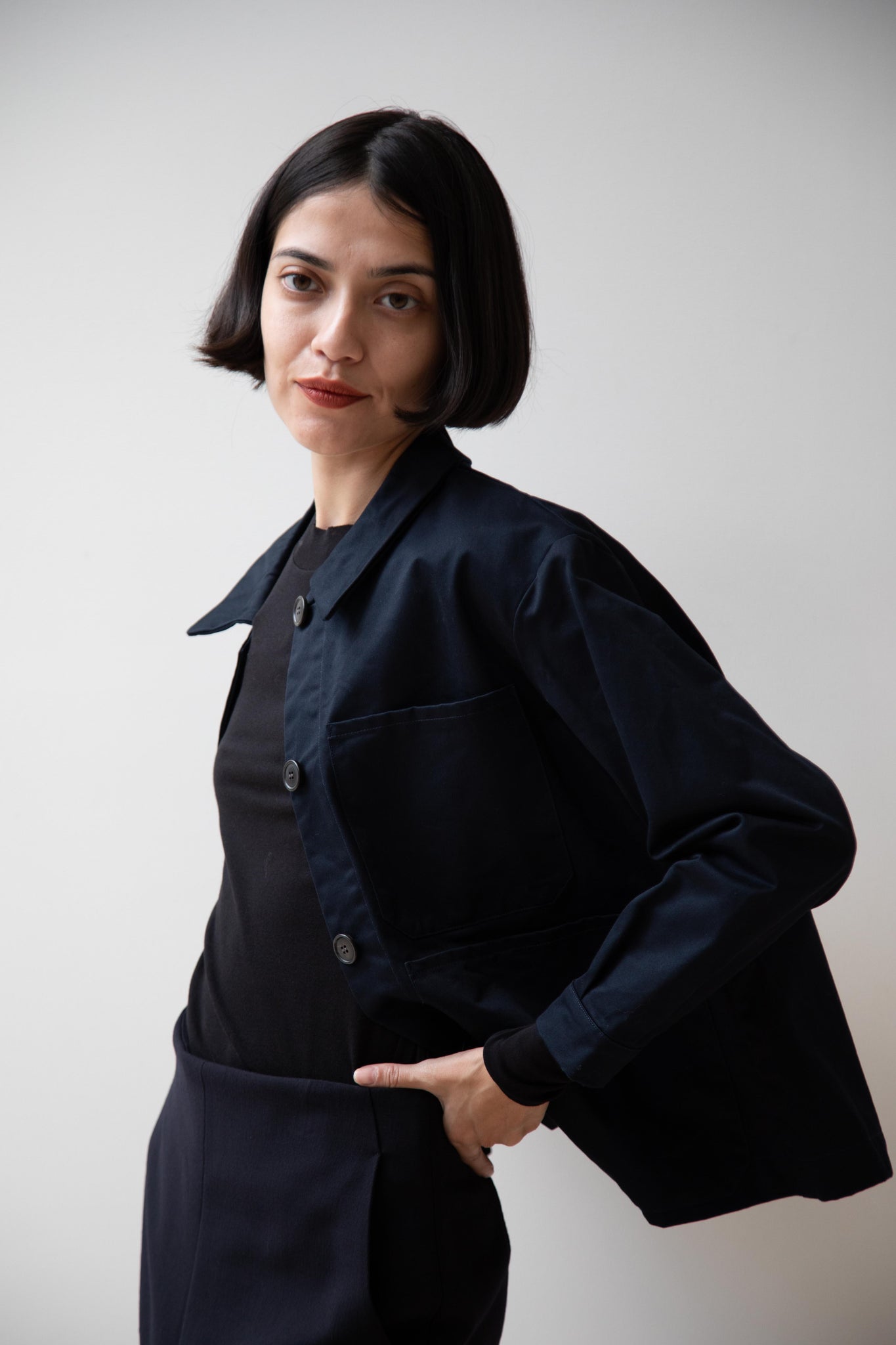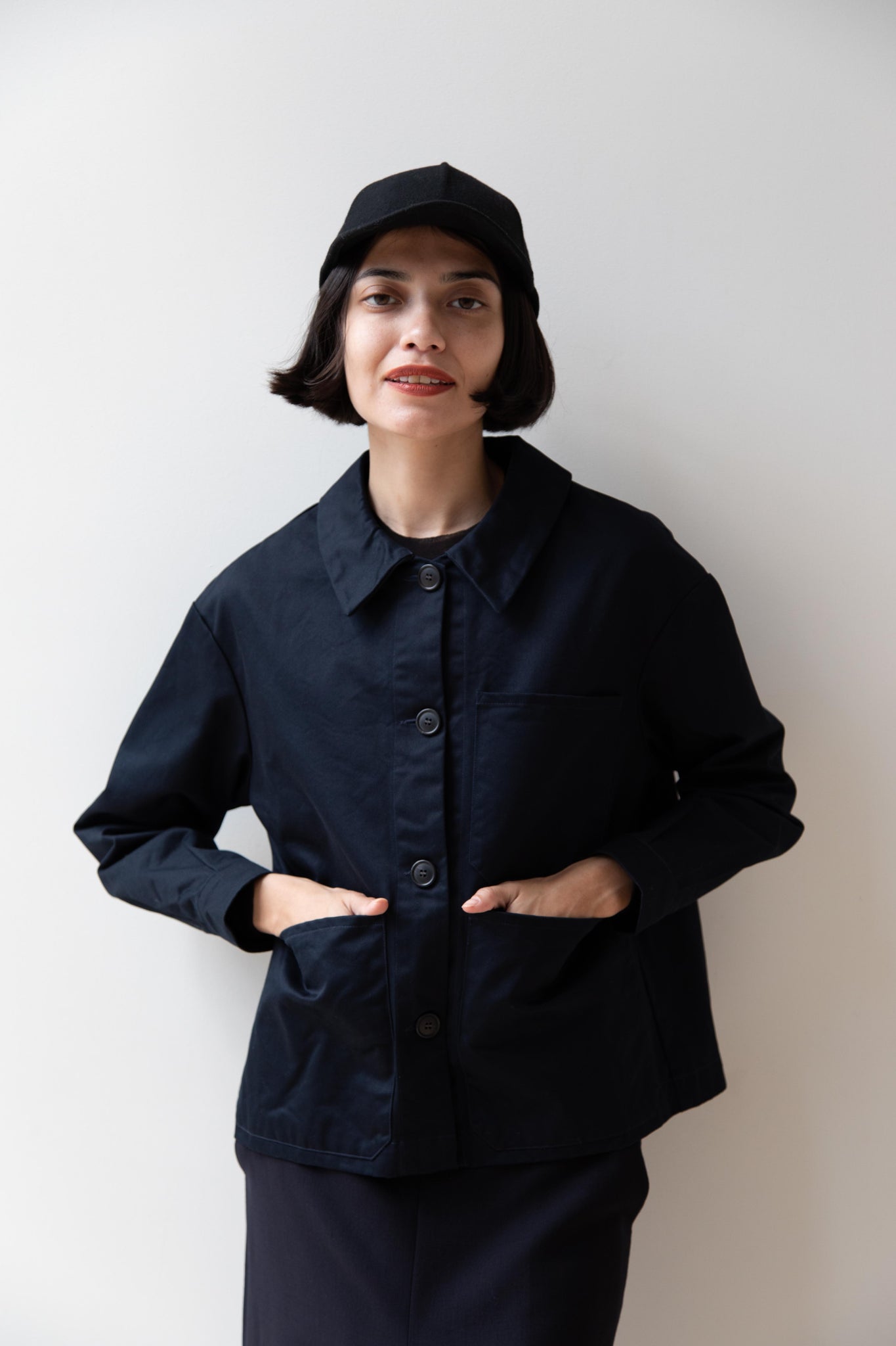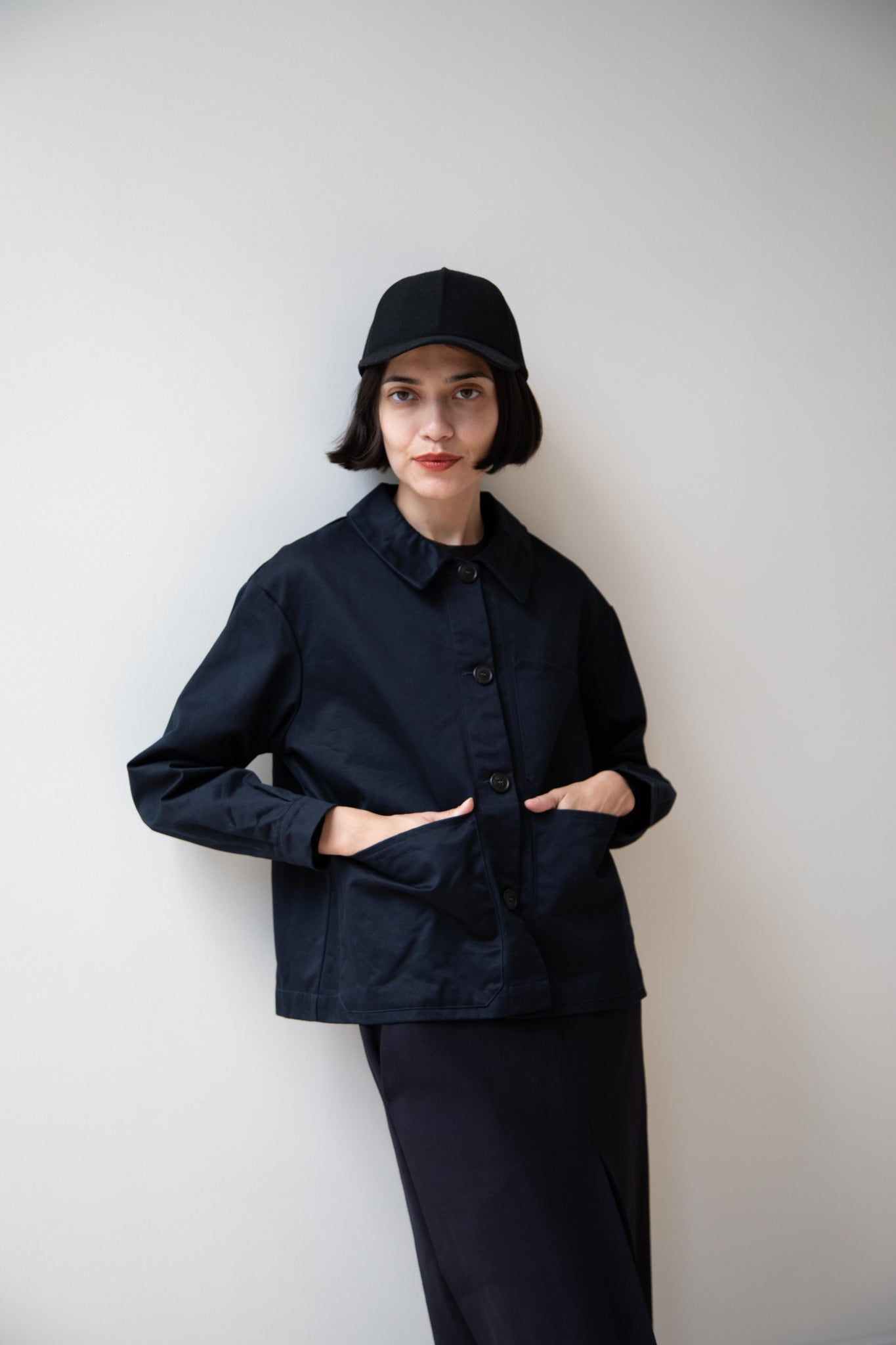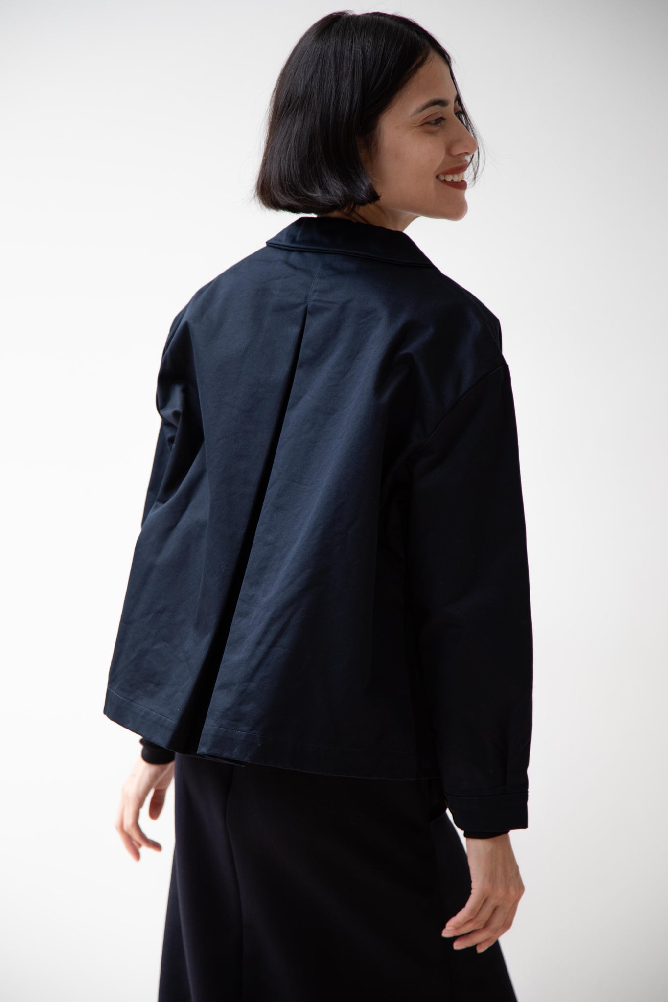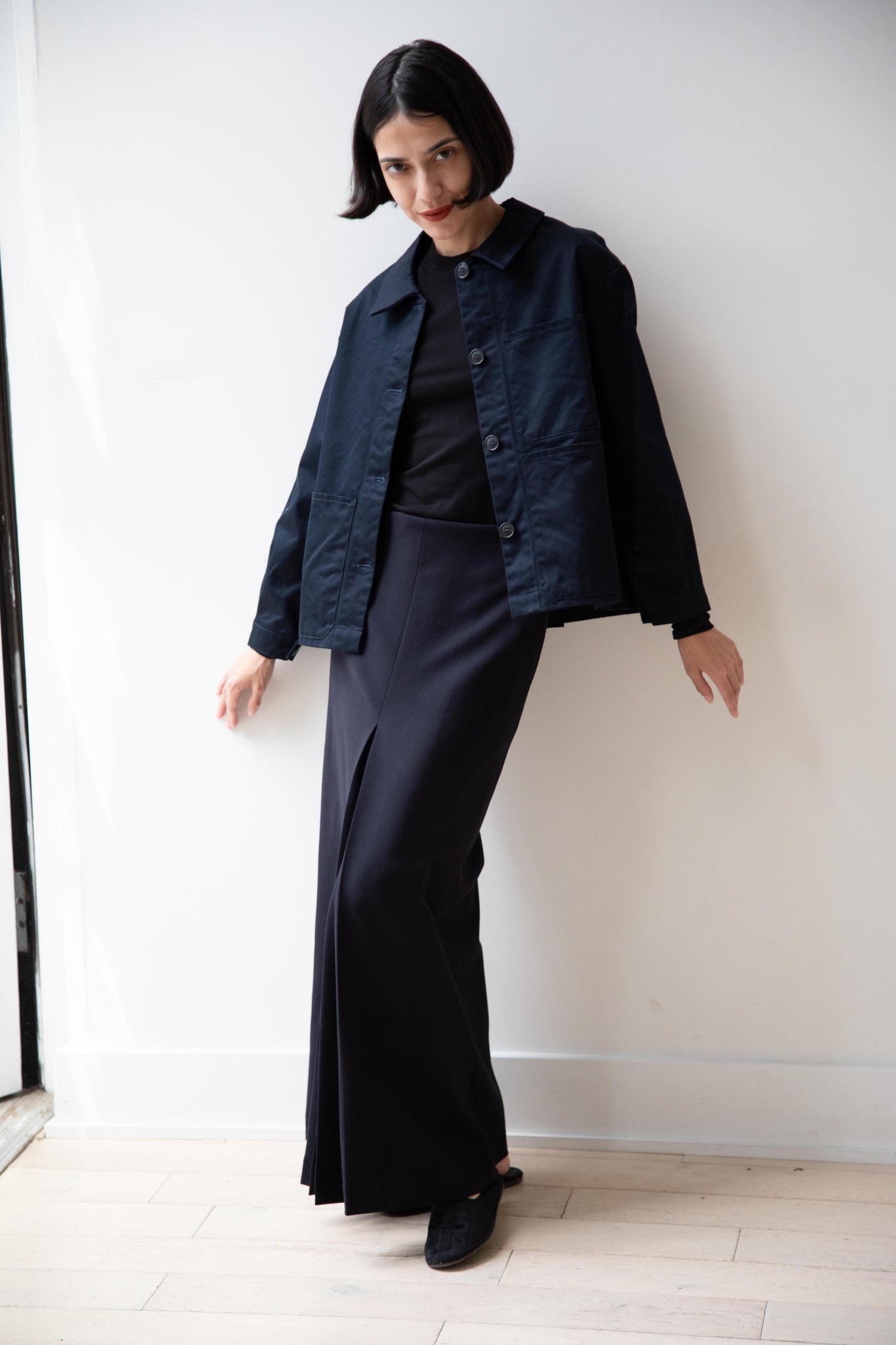 This navy chore coat is a perfect piece to reach for this fall. It's made of a structured gaberdine and has multiple patch pockets on the front and a back inverted pleat with make for a subtle swing shape when worn. There are buttons on the sleeve cuffs too.