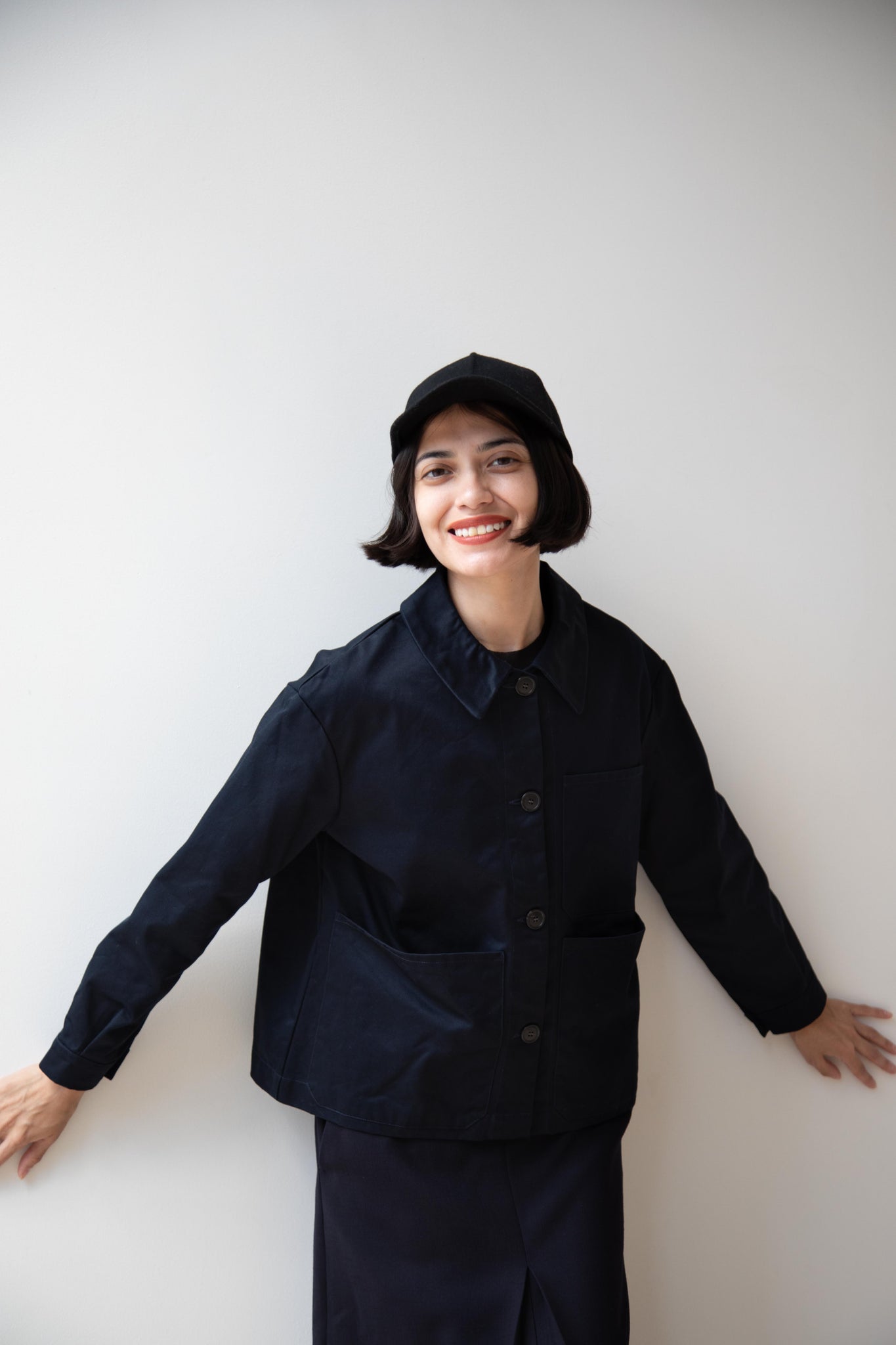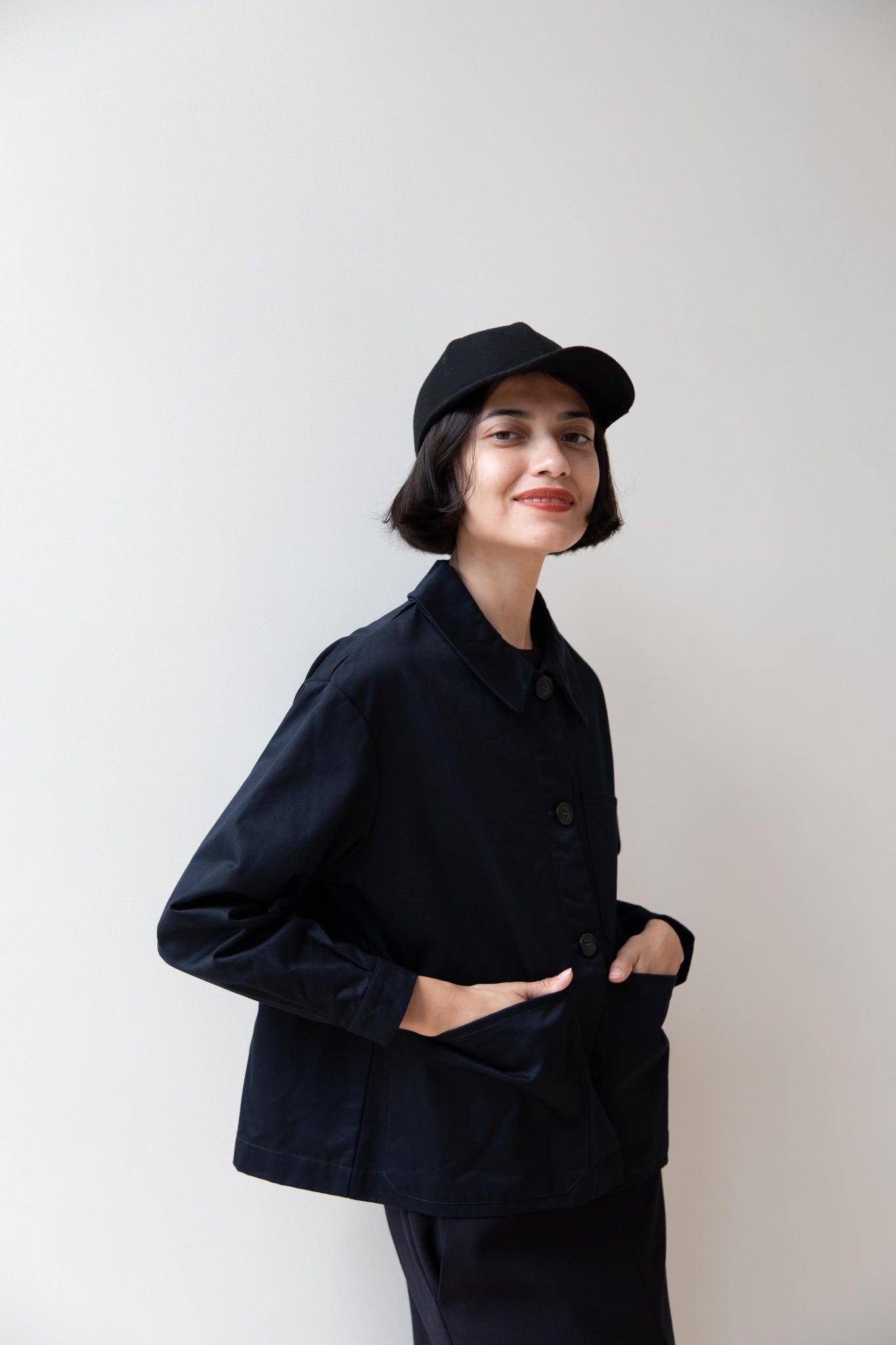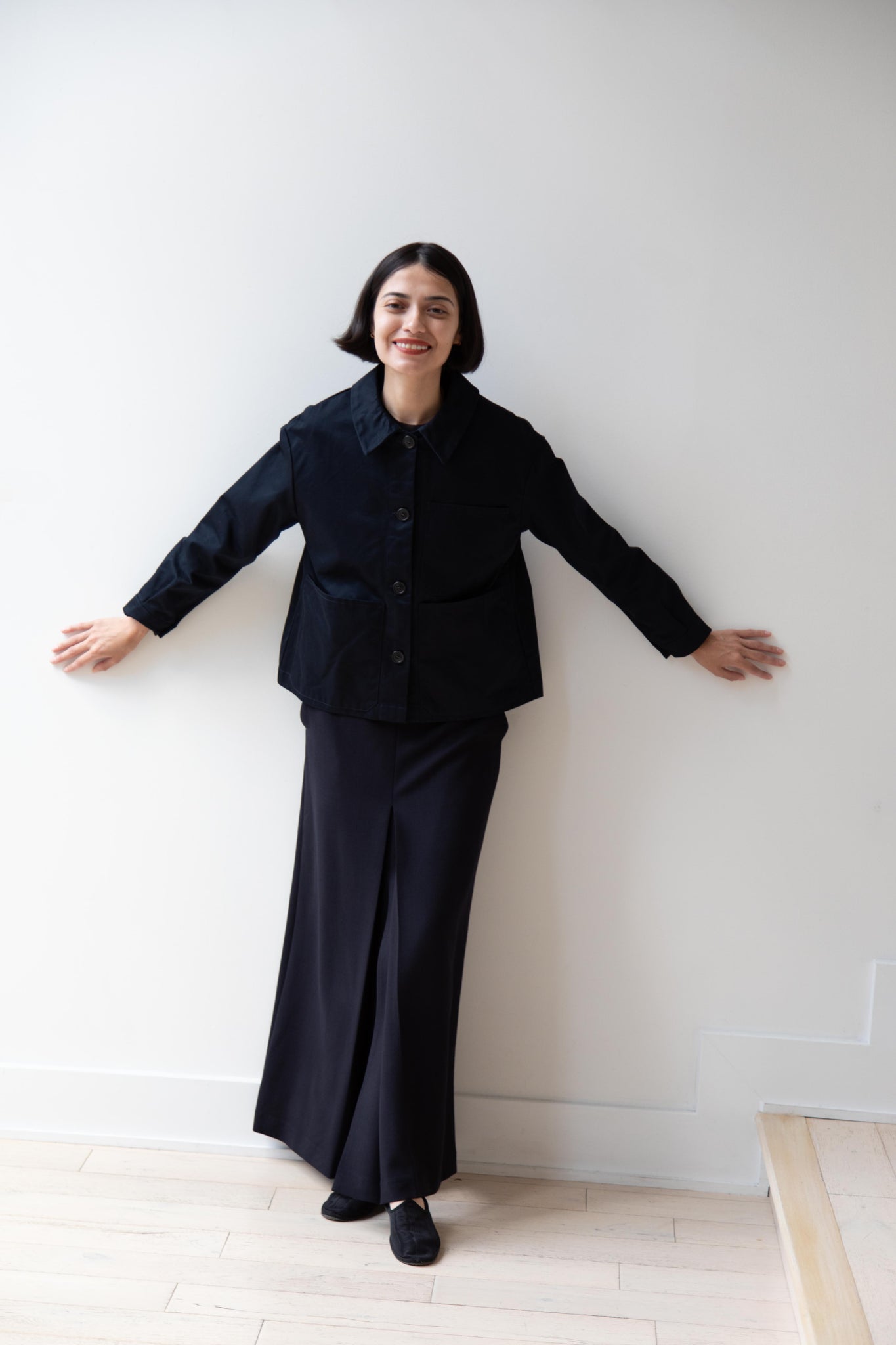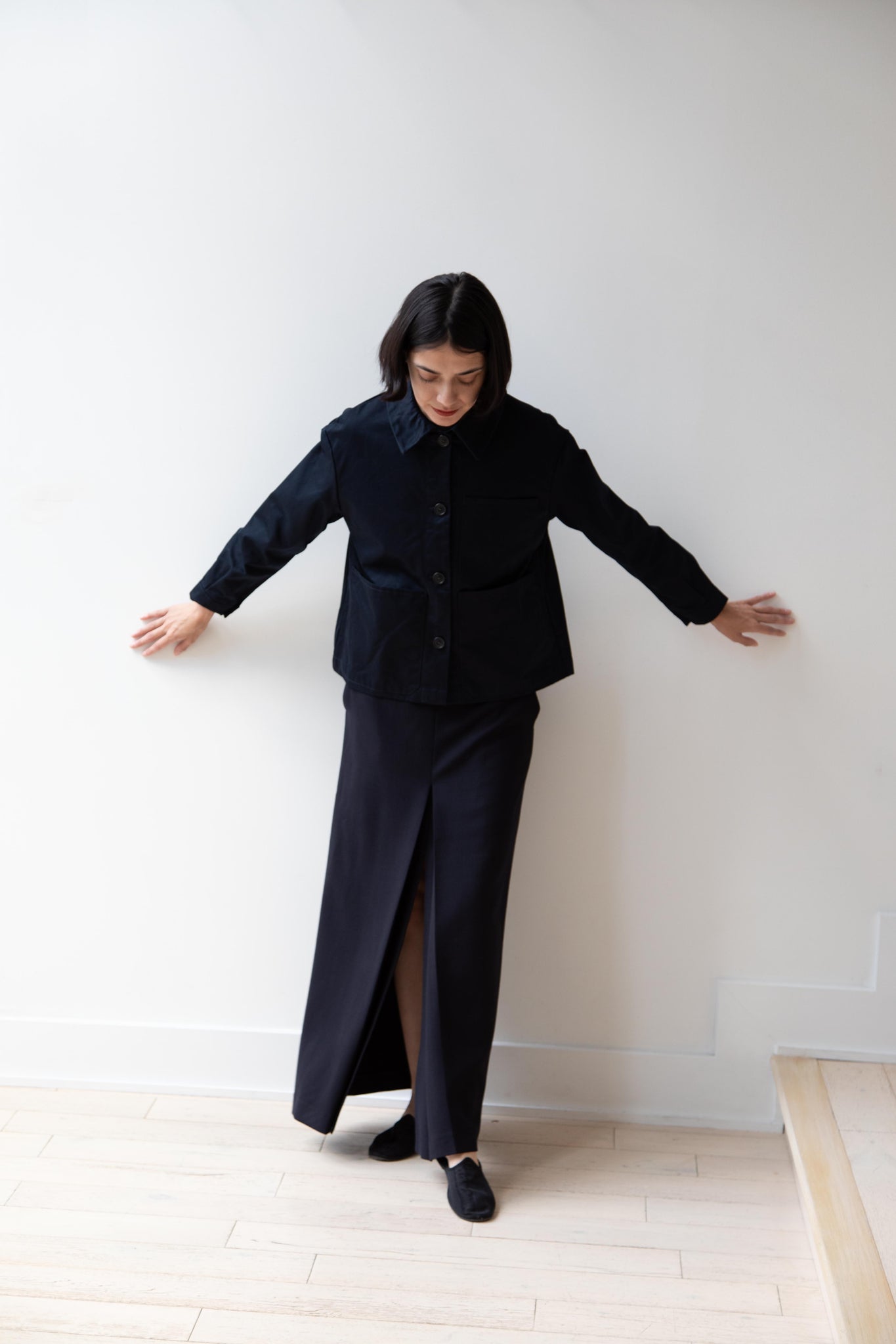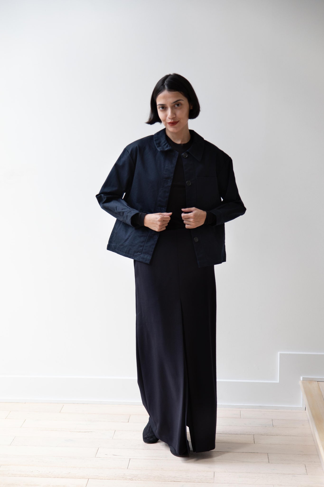 This navy chore coat is a perfect piece to reach for this fall. It's made of a structured gaberdine and has multiple patch pockets on the front and a back inverted pleat with make for a subtle swing shape when worn. There are buttons on the sleeve cuffs too.