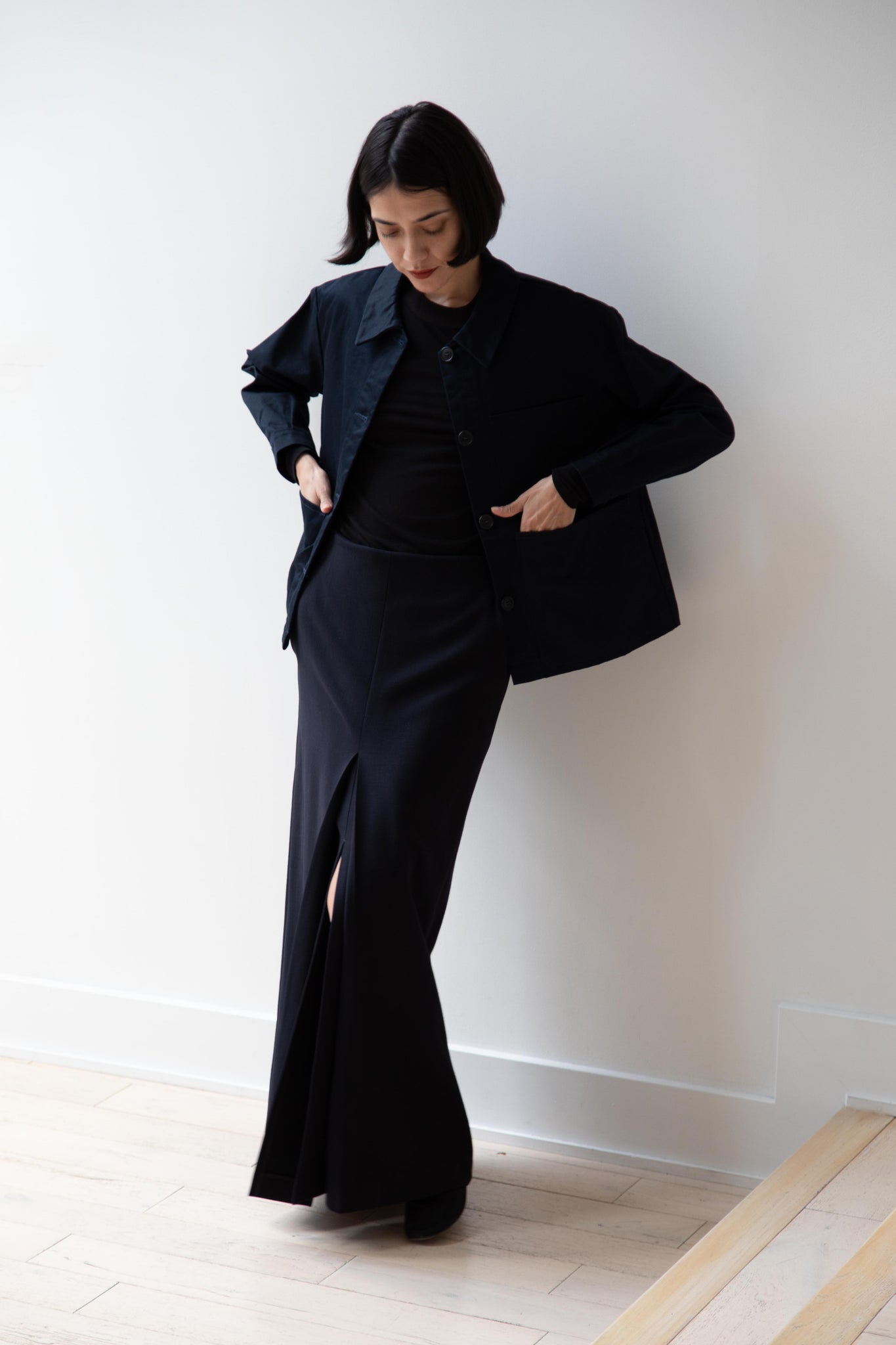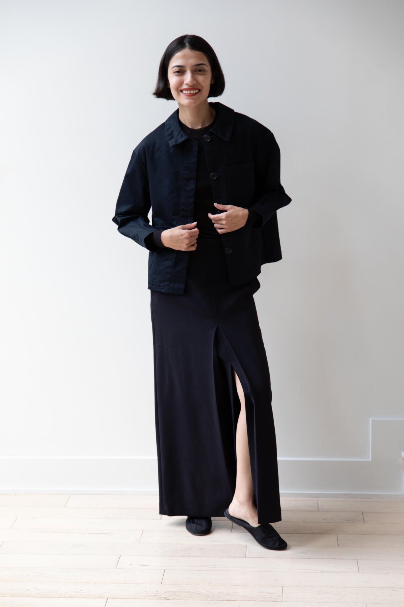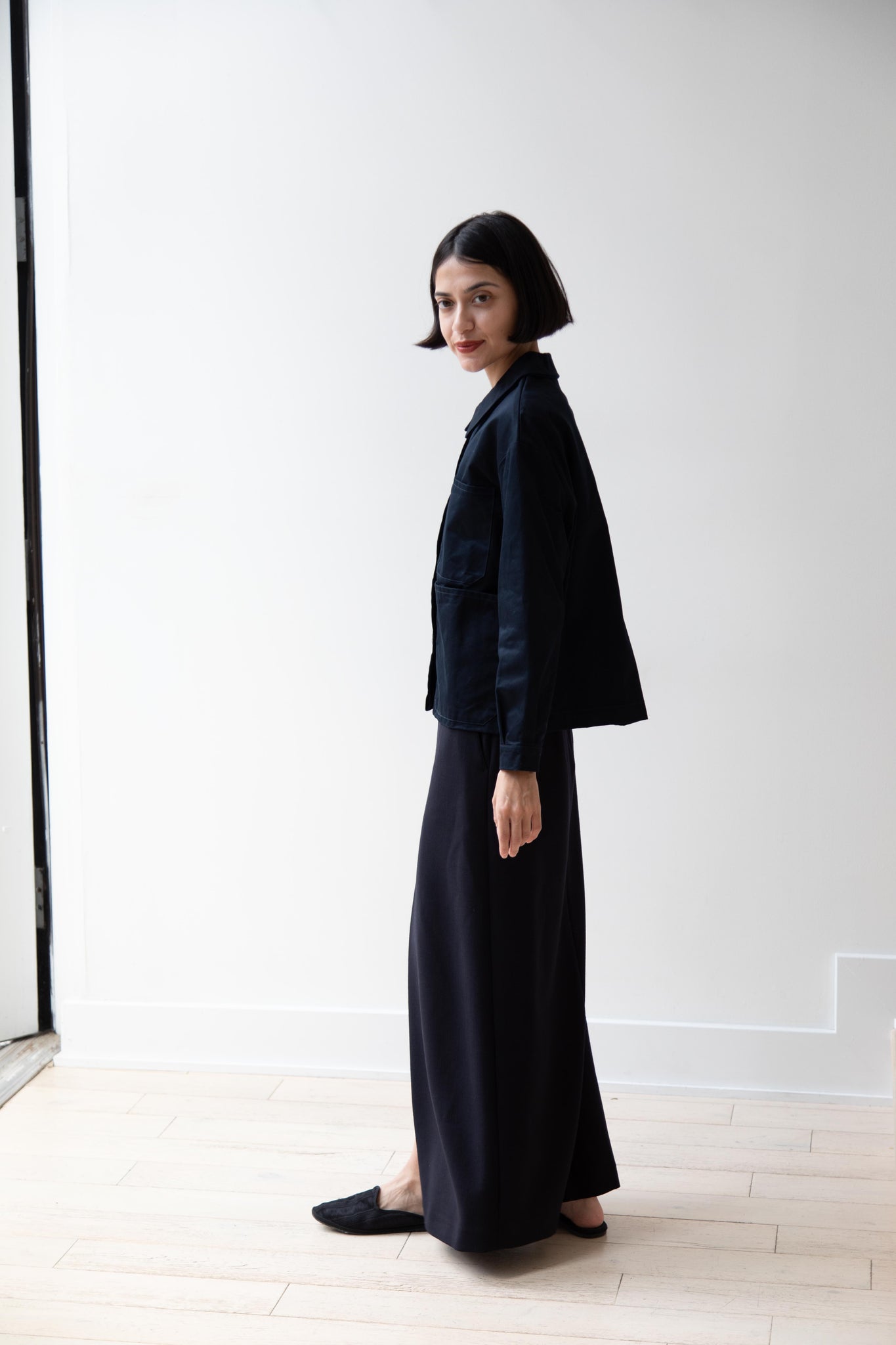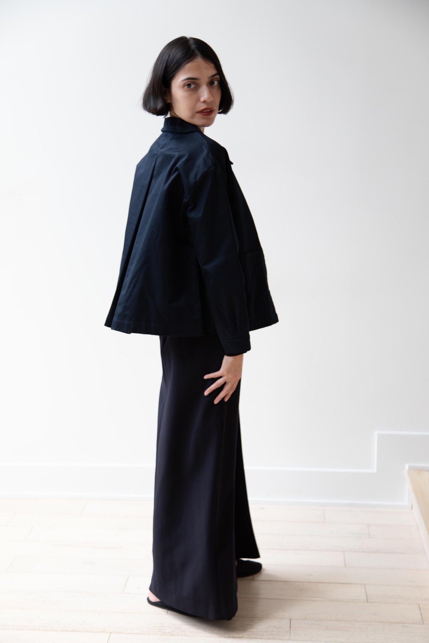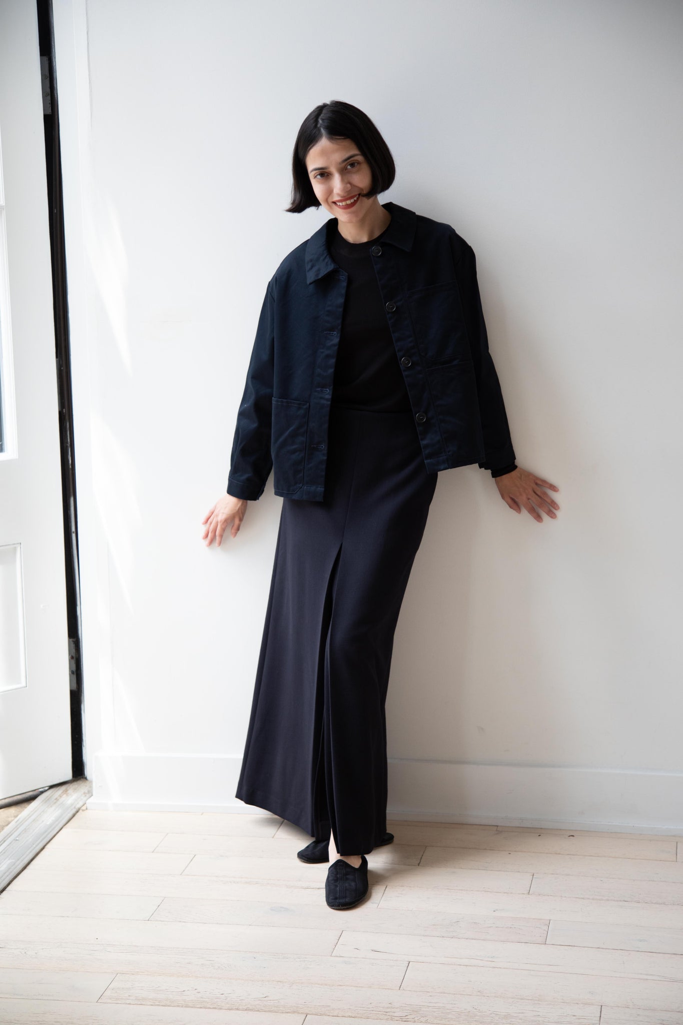 This navy chore coat is a perfect piece to reach for this fall. It's made of a structured gaberdine and has multiple patch pockets on the front and a back inverted pleat with make for a subtle swing shape when worn. There are buttons on the sleeve cuffs too.