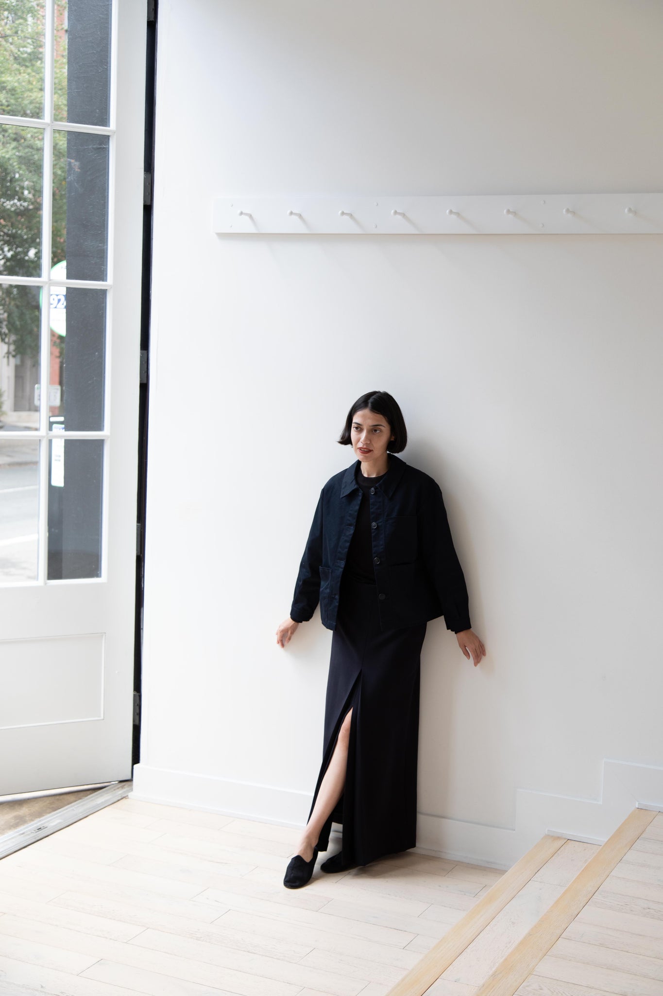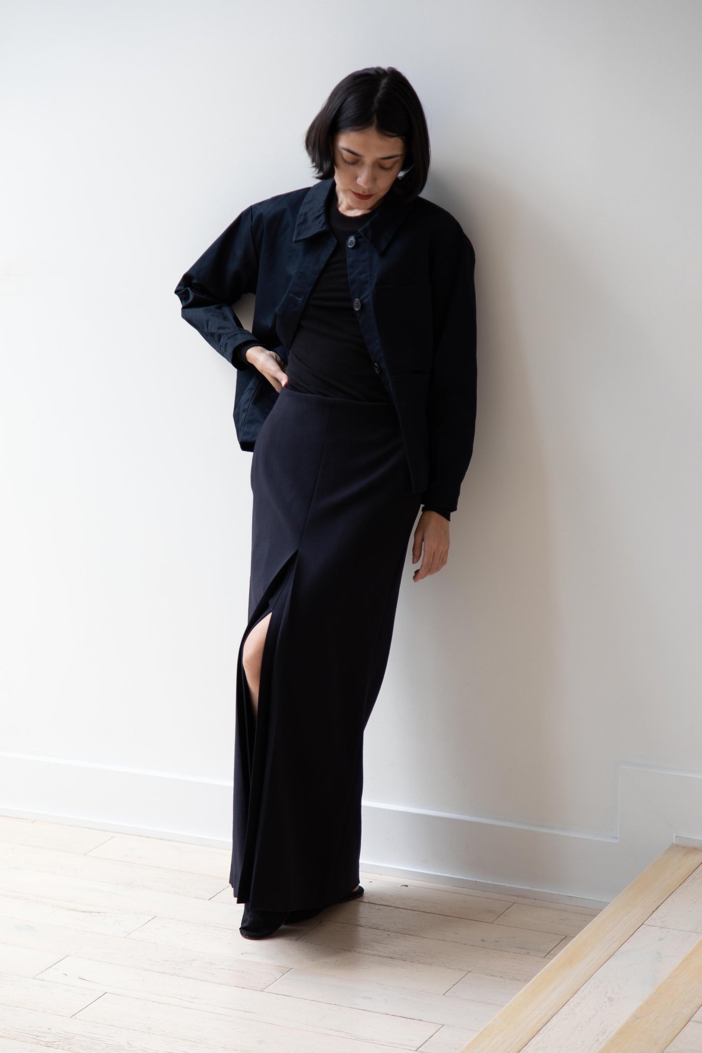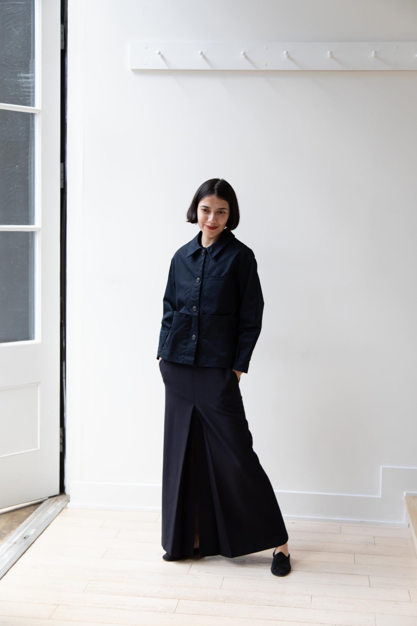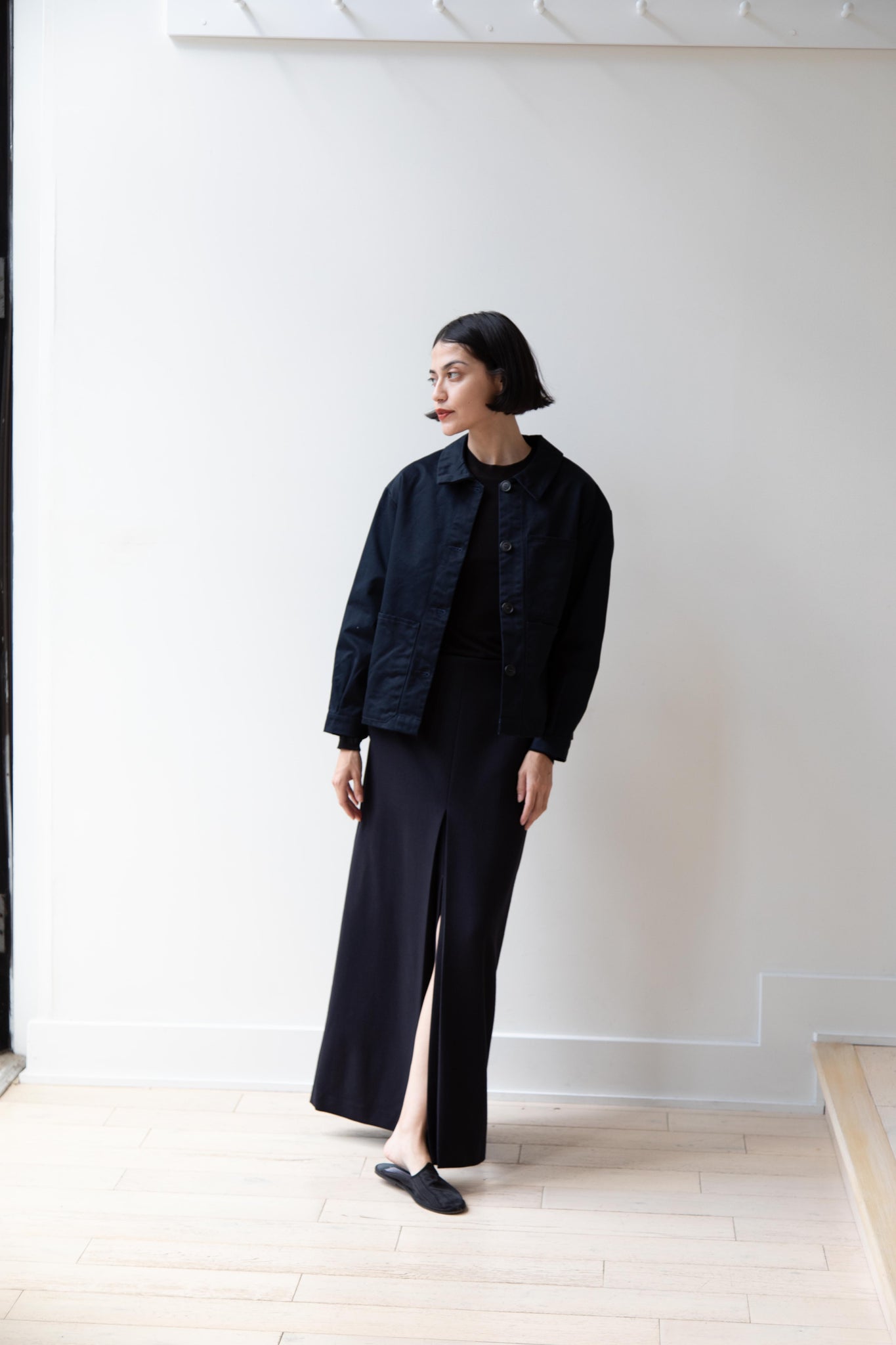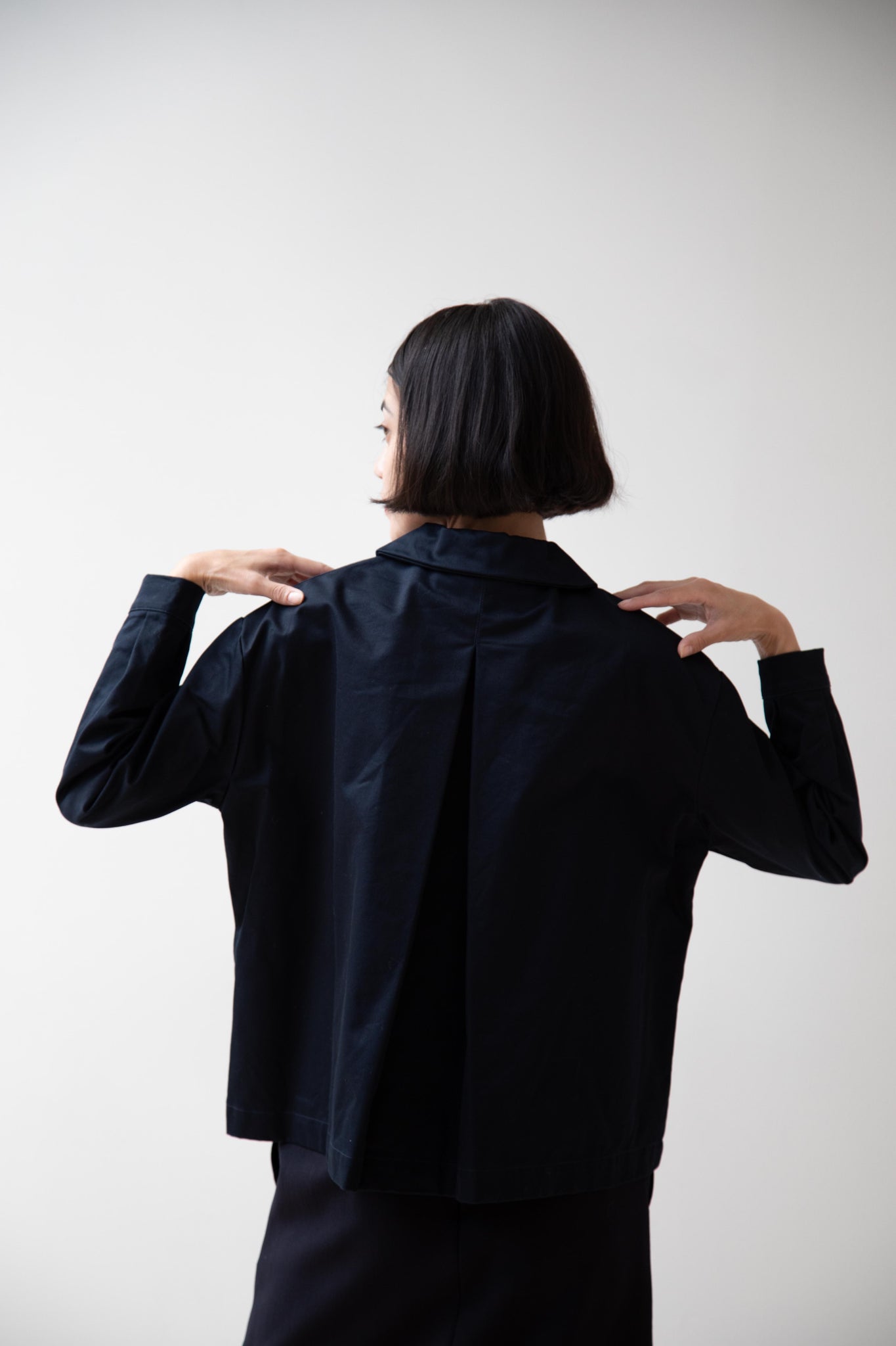 This navy chore coat is a perfect piece to reach for this fall. It's made of a structured gaberdine and has multiple patch pockets on the front and a back inverted pleat with make for a subtle swing shape when worn. There are buttons on the sleeve cuffs too.