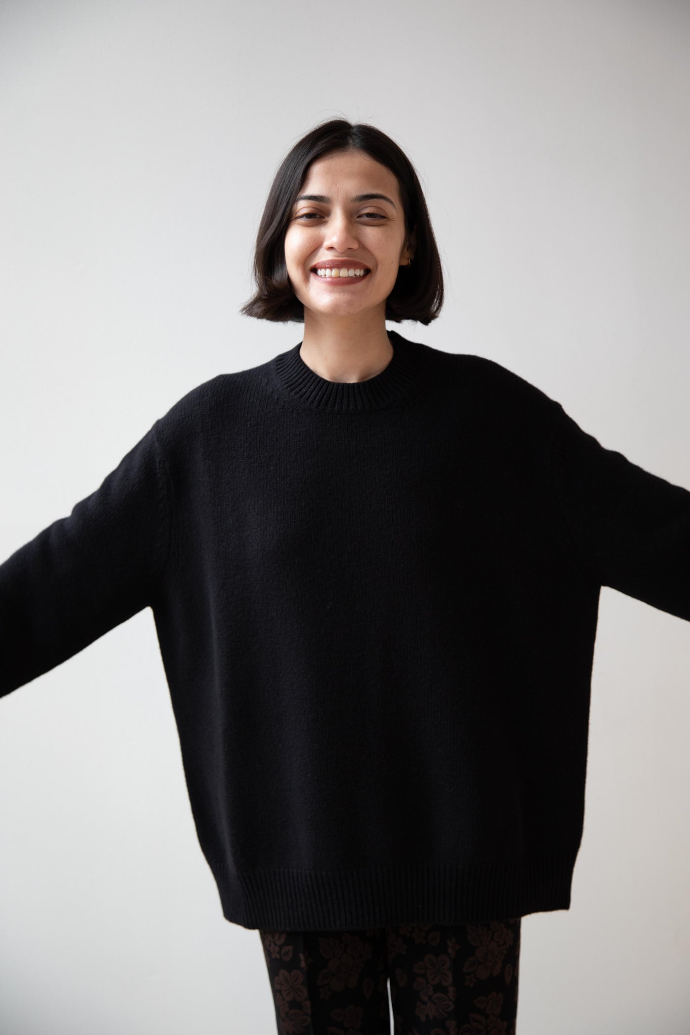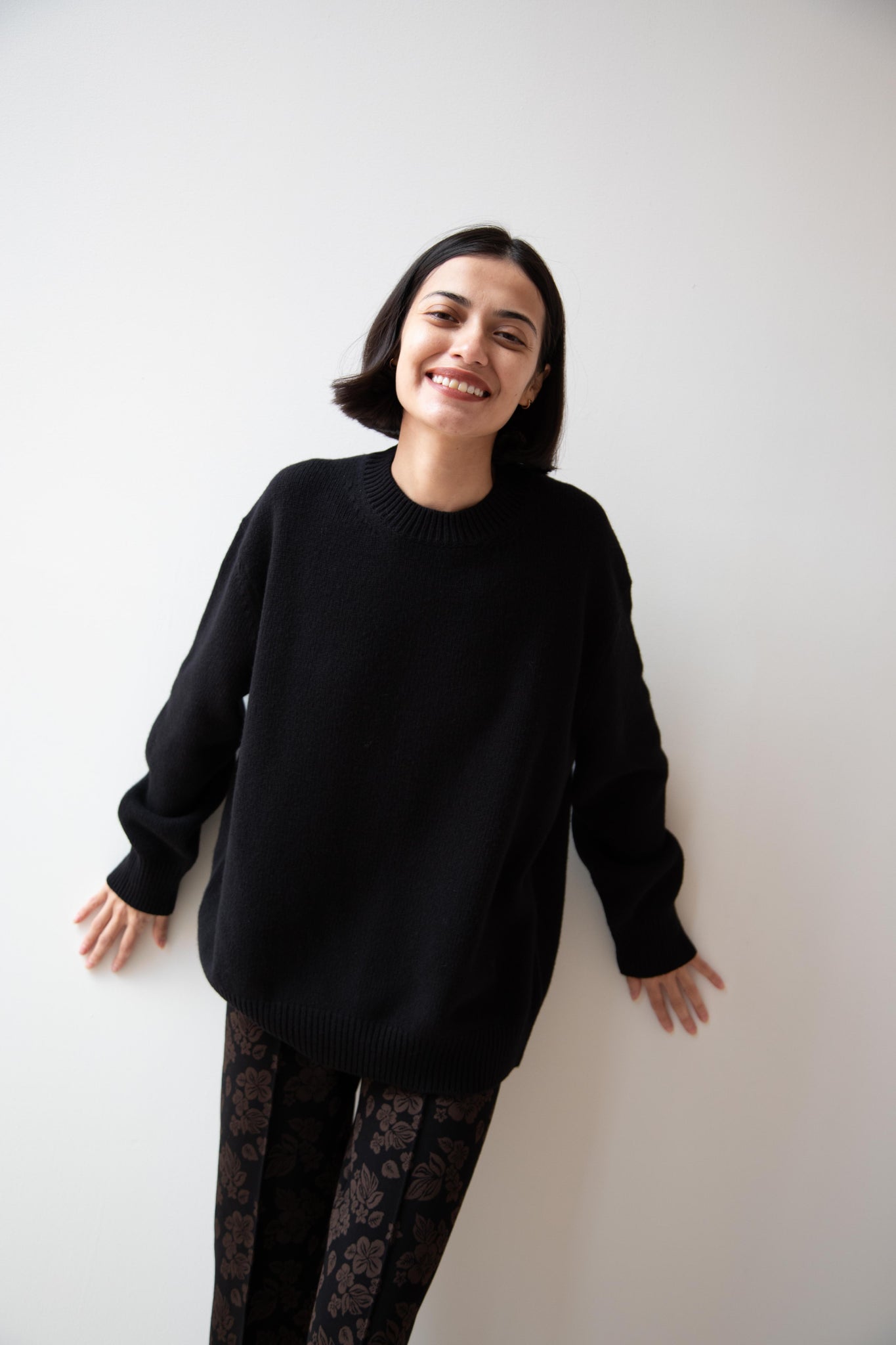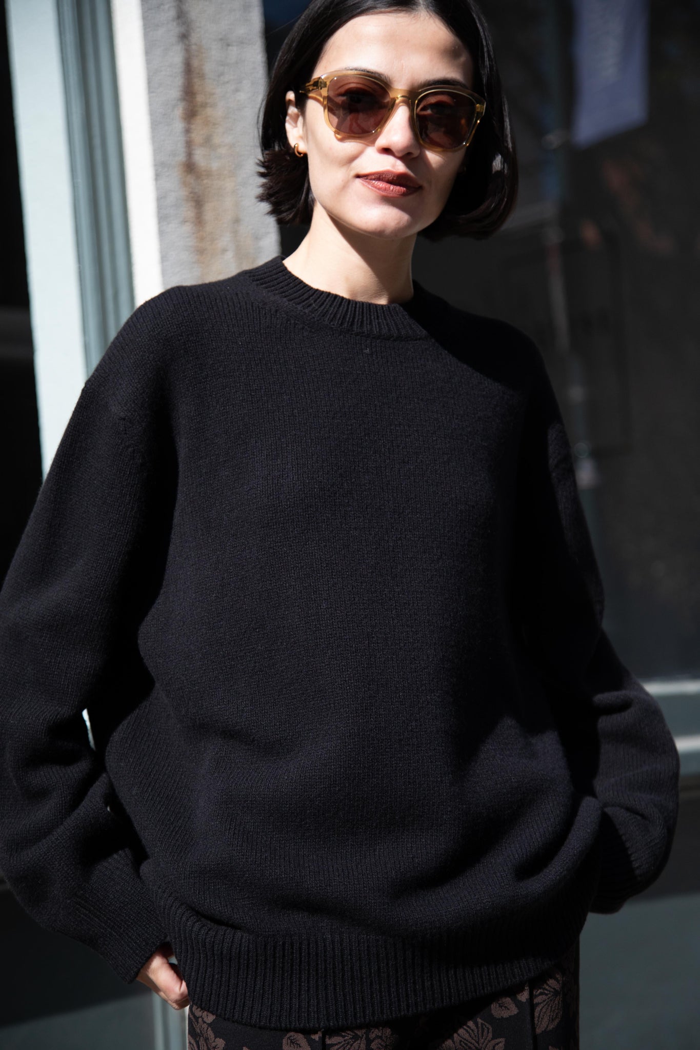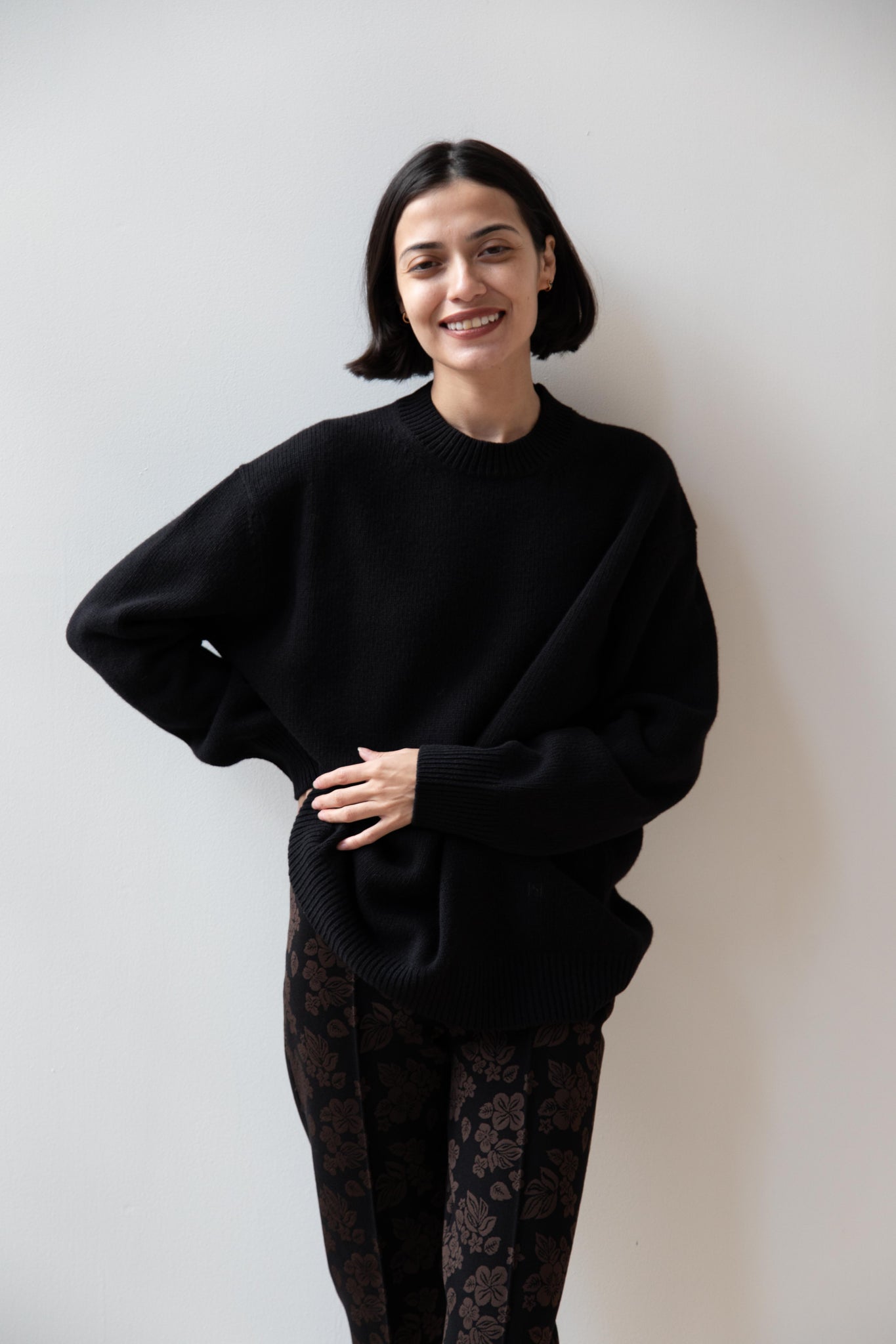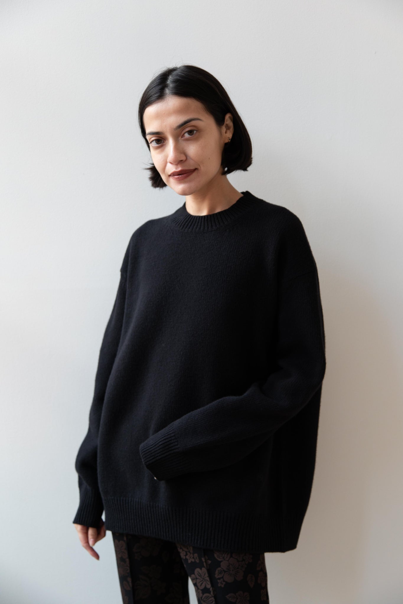 This classic crew neck is just the right amount of oversized. The knit is nice and substantial and the perfect length too. There is a small embroidered tonal logo near the hem of the sweater.