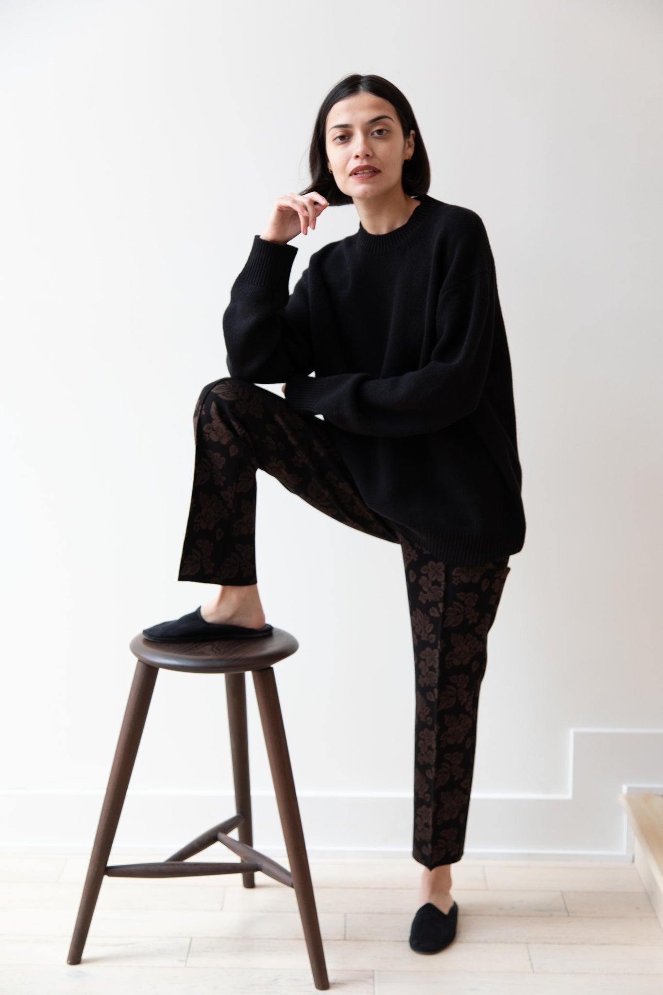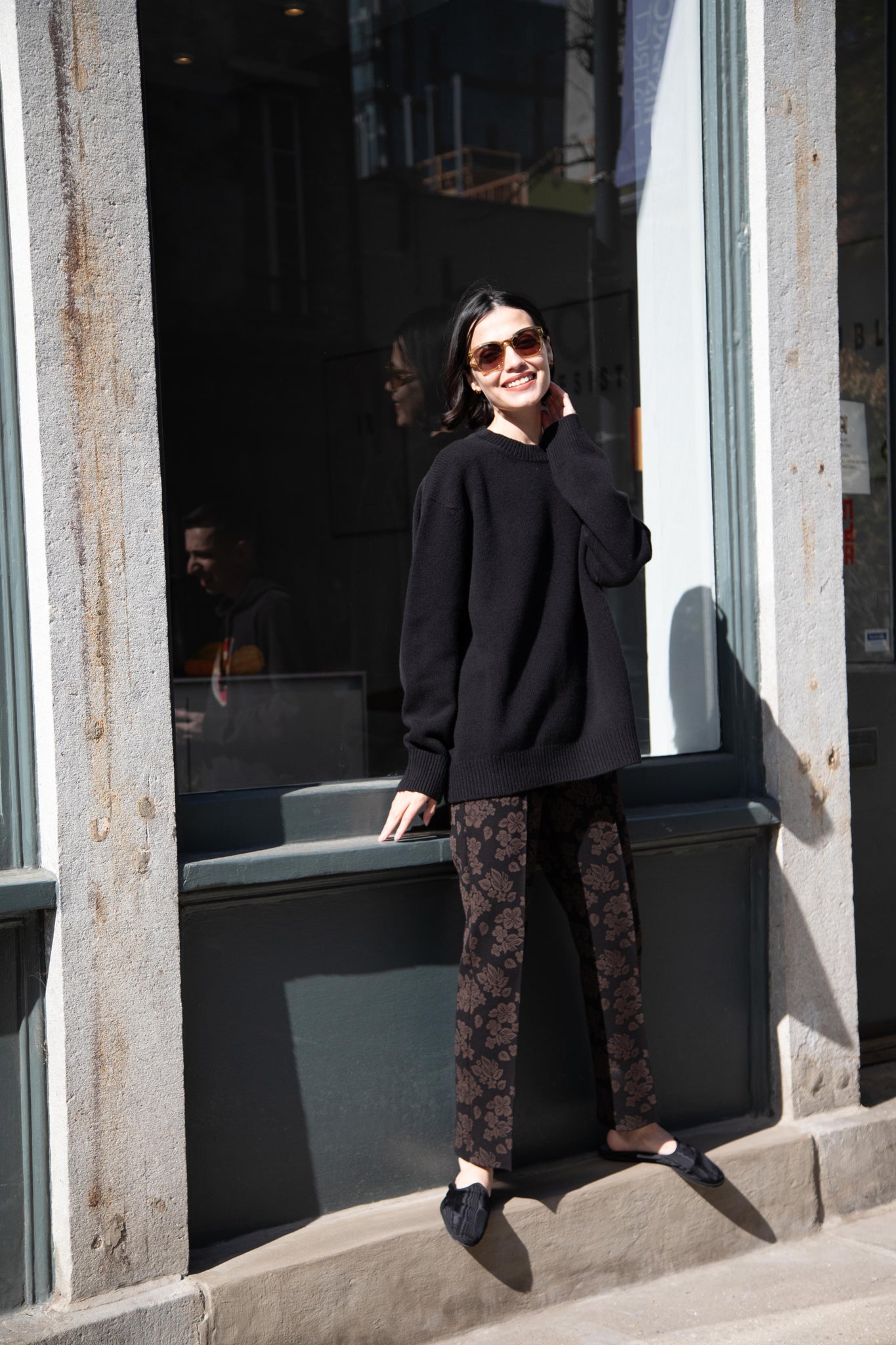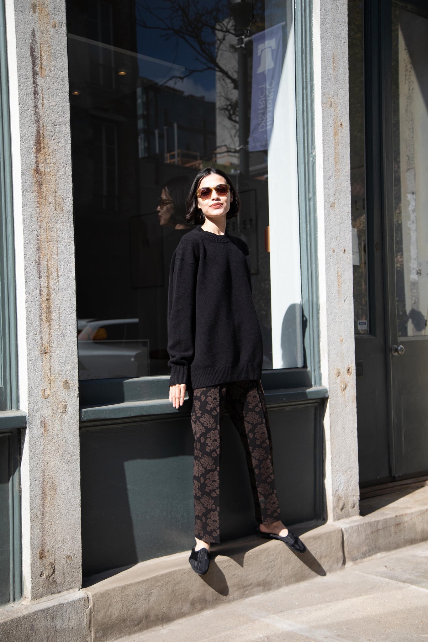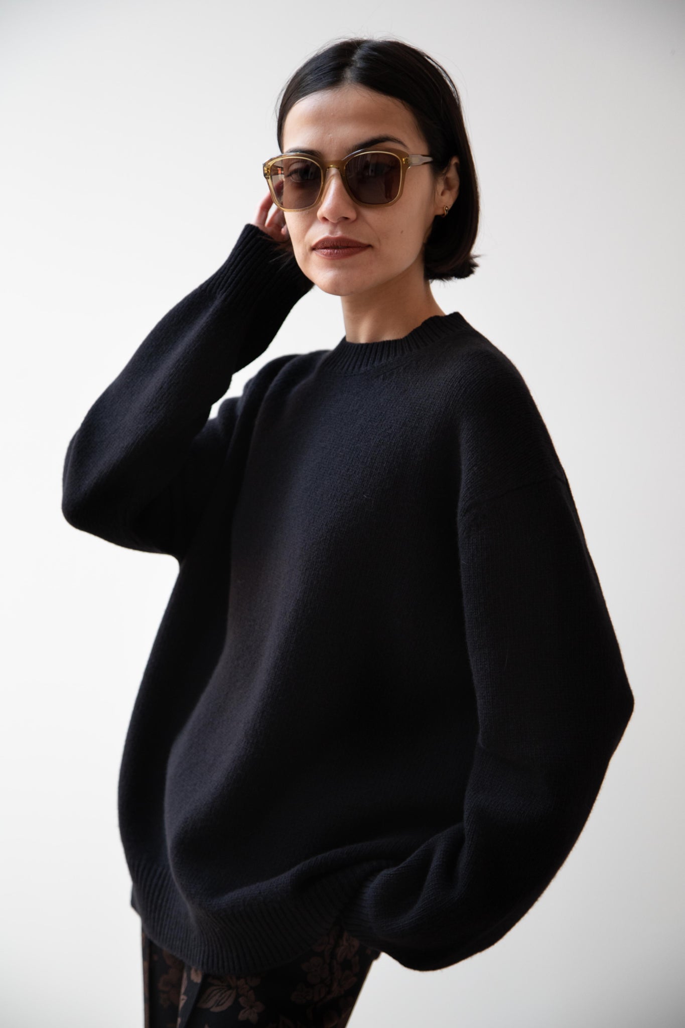 This classic crew neck is just the right amount of oversized. The knit is nice and substantial and the perfect length too. There is a small embroidered tonal logo near the hem of the sweater.