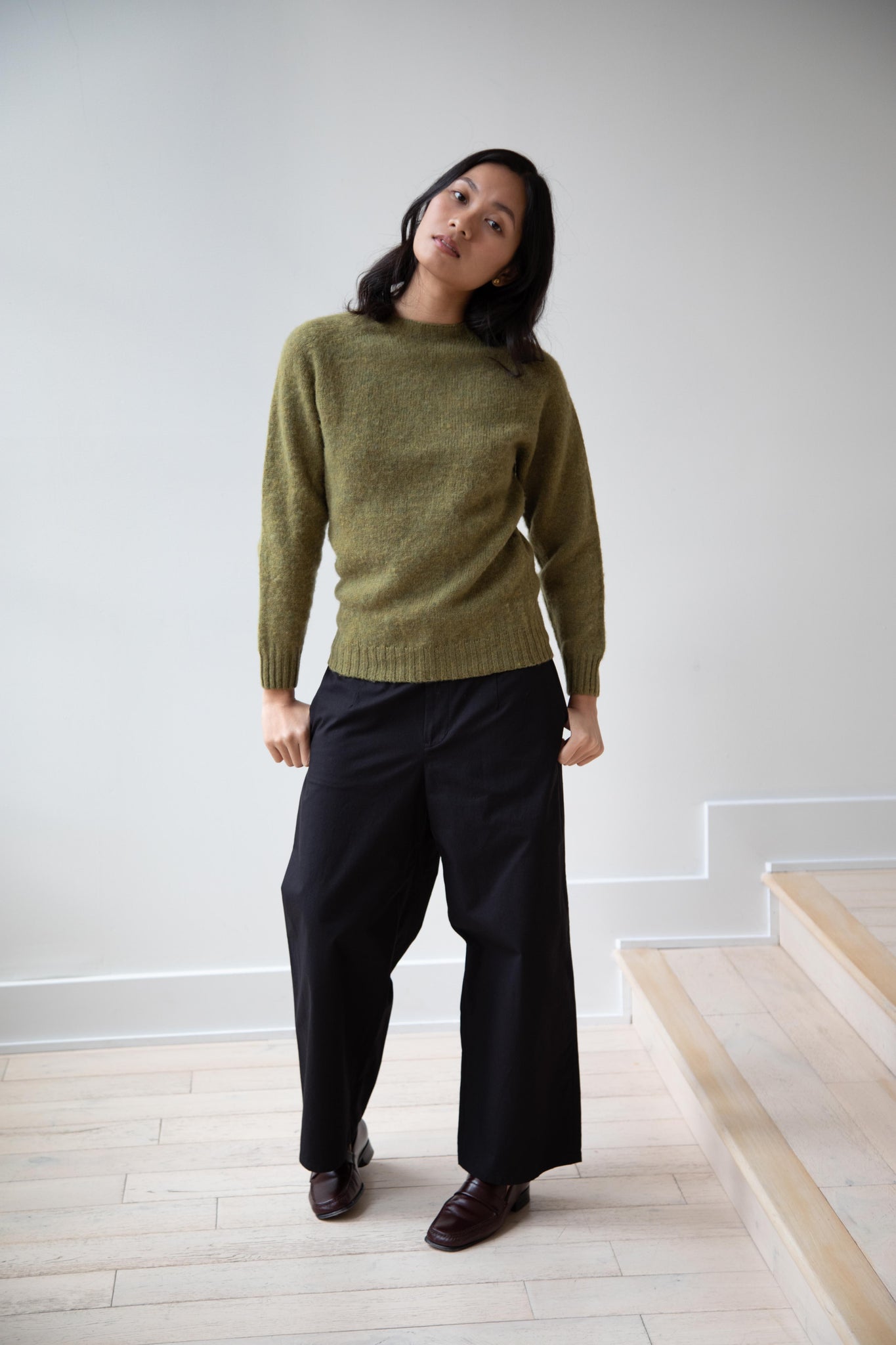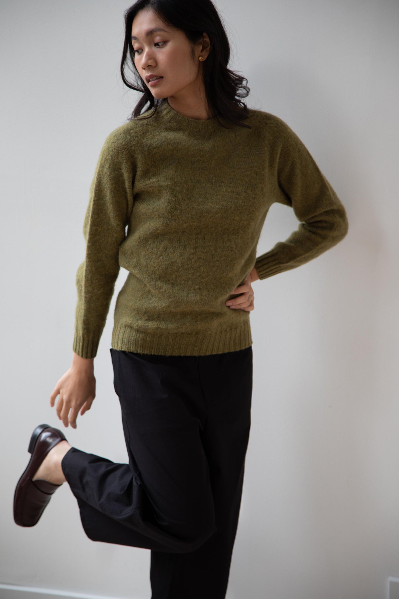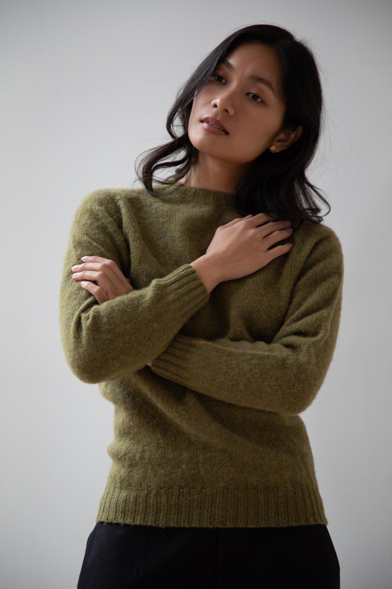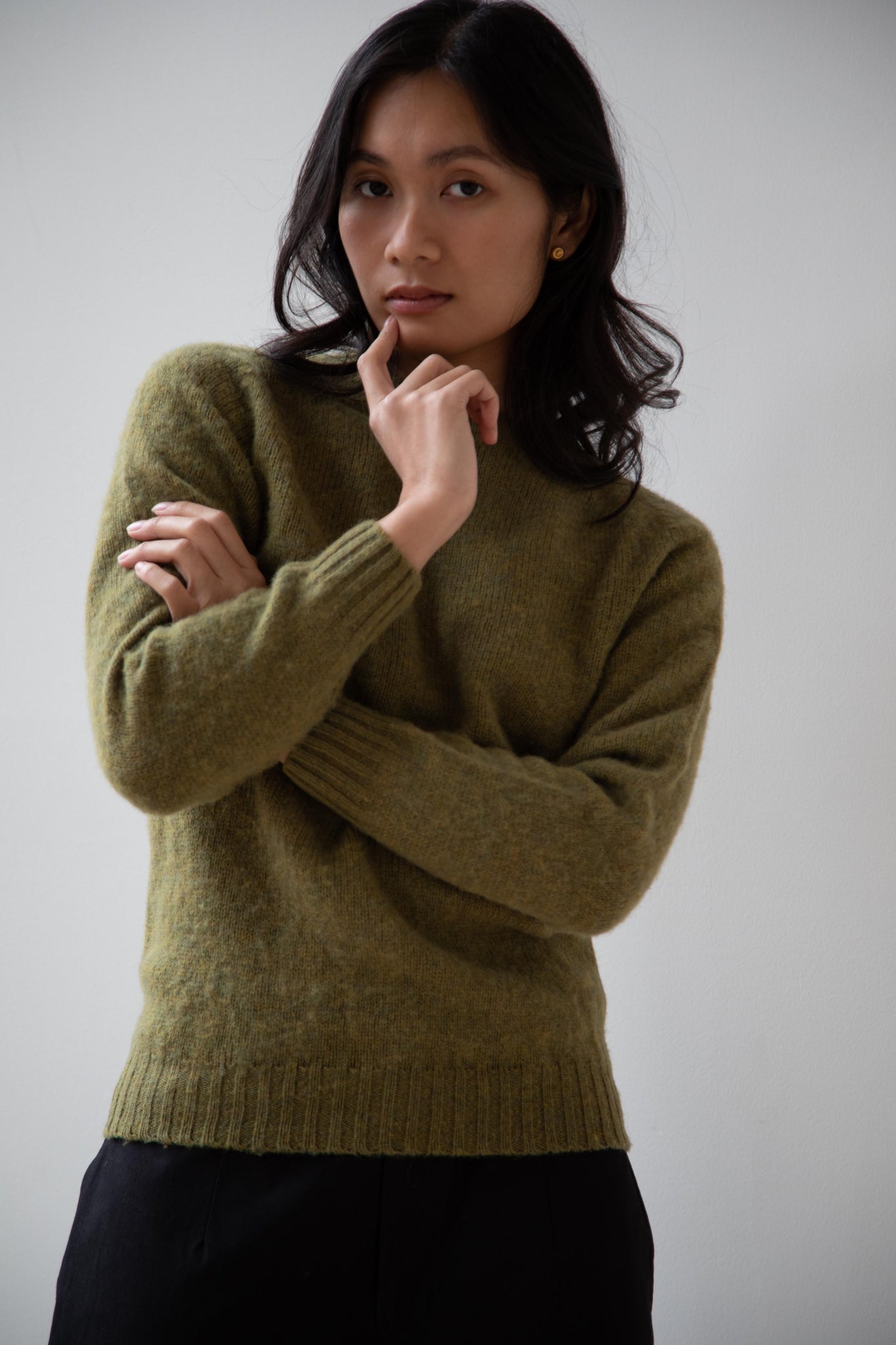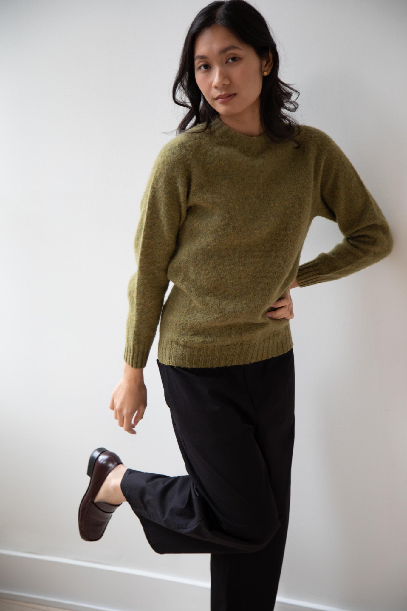 This sweater is so fun! Made of a wonderful soft and almost foamy wool this sweater has the best texture and color. It is a classic crewneck fit and perfect for layering and mixing and matching!
