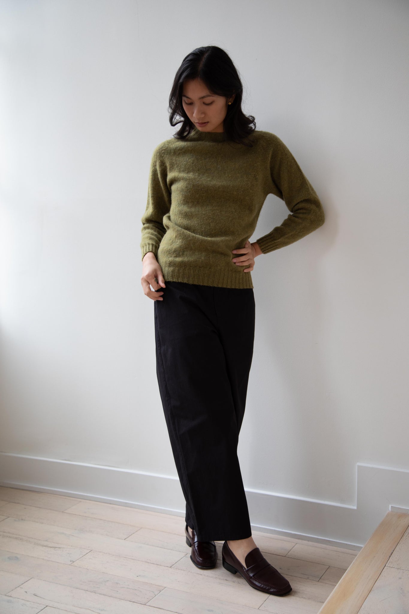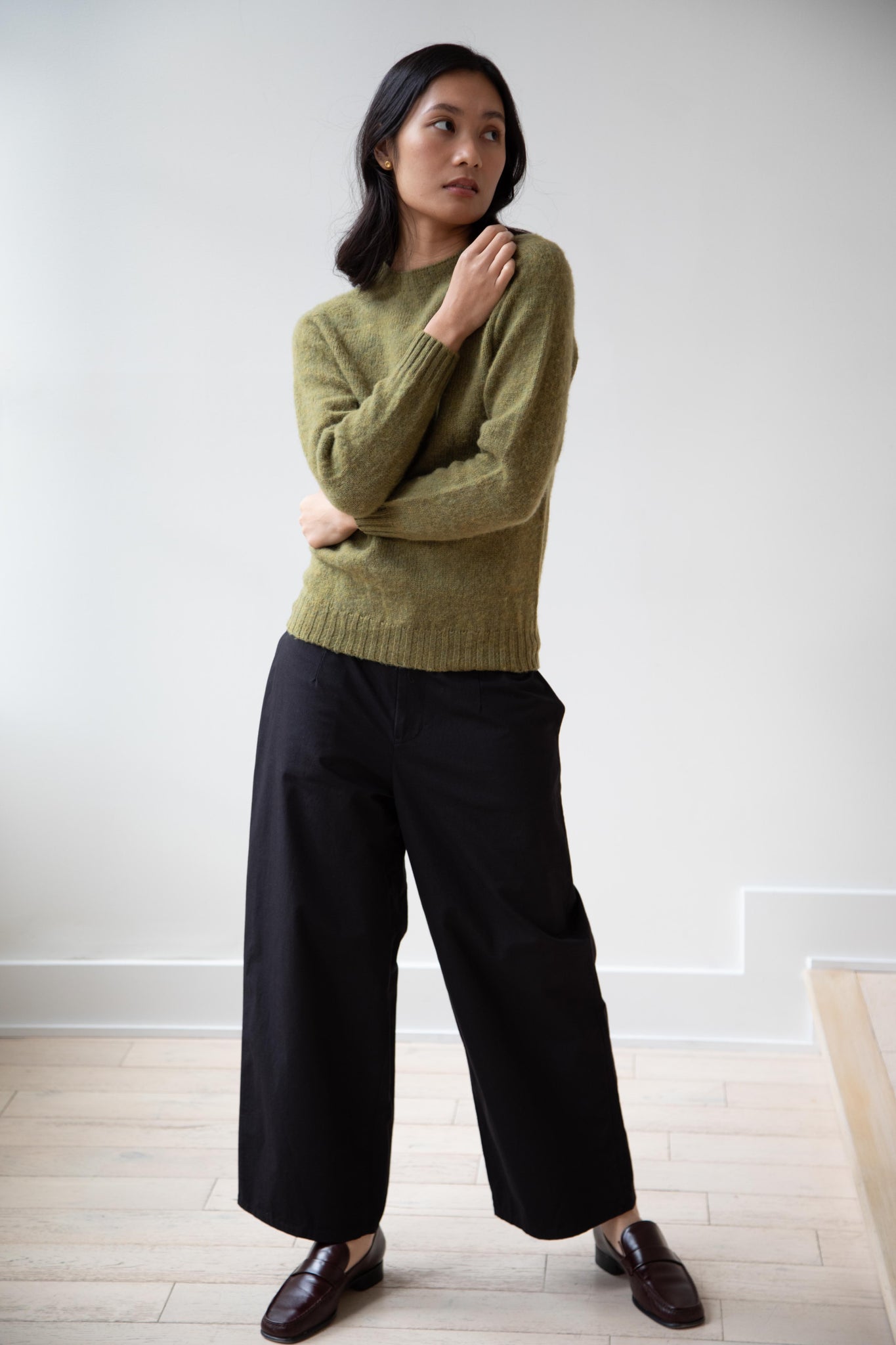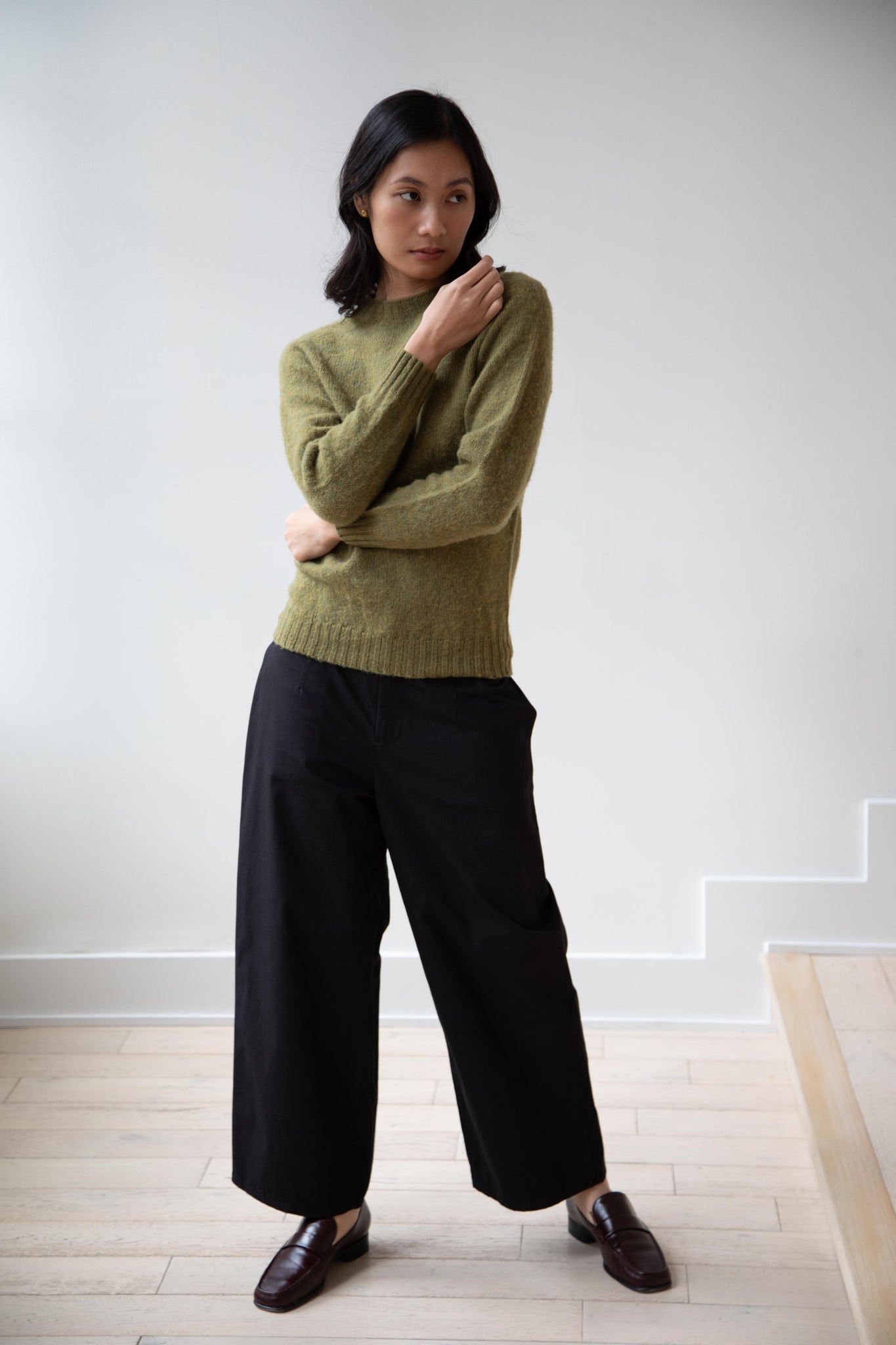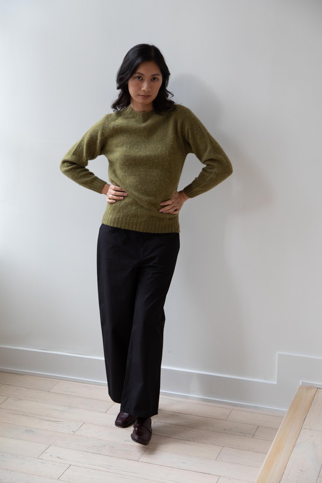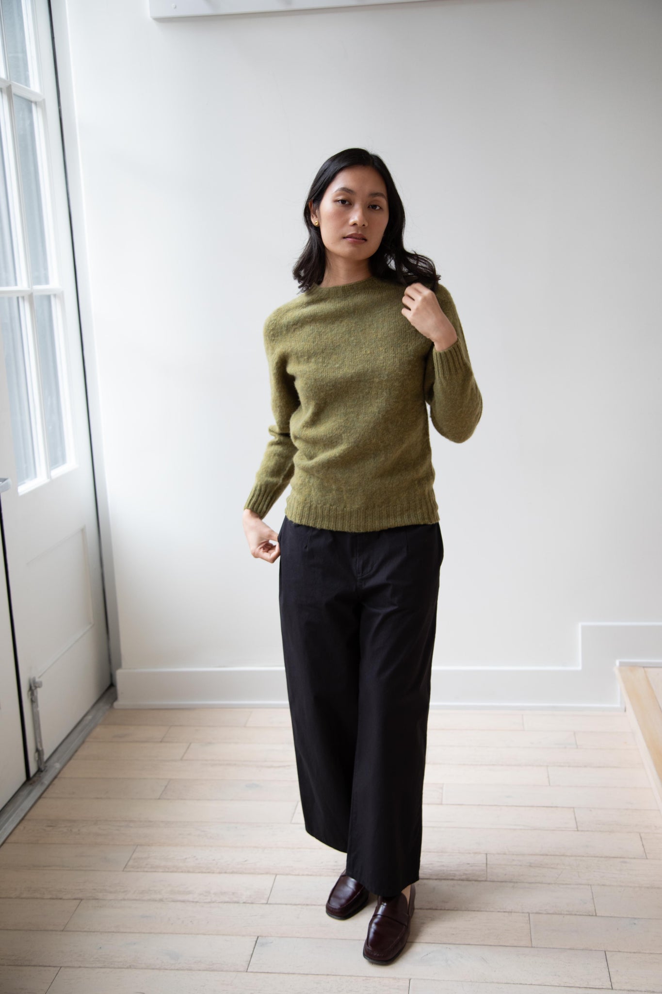 This sweater is so fun! Made of a wonderful soft and almost foamy wool this sweater has the best texture and color. It is a classic crewneck fit and perfect for layering and mixing and matching!