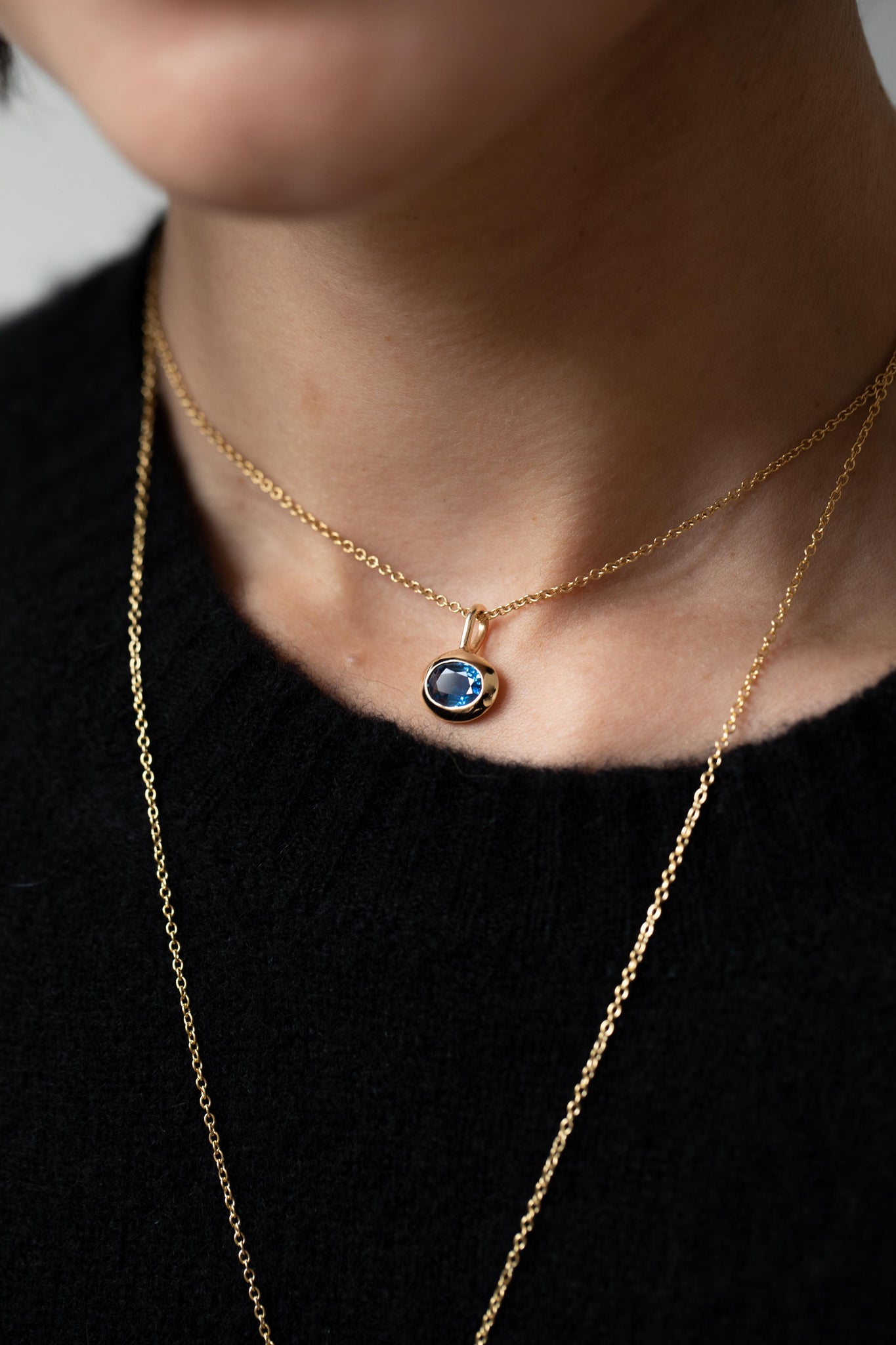 A beautiful clear blue sapphire is set in a yellow gold drop pendant.  The pendant comes on a simple gold chain, perfect for everyday wear.