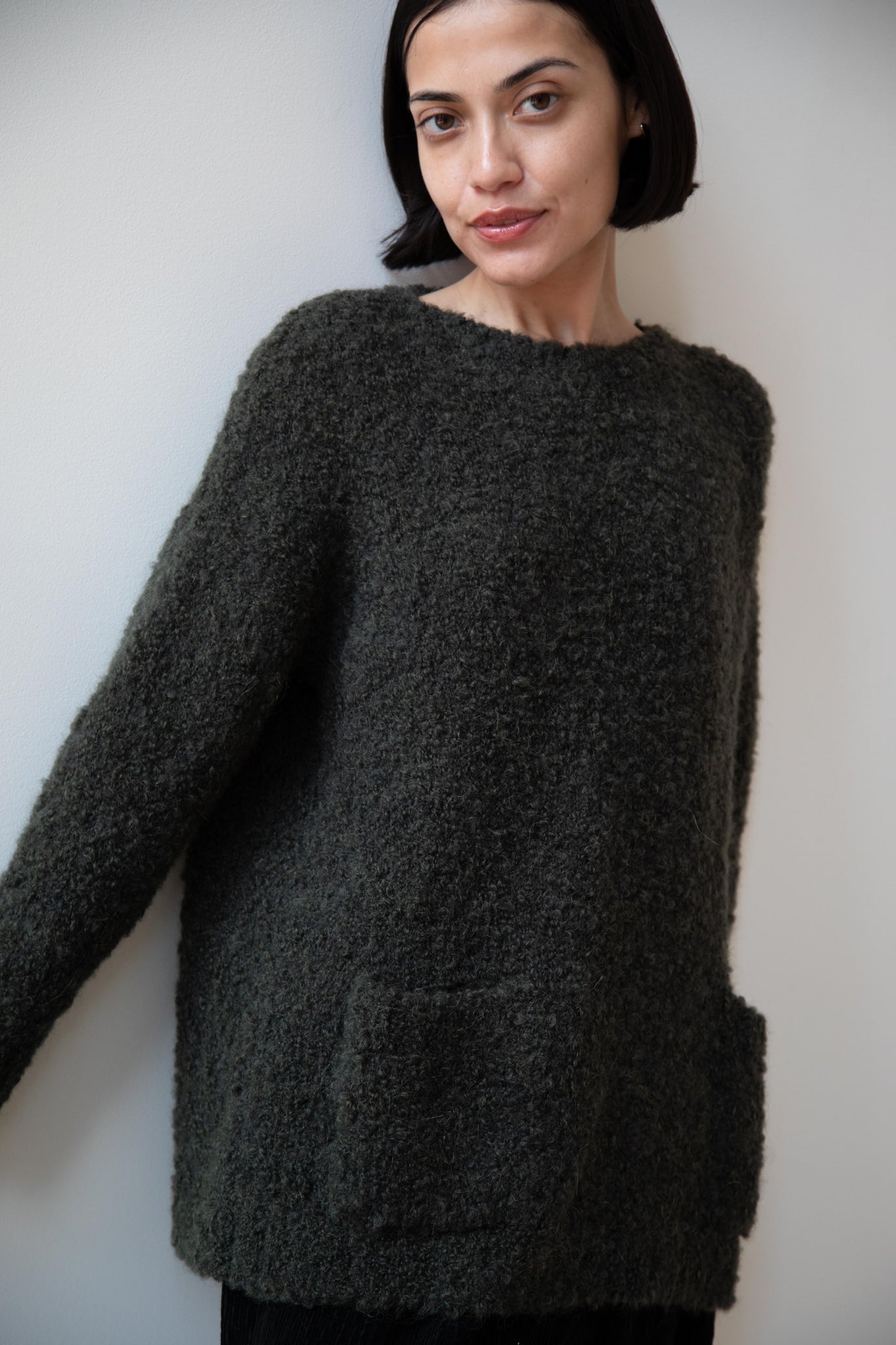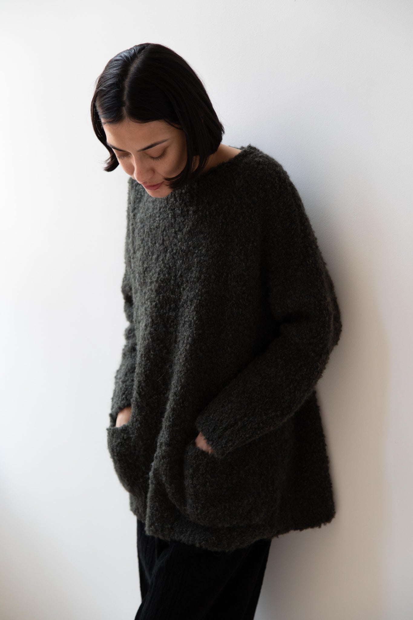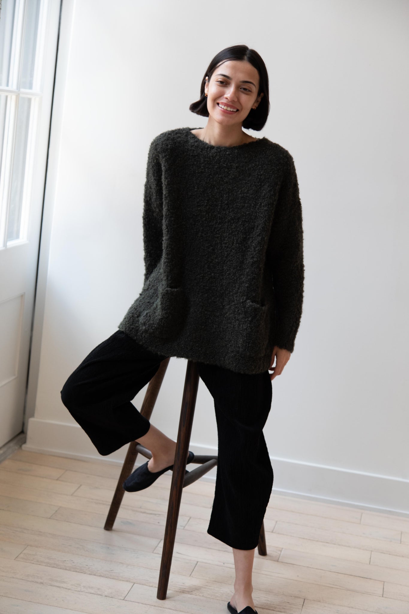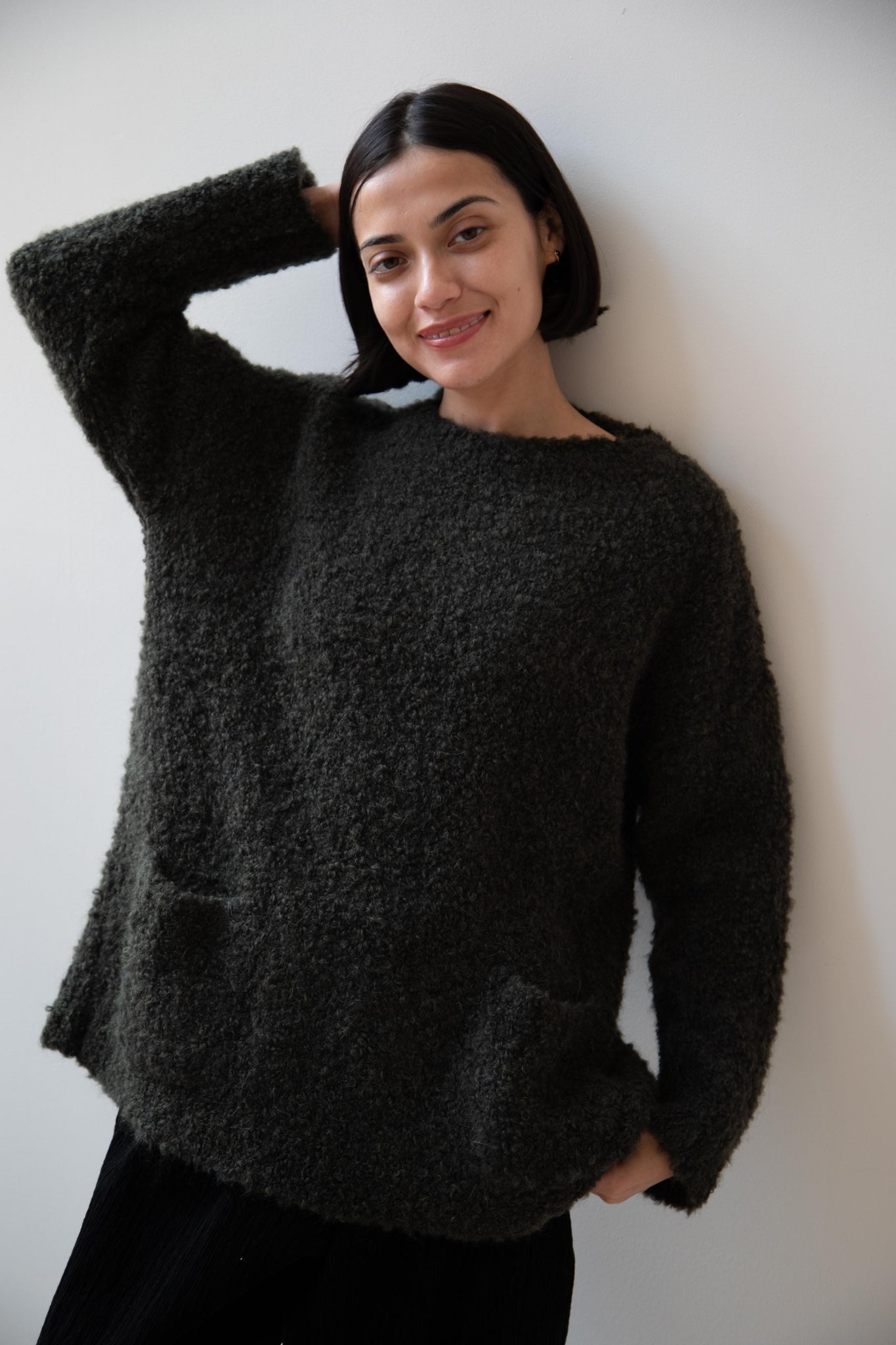A favorite sweater we had seasons ago and that you loved is back again this season in a beautiful dark olive green. The wool is so soft and is made from a fluffy alpaca wool blend bouclé yarn. There are two front patch pockets and a boatneck.