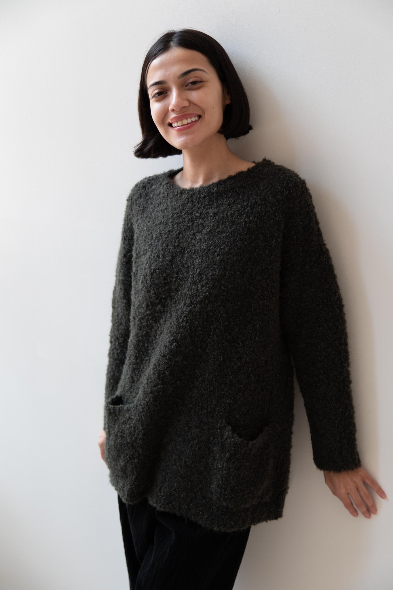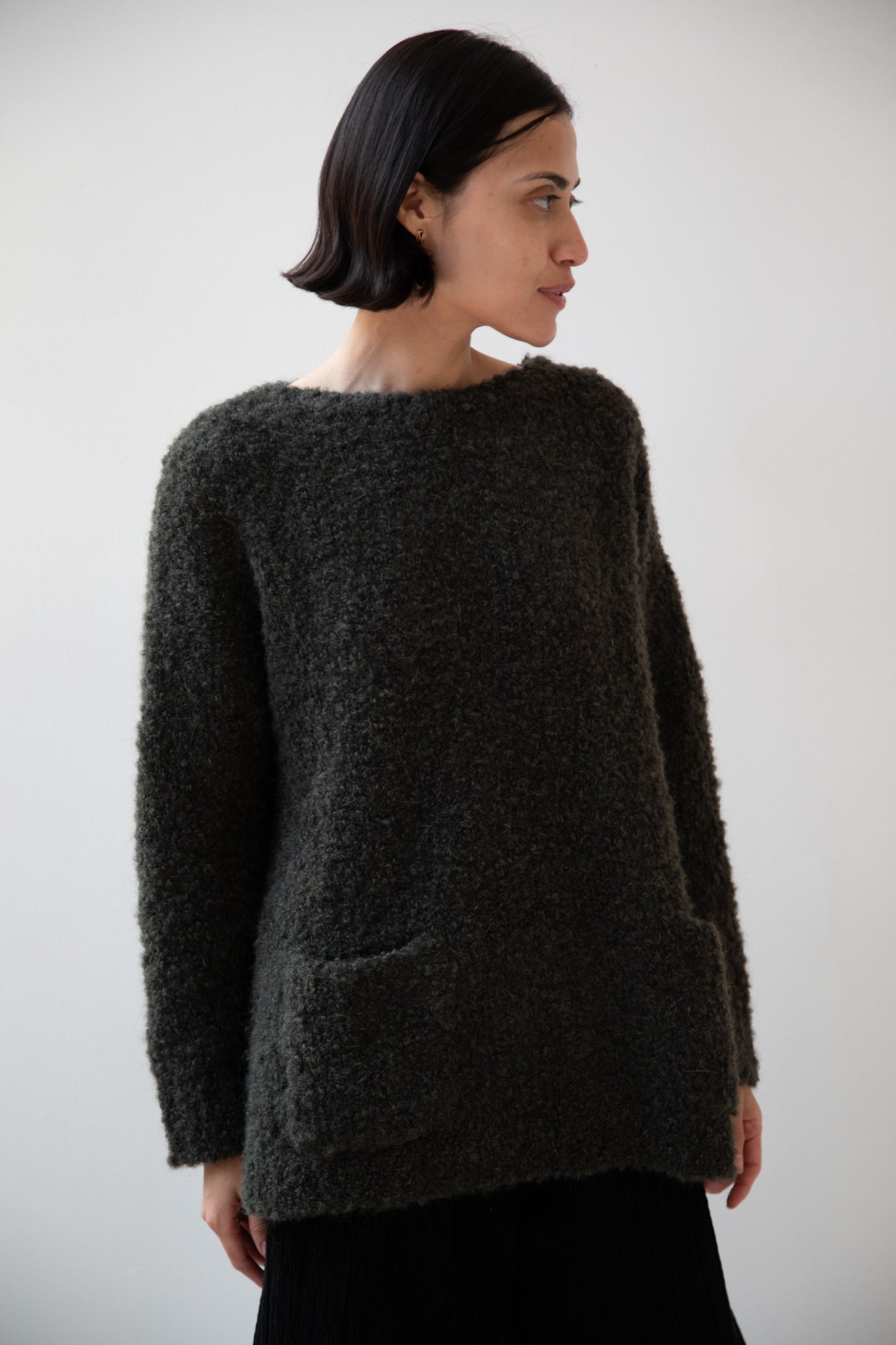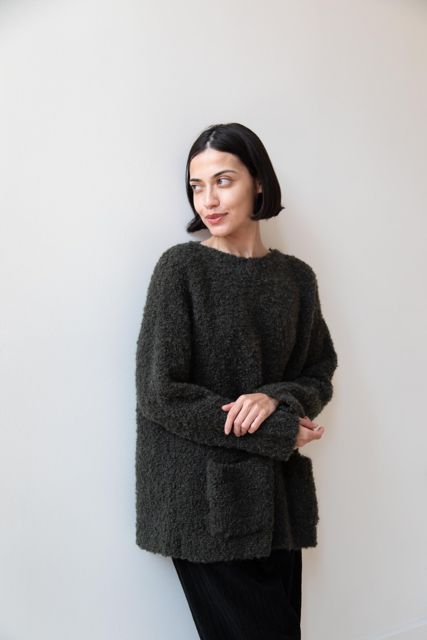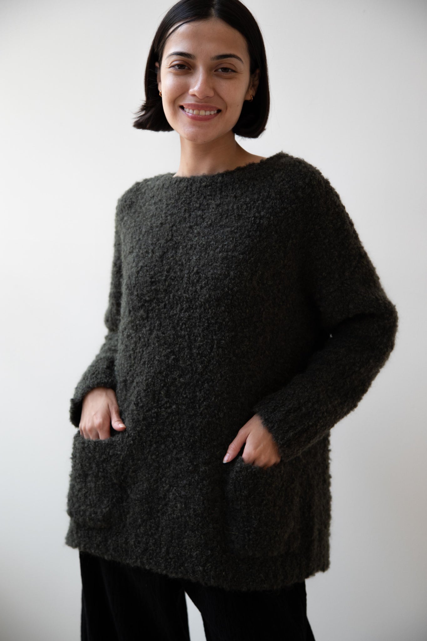 A favorite sweater we had seasons ago and that you loved is back again this season in a beautiful dark olive green. The wool is so soft and is made from a fluffy alpaca wool blend bouclé yarn. There are two front patch pockets and a boatneck.