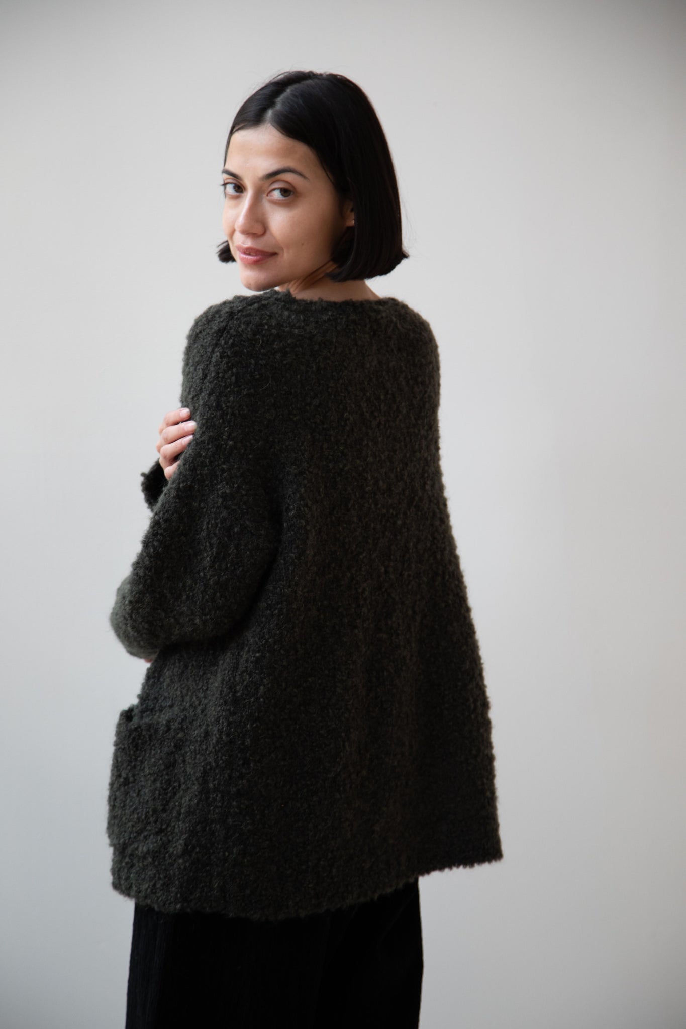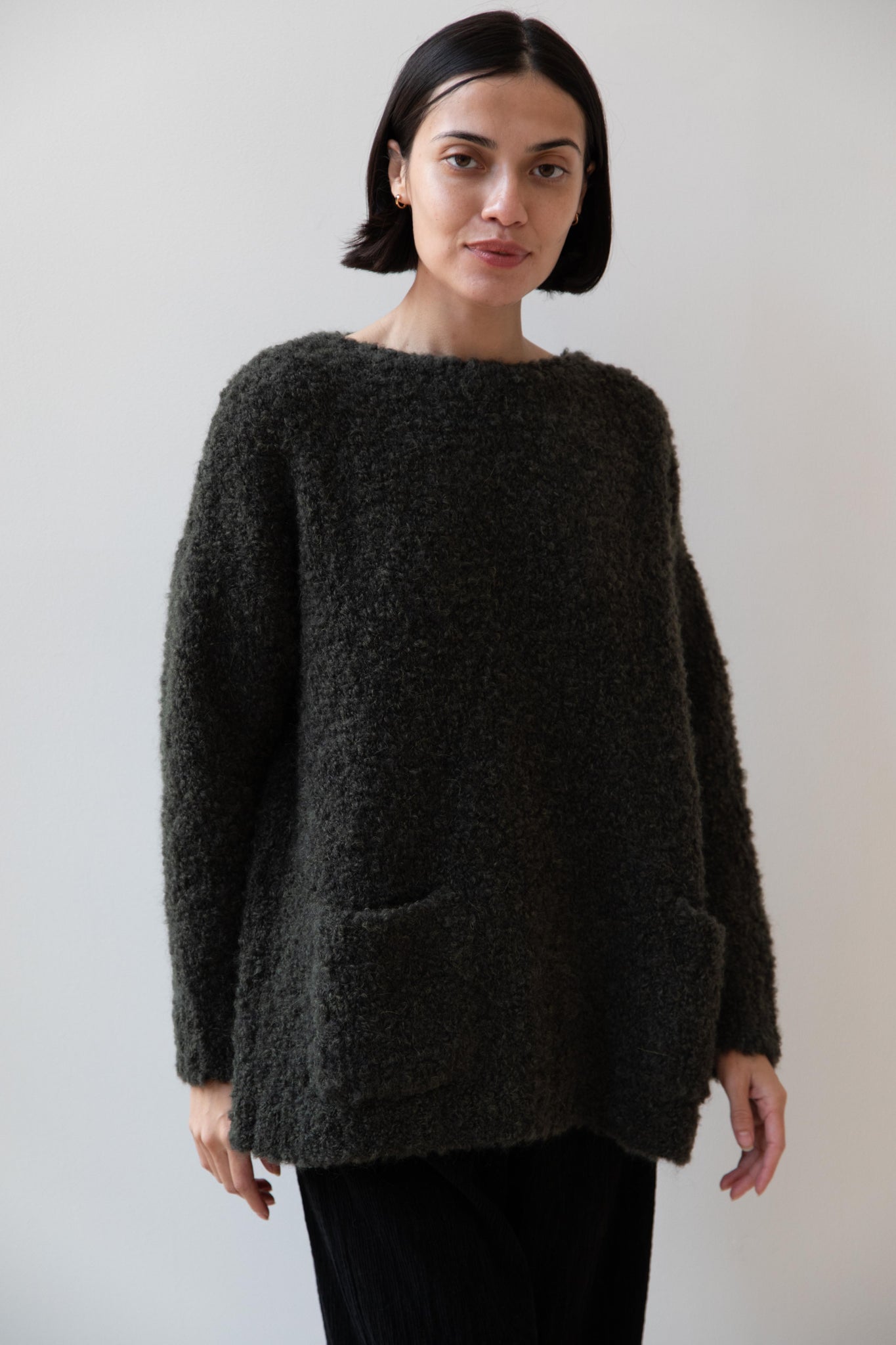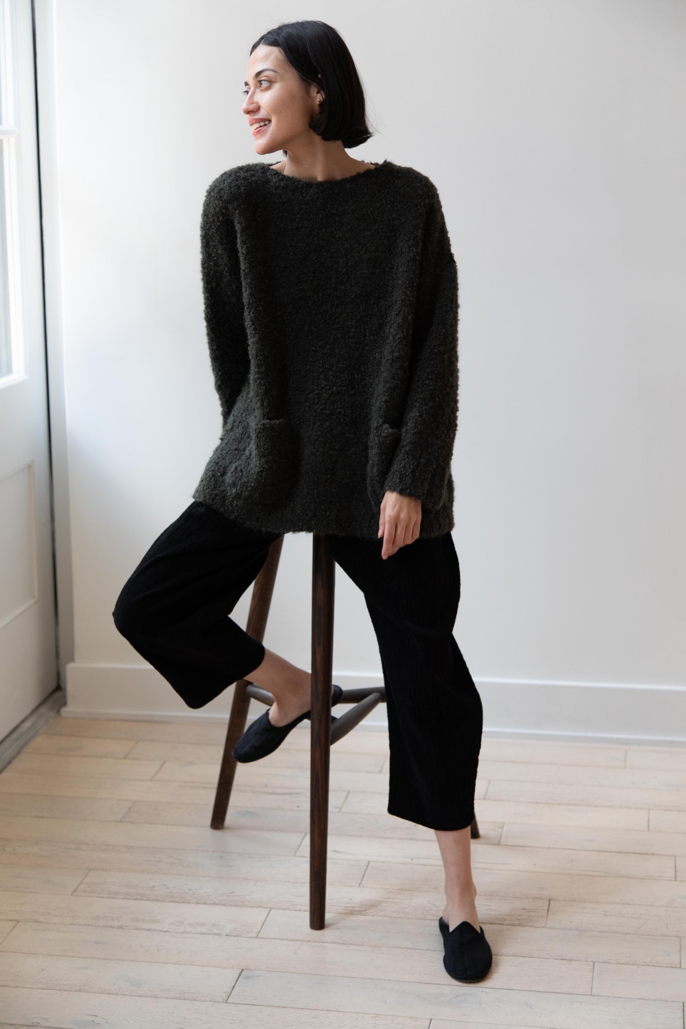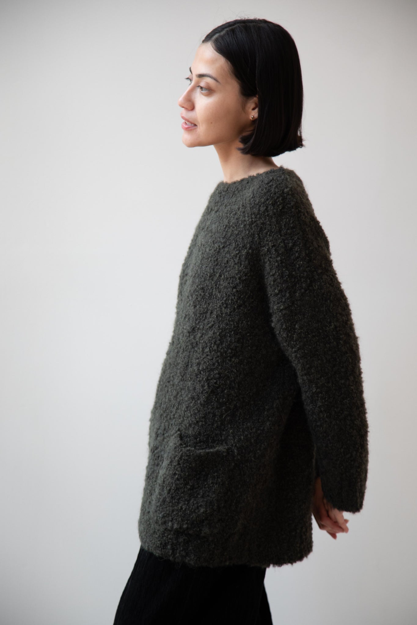 A favorite sweater we had seasons ago and that you loved is back again this season in a beautiful dark olive green. The wool is so soft and is made from a fluffy alpaca wool blend bouclé yarn. There are two front patch pockets and a boatneck.