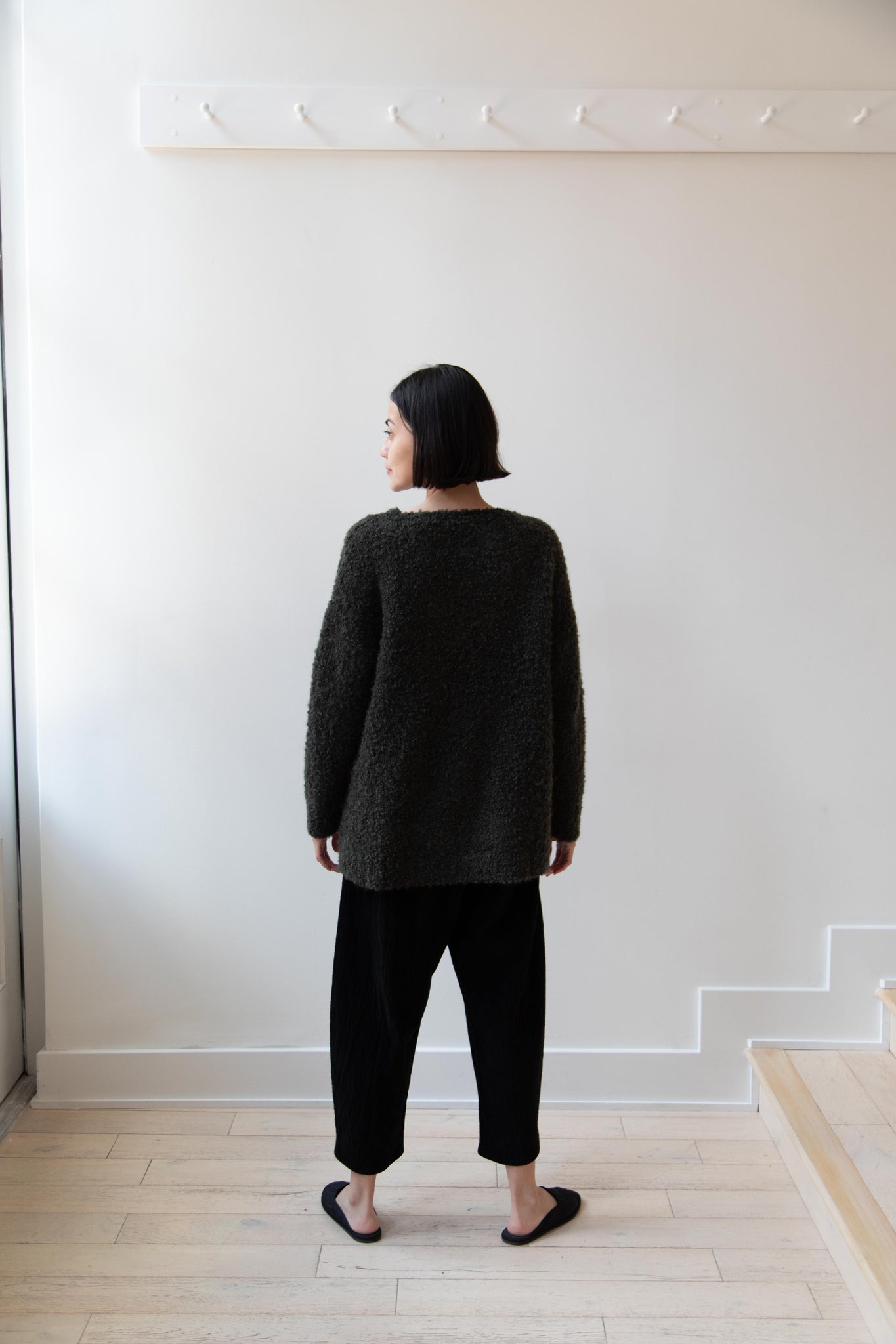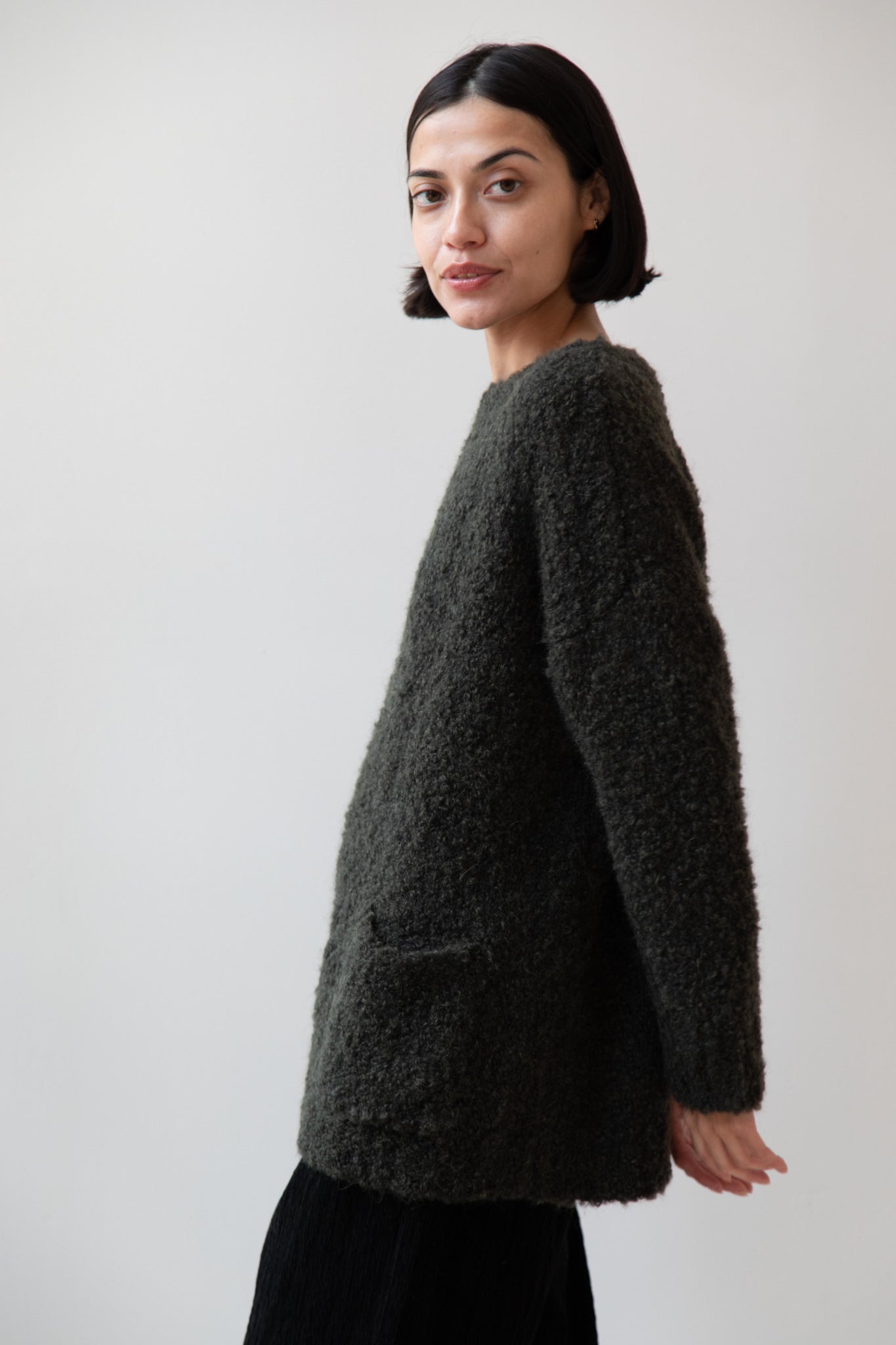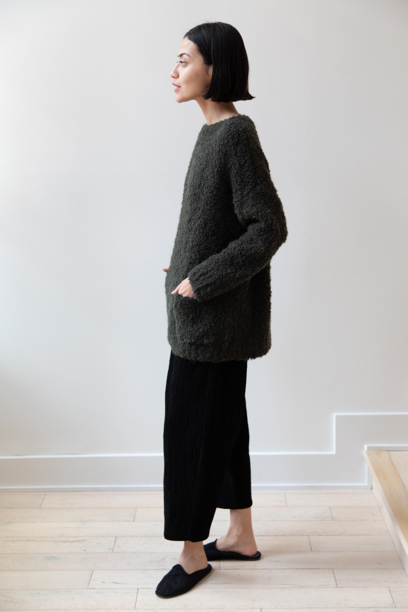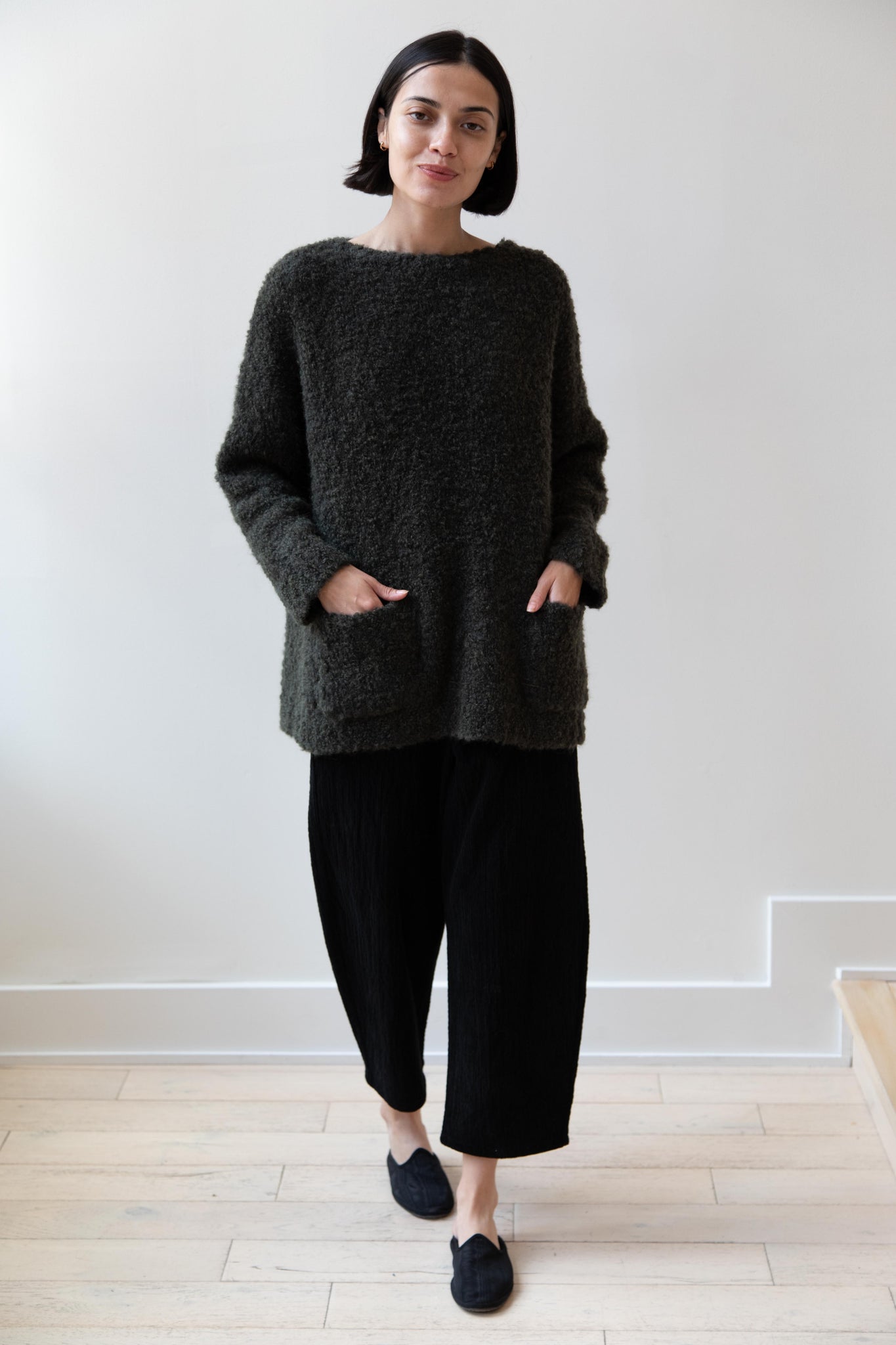 A favorite sweater we had seasons ago and that you loved is back again this season in a beautiful dark olive green. The wool is so soft and is made from a fluffy alpaca wool blend bouclé yarn. There are two front patch pockets and a boatneck.