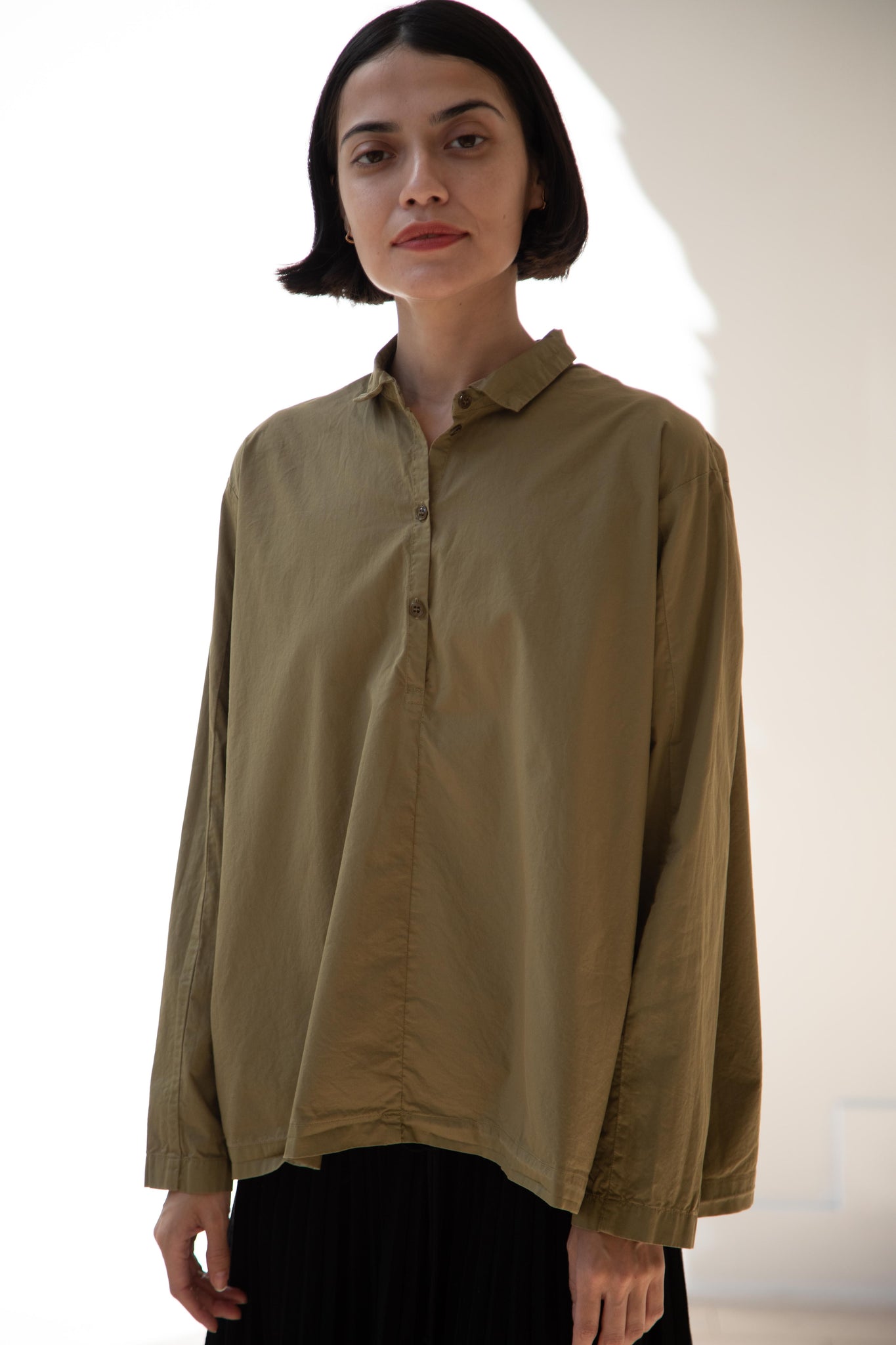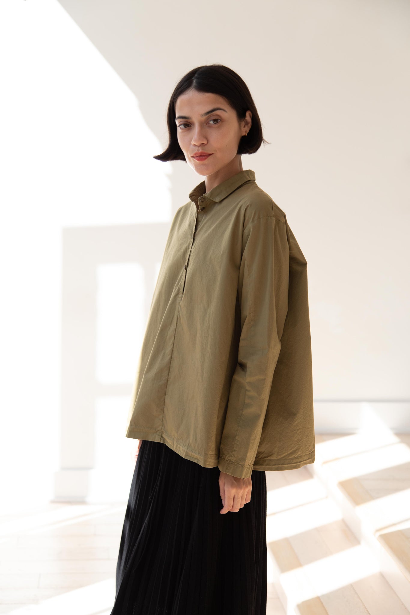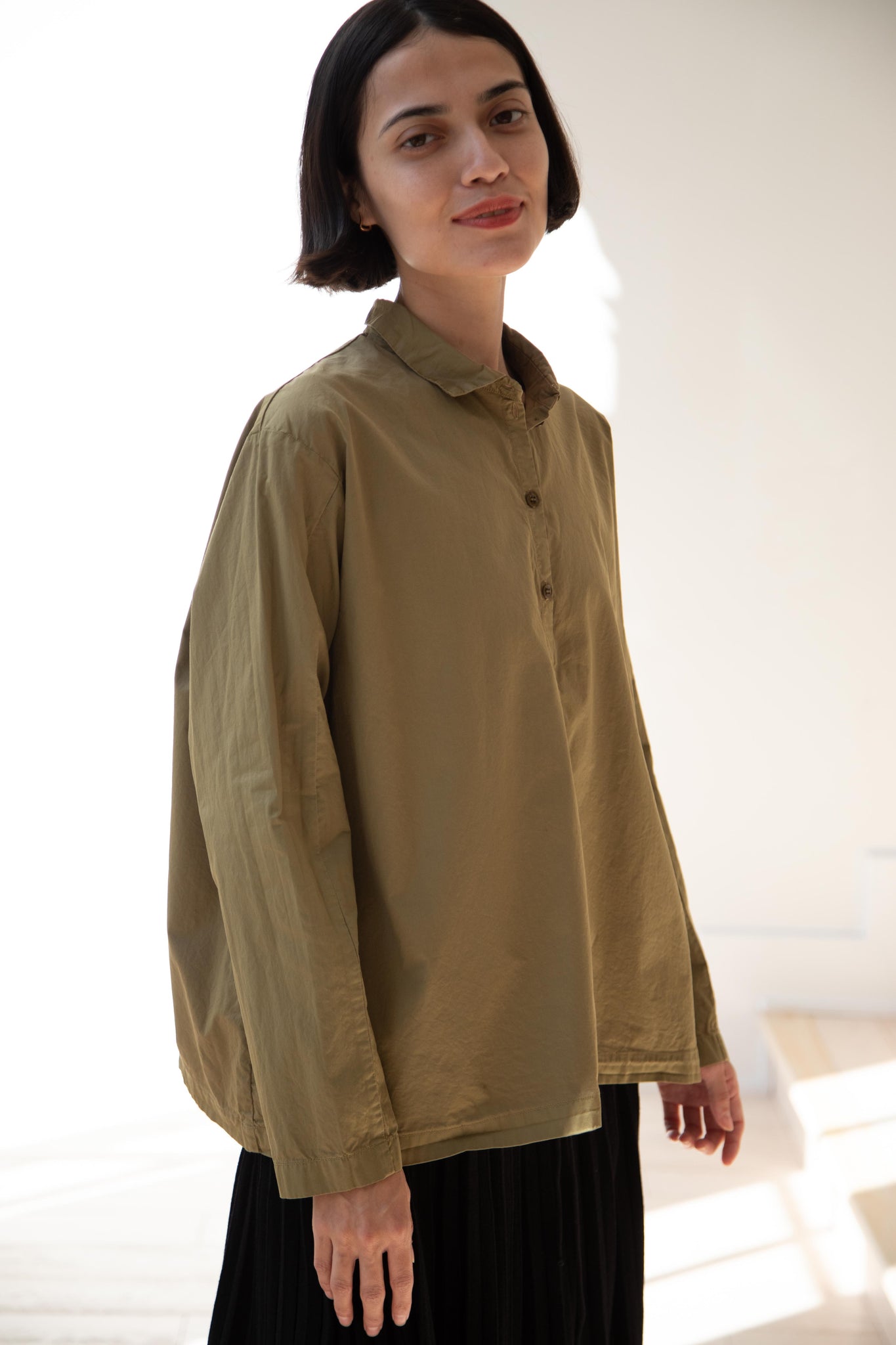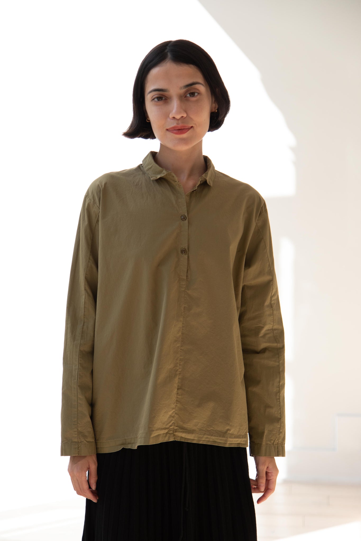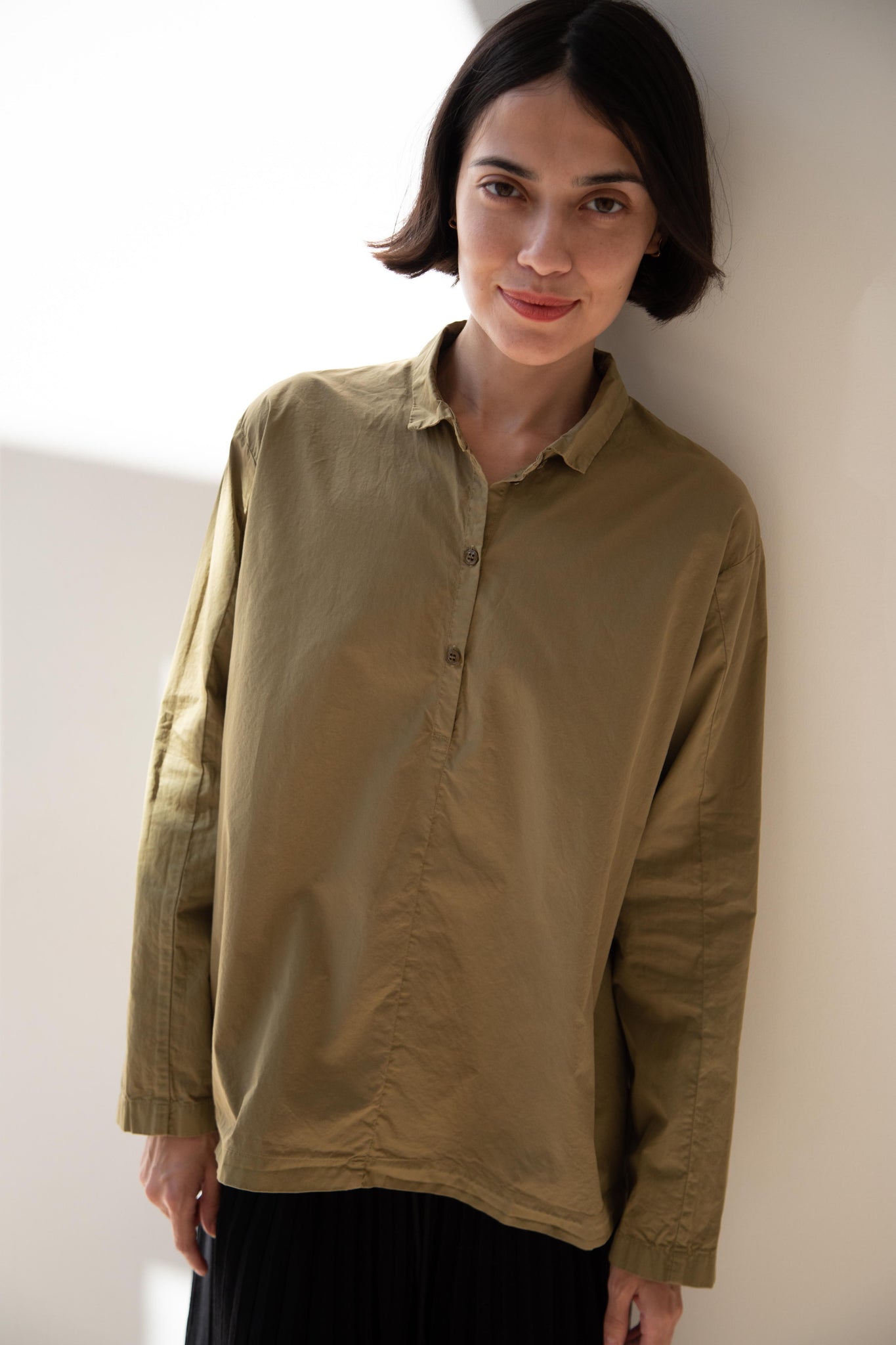 This classic popover henley shirt is a great year round piece. It's made of a lovely cotton poplin and is in a great olive color.