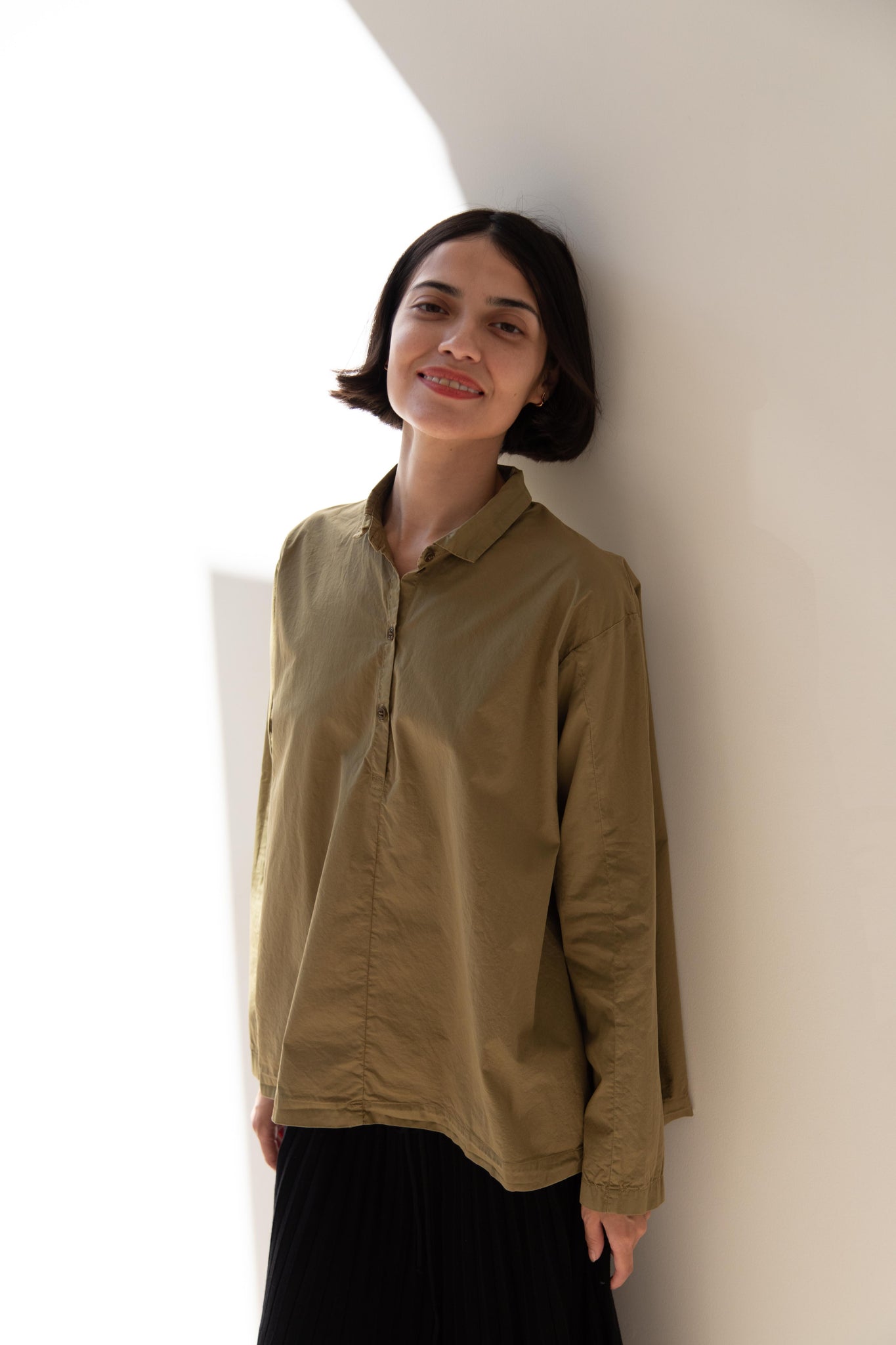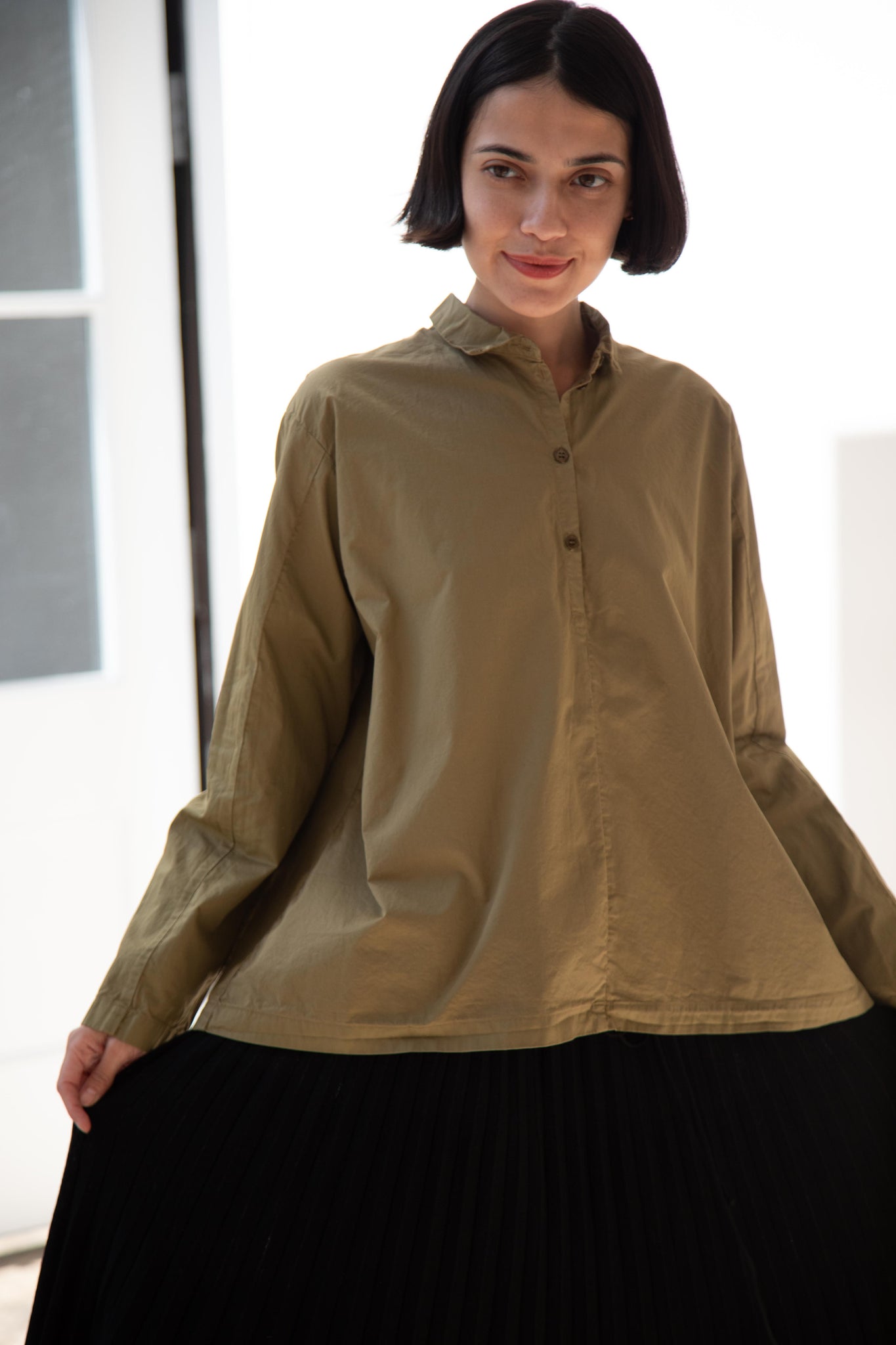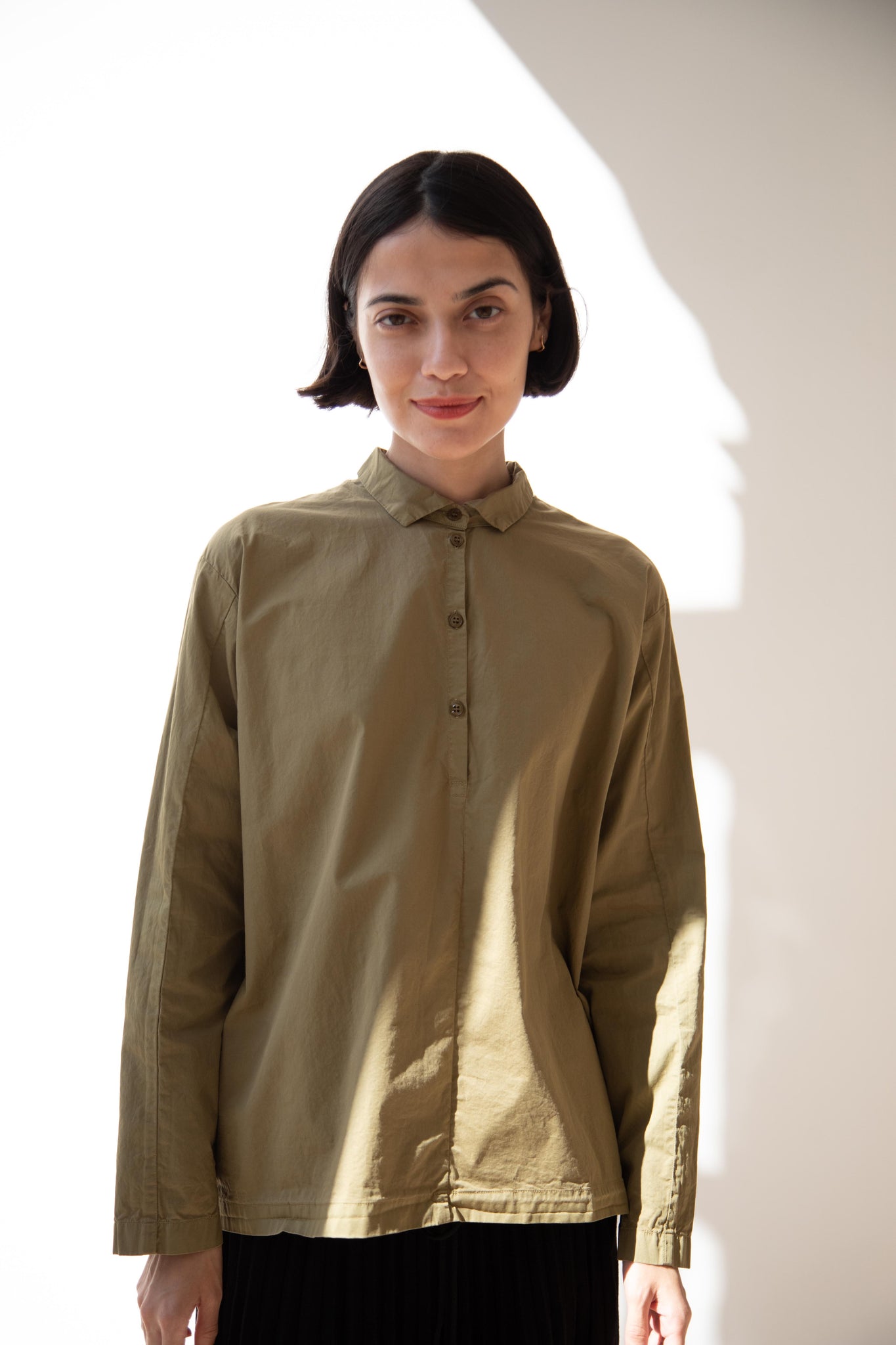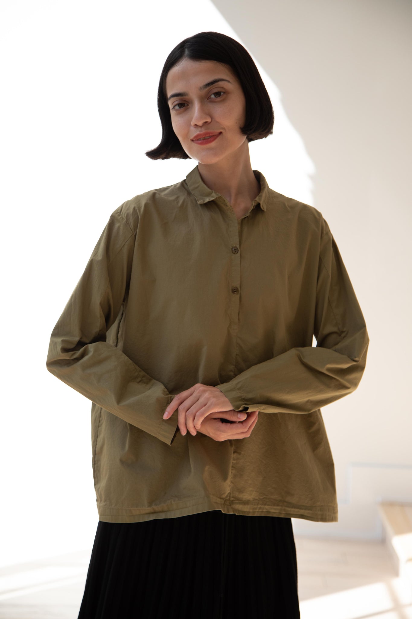 This classic popover henley shirt is a great year round piece. It's made of a lovely cotton poplin and is in a great olive color.