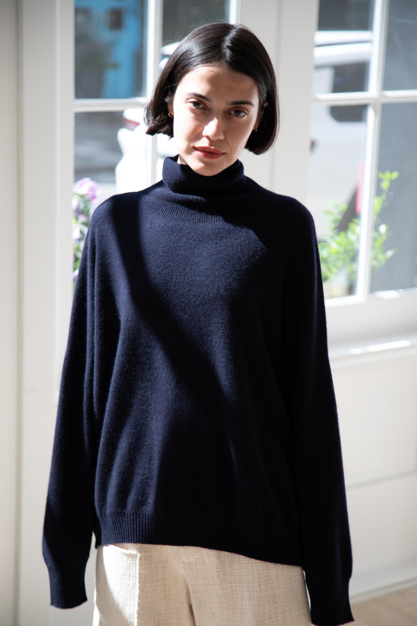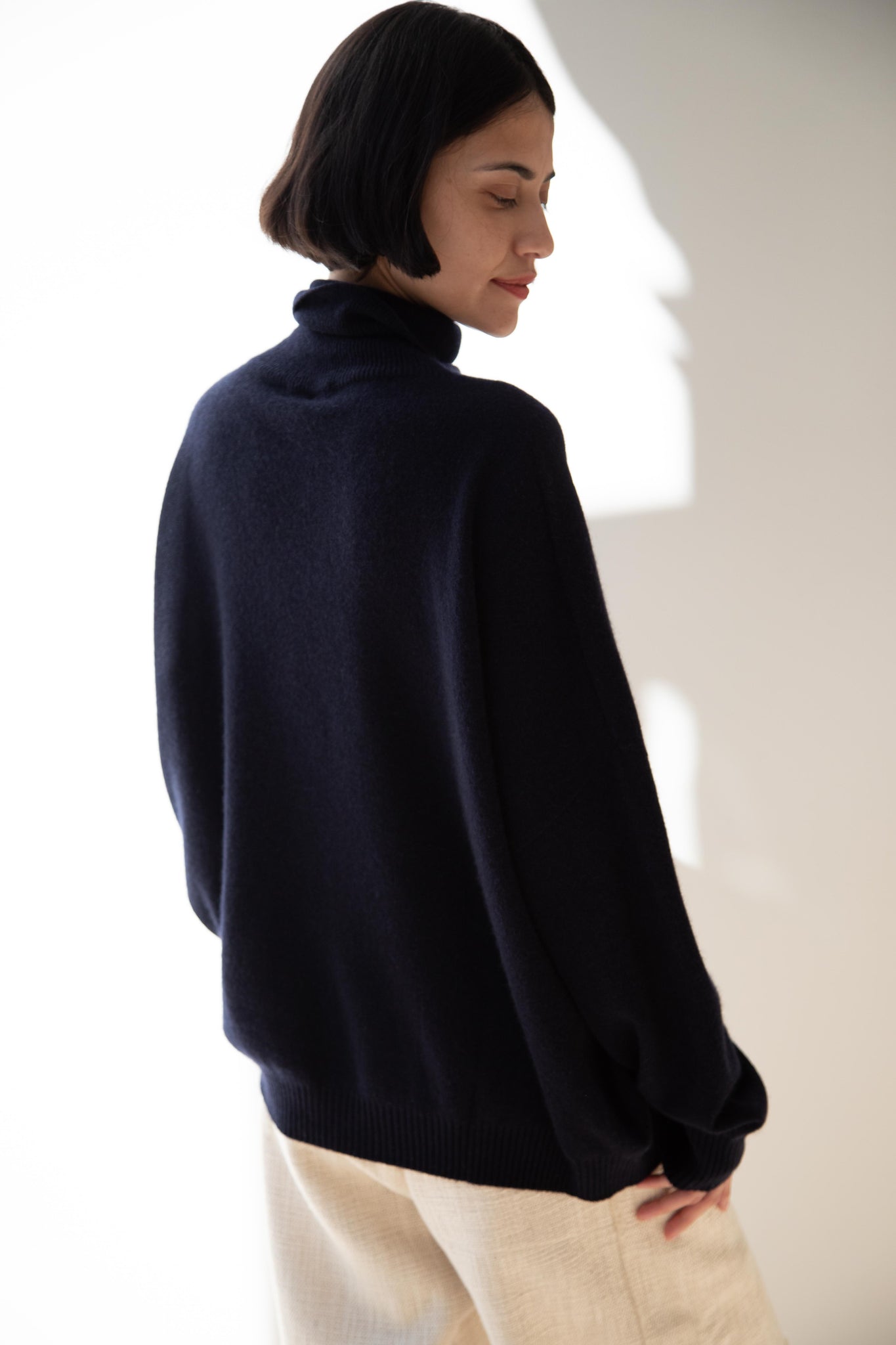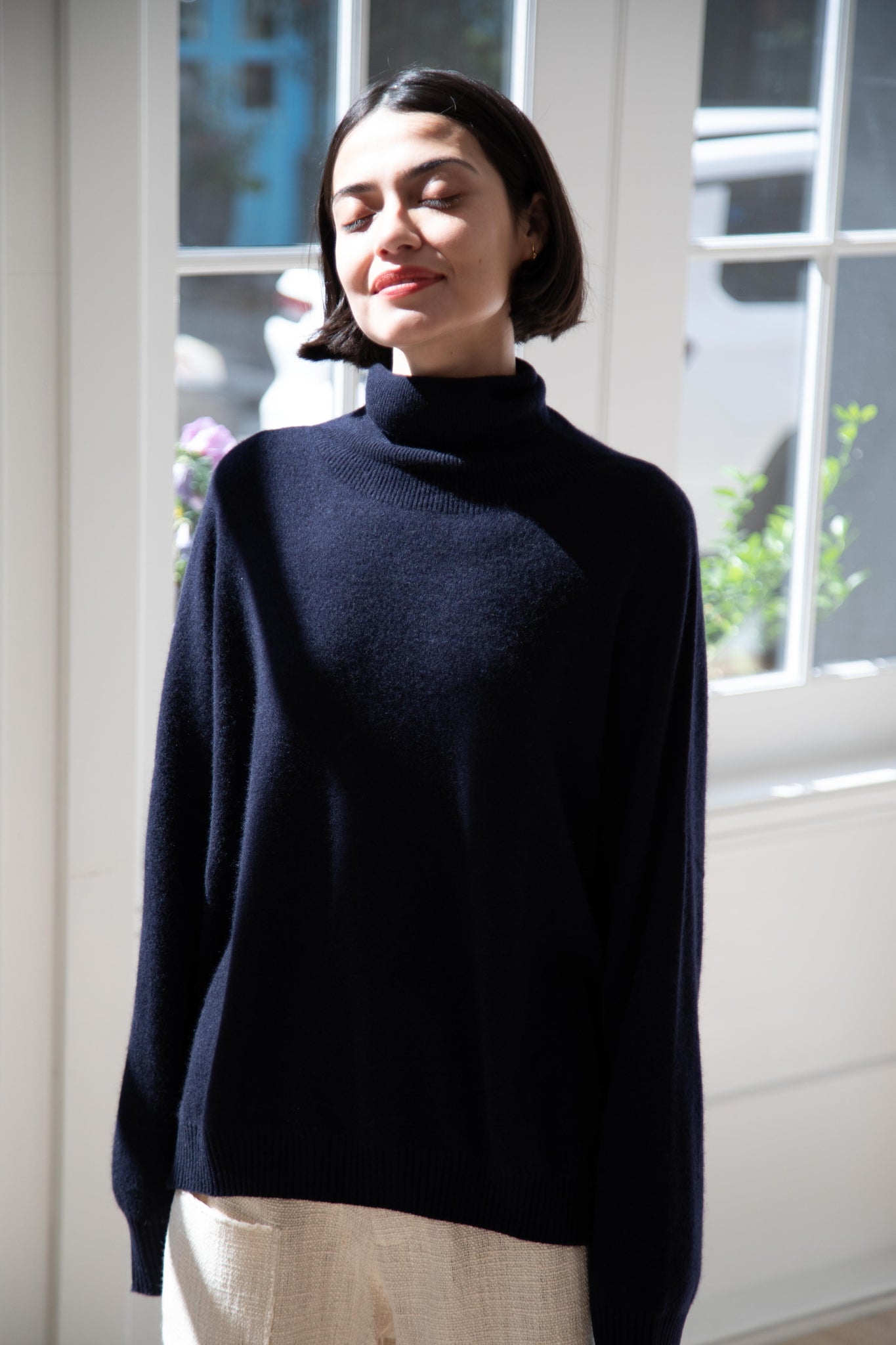 This turtleneck is made from a medium weight cashmere knit in a beautiful deep navy. It has a nice neck that fits perfectly and dropped sleeves which makes an easy fit.