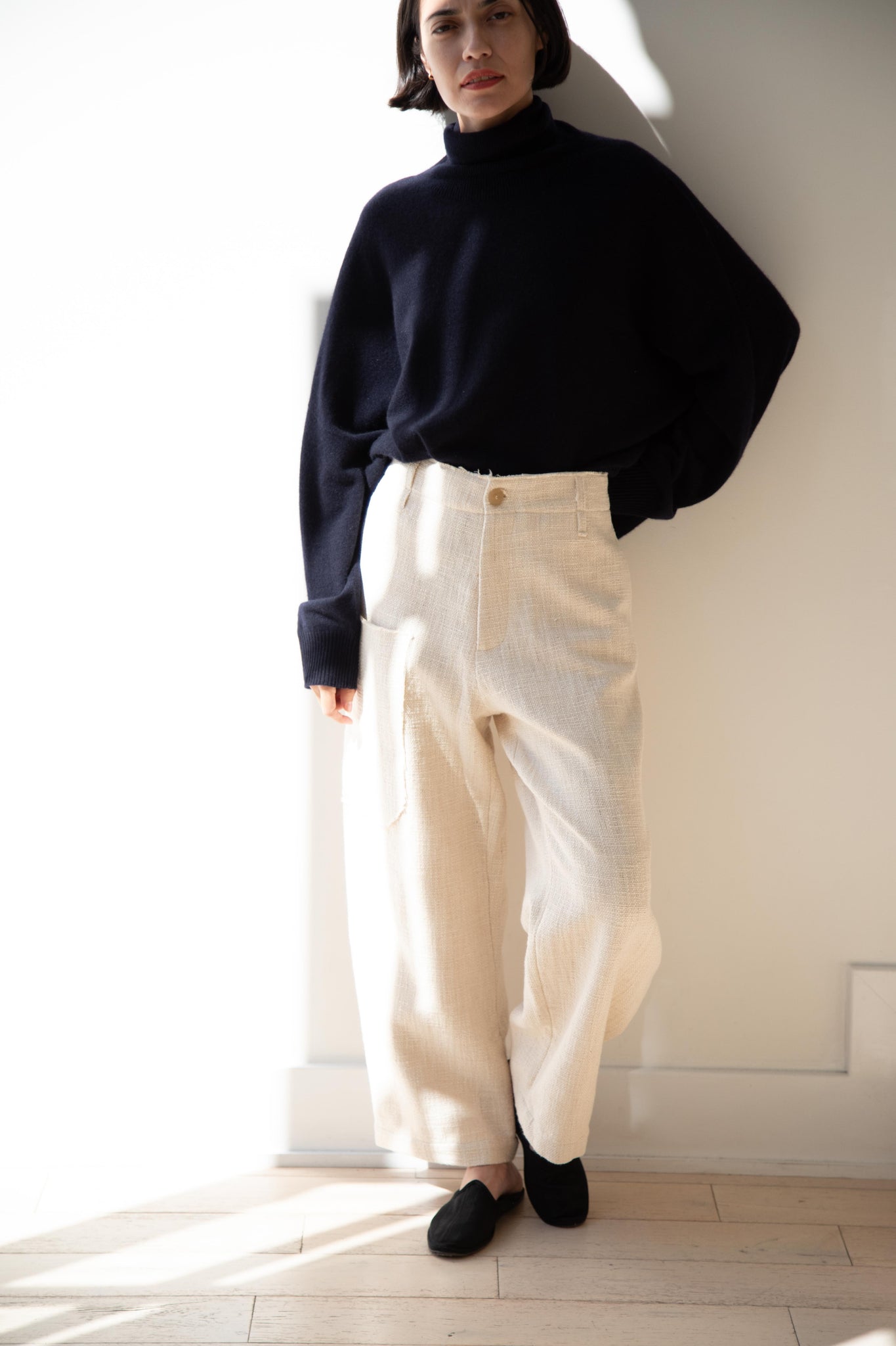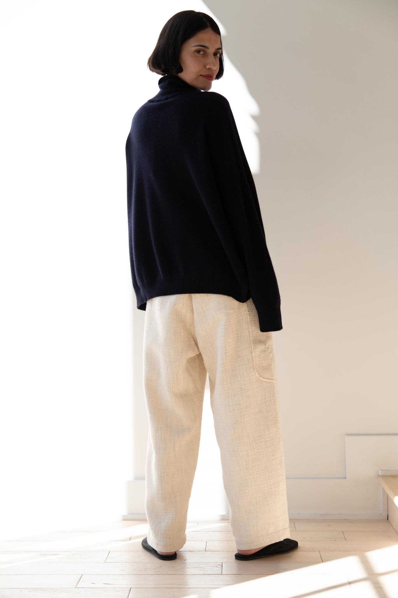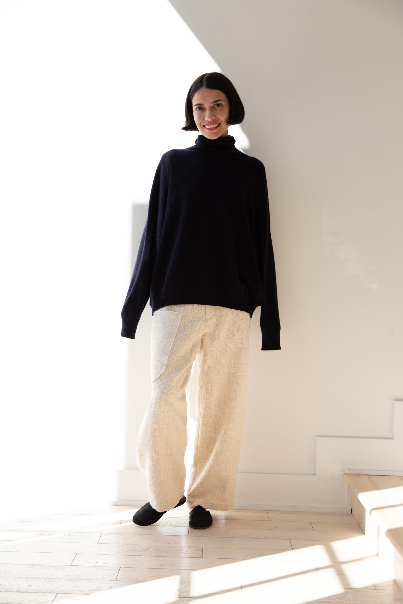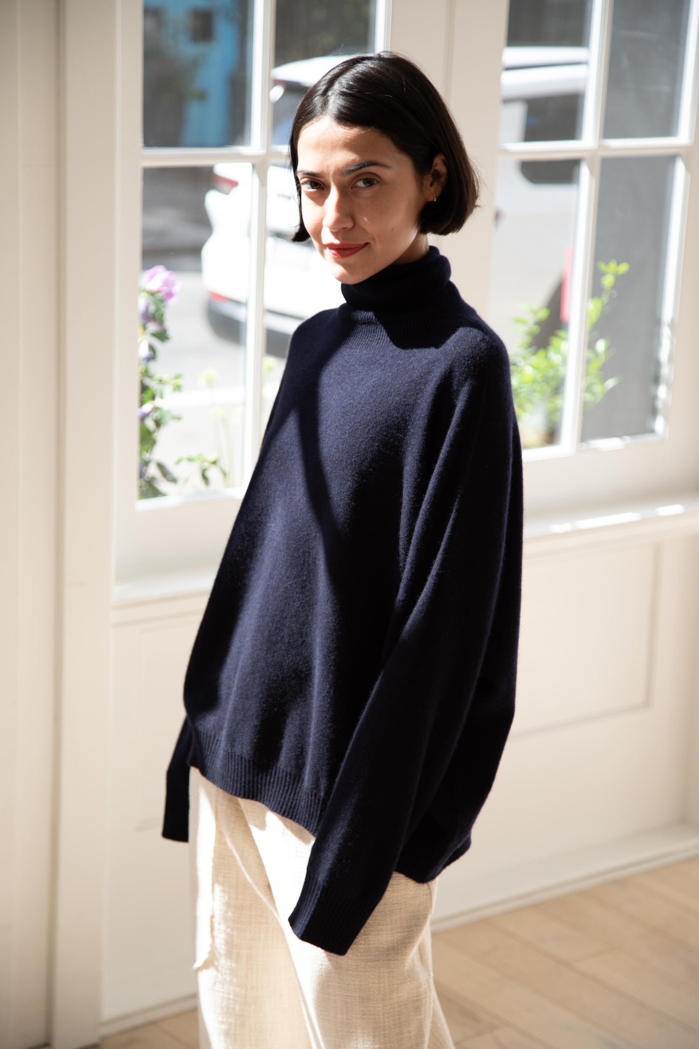 This turtleneck is made from a medium weight cashmere knit in a beautiful deep navy. It has a nice neck that fits perfectly and dropped sleeves which makes an easy fit.
