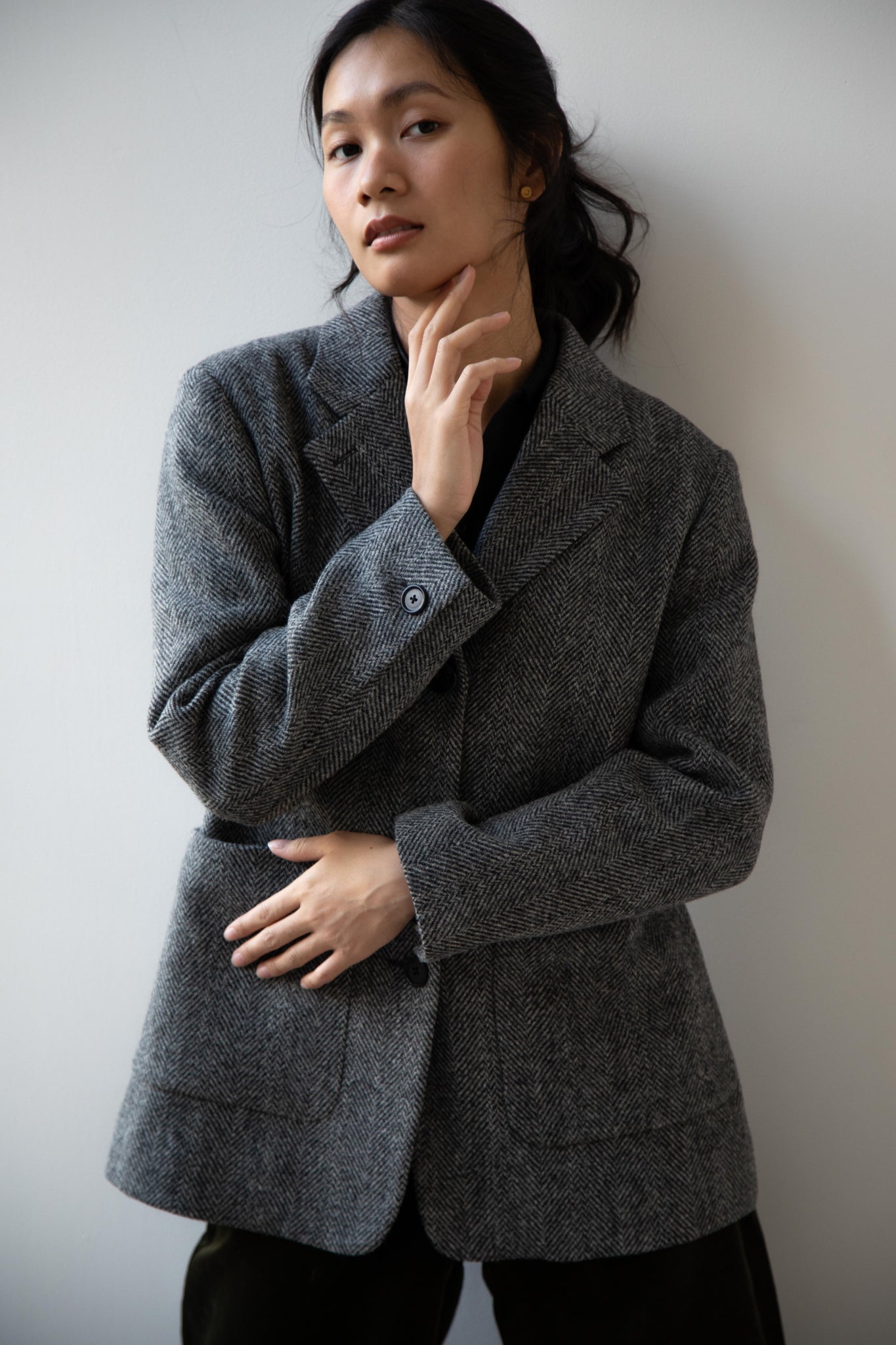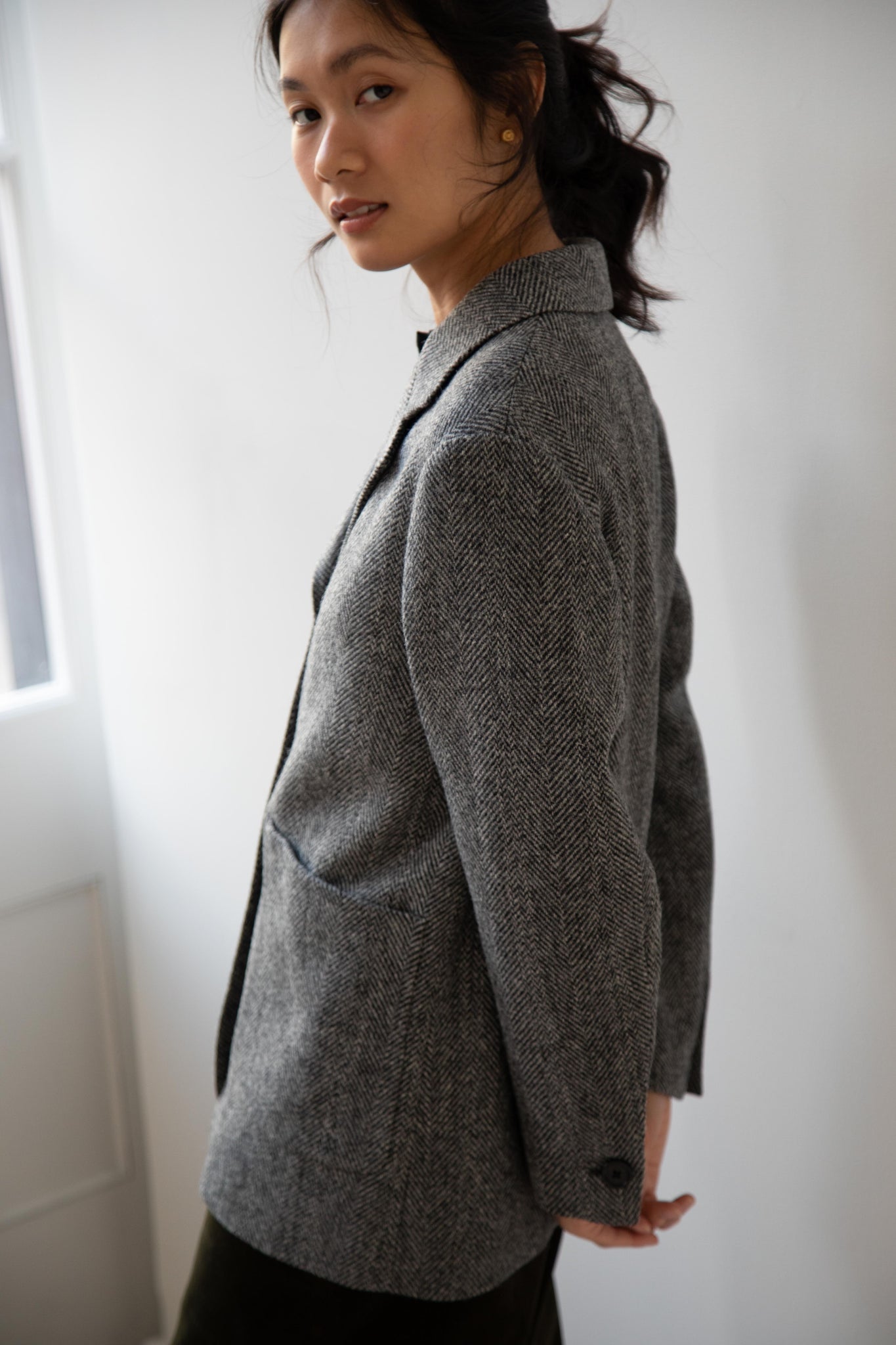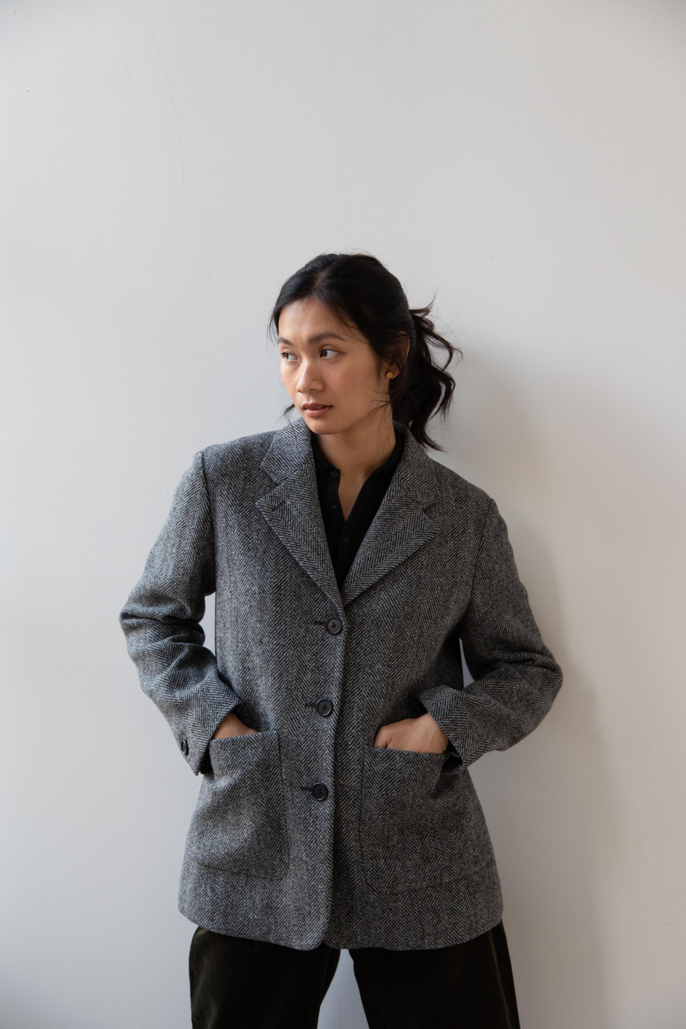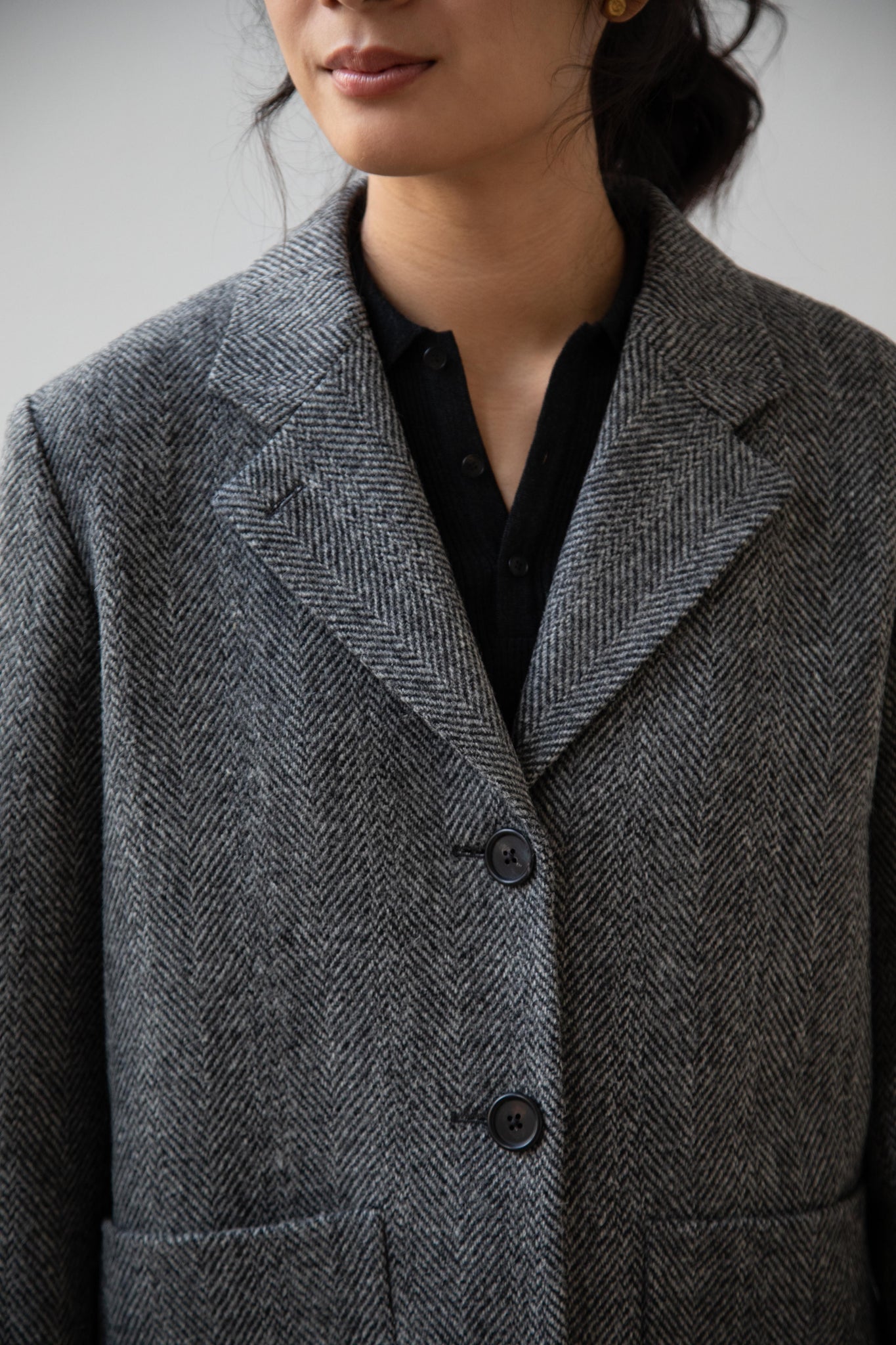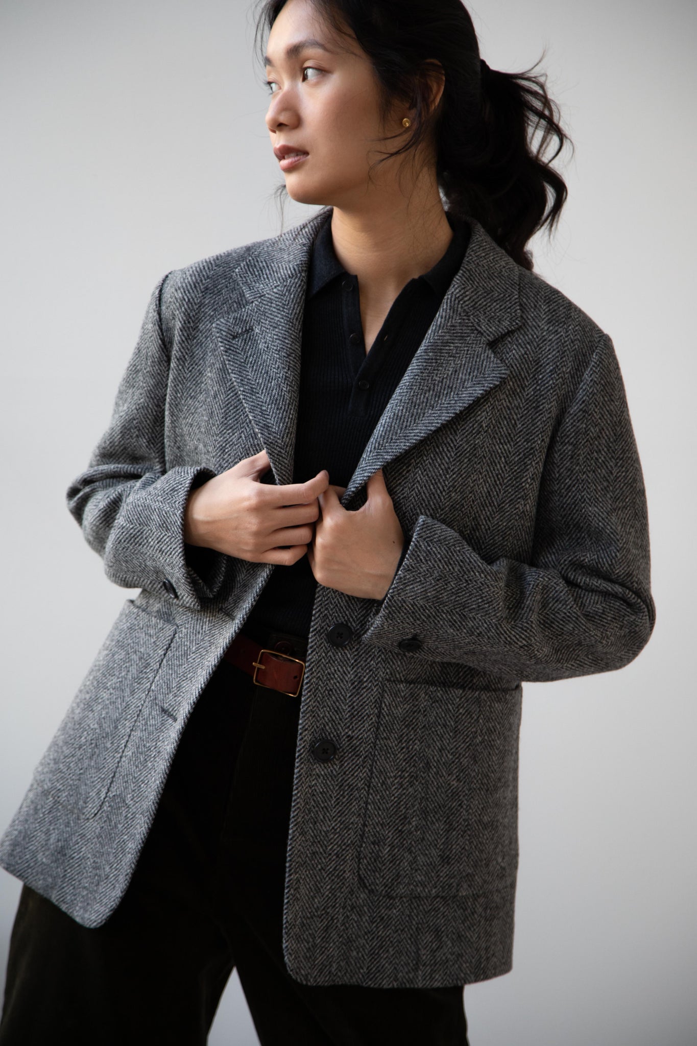 Nothing quite says fall like wool herringbone, it makes us excited for autumn jaunts across a misty field or a quick run to the coffee shop.  This classic blazer has a three button front and two patch pockets.  There is an optional button at the top lapel when there is a bit of chill in the air too!