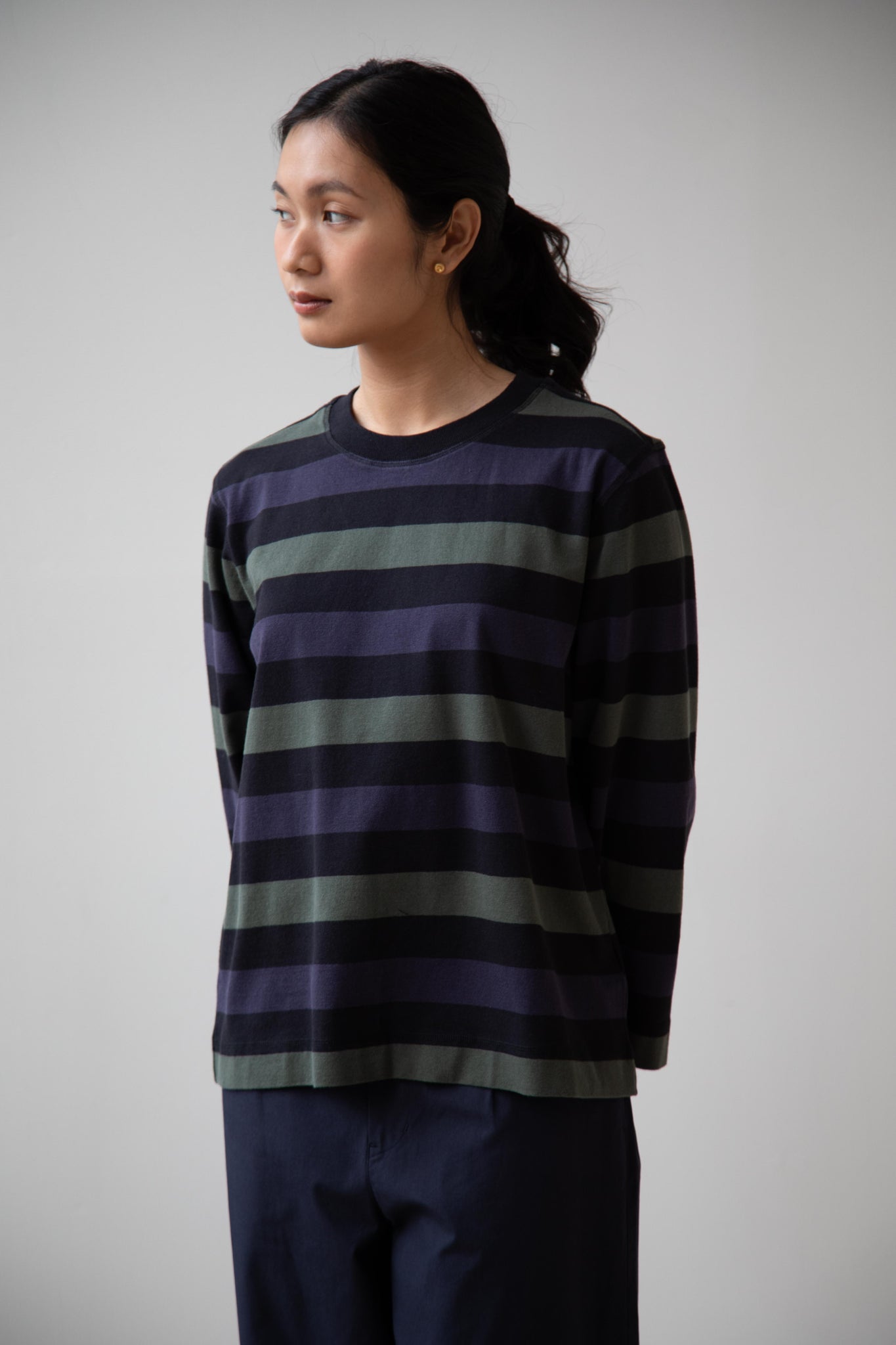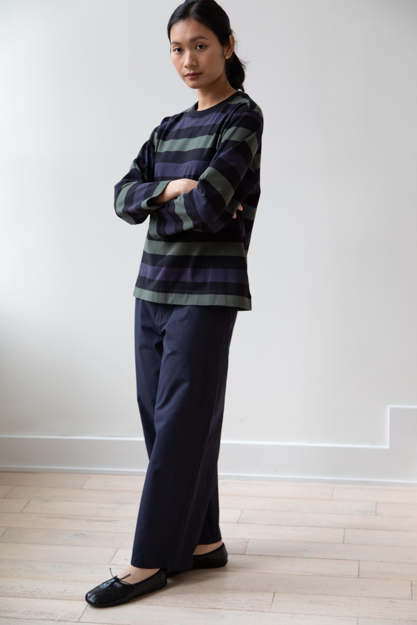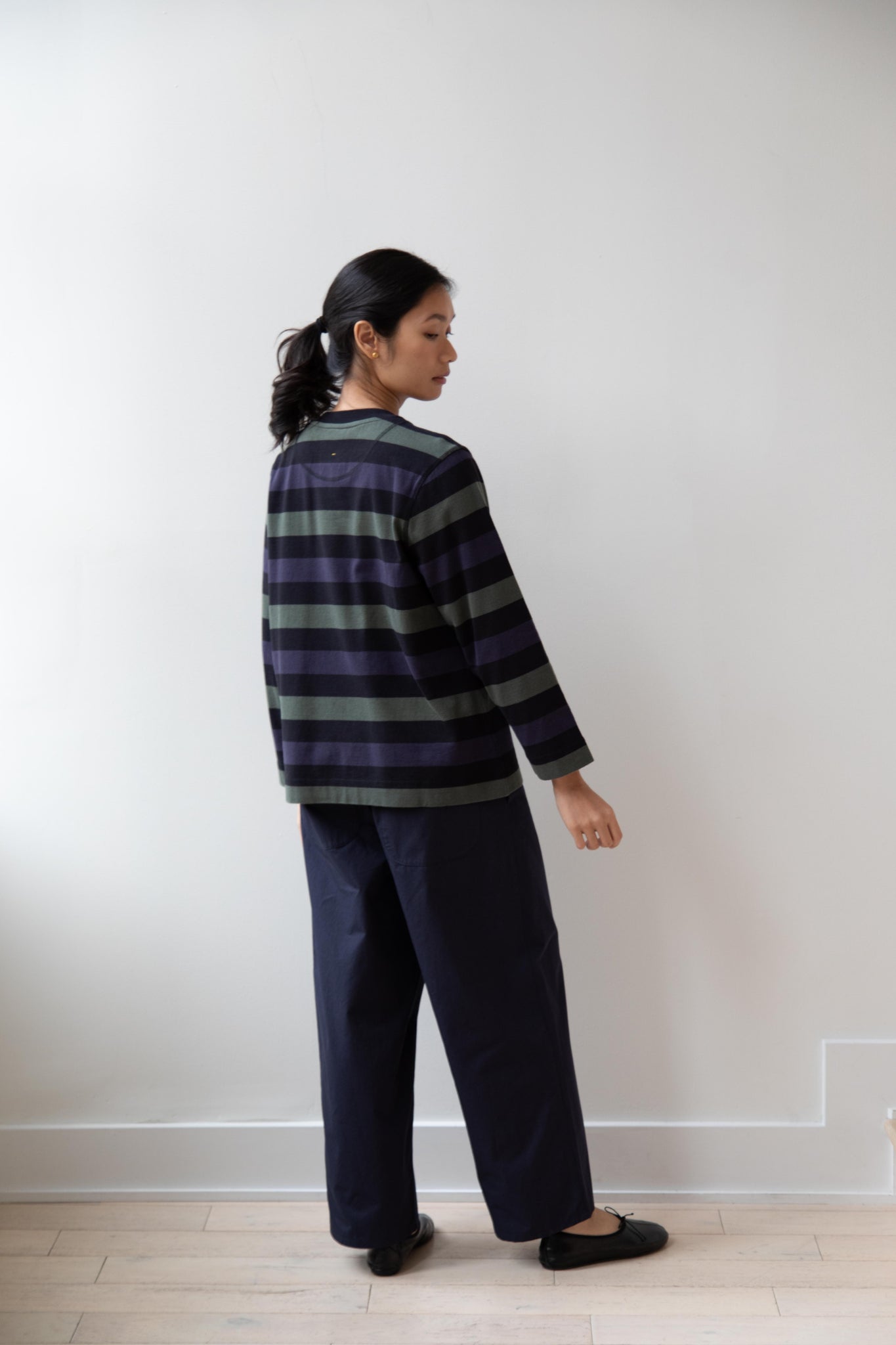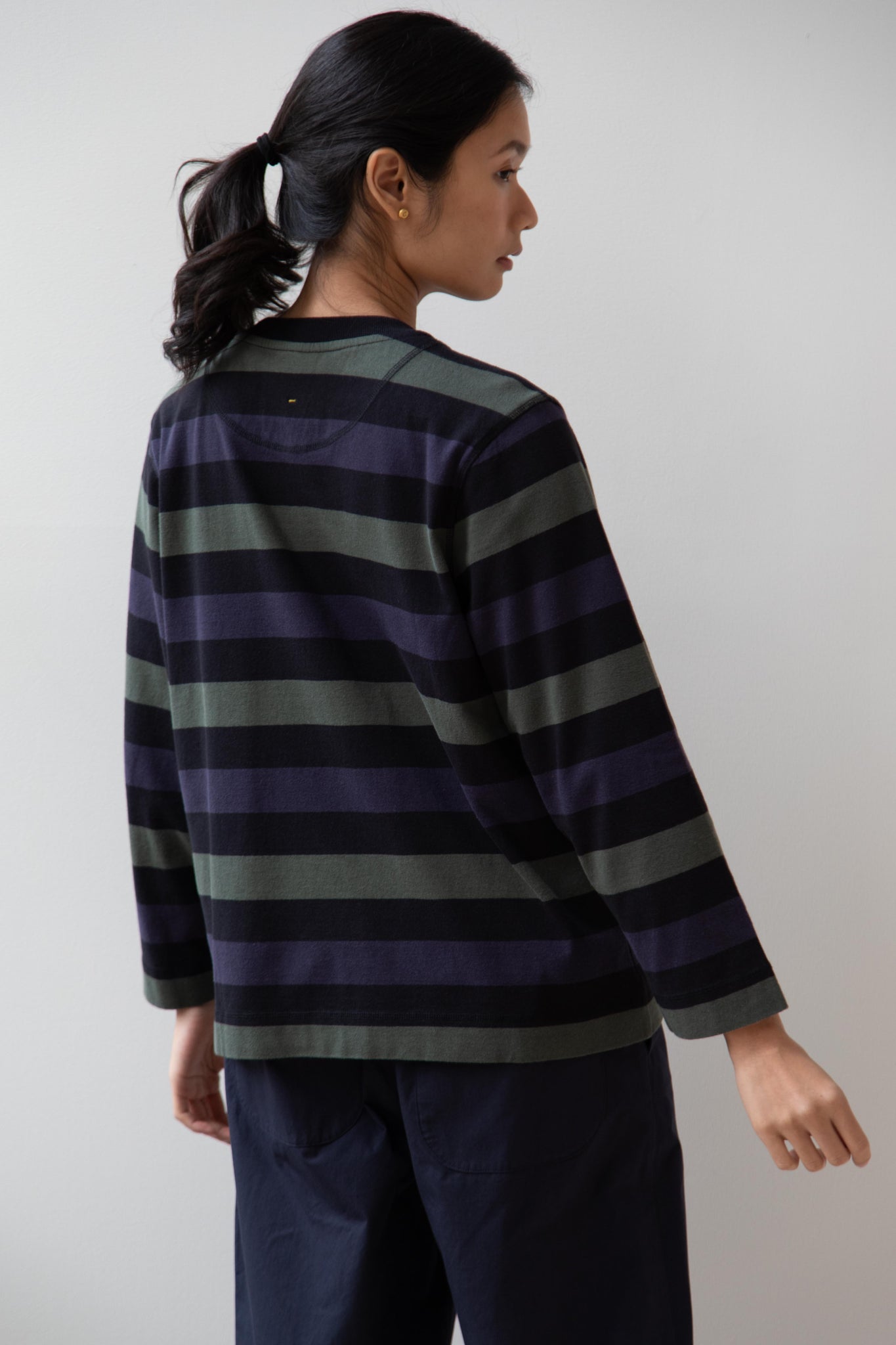 We love the colors of the stripes on this long sleeve tee. The cool undertones of the shirt makes it possible to pair with lots of different pants, we for one love it with navy.