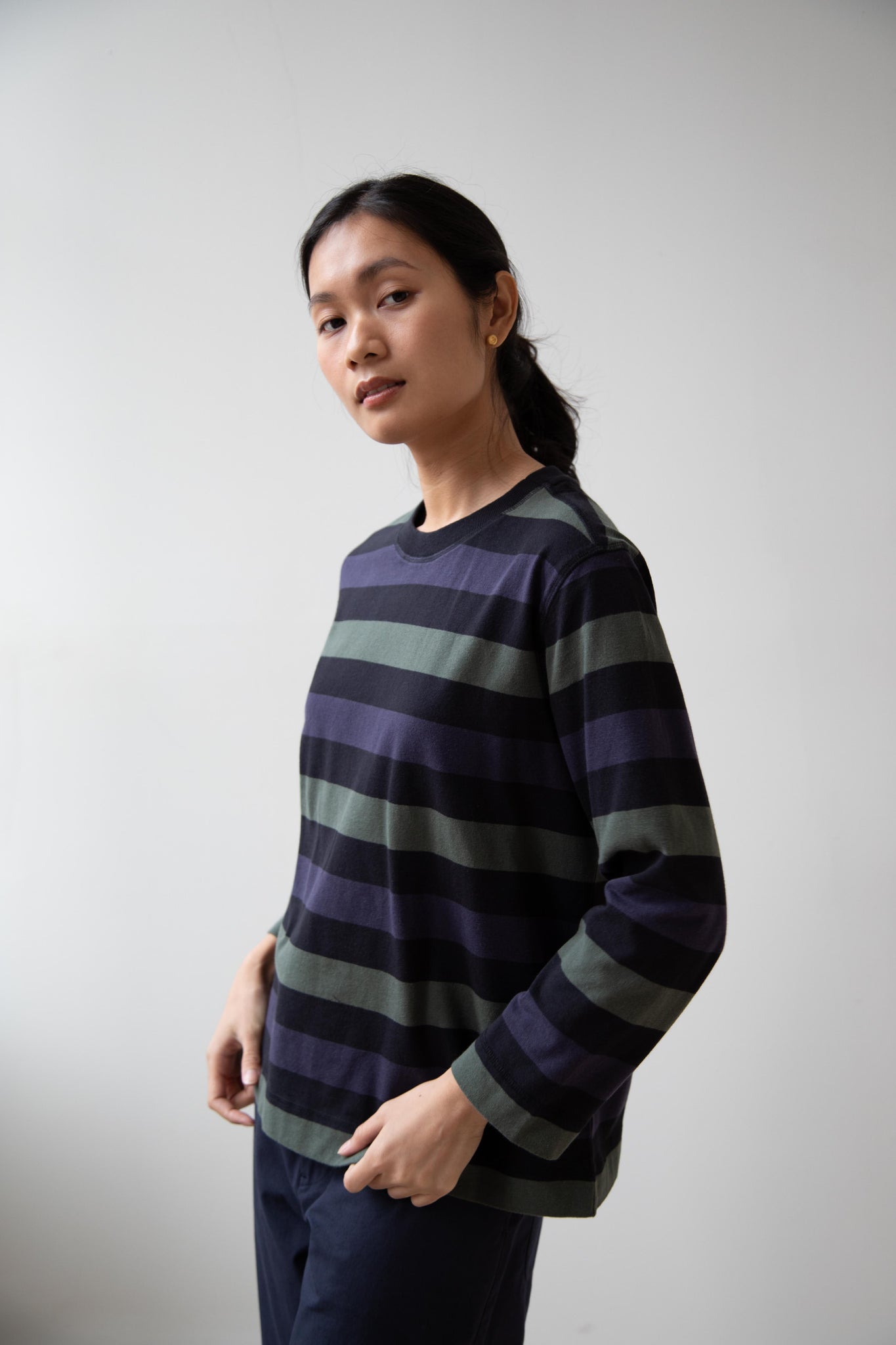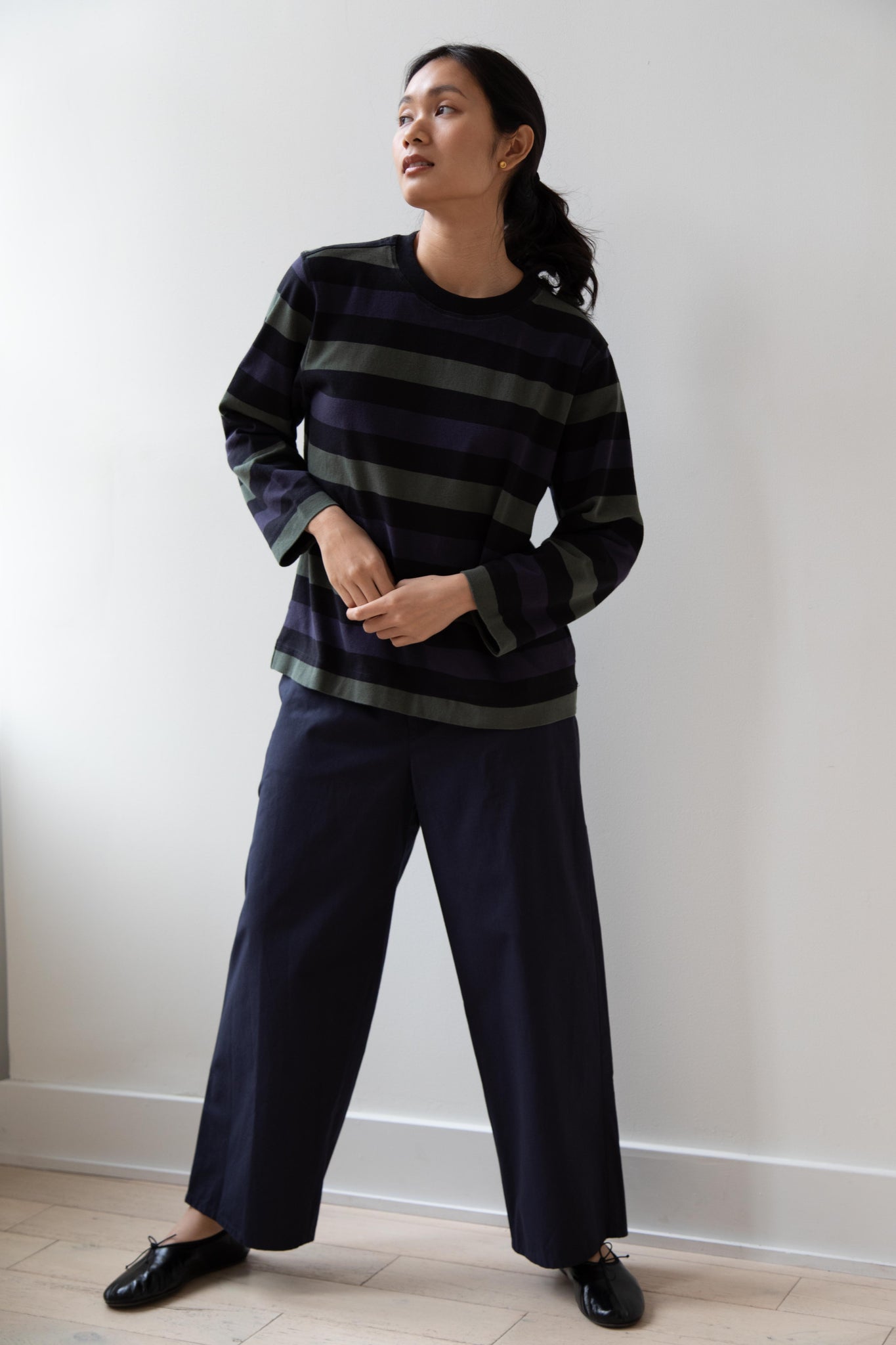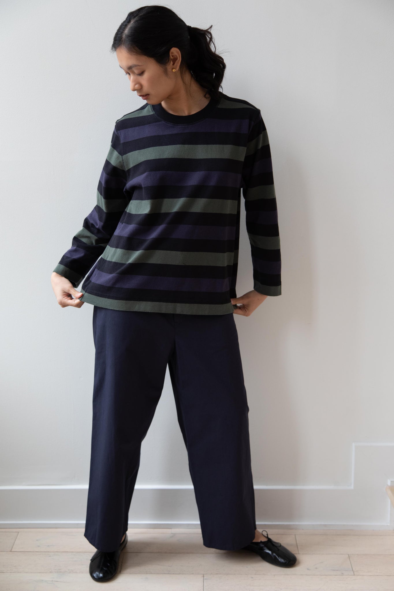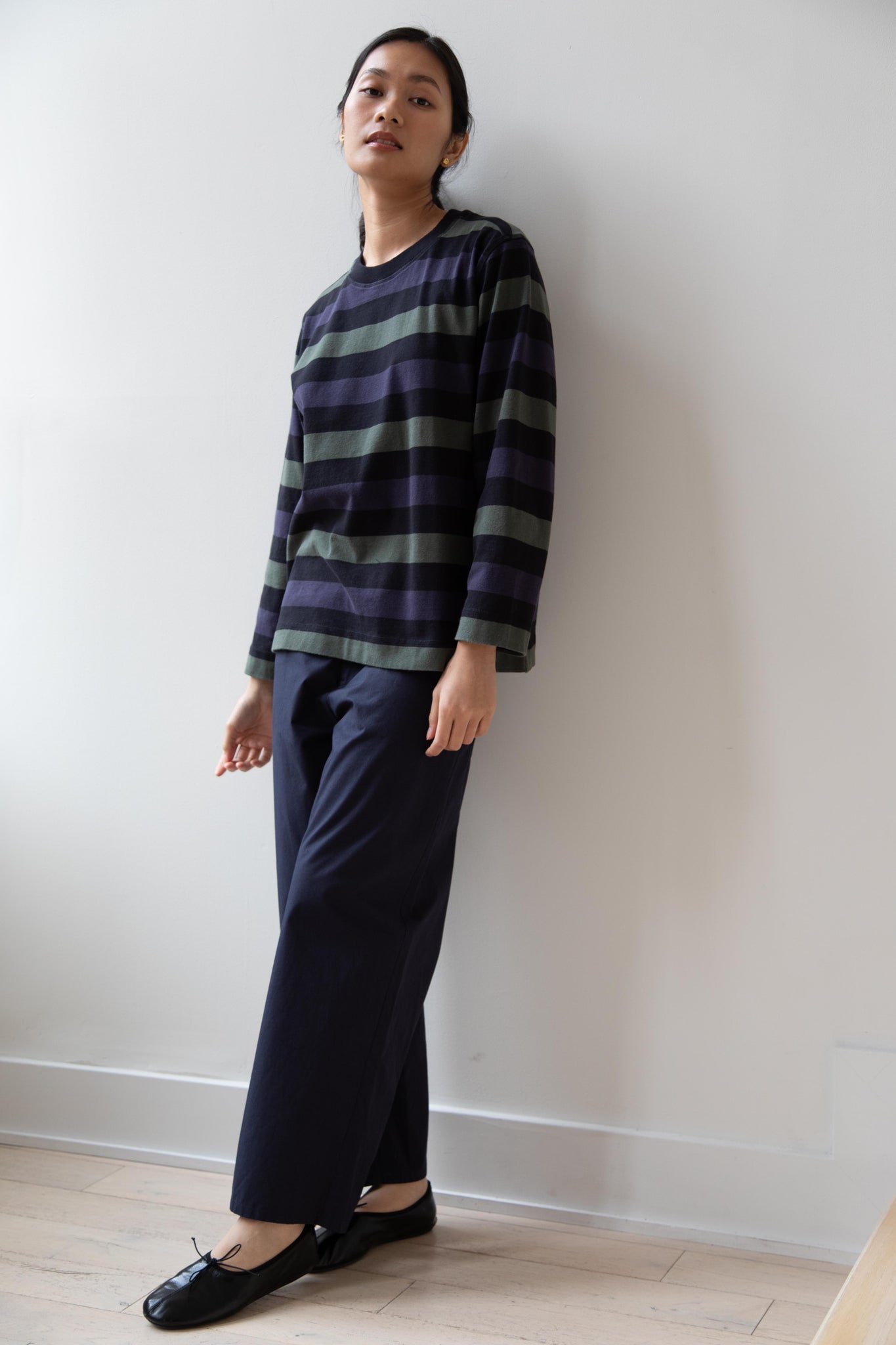 We love the colors of the stripes on this long sleeve tee. The cool undertones of the shirt makes it possible to pair with lots of different pants, we for one love it with navy.