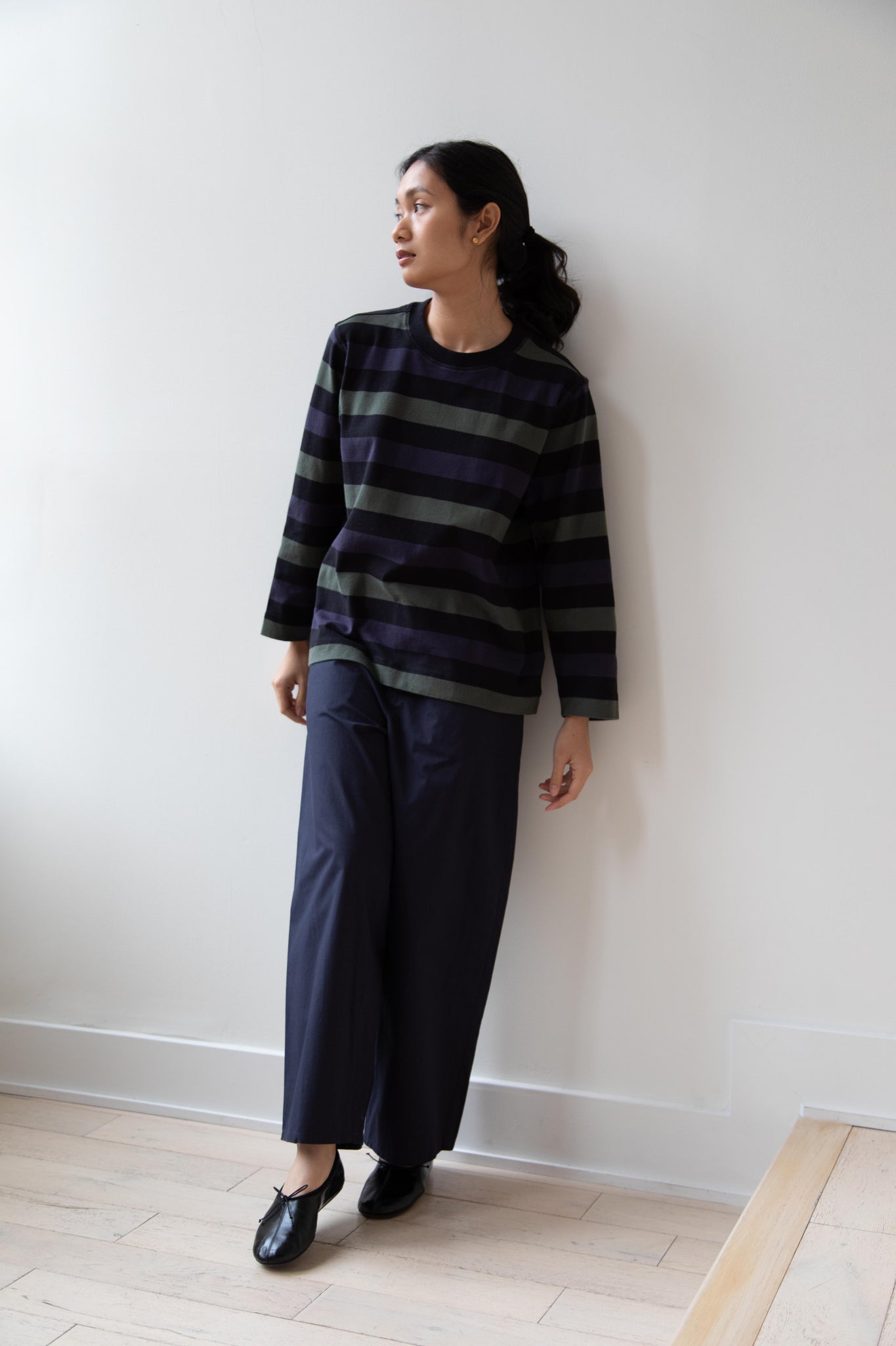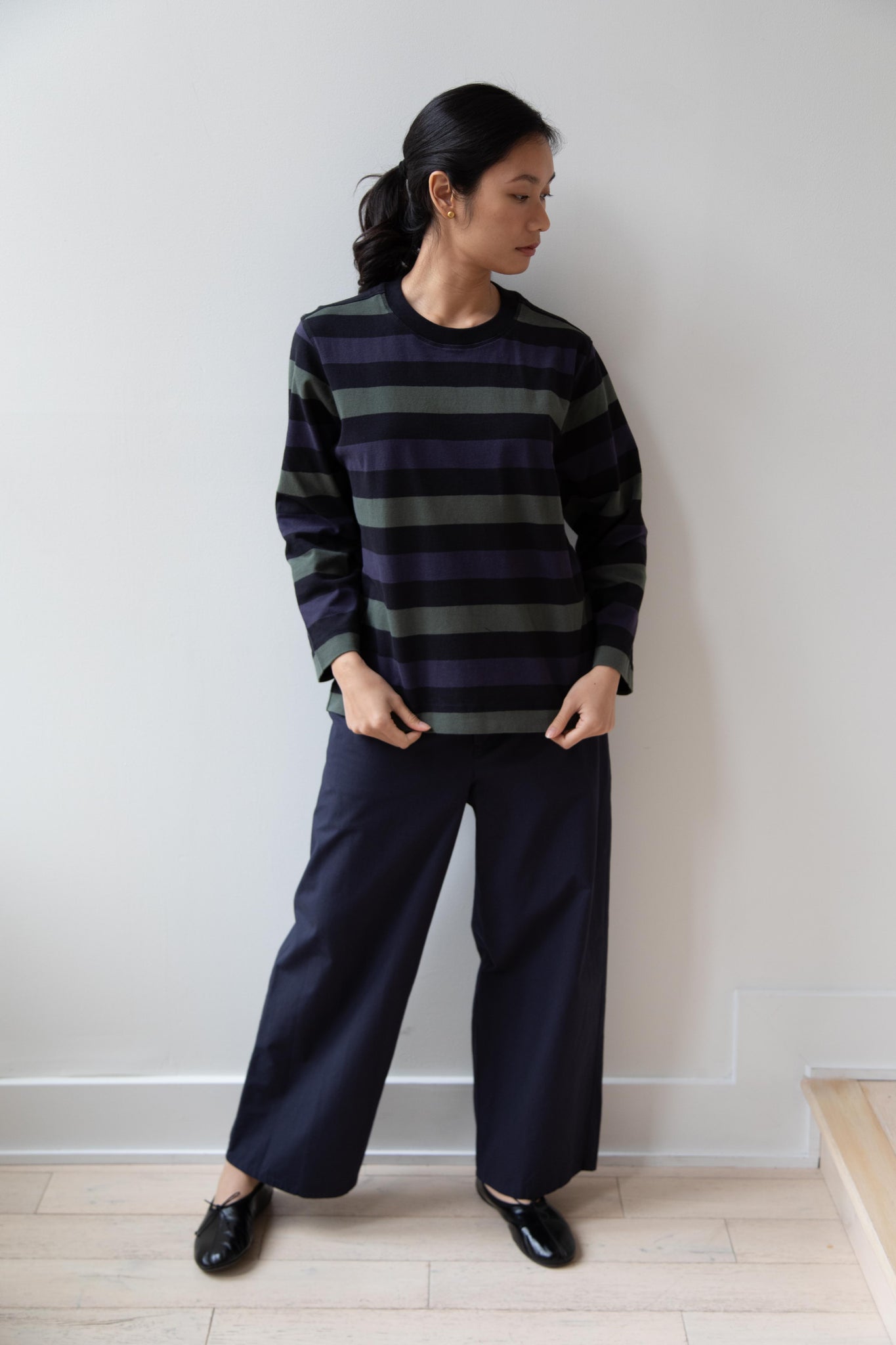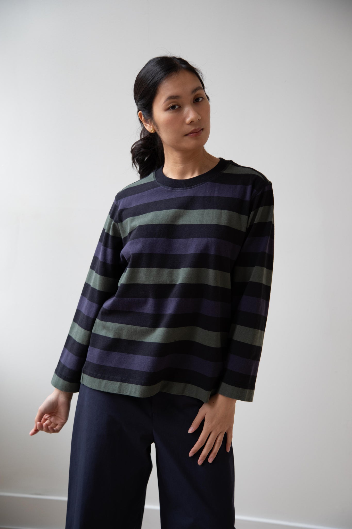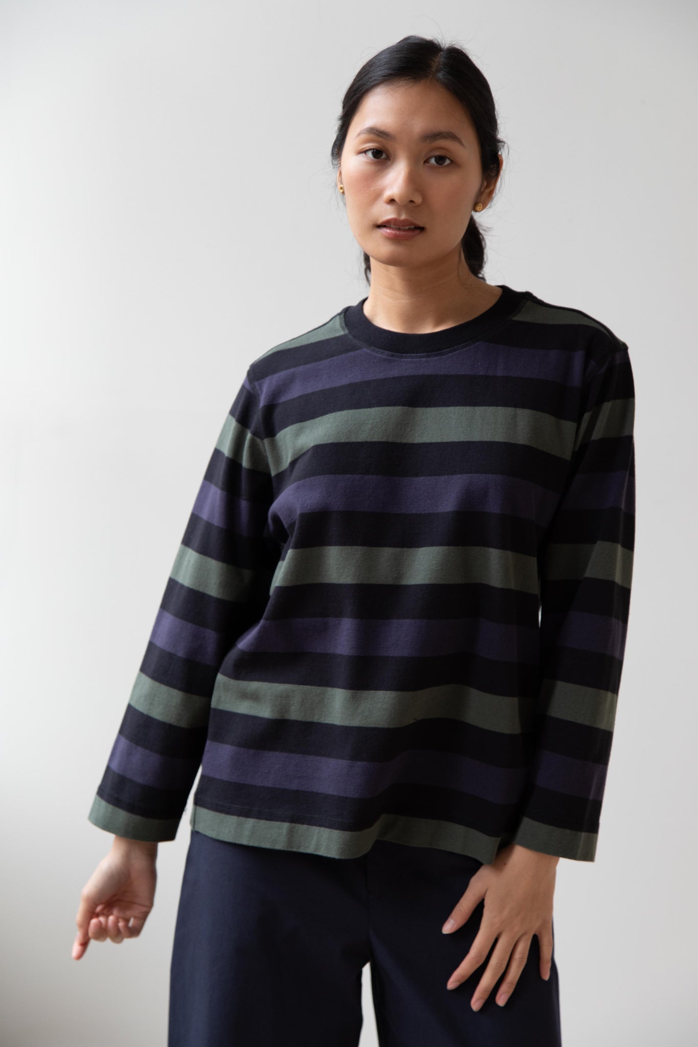 We love the colors of the stripes on this long sleeve tee. The cool undertones of the shirt makes it possible to pair with lots of different pants, we for one love it with navy.