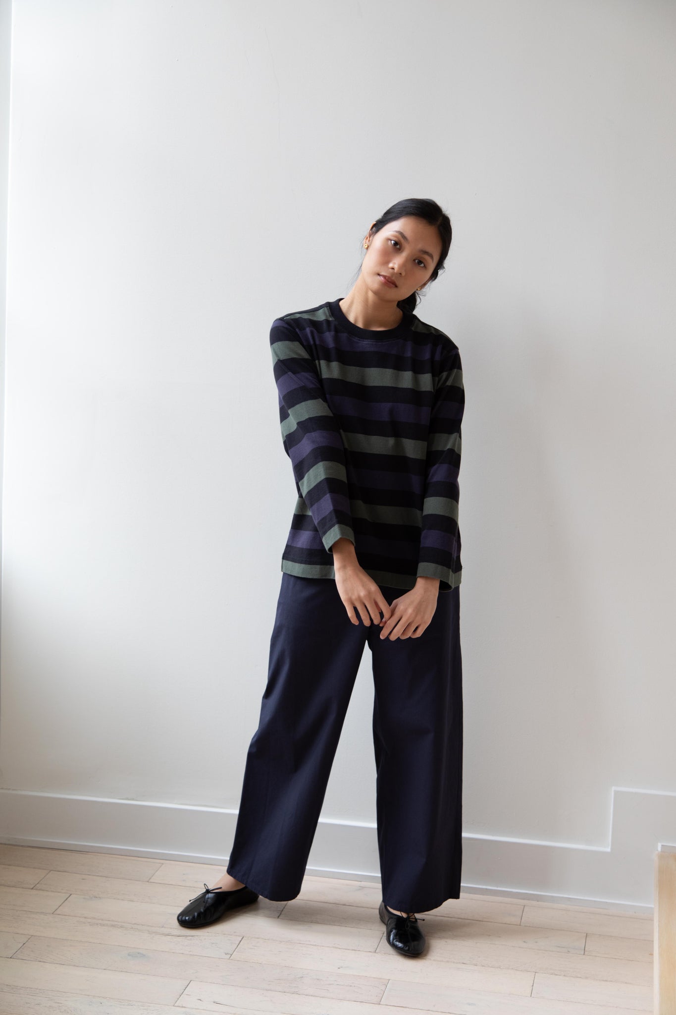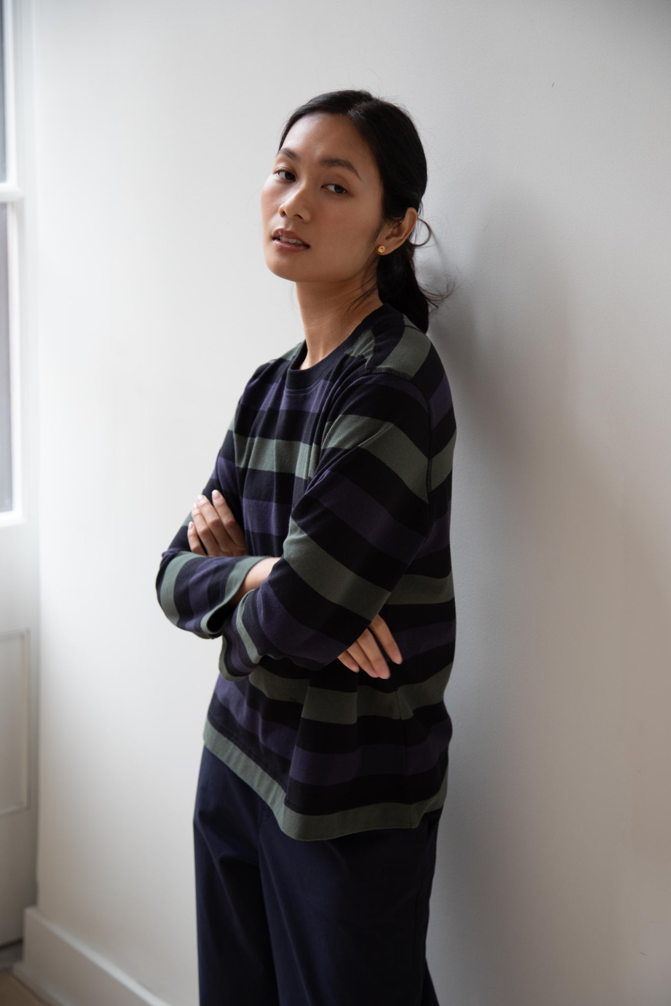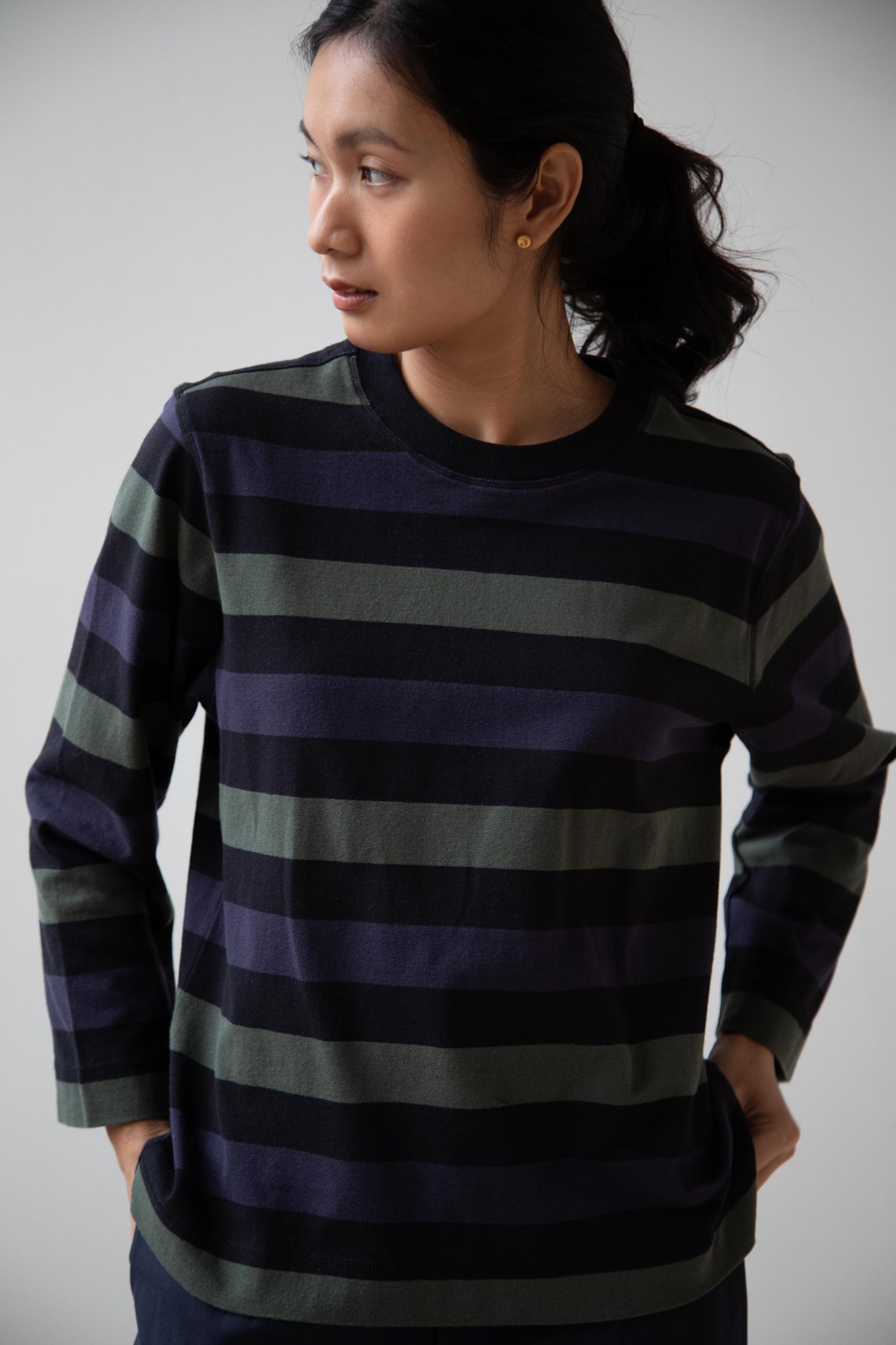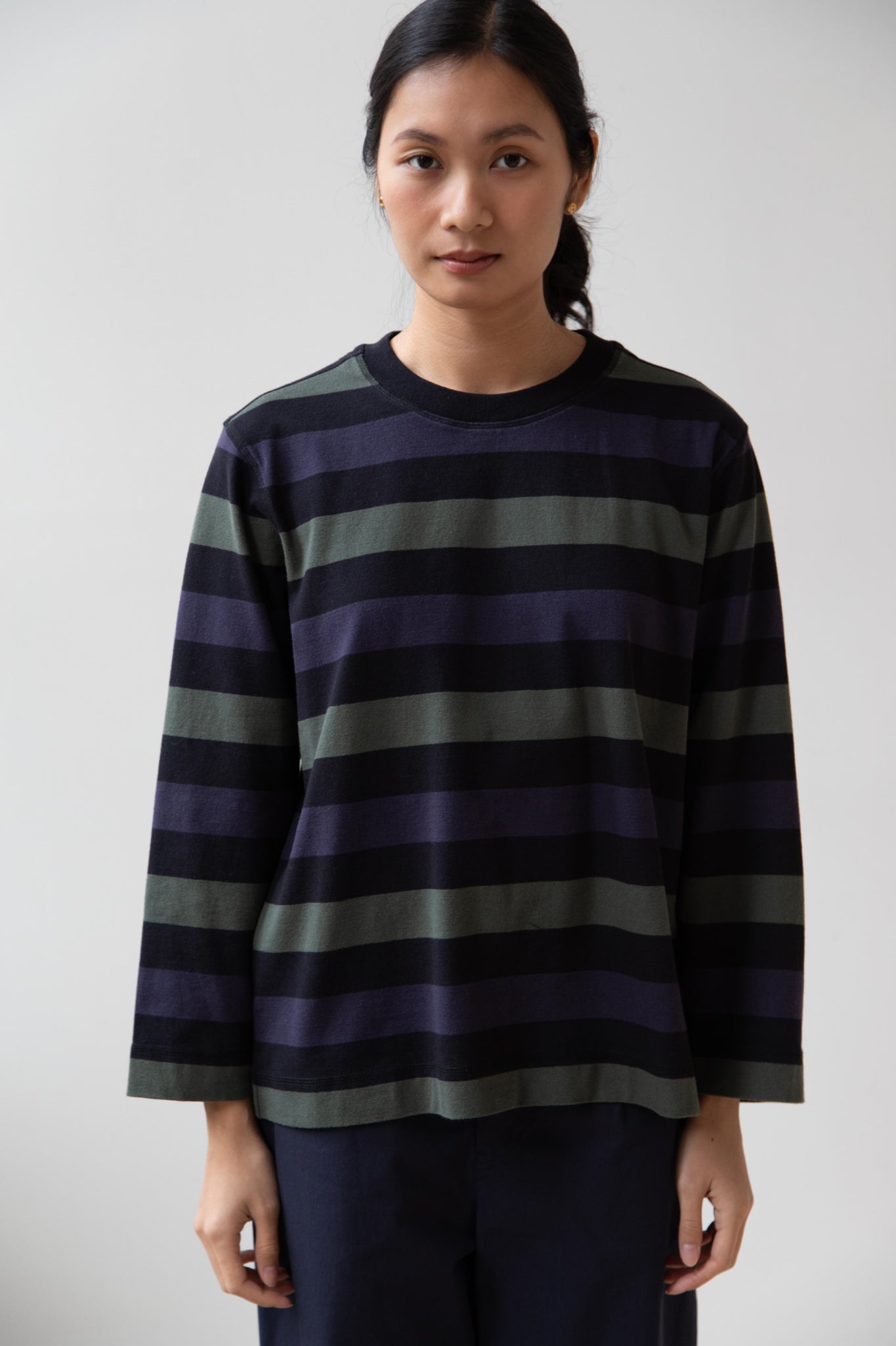 We love the colors of the stripes on this long sleeve tee. The cool undertones of the shirt makes it possible to pair with lots of different pants, we for one love it with navy.