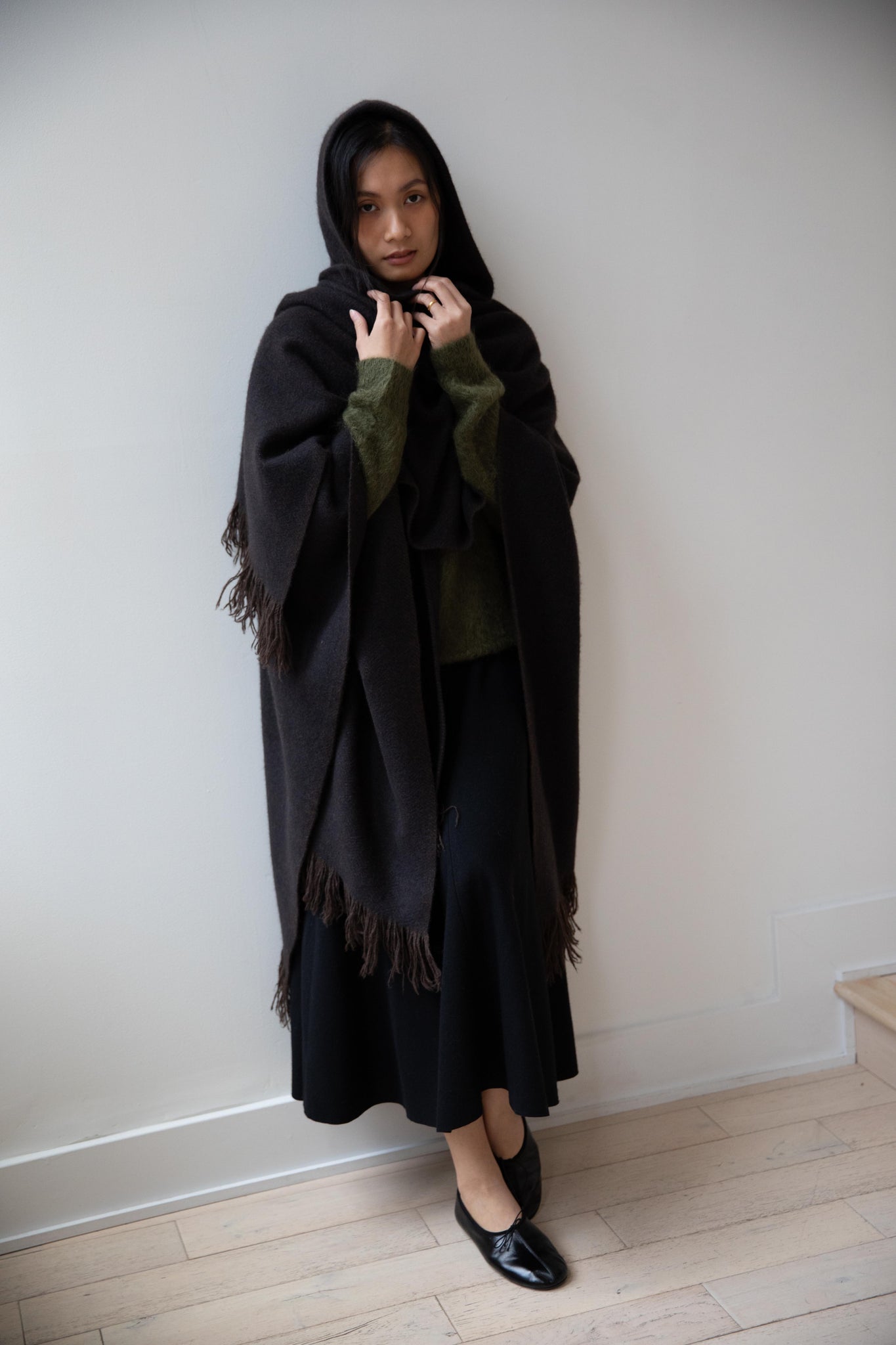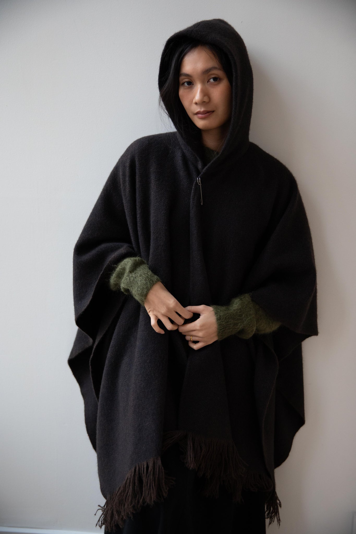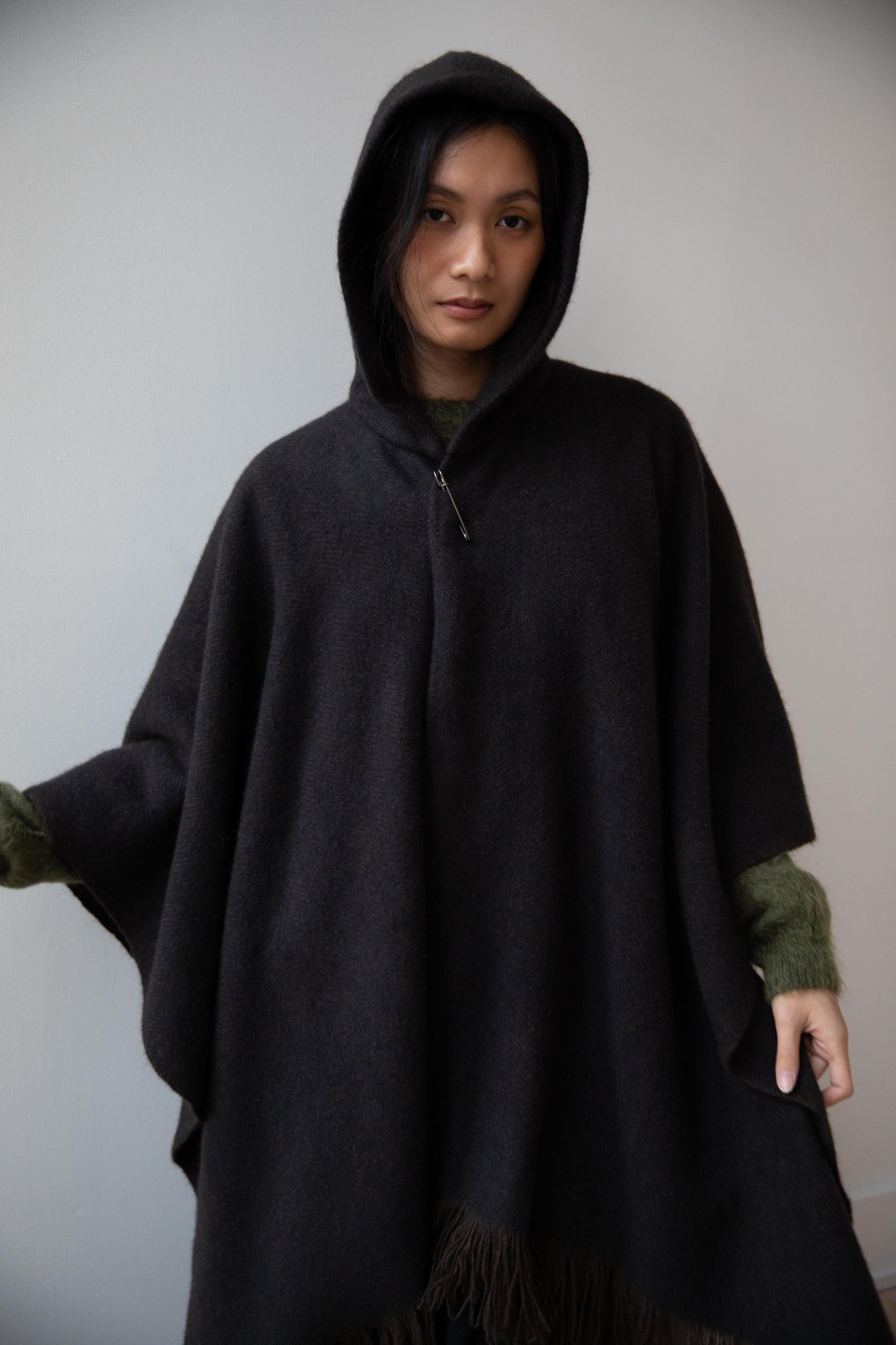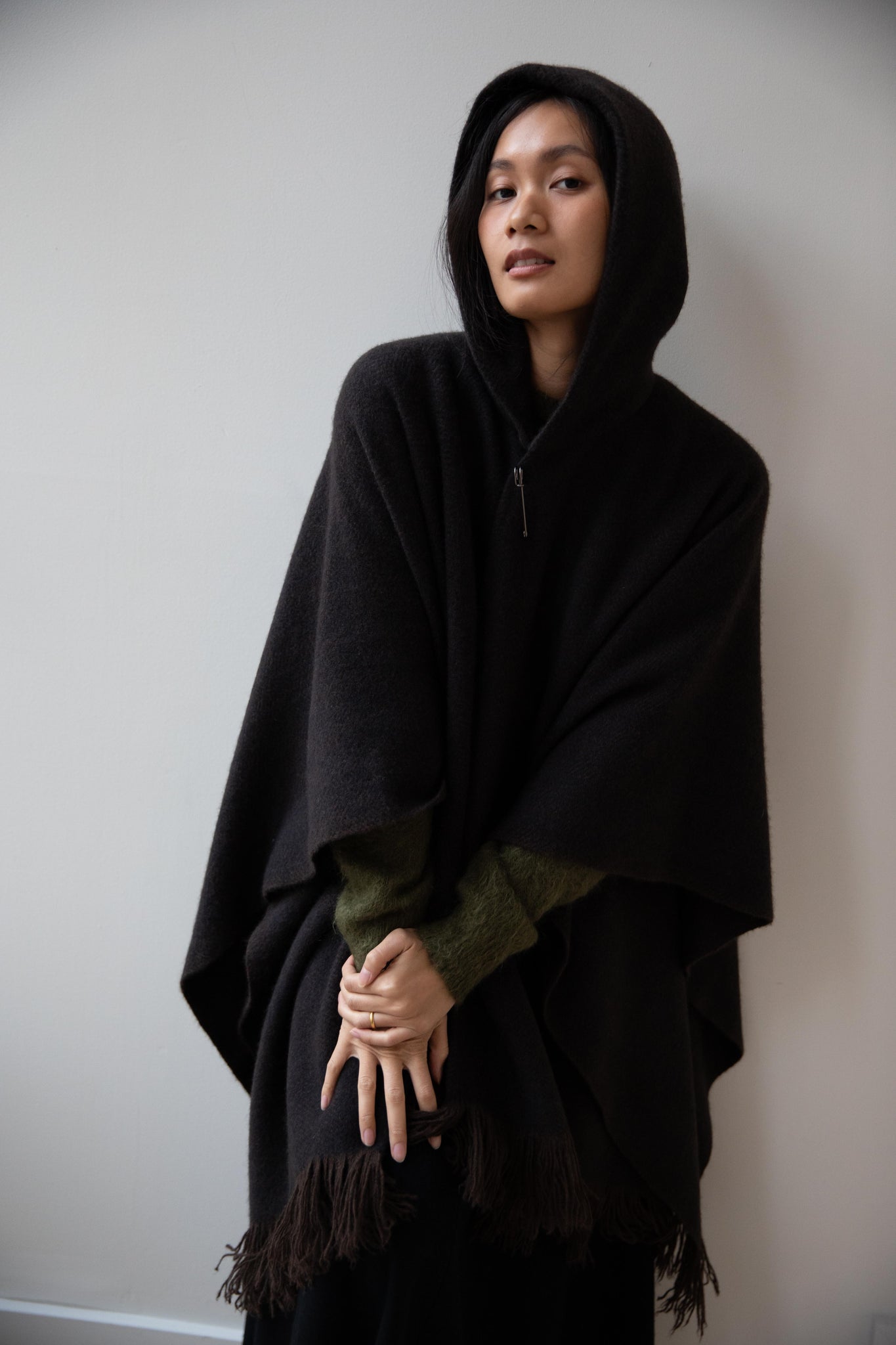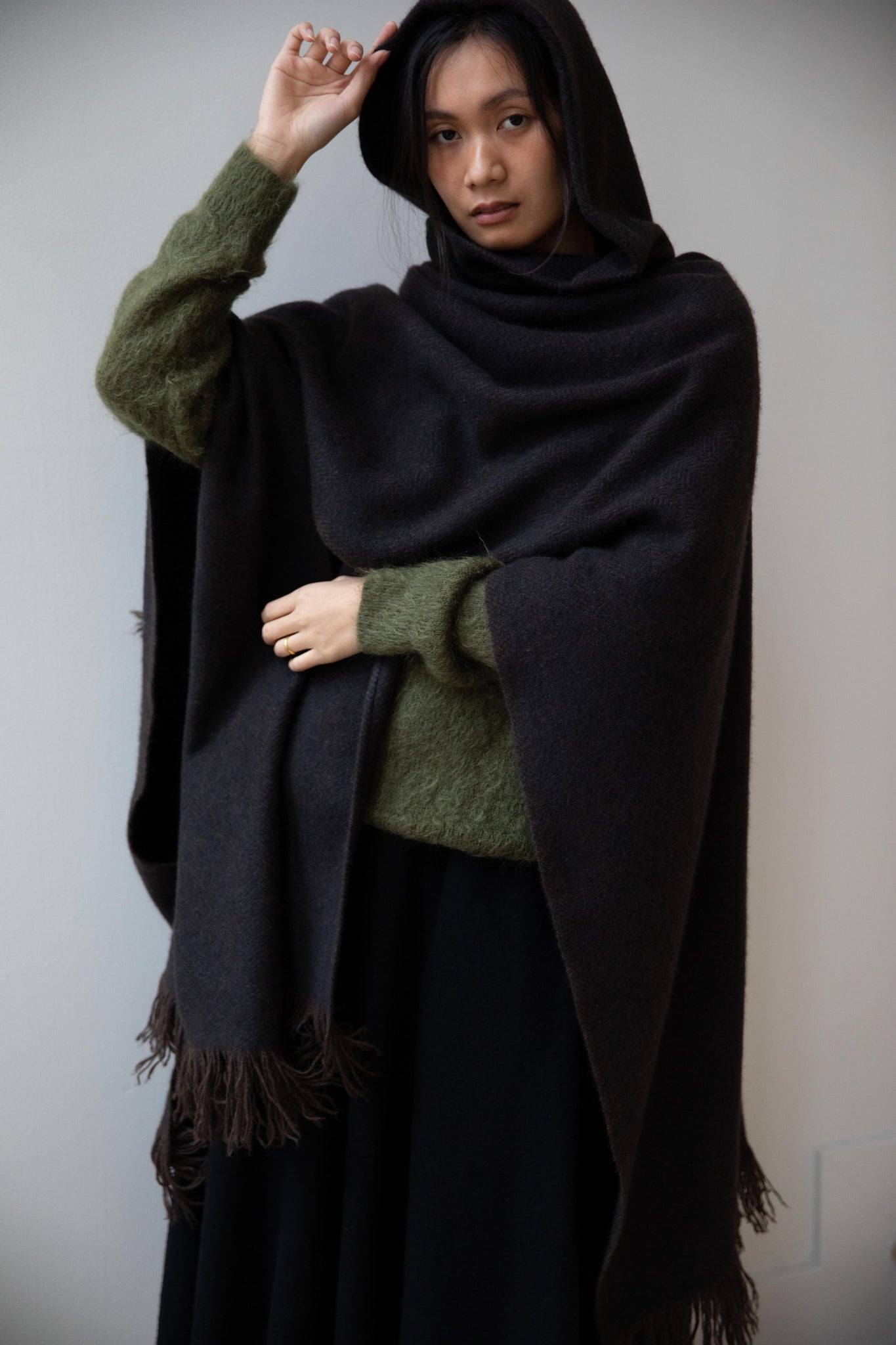 Made from yak wool, these new capes from Norlha might be the softest thing you have ever worn.  Beautifully woven and with a lofted handle, they add extra warmth to any look.  There are seemingly infinite ways to style and wear them as well.  This one is made from a deep navy and dark brown herringbone weave with fringe at the bottom.  There is a hood and and optional pin as well.