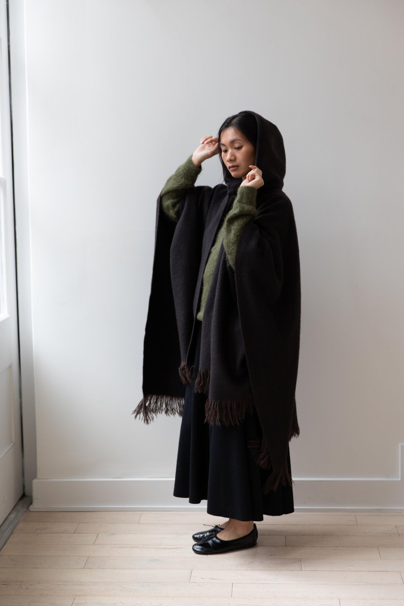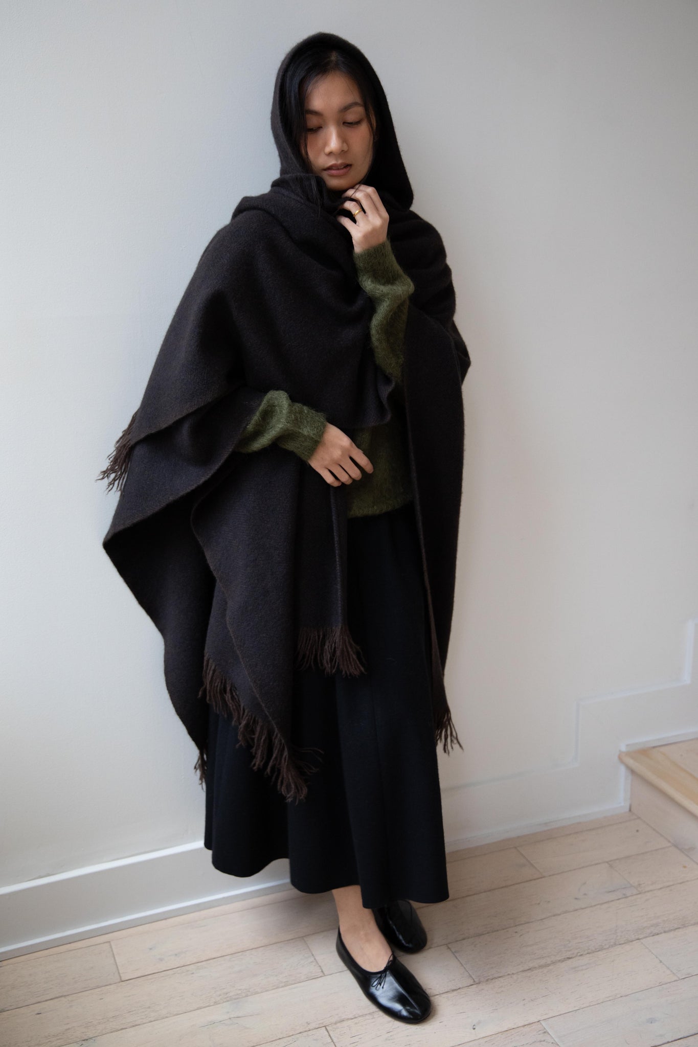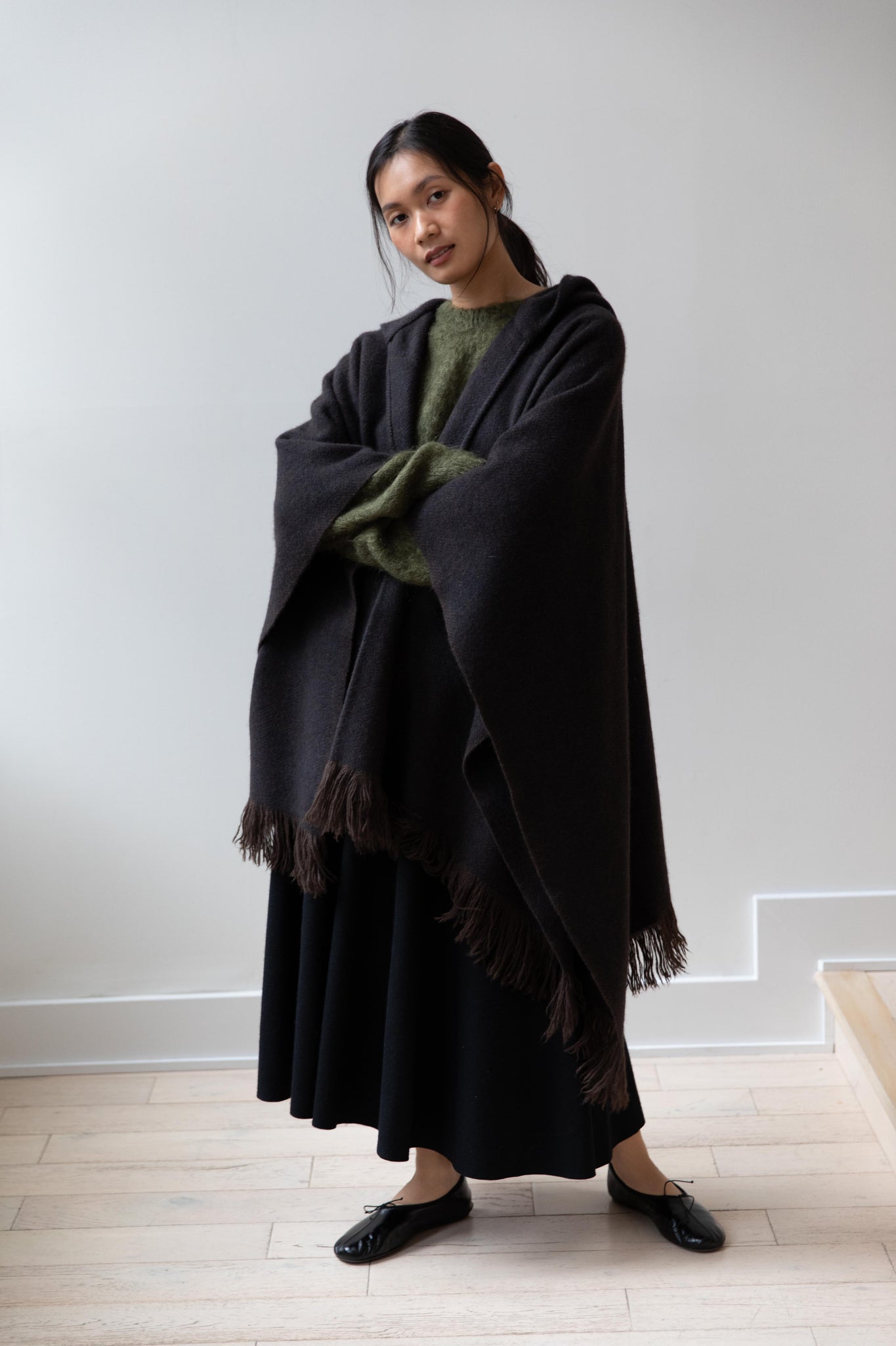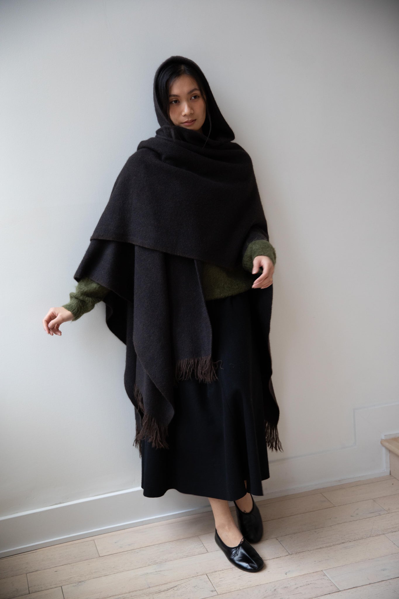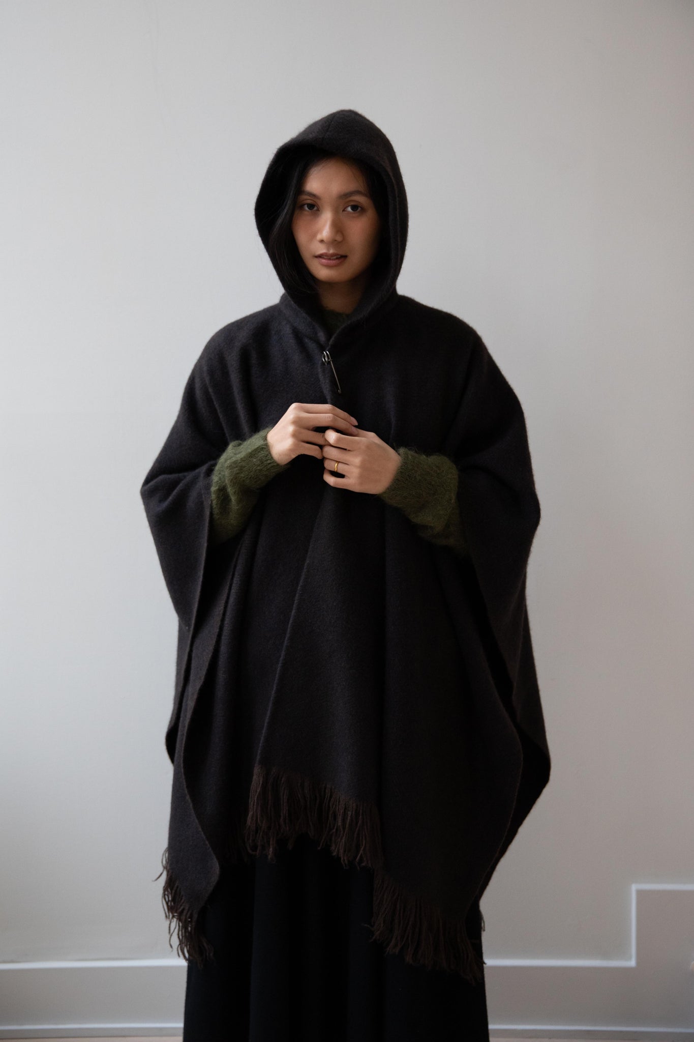 Made from yak wool, these new capes from Norlha might be the softest thing you have ever worn.  Beautifully woven and with a lofted handle, they add extra warmth to any look.  There are seemingly infinite ways to style and wear them as well.  This one is made from a deep navy and dark brown herringbone weave with fringe at the bottom.  There is a hood and and optional pin as well.