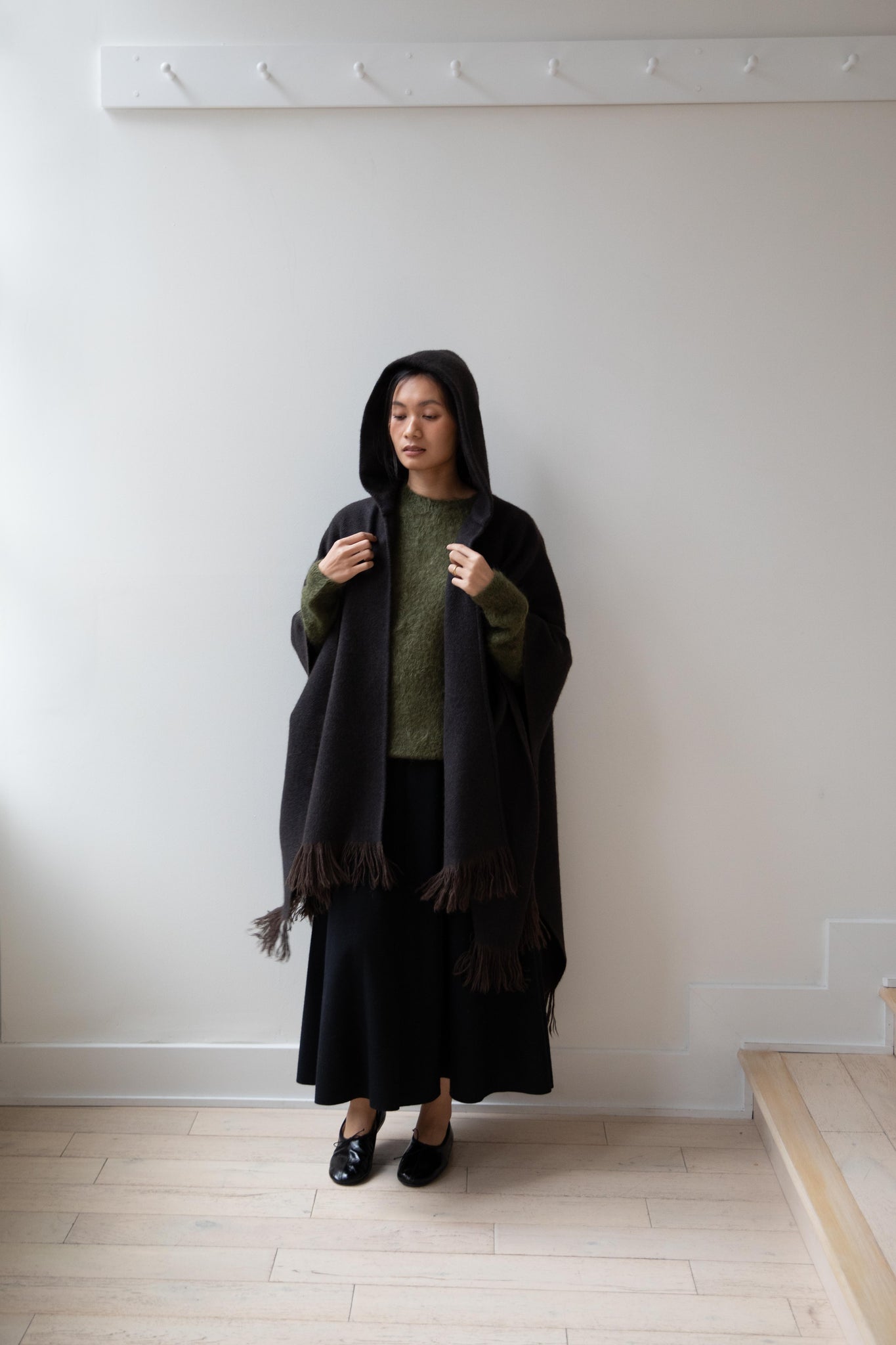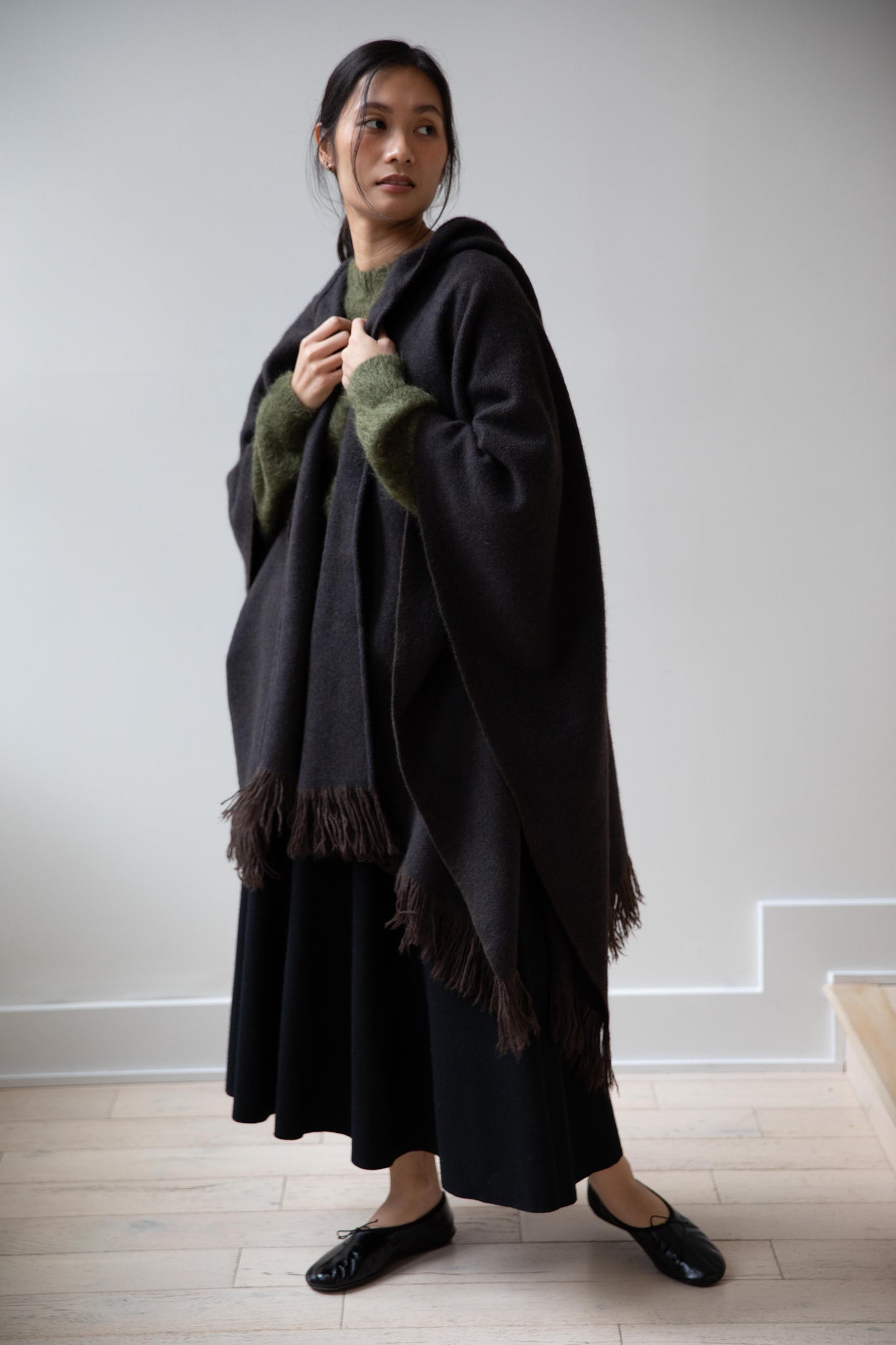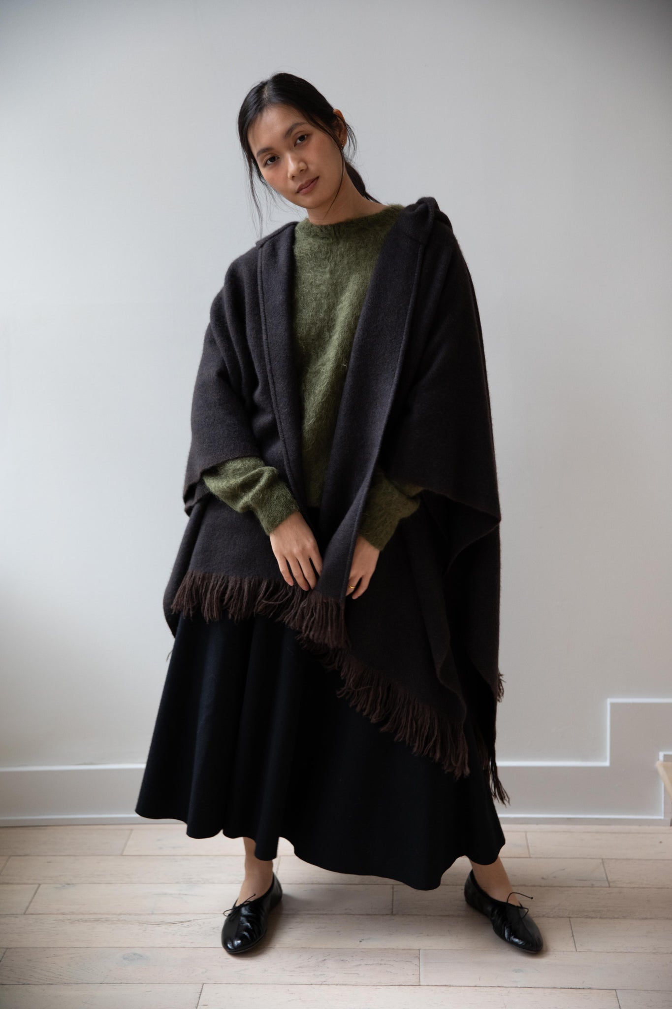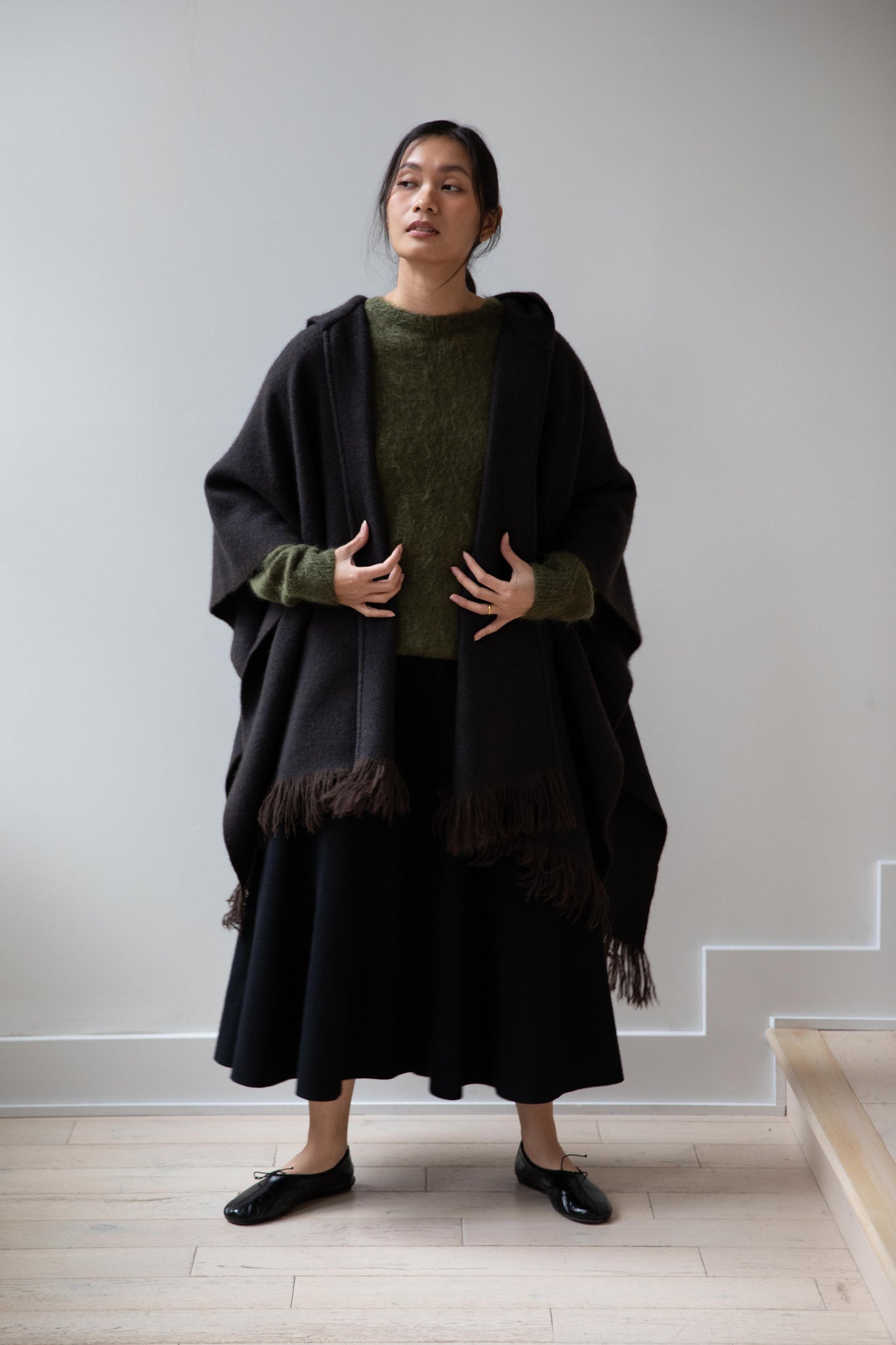 Made from yak wool, these new capes from Norlha might be the softest thing you have ever worn.  Beautifully woven and with a lofted handle, they add extra warmth to any look.  There are seemingly infinite ways to style and wear them as well.  This one is made from a deep navy and dark brown herringbone weave with fringe at the bottom.  There is a hood and and optional pin as well.