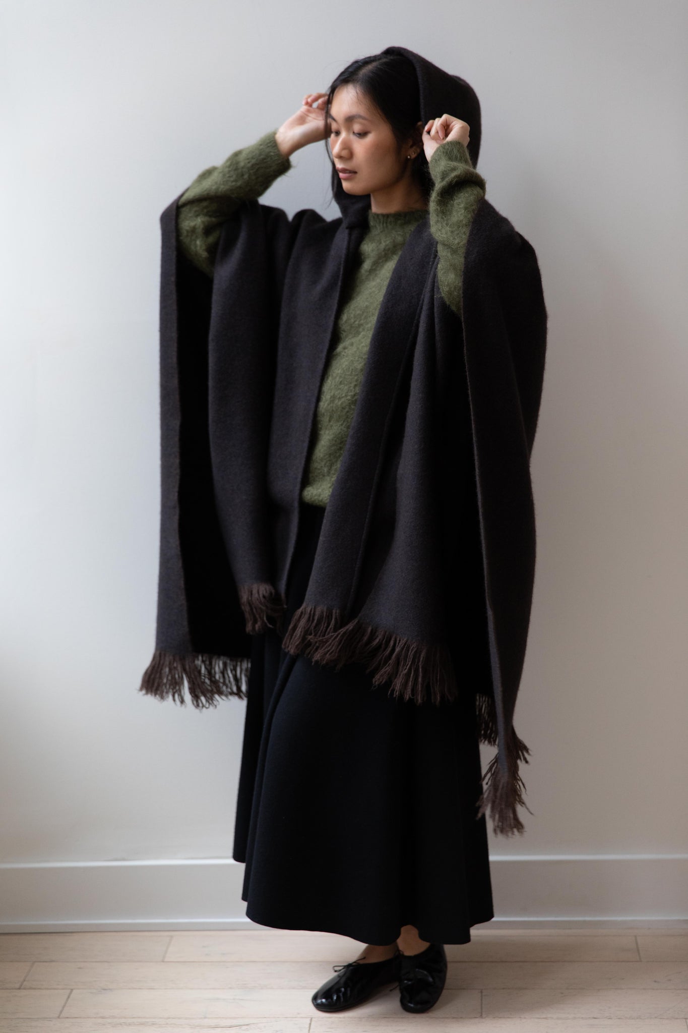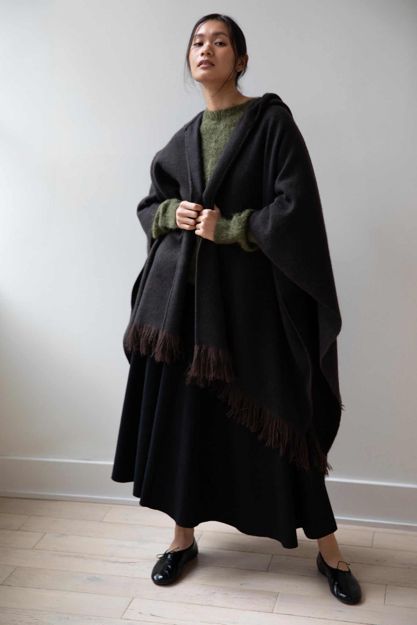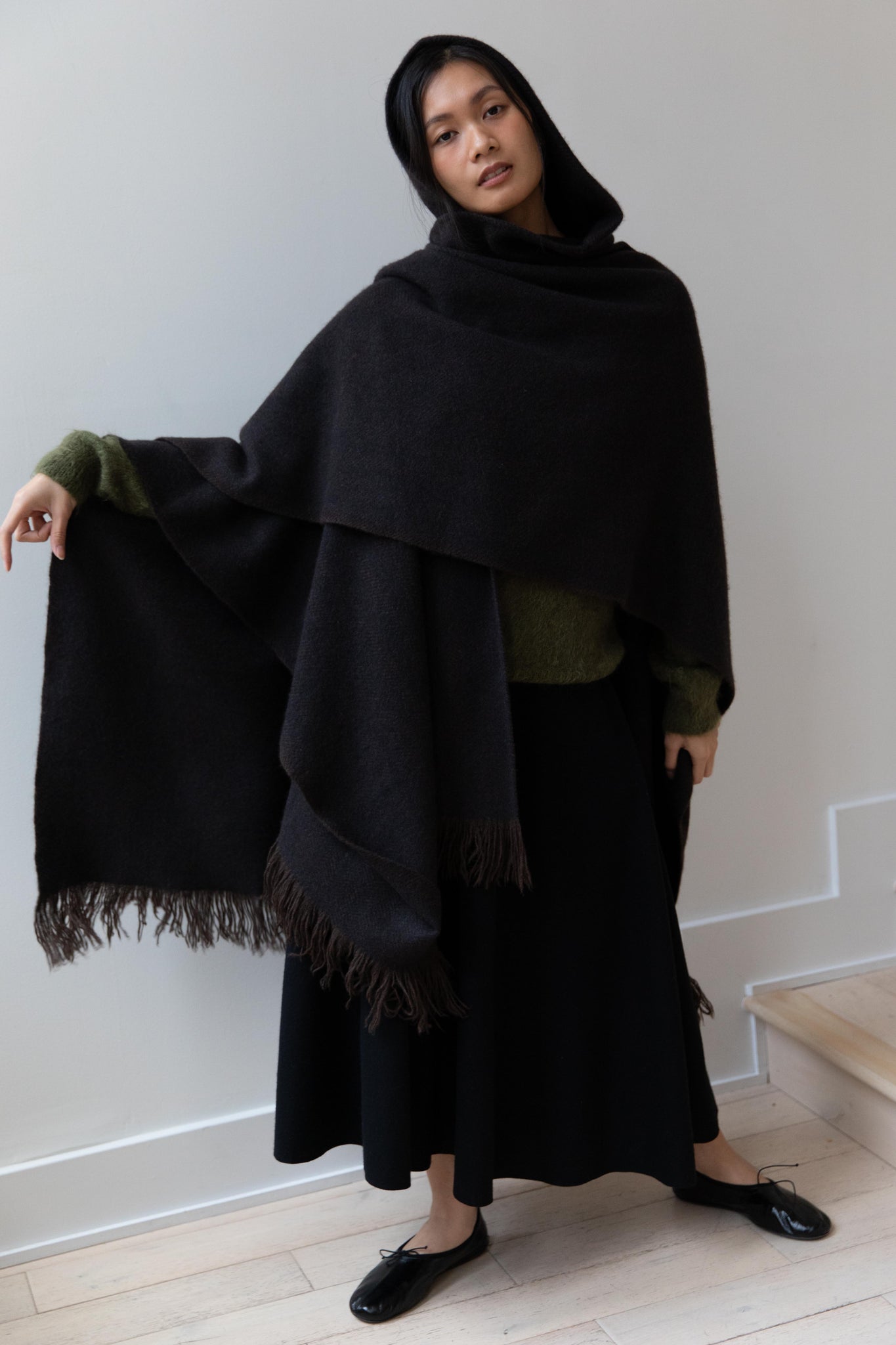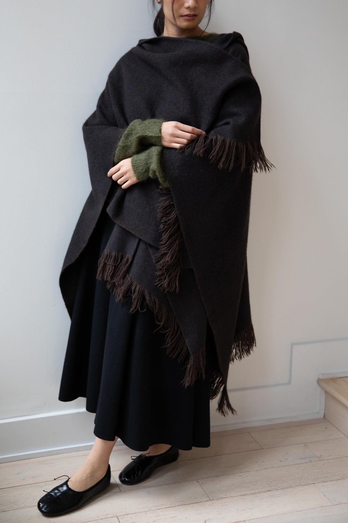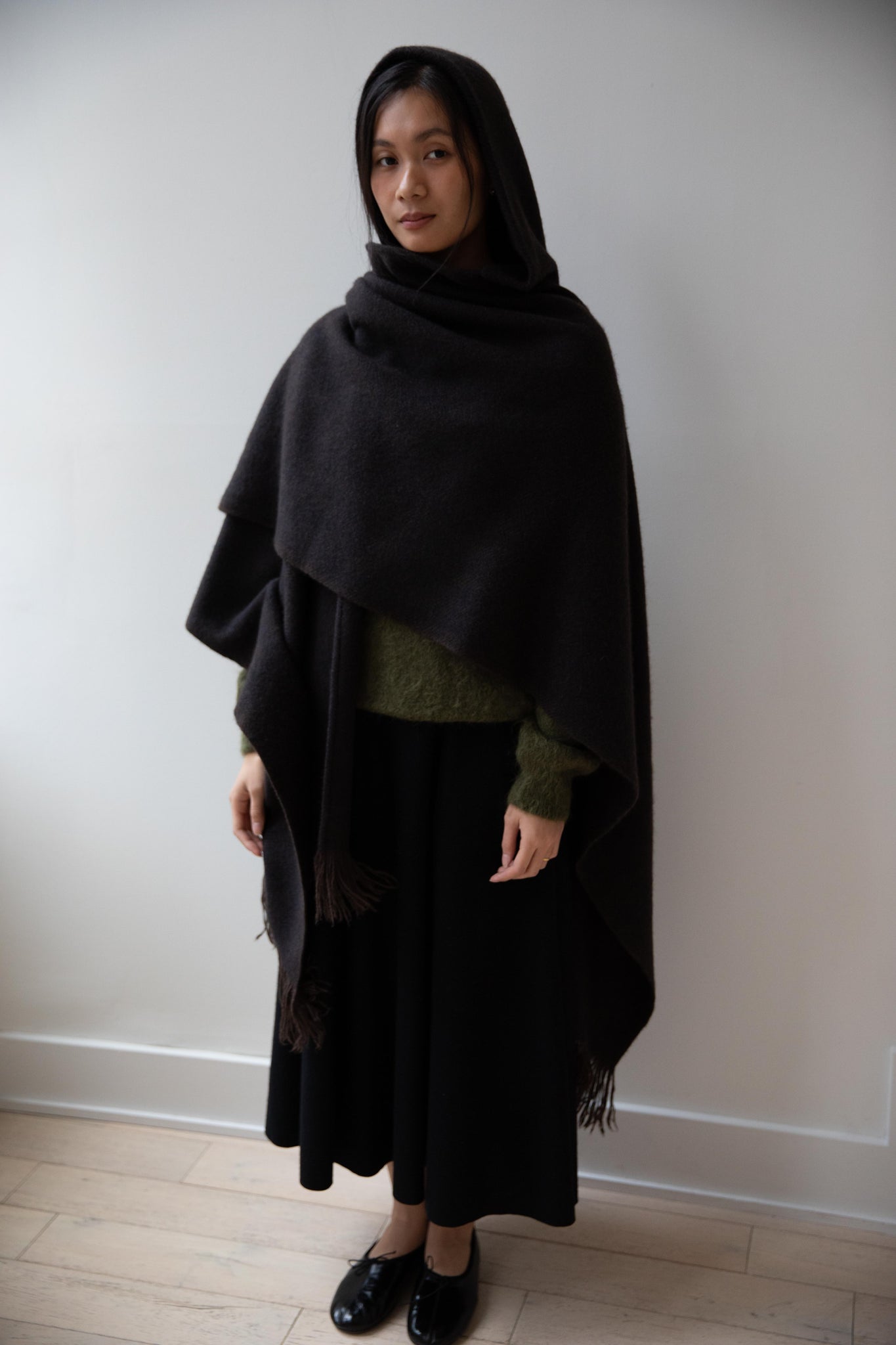 Made from yak wool, these new capes from Norlha might be the softest thing you have ever worn.  Beautifully woven and with a lofted handle, they add extra warmth to any look.  There are seemingly infinite ways to style and wear them as well.  This one is made from a deep navy and dark brown herringbone weave with fringe at the bottom.  There is a hood and and optional pin as well.