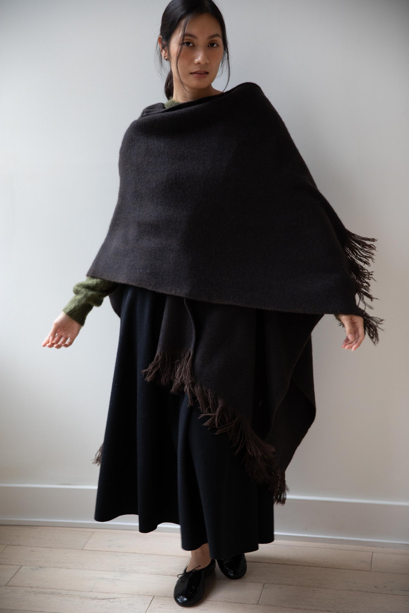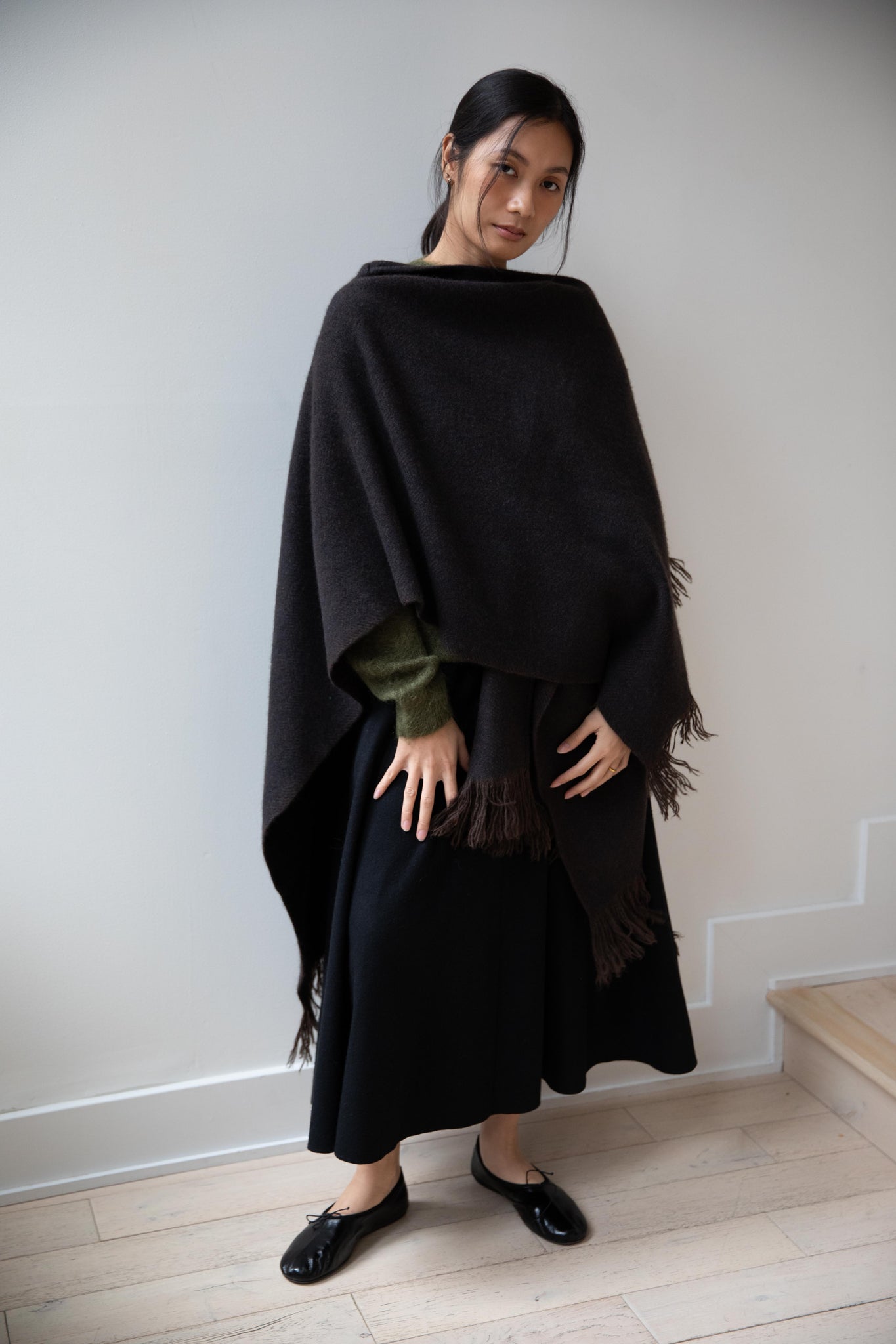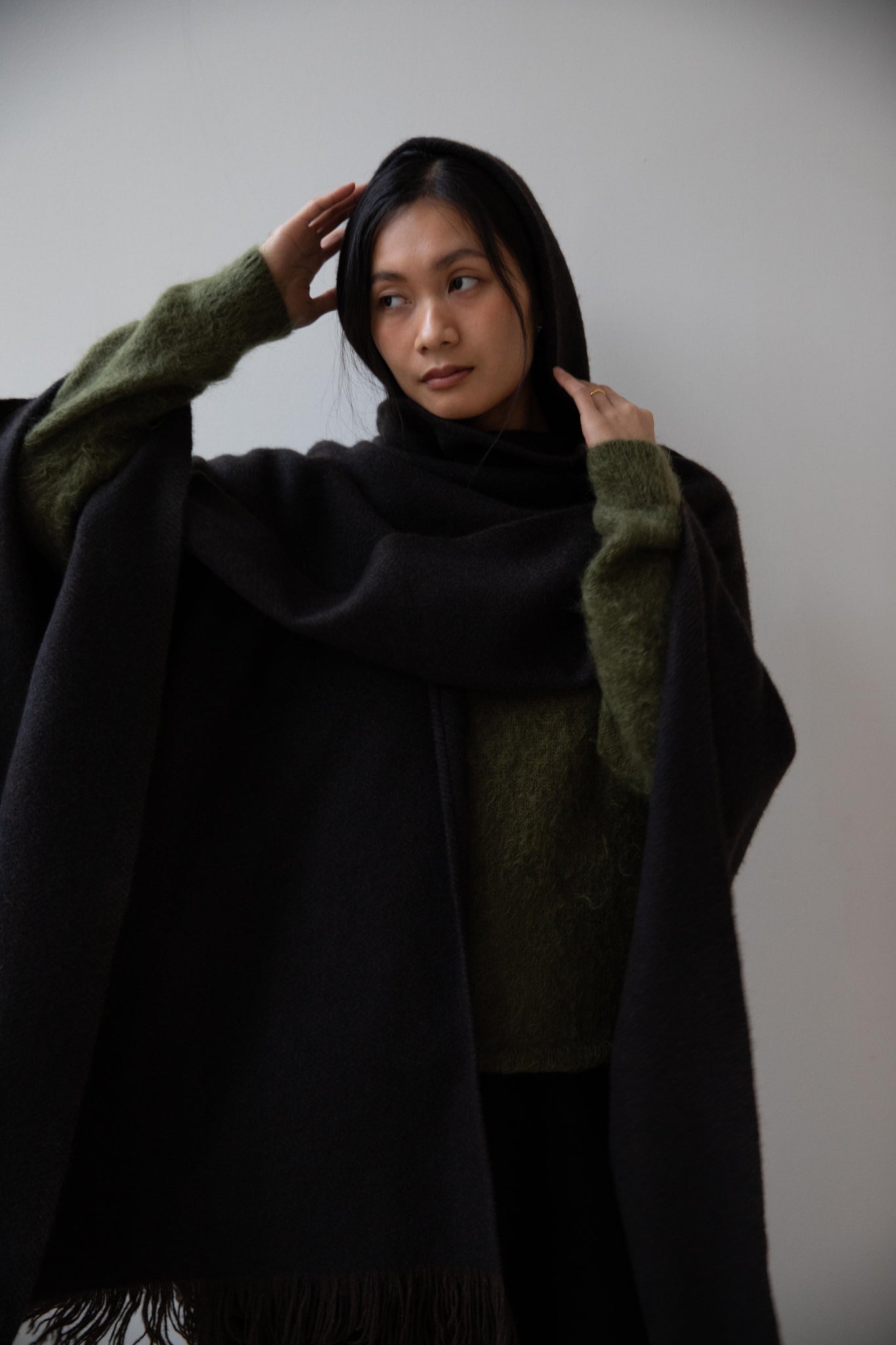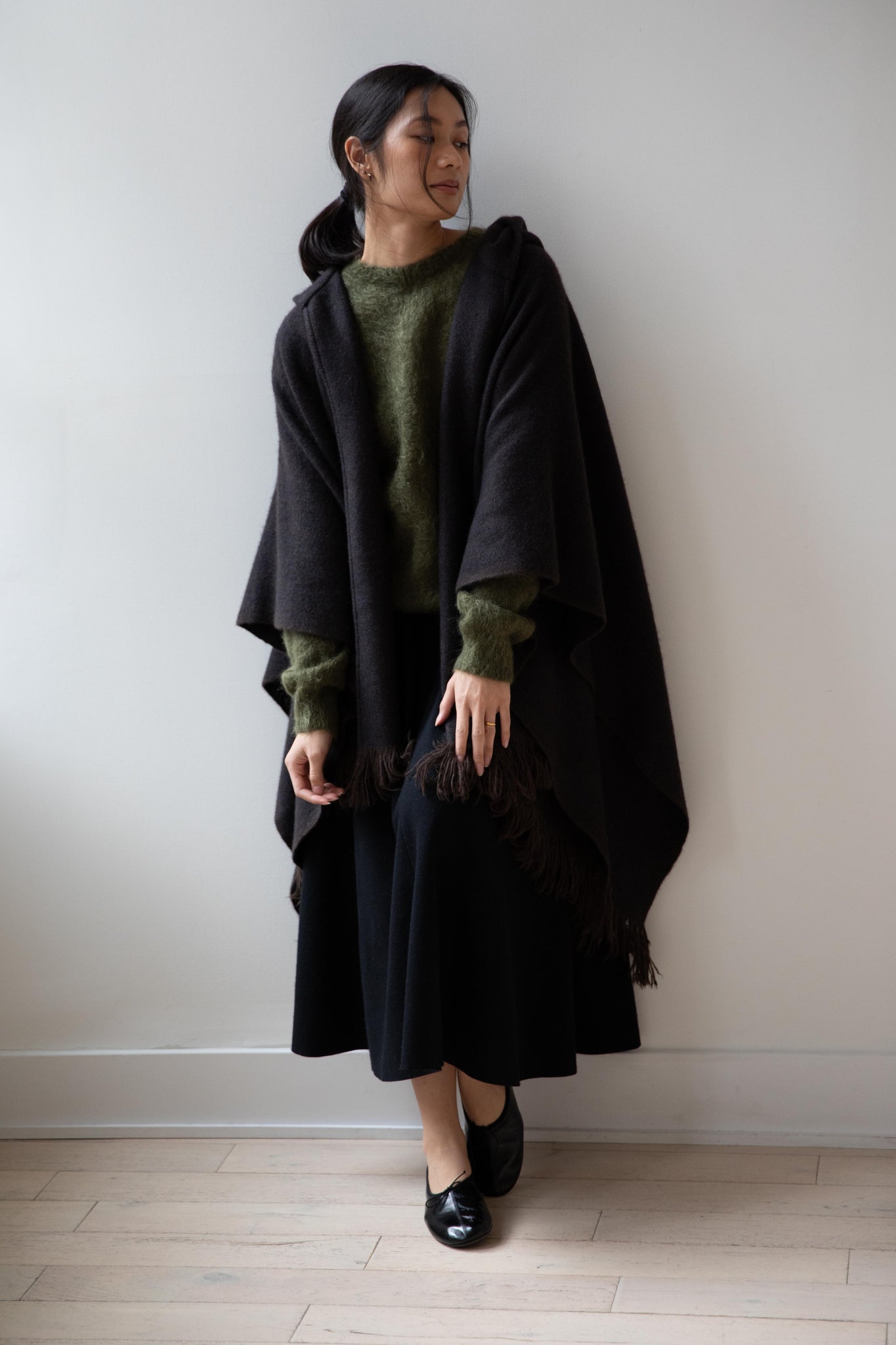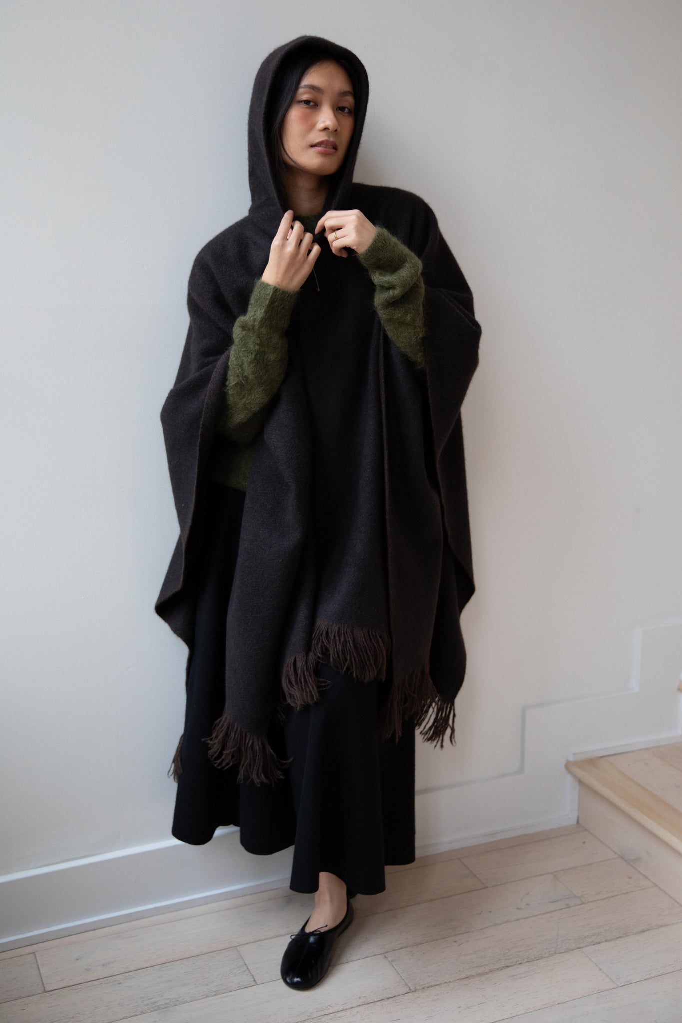 Made from yak wool, these new capes from Norlha might be the softest thing you have ever worn.  Beautifully woven and with a lofted handle, they add extra warmth to any look.  There are seemingly infinite ways to style and wear them as well.  This one is made from a deep navy and dark brown herringbone weave with fringe at the bottom.  There is a hood and and optional pin as well.