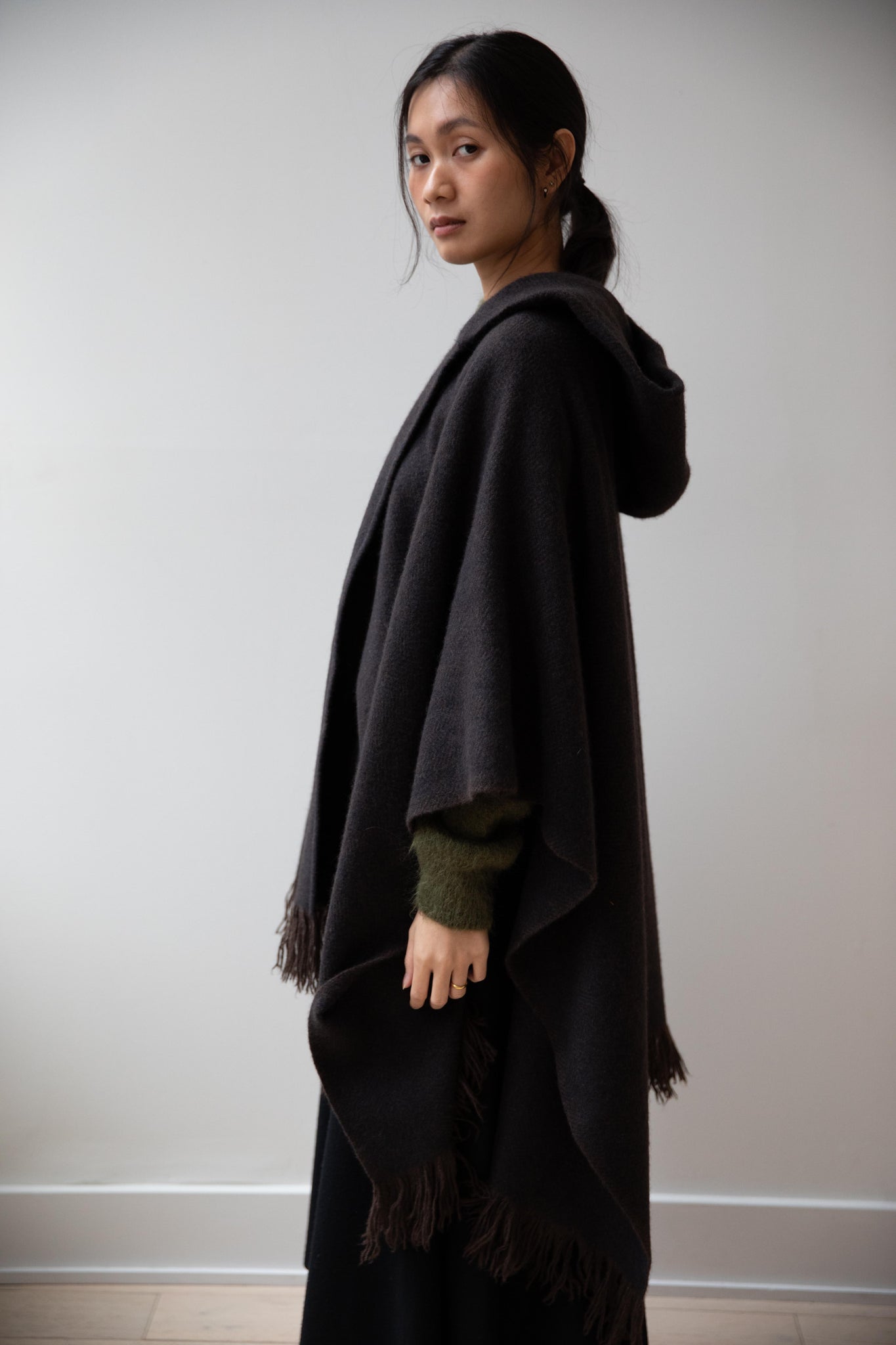 Norlha | Herringbone Hooded Cape in Navy & Natural Yak Brown