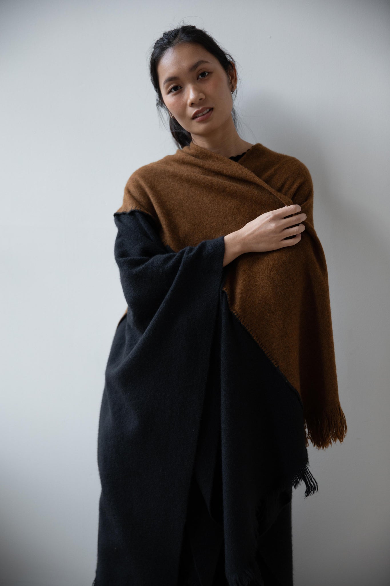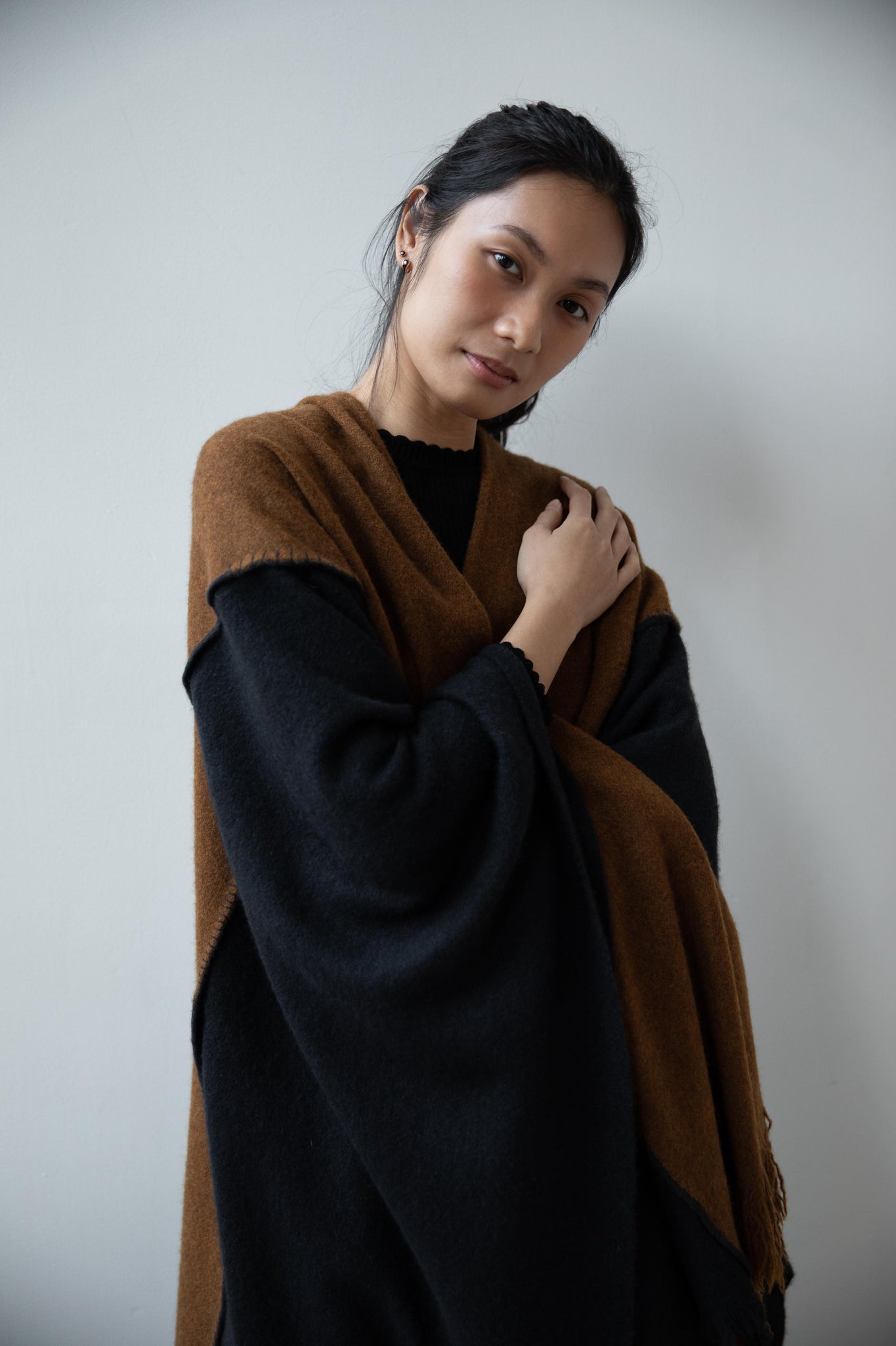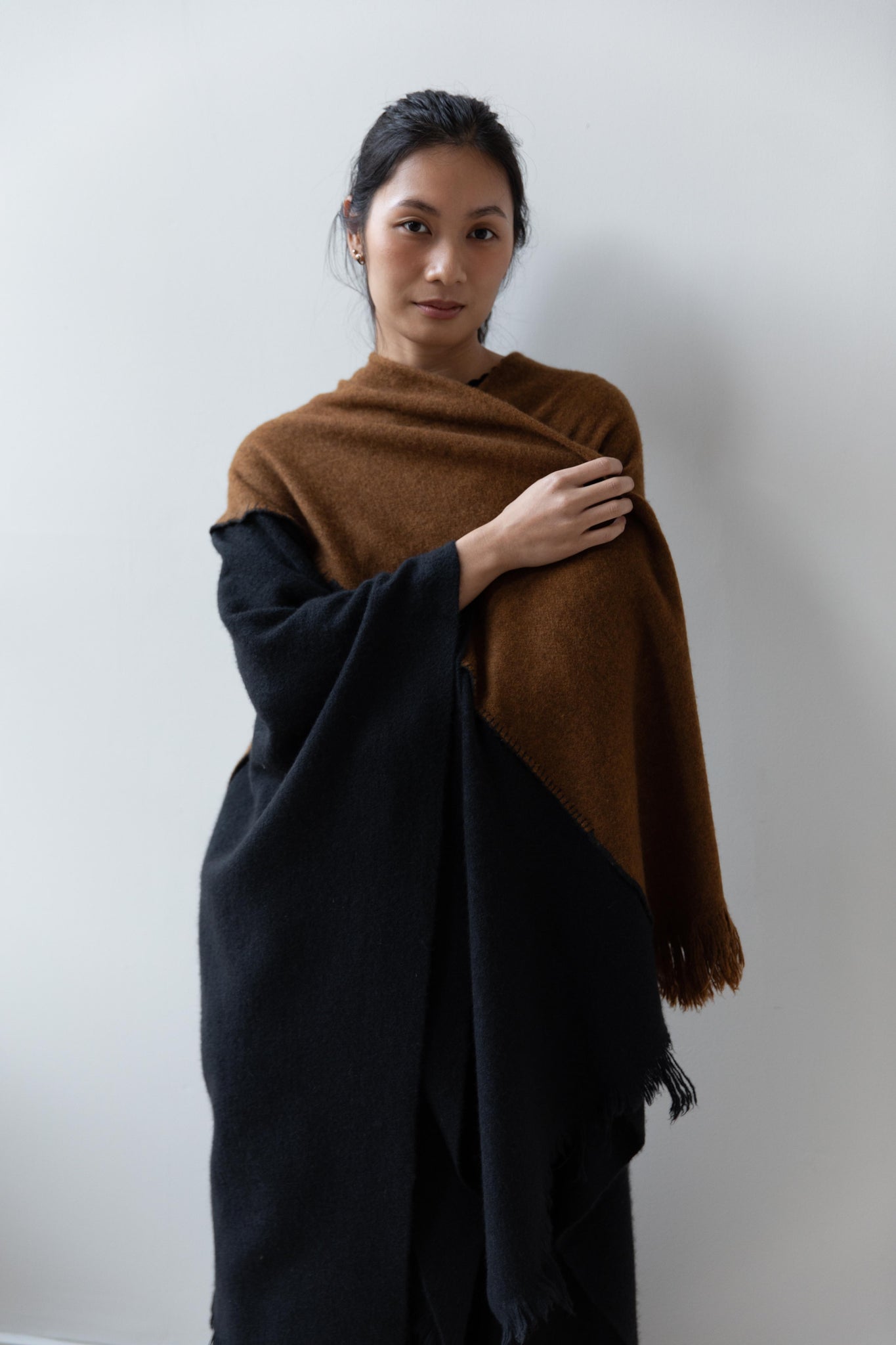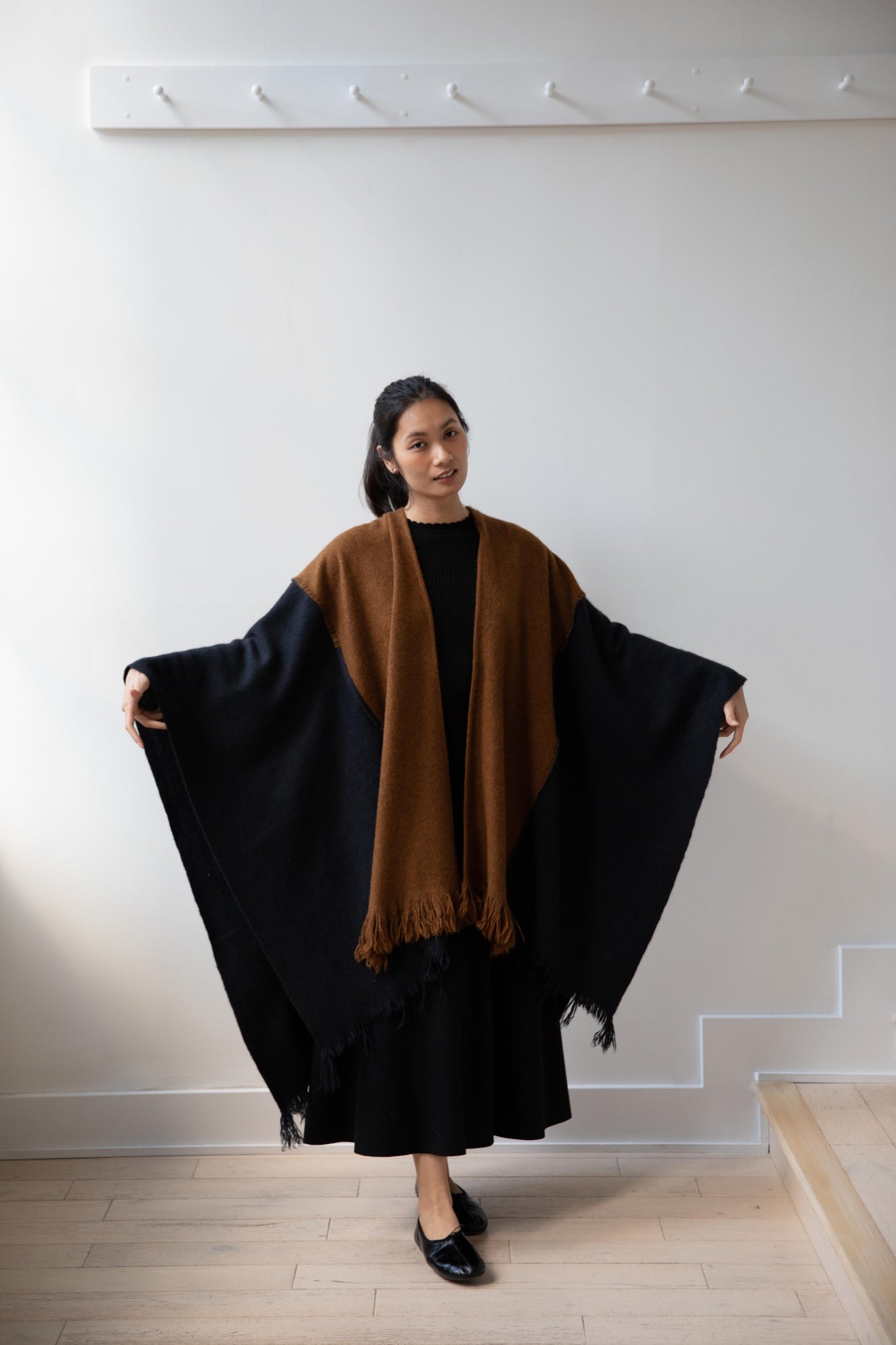 Made from yak wool, these new capes from Norlha might be the softest thing you have ever worn. Beautifully woven and with a lofted handle, they add extra warmth to any look. There are seemingly infinite ways to style and wear them as well. This one is made in a beautiful medium brown and deep midnight (almost black) yarn.