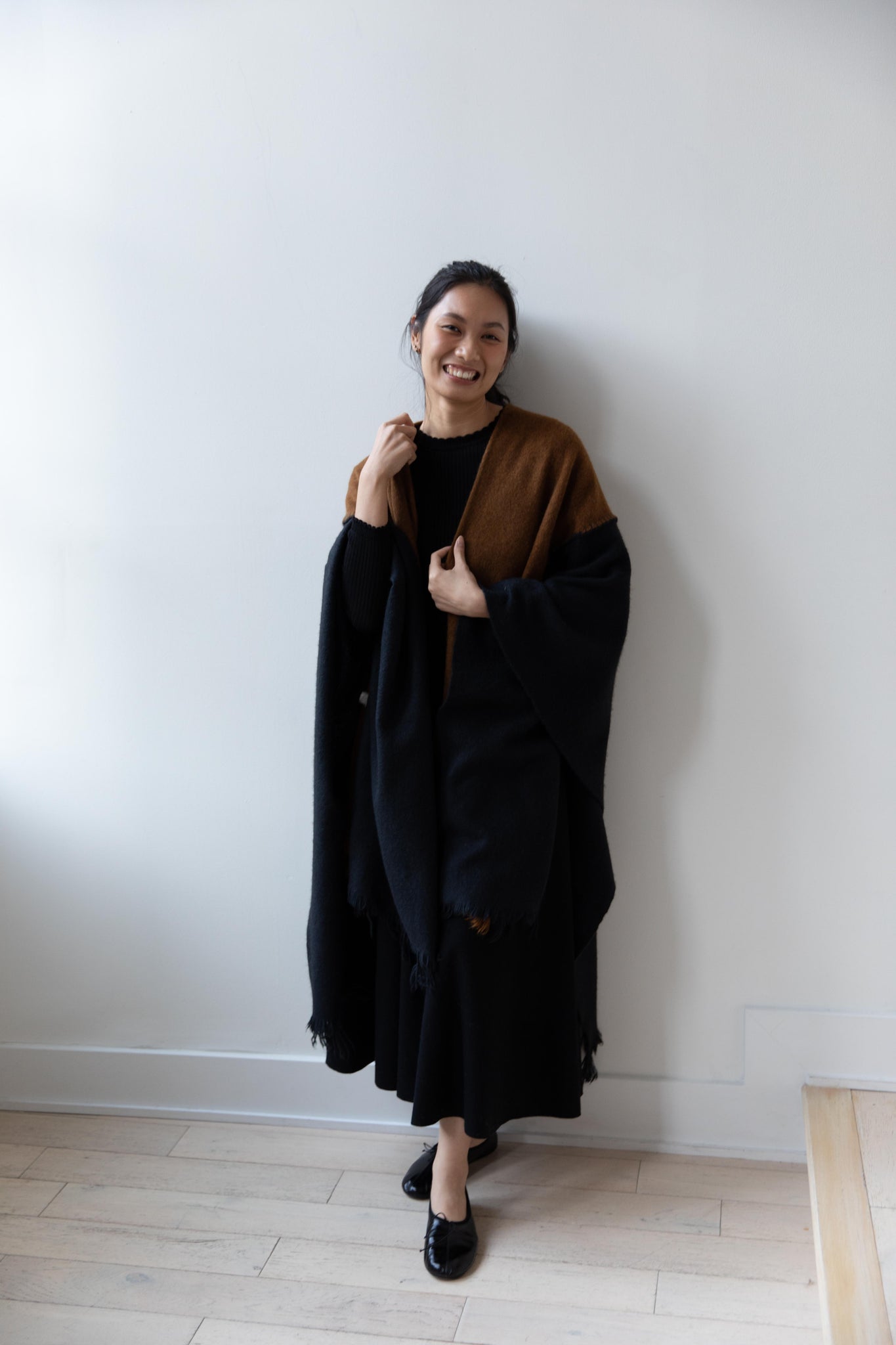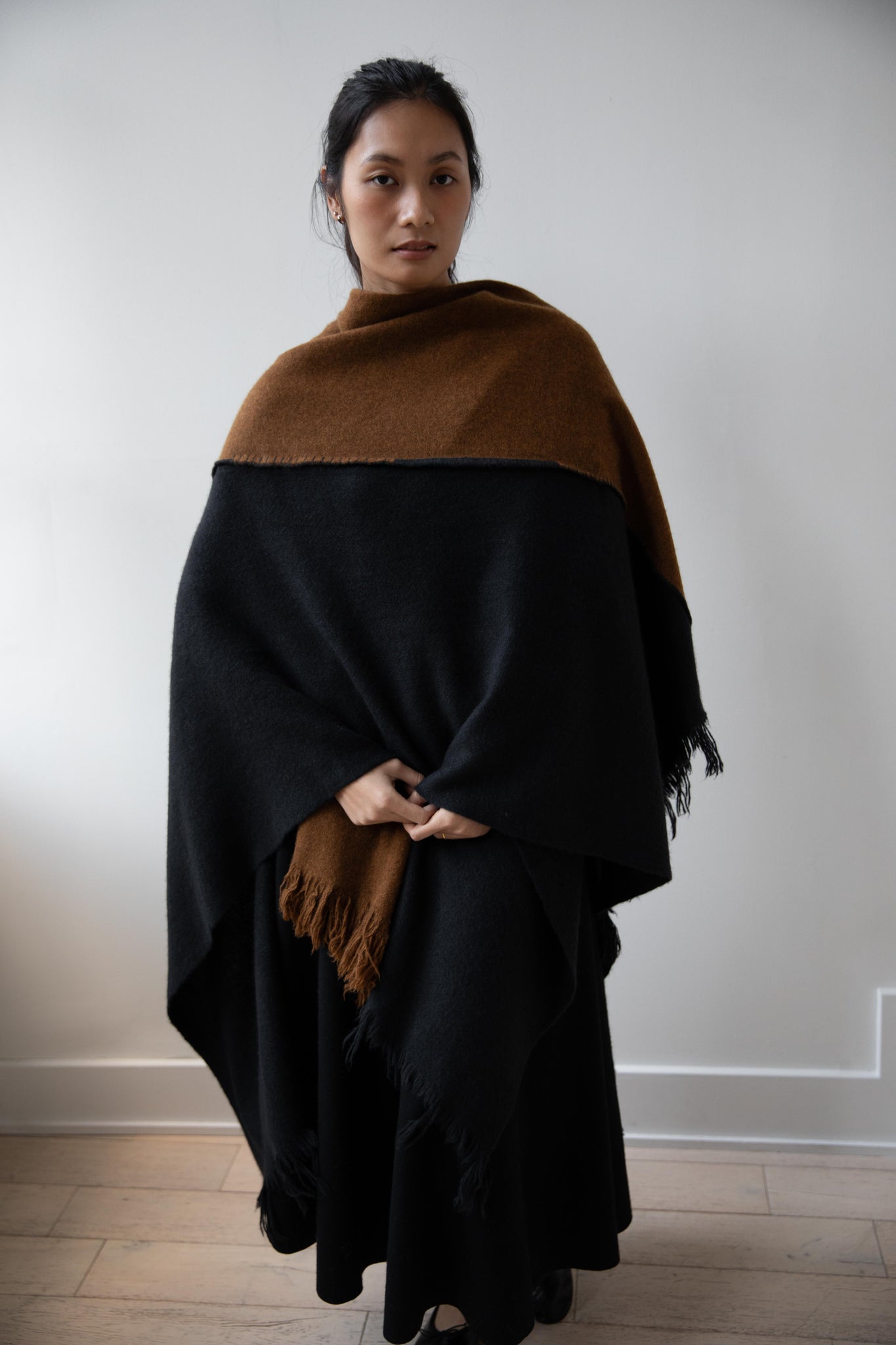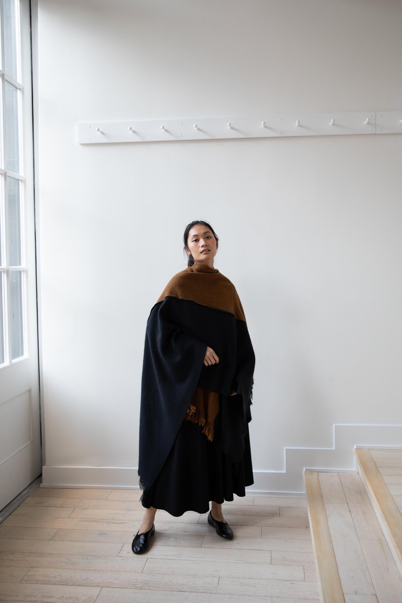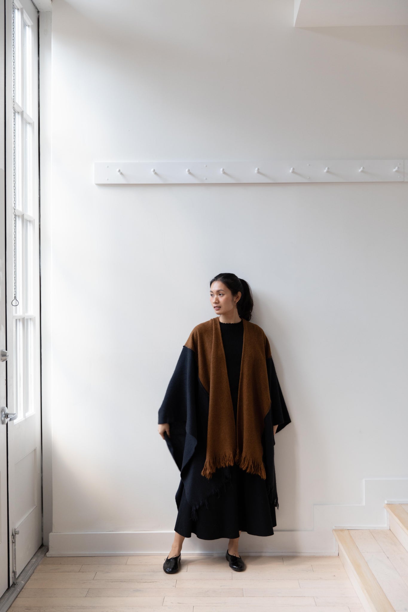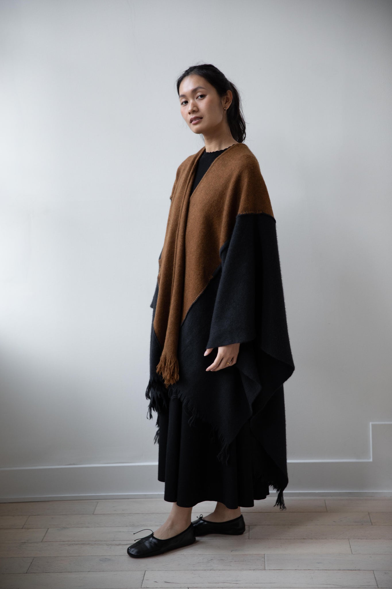 Made from yak wool, these new capes from Norlha might be the softest thing you have ever worn. Beautifully woven and with a lofted handle, they add extra warmth to any look. There are seemingly infinite ways to style and wear them as well. This one is made in a beautiful medium brown and deep midnight (almost black) yarn.