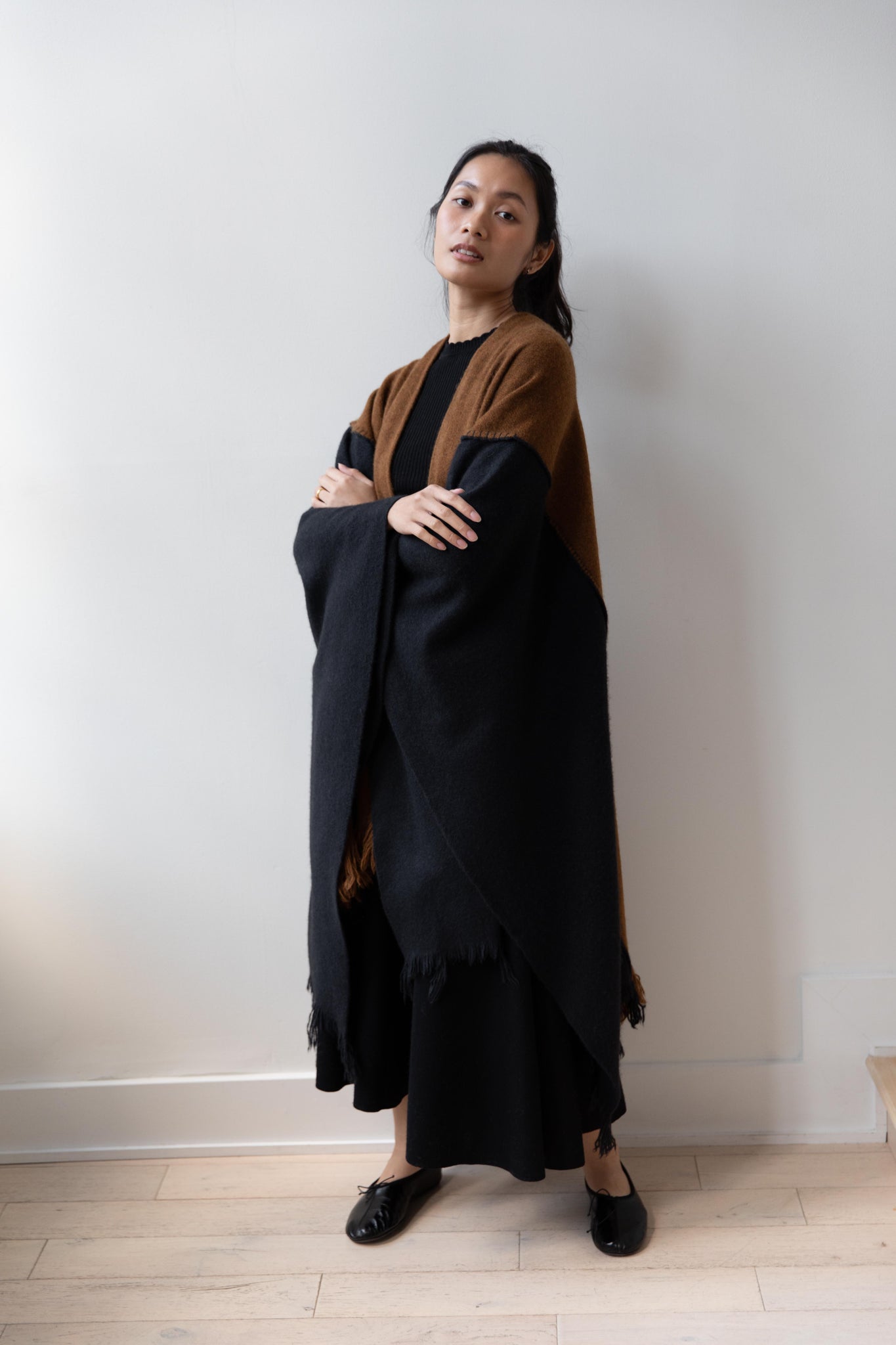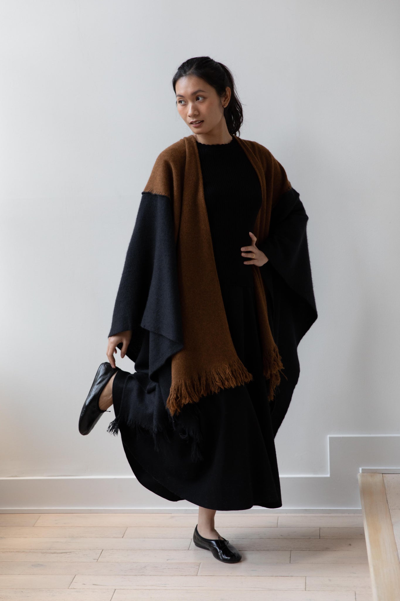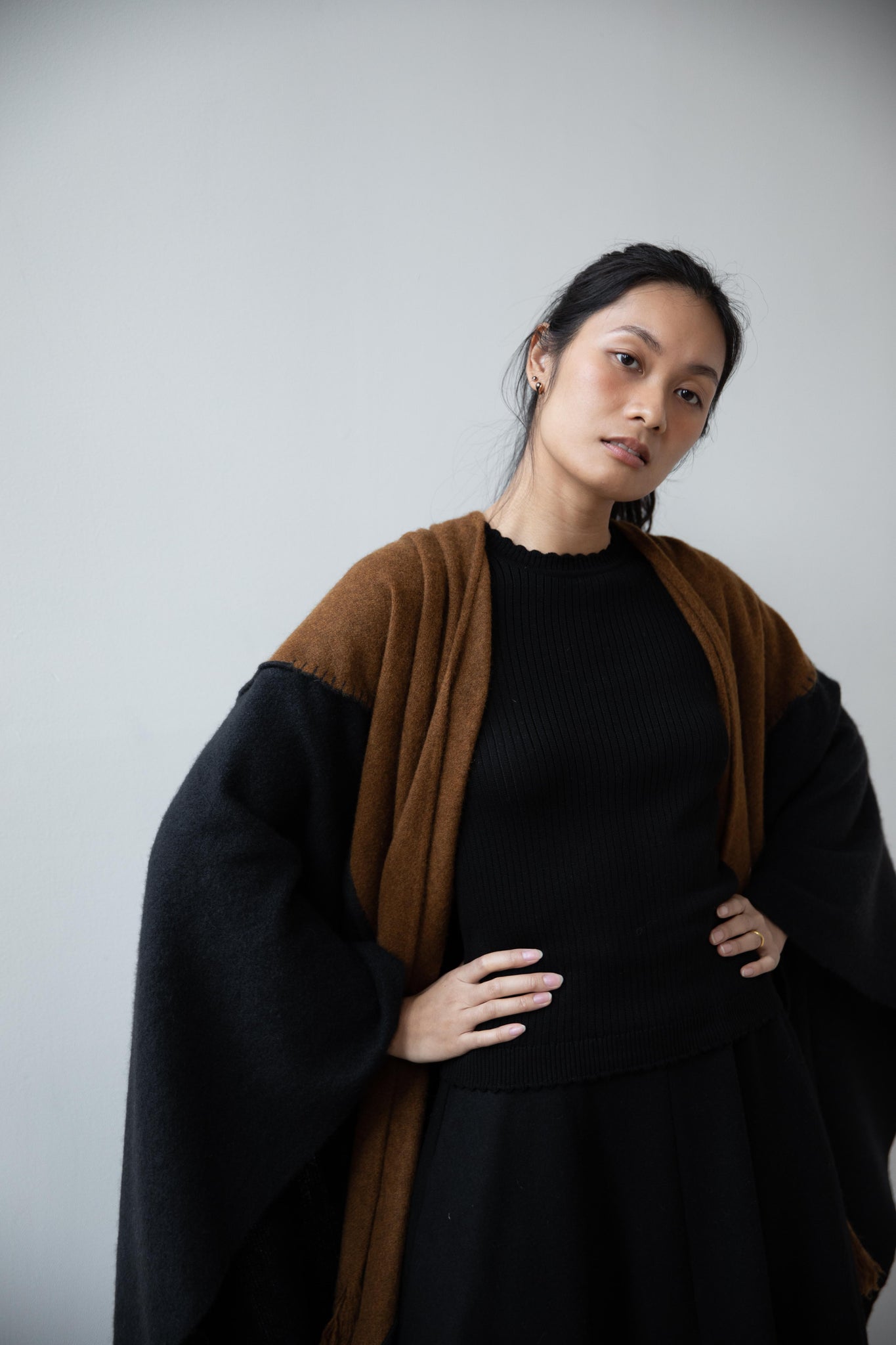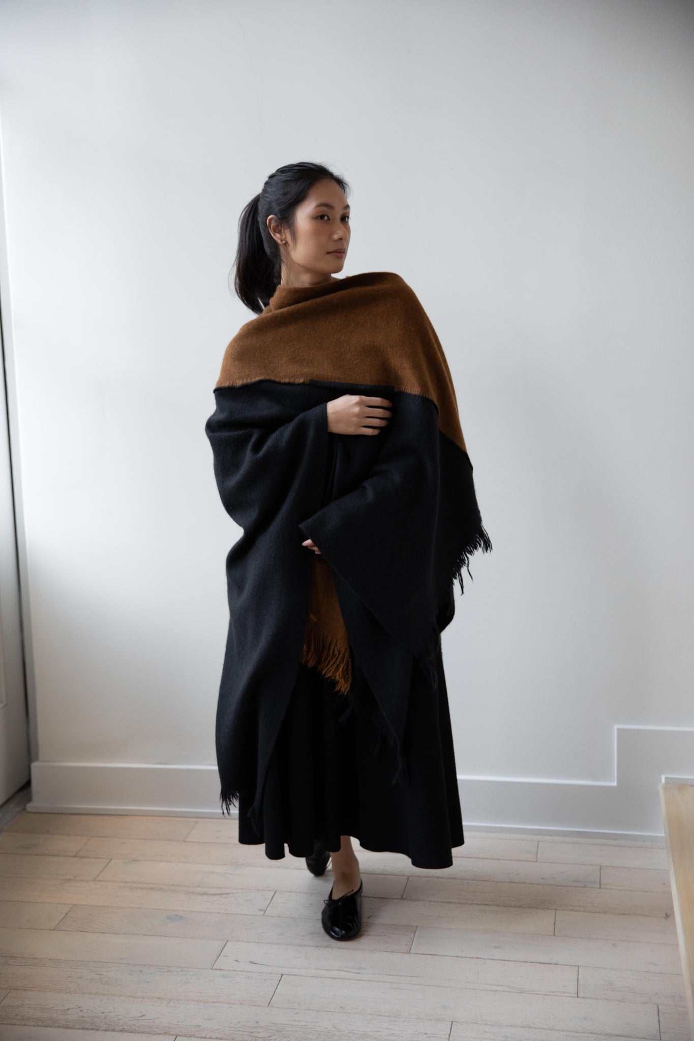 Made from yak wool, these new capes from Norlha might be the softest thing you have ever worn. Beautifully woven and with a lofted handle, they add extra warmth to any look. There are seemingly infinite ways to style and wear them as well. This one is made in a beautiful medium brown and deep midnight (almost black) yarn.