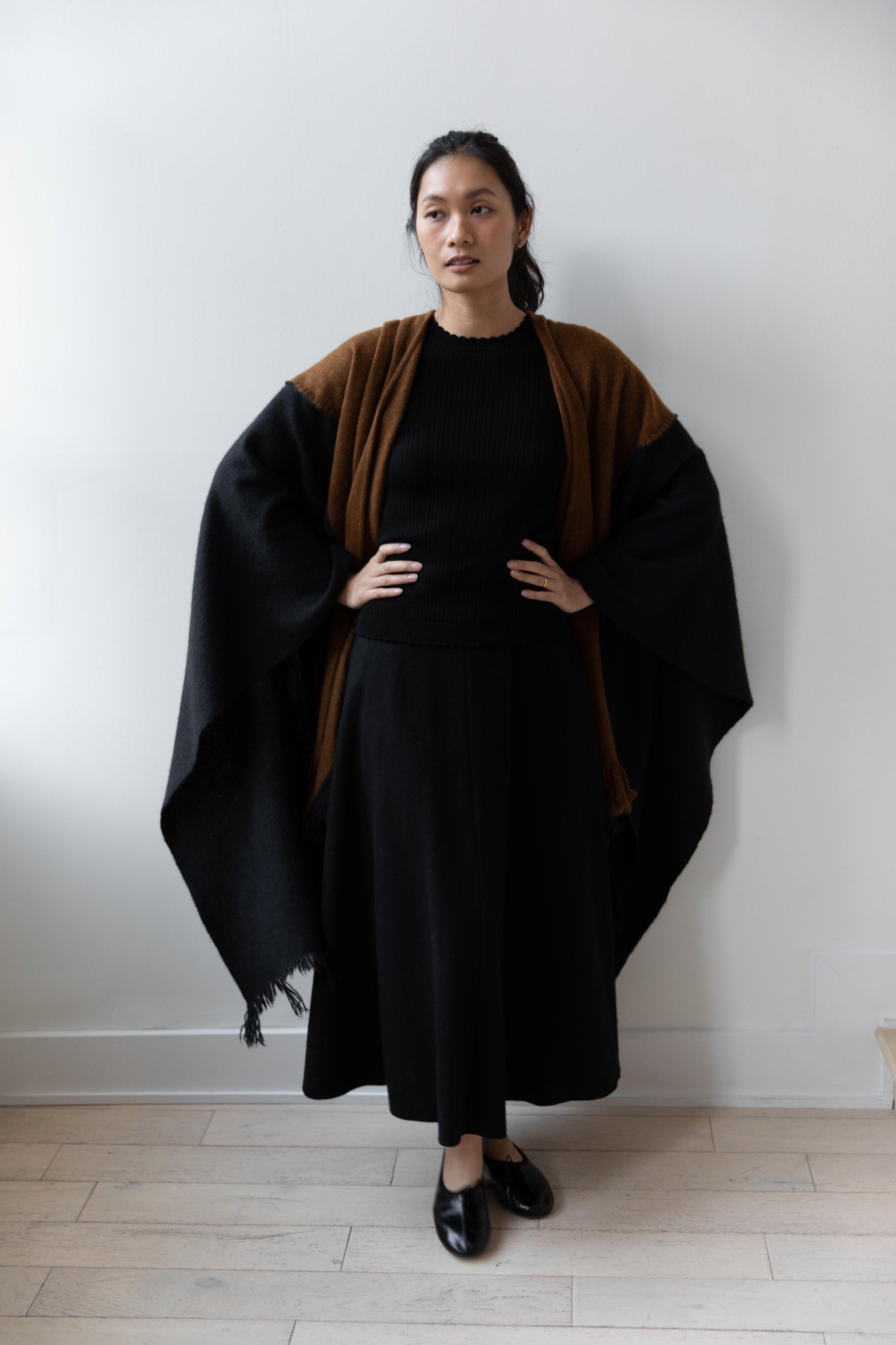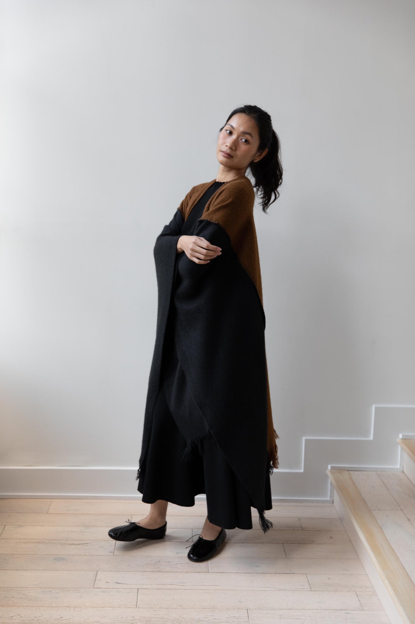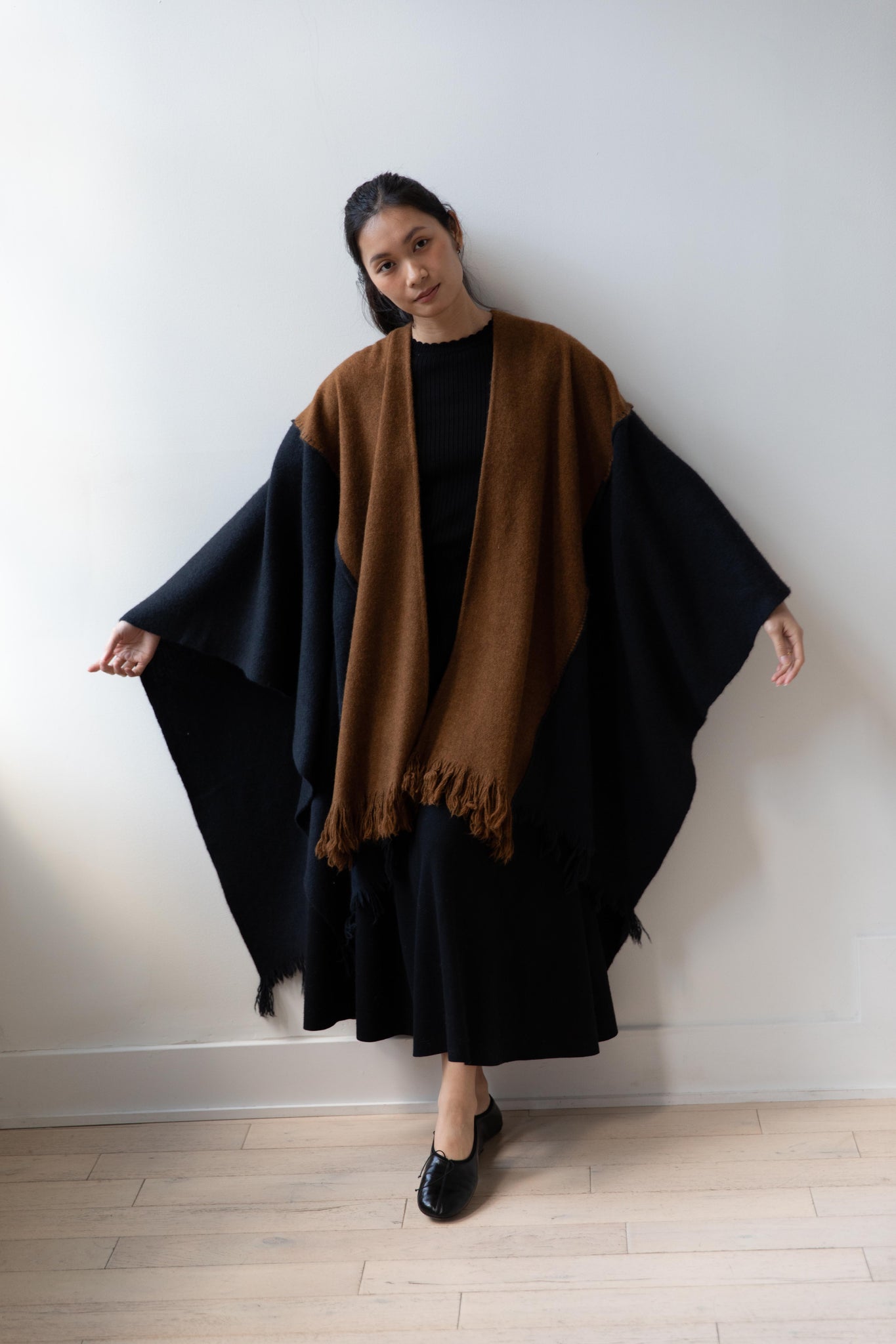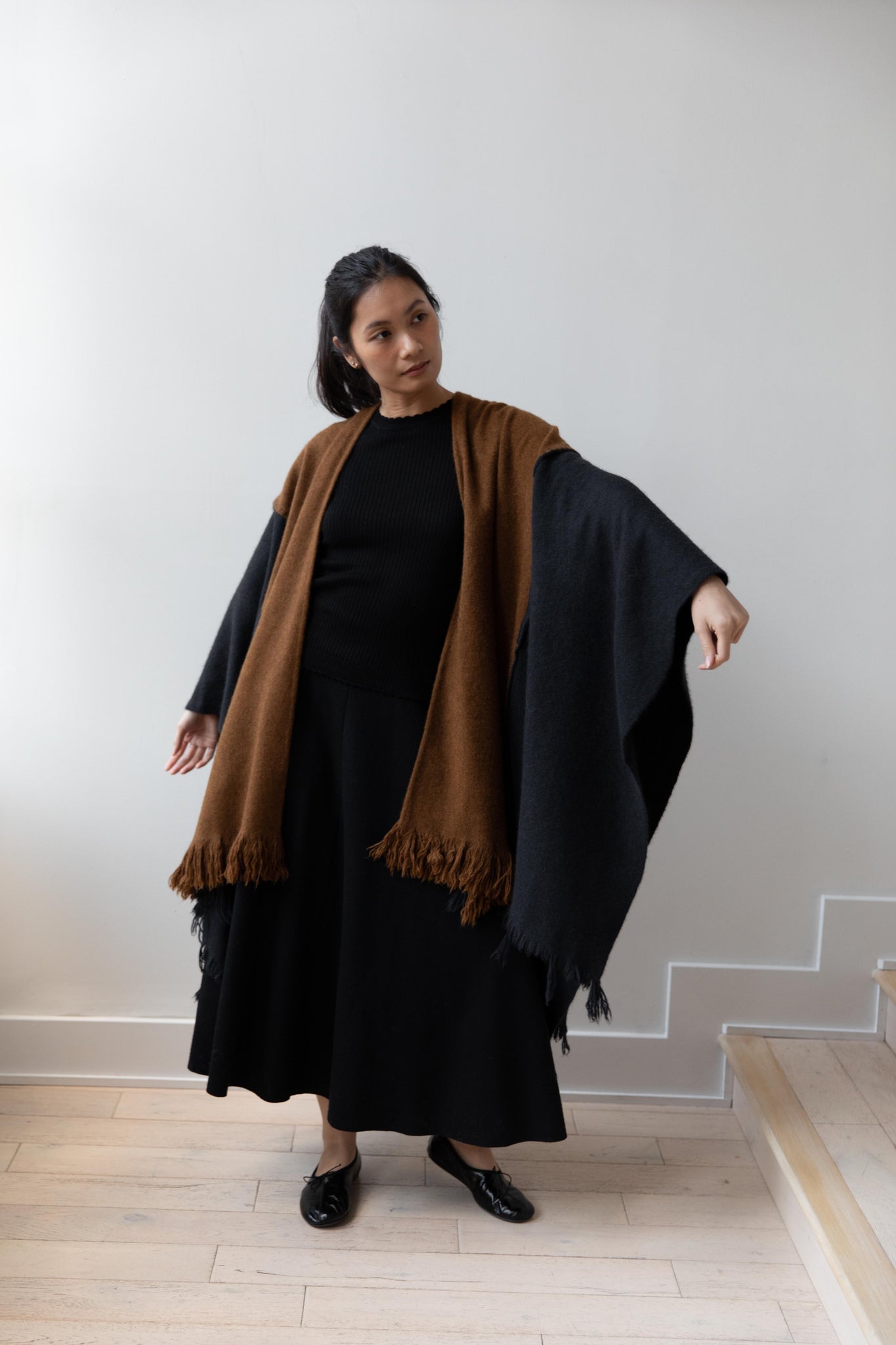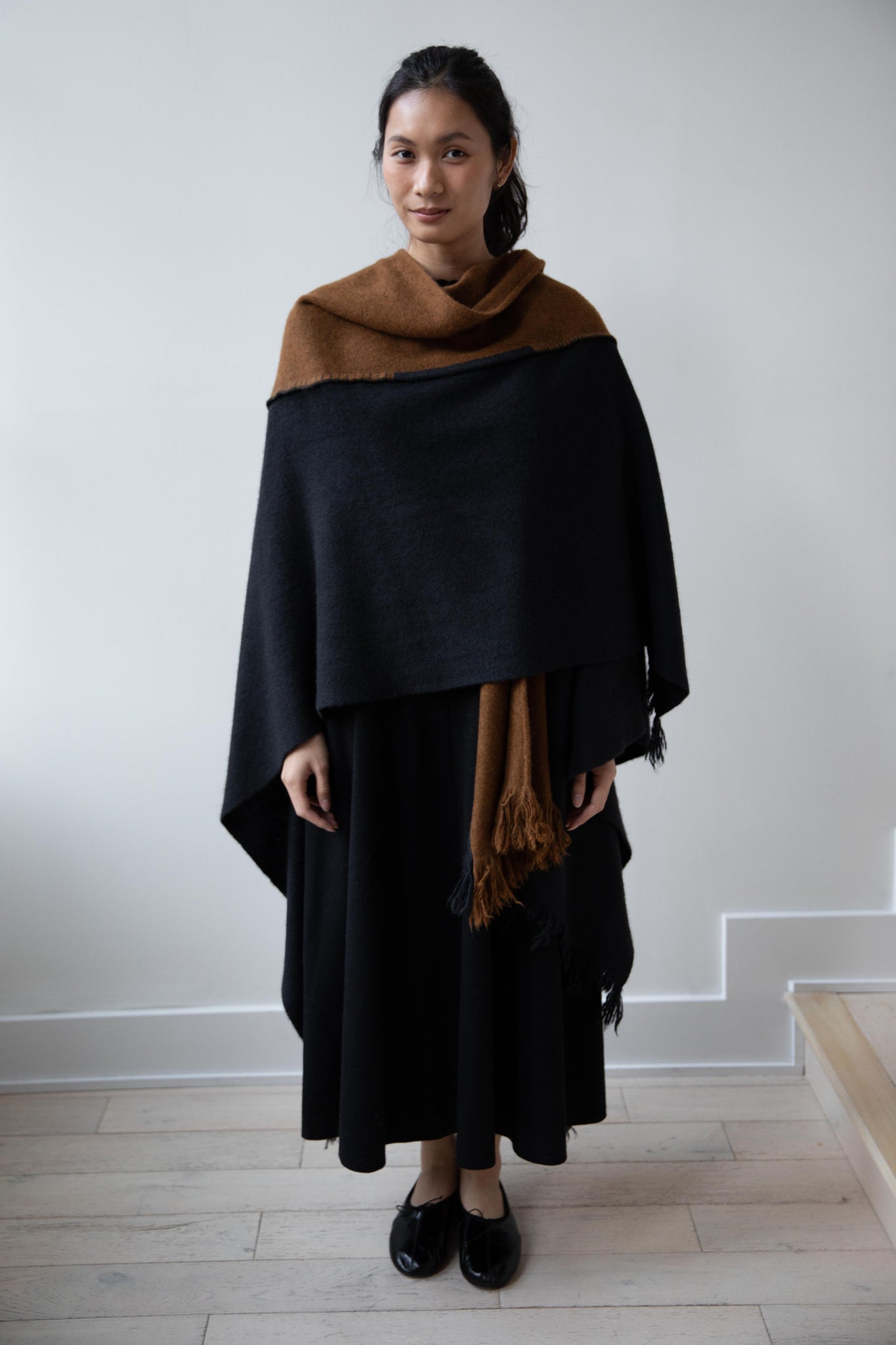 Made from yak wool, these new capes from Norlha might be the softest thing you have ever worn. Beautifully woven and with a lofted handle, they add extra warmth to any look. There are seemingly infinite ways to style and wear them as well. This one is made in a beautiful medium brown and deep midnight (almost black) yarn.