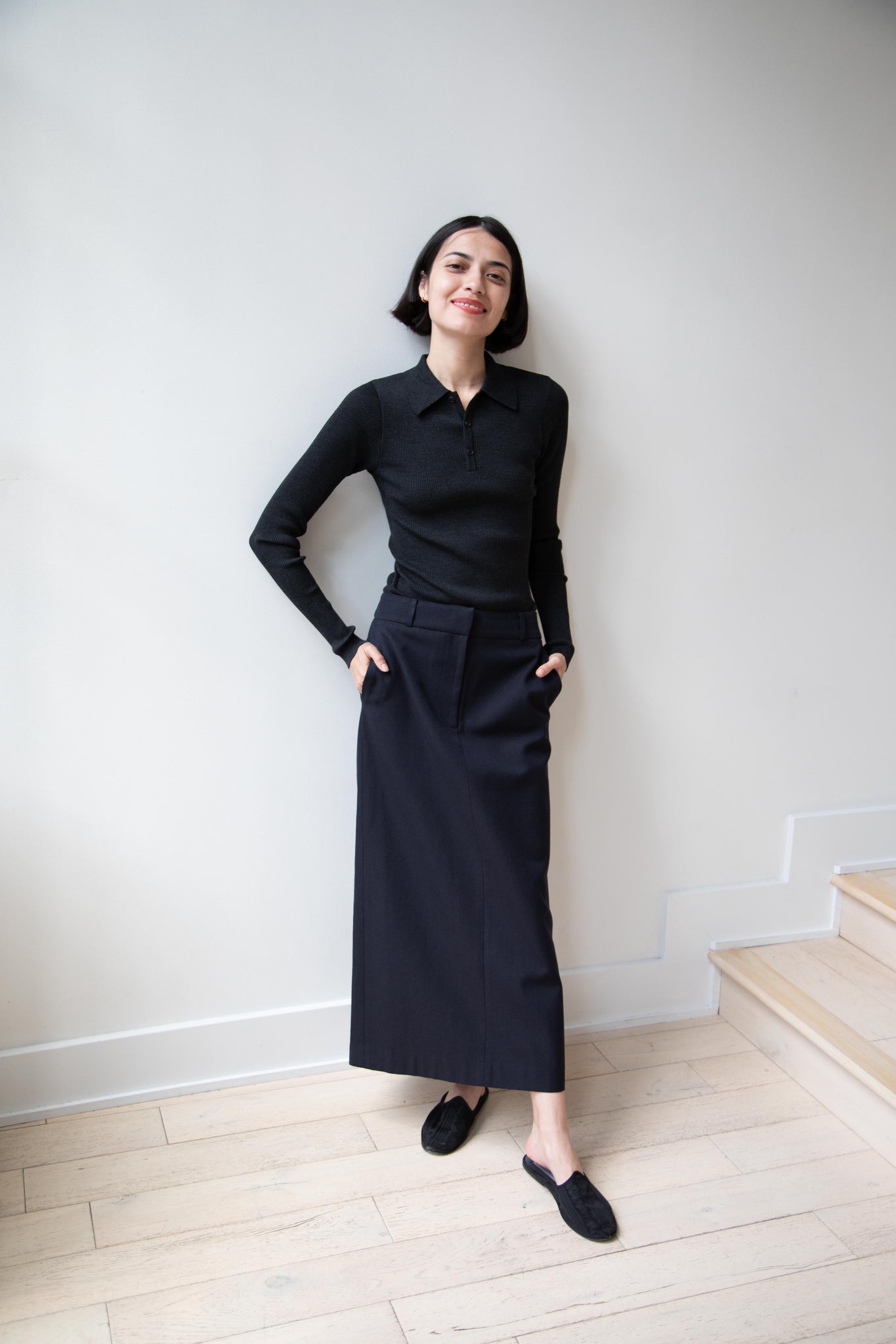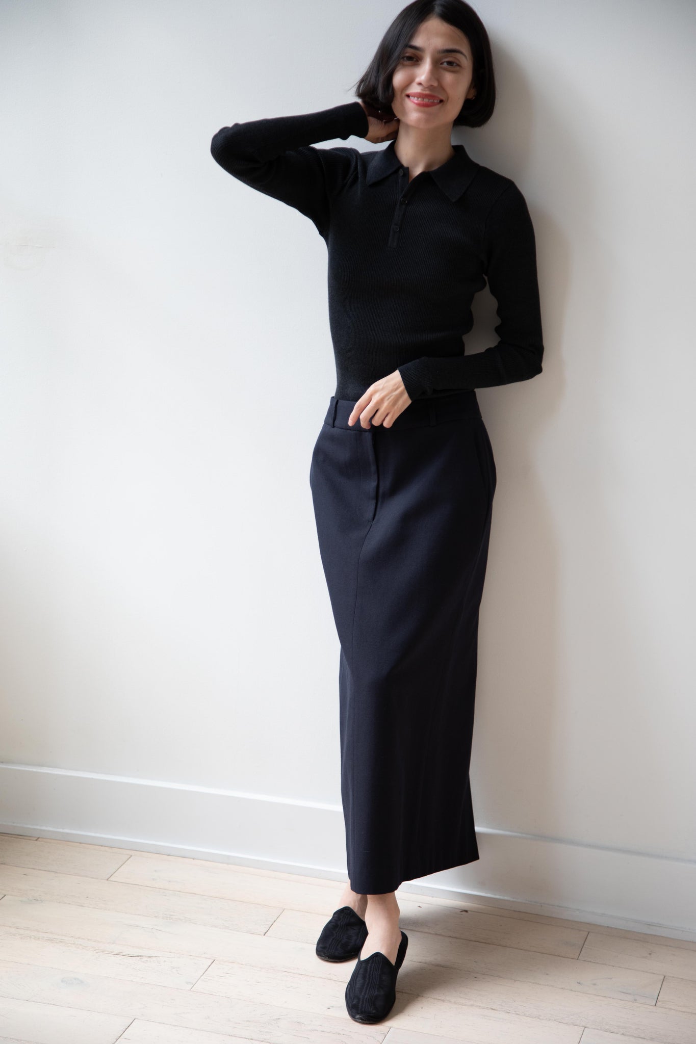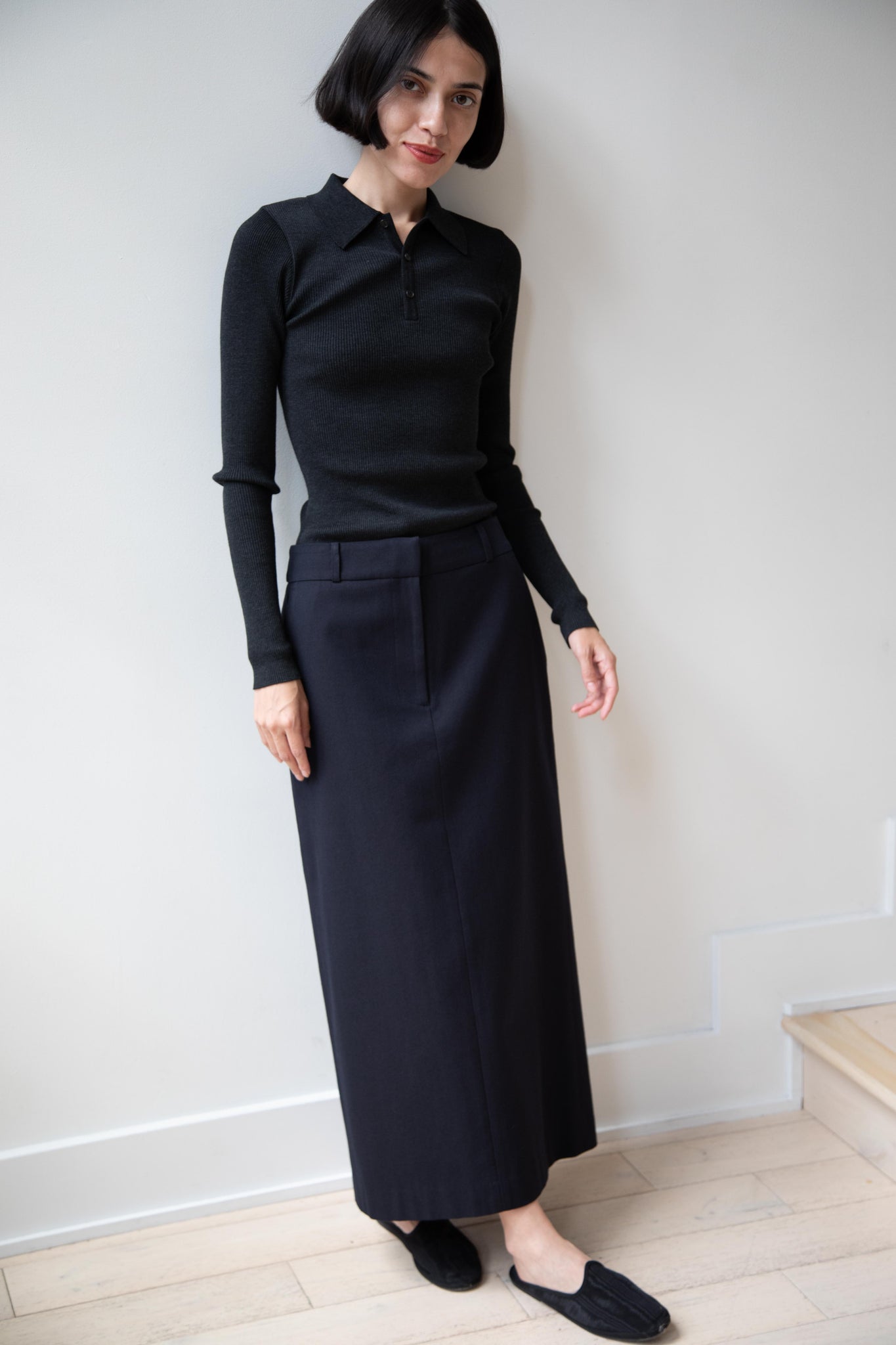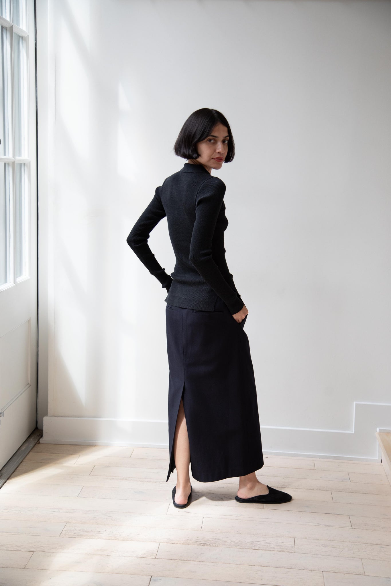 This slim fit pencil skirt is an everyday piece you will turn to time and again.  Made from a twill navy wool, it's also fully lined.  There are side pockets and belt loops, the addition of a belt makes such a nice touch with this skirt.