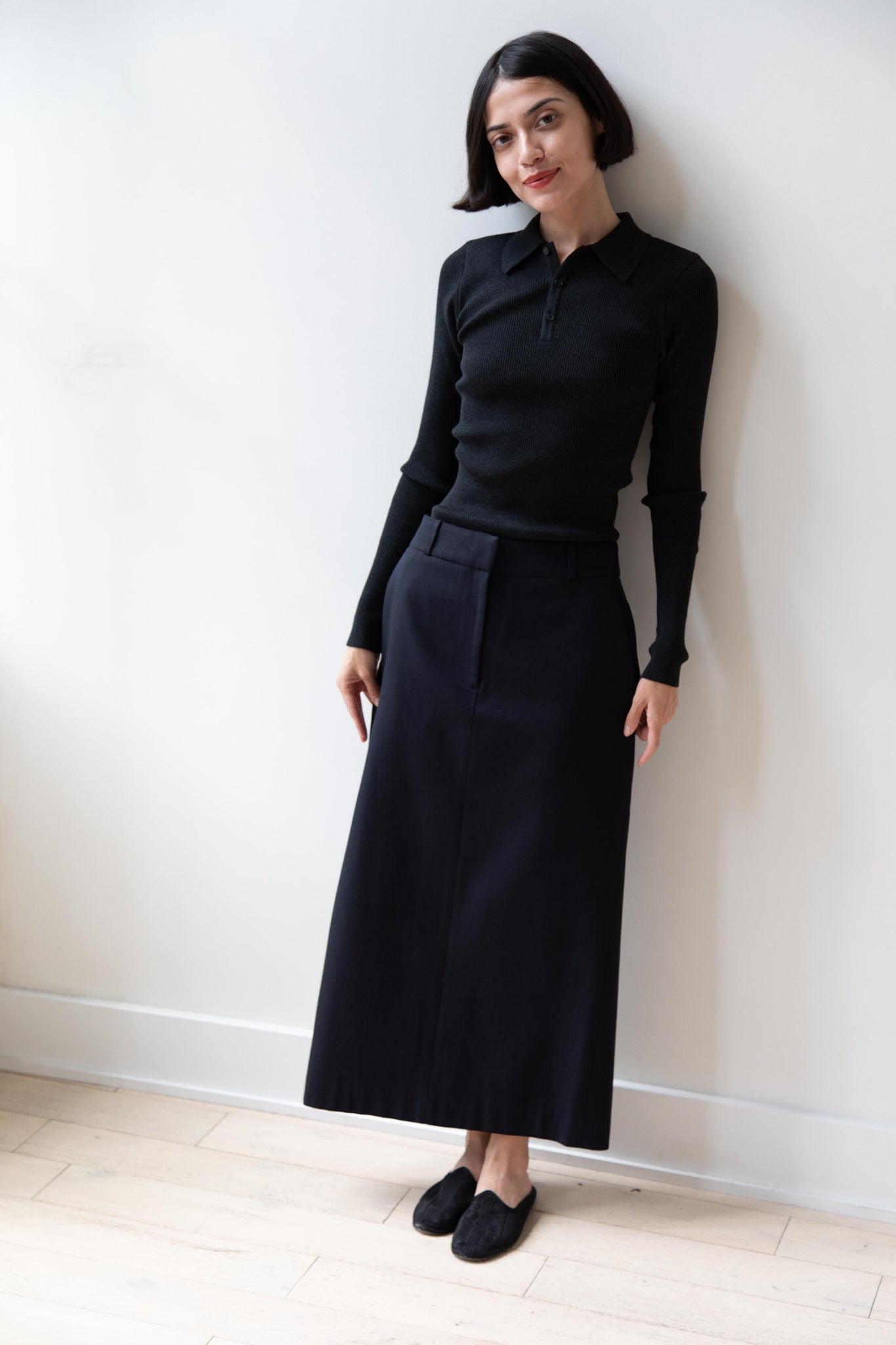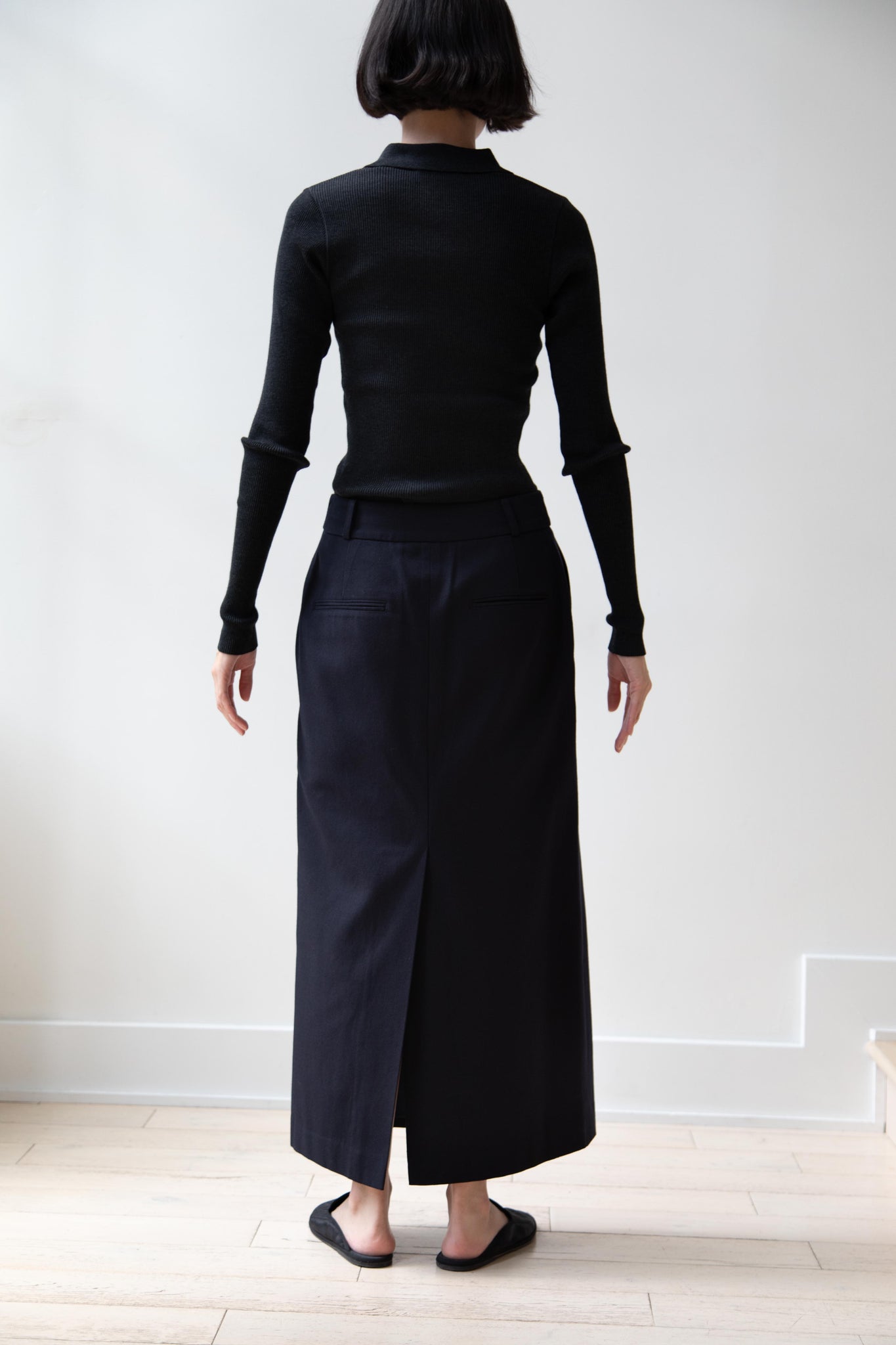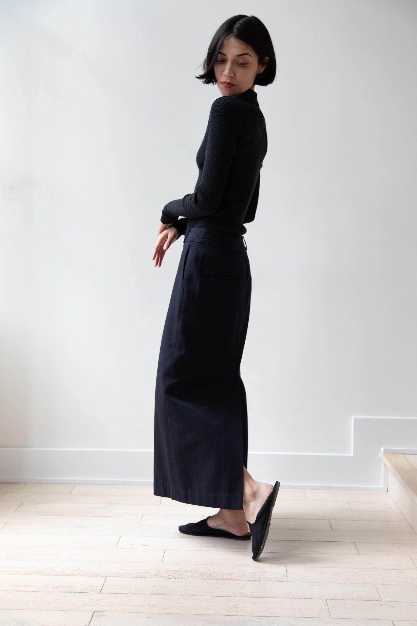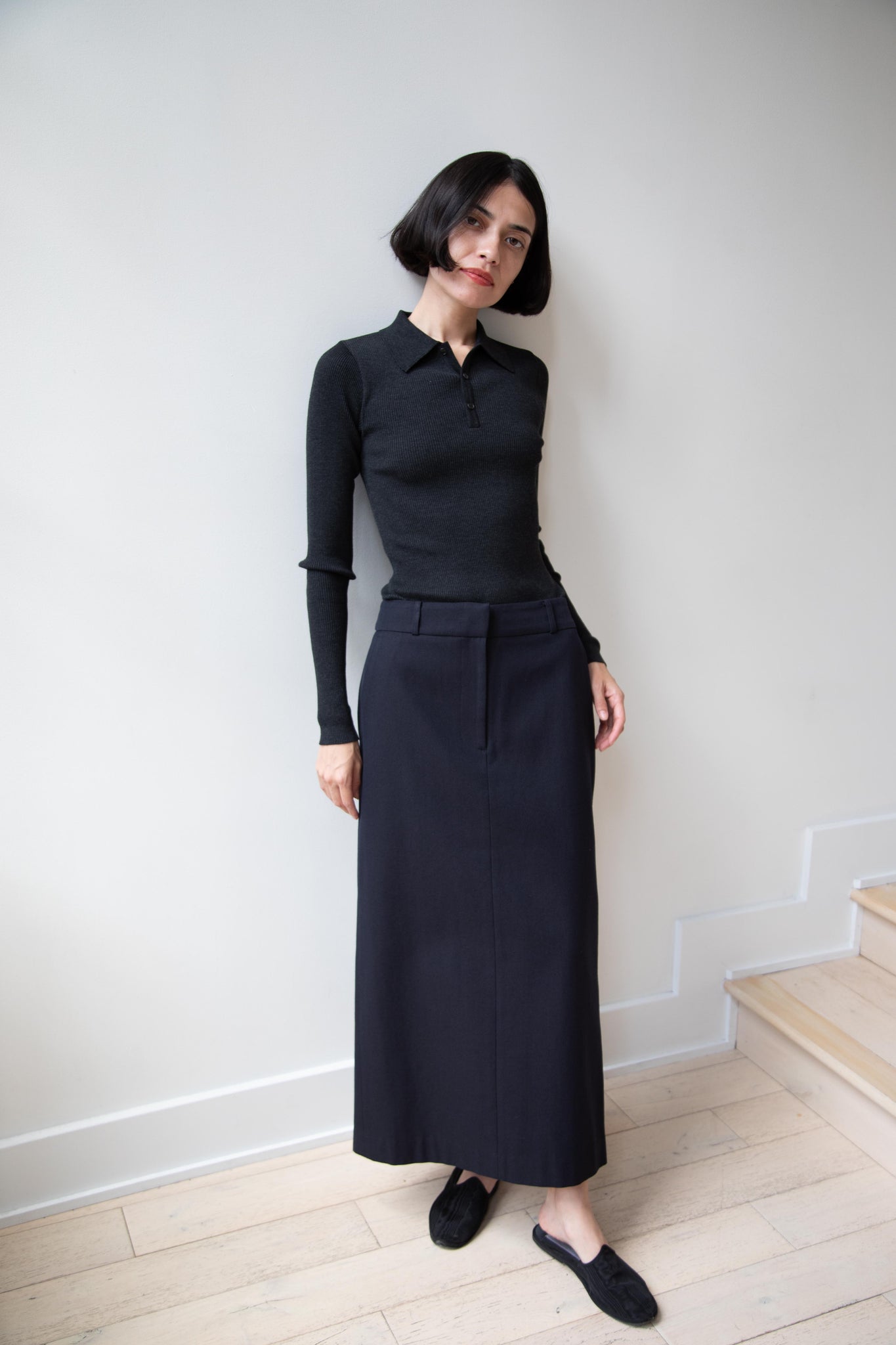 This slim fit pencil skirt is an everyday piece you will turn to time and again.  Made from a twill navy wool, it's also fully lined.  There are side pockets and belt loops, the addition of a belt makes such a nice touch with this skirt.