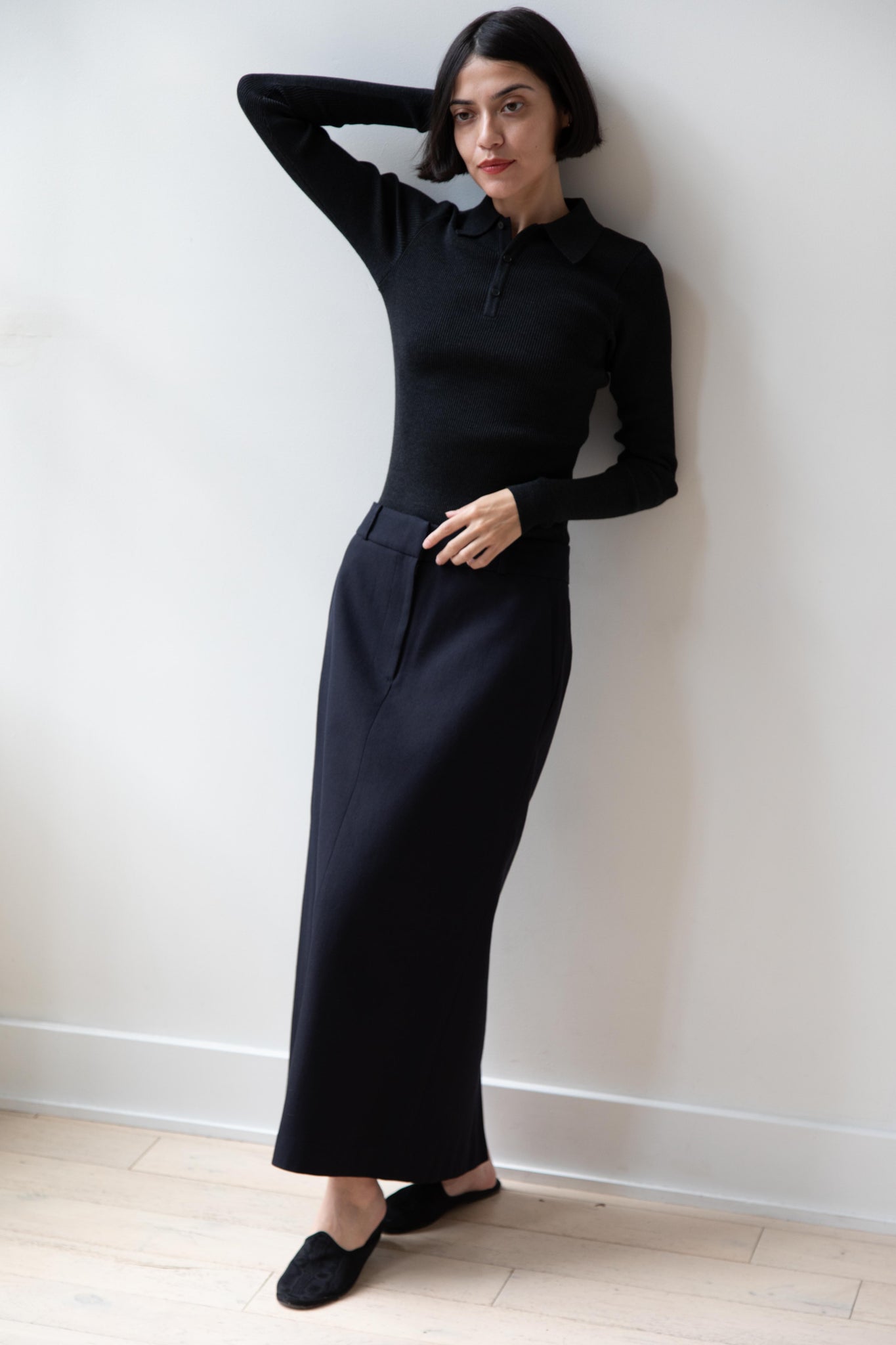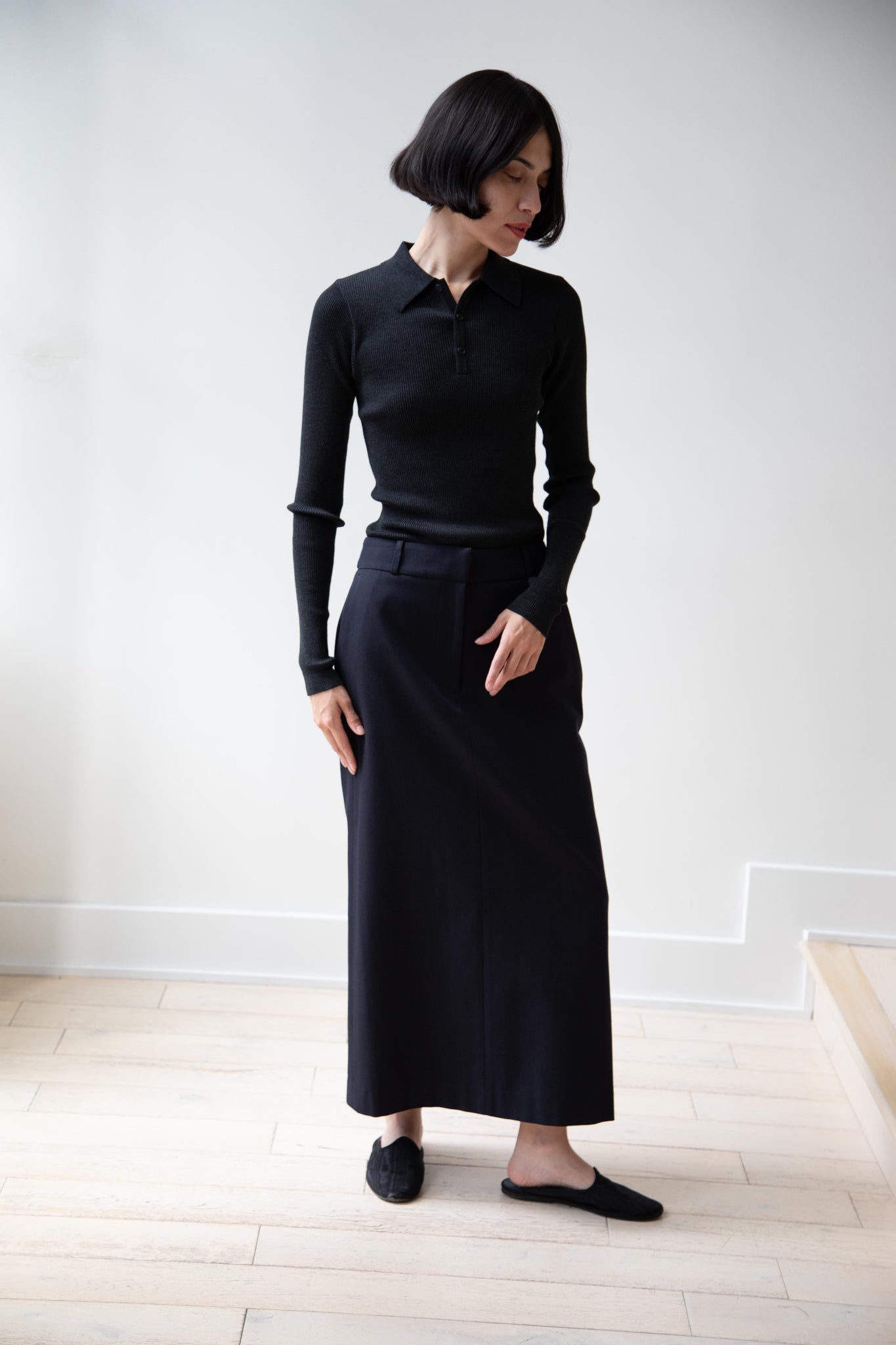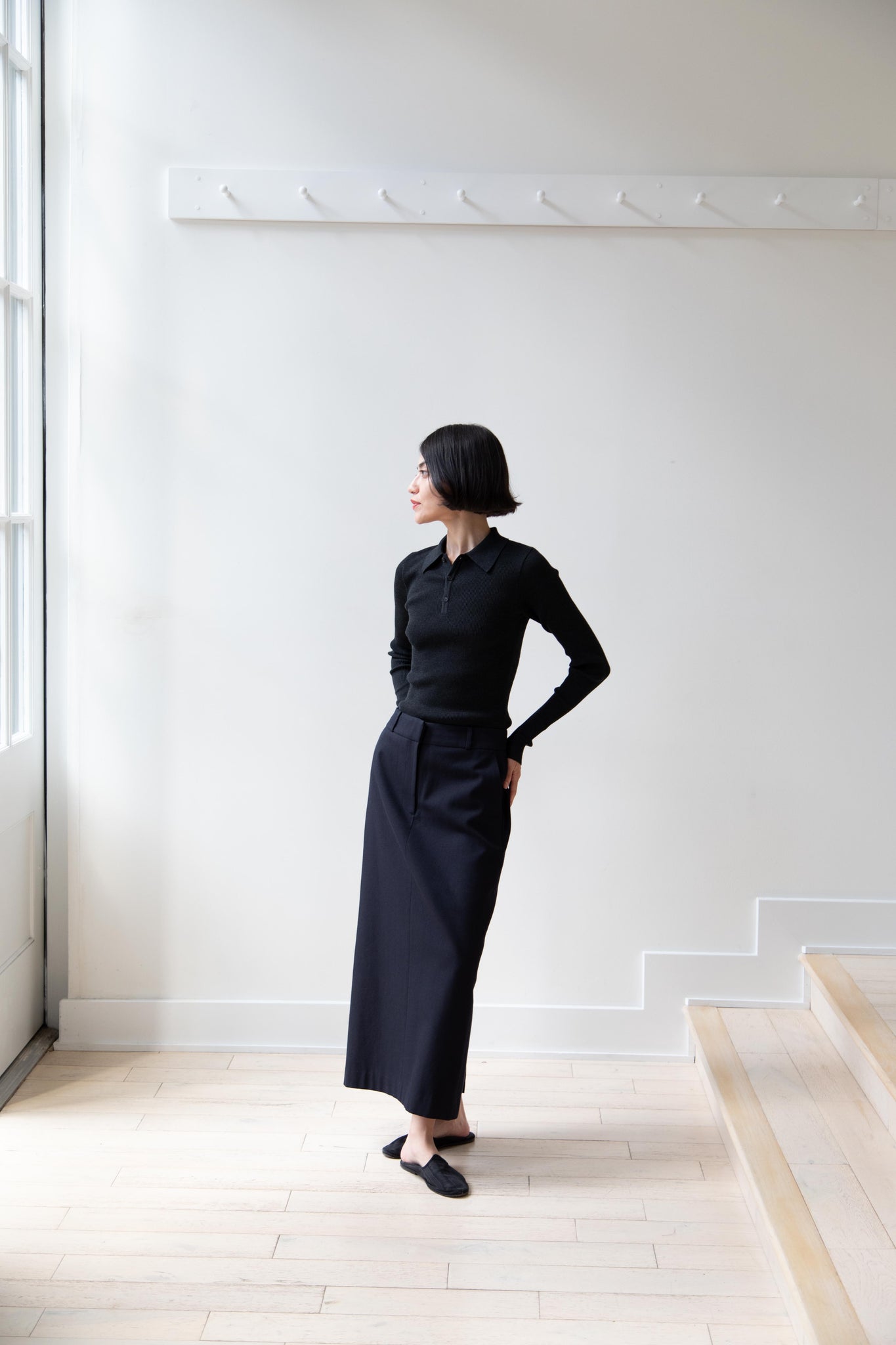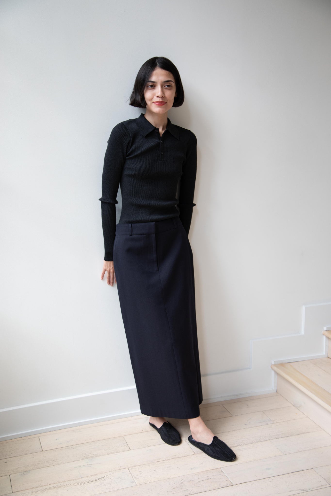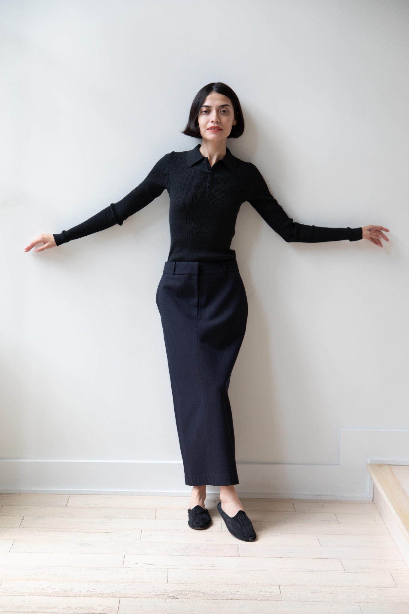 This slim fit pencil skirt is an everyday piece you will turn to time and again.  Made from a twill navy wool, it's also fully lined.  There are side pockets and belt loops, the addition of a belt makes such a nice touch with this skirt.