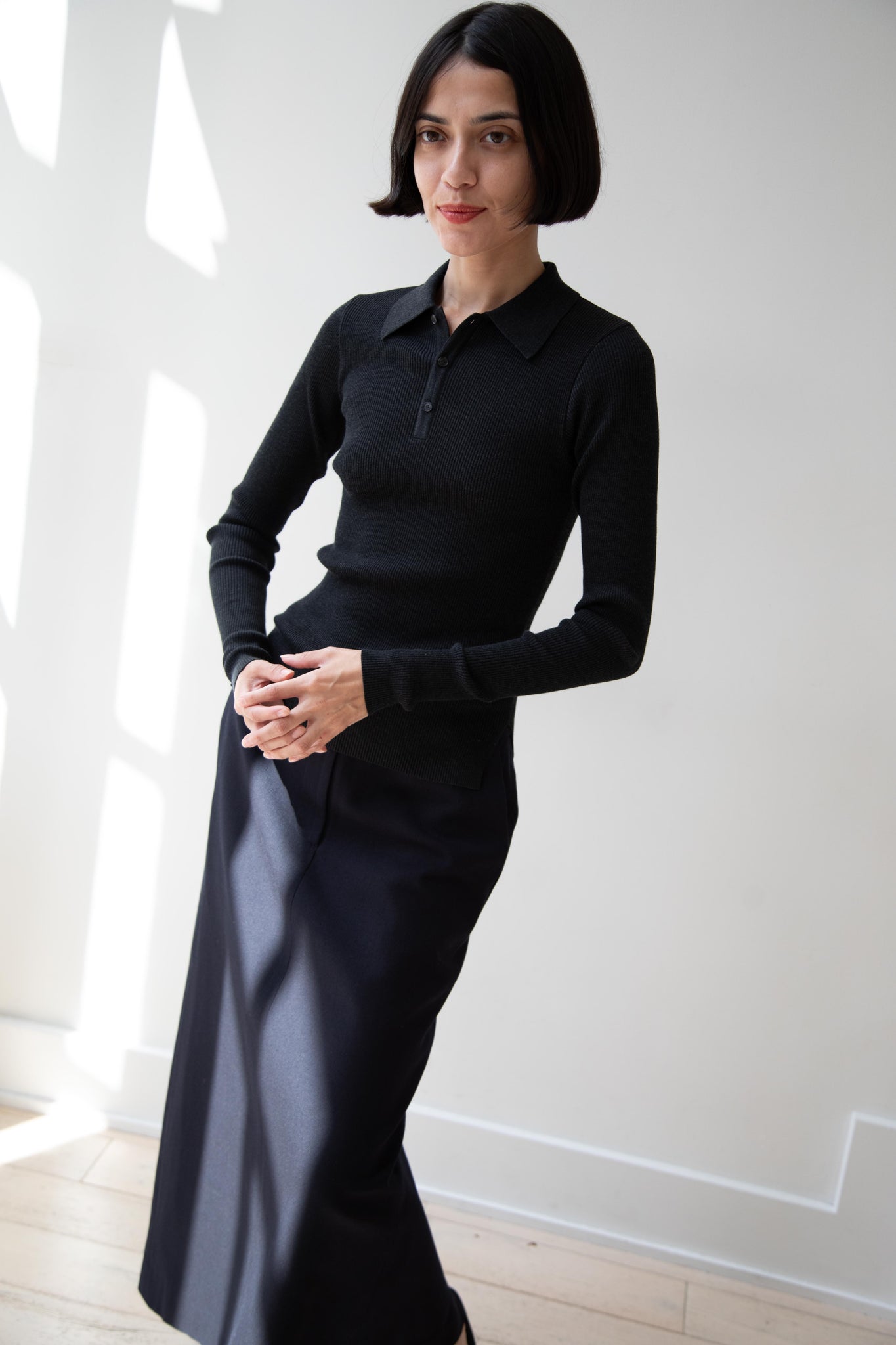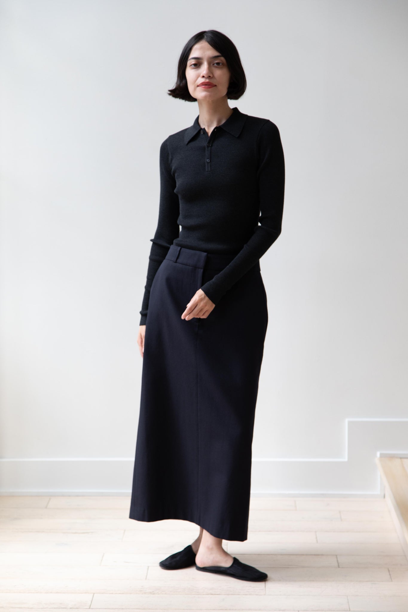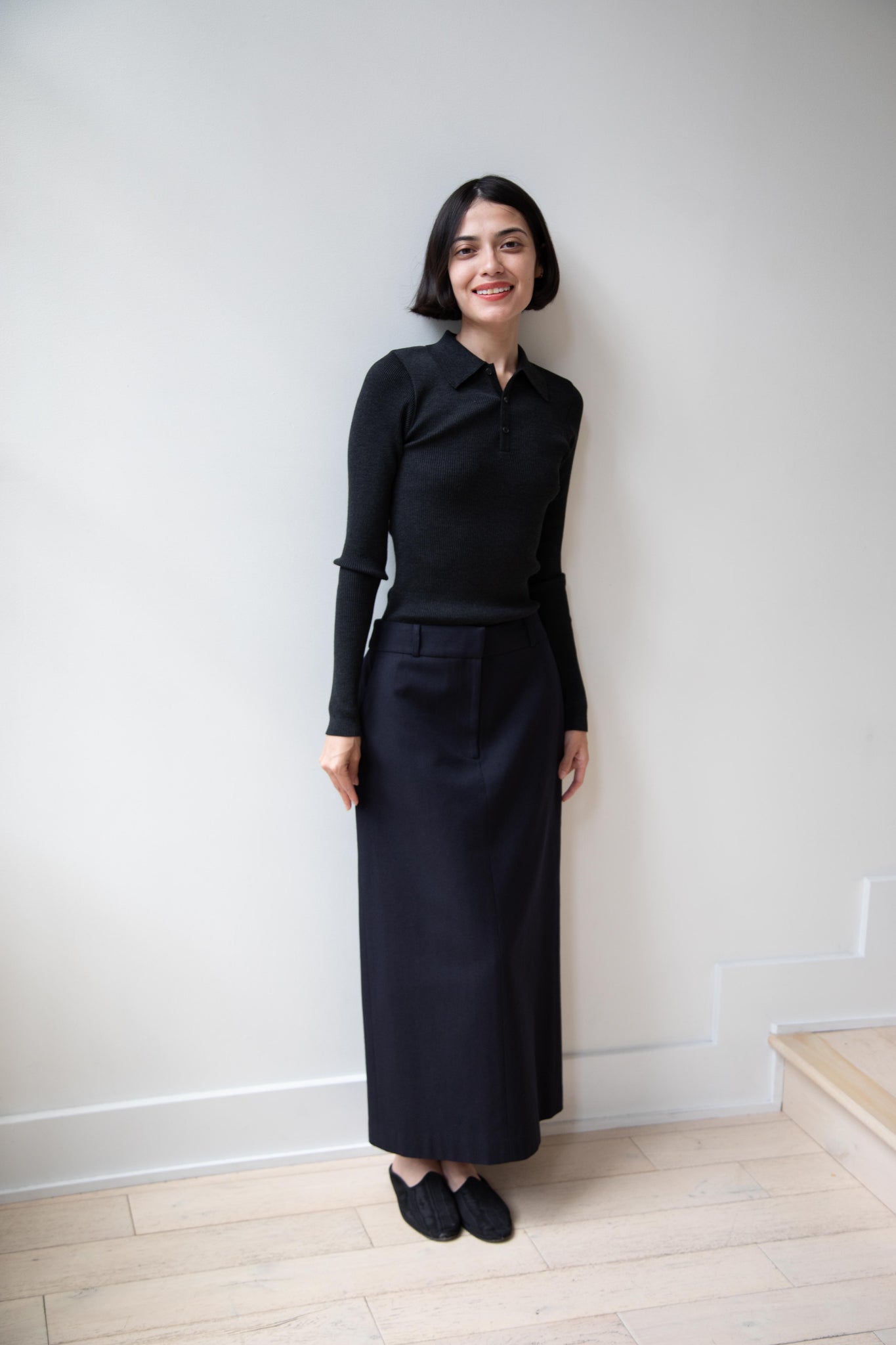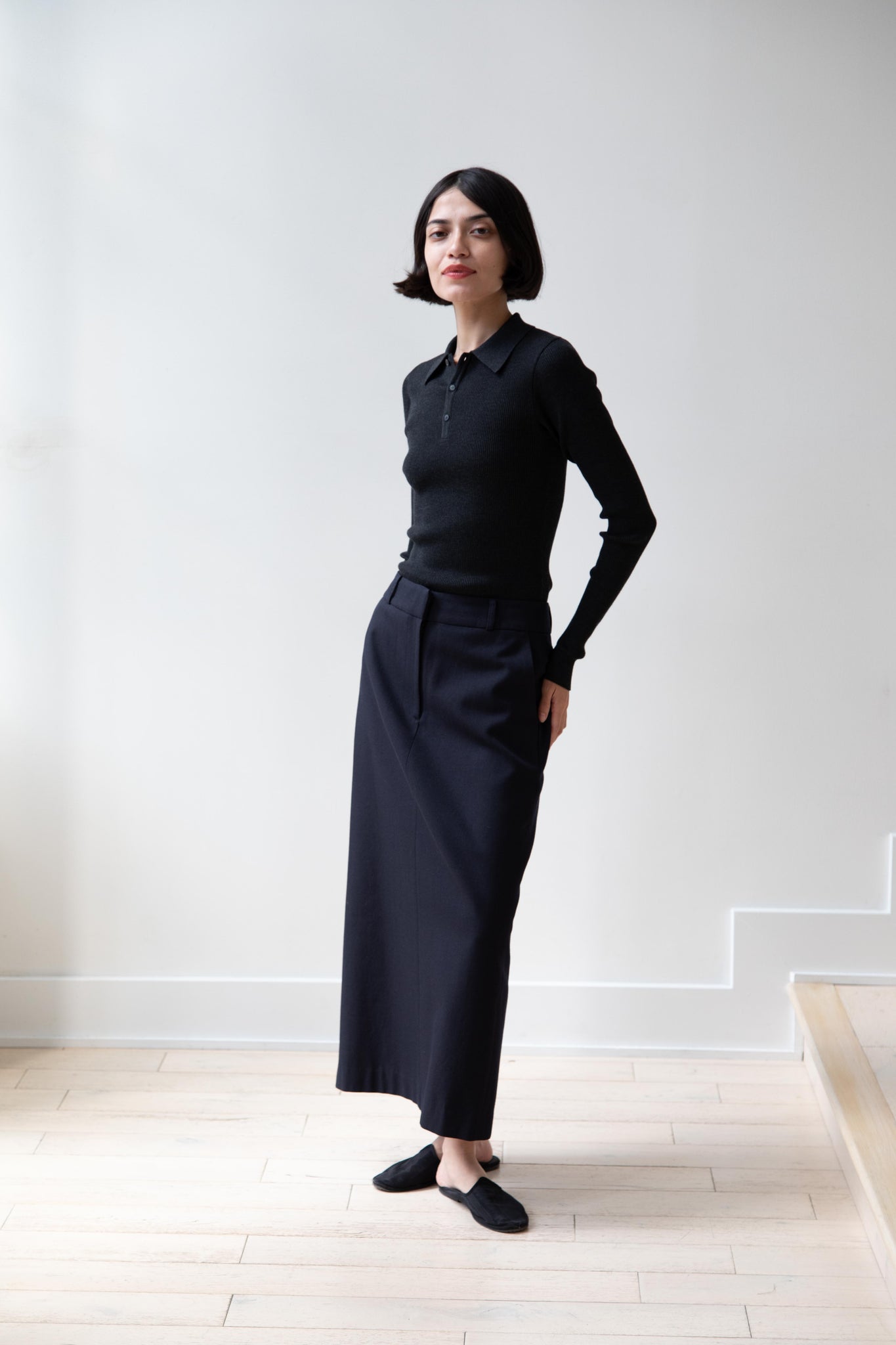 This slim fit pencil skirt is an everyday piece you will turn to time and again.  Made from a twill navy wool, it's also fully lined.  There are side pockets and belt loops, the addition of a belt makes such a nice touch with this skirt.
