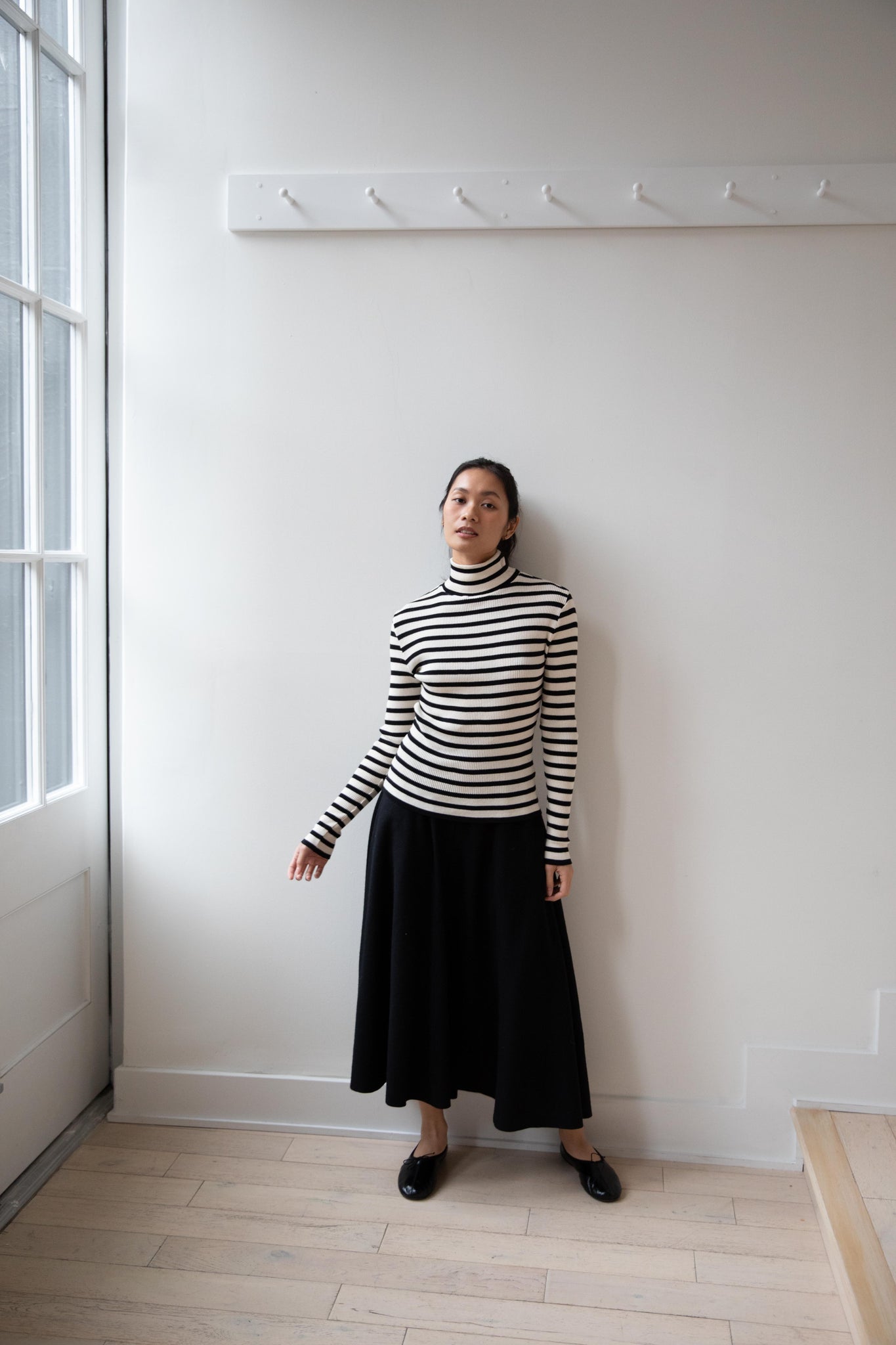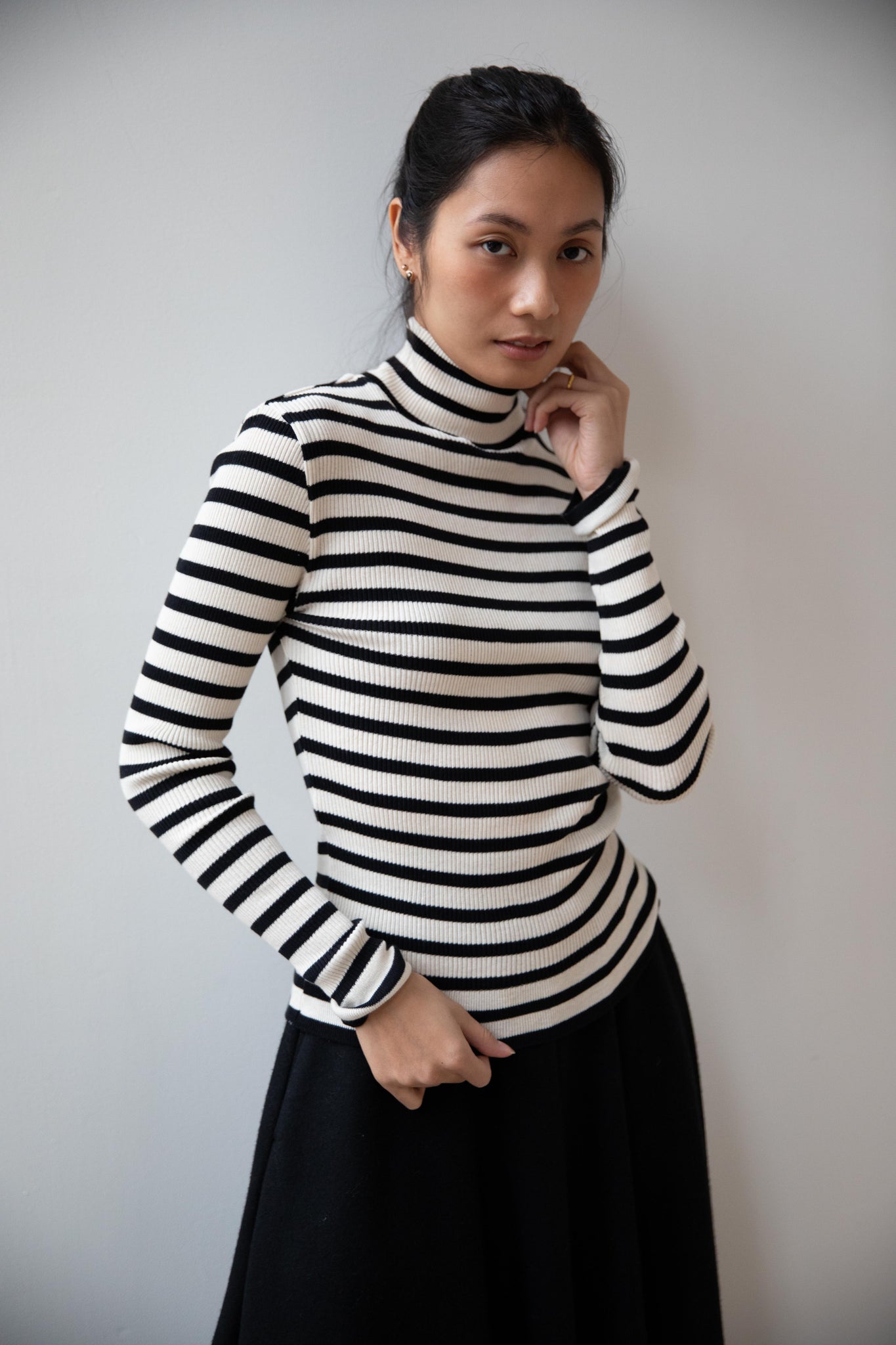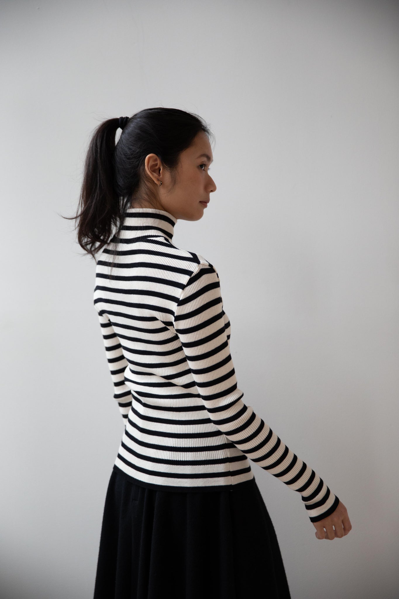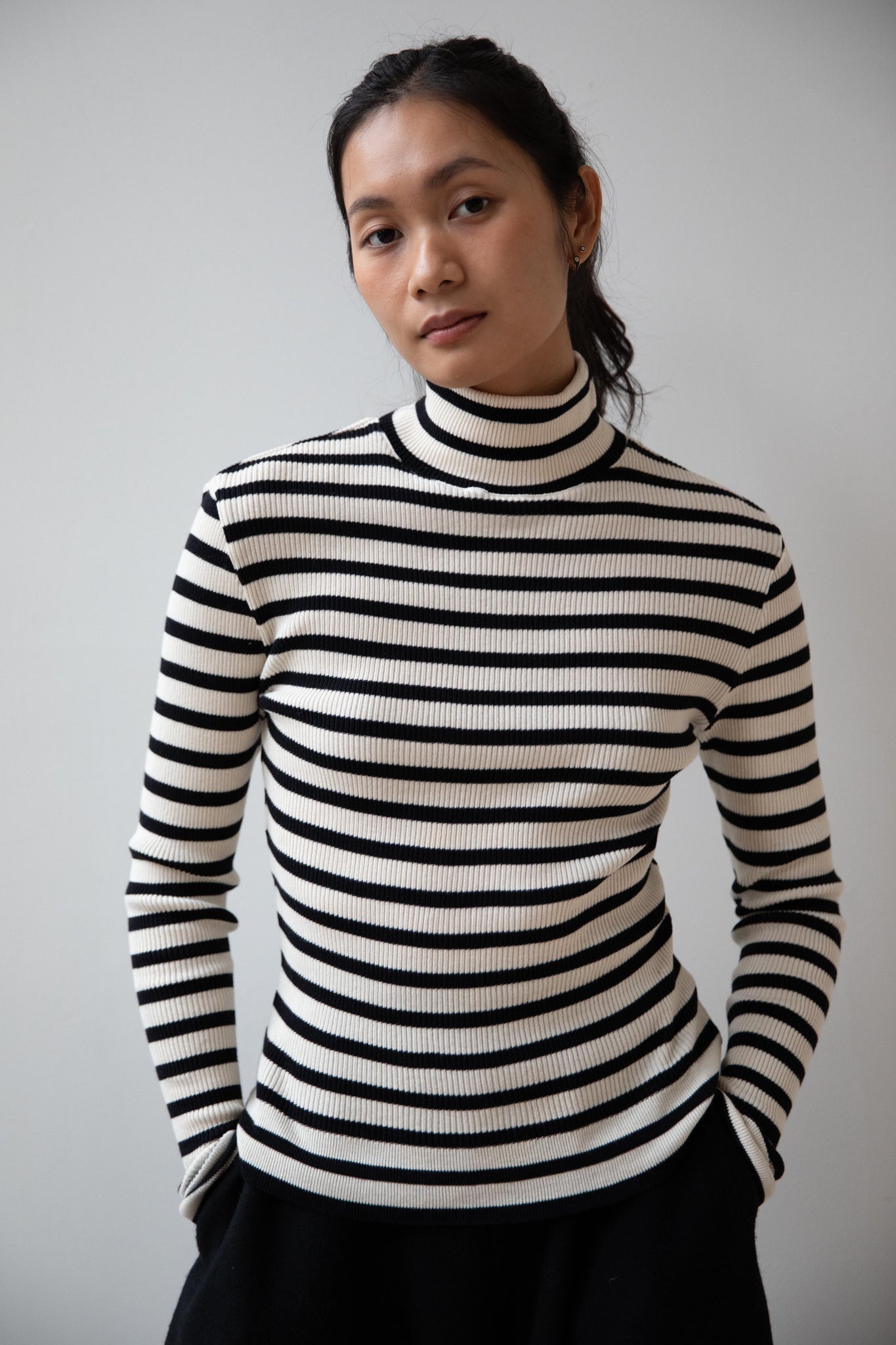 This ribbed turtleneck is made from a soft cotton with a natural and black stripe running across it. It has a mock neck and is great for year round wear.
