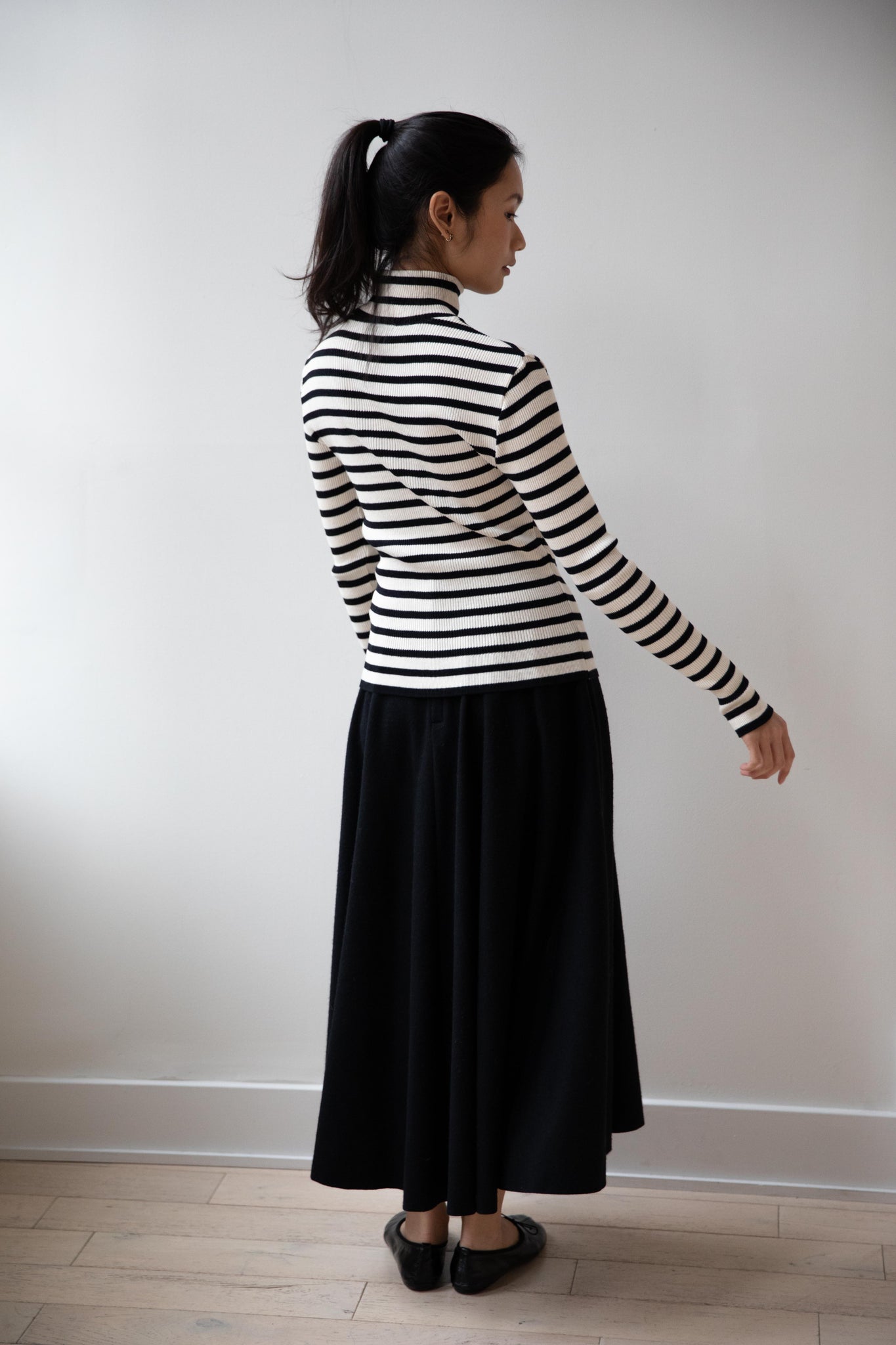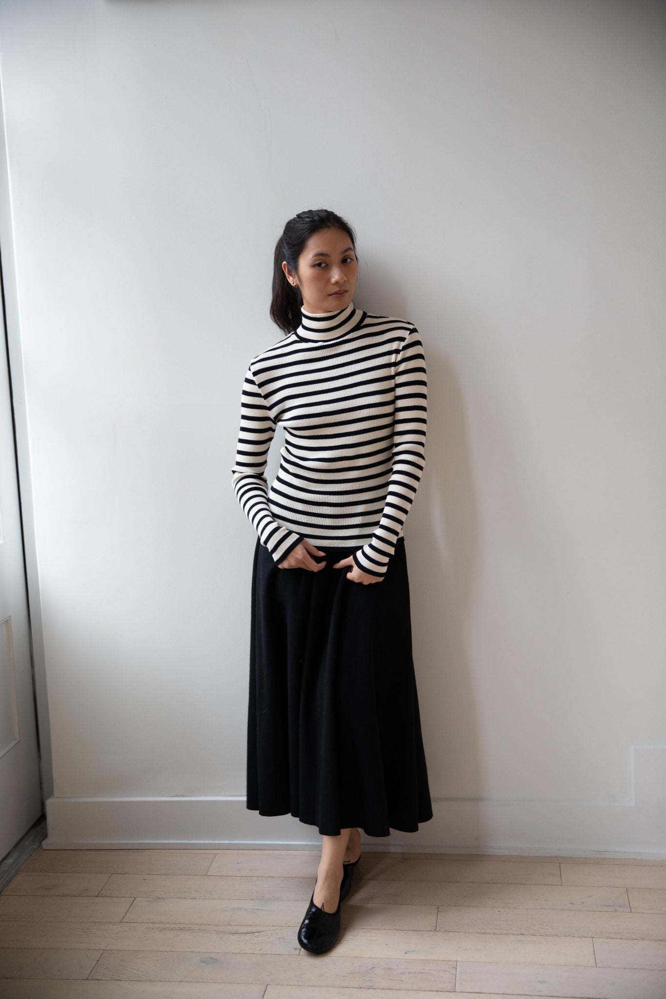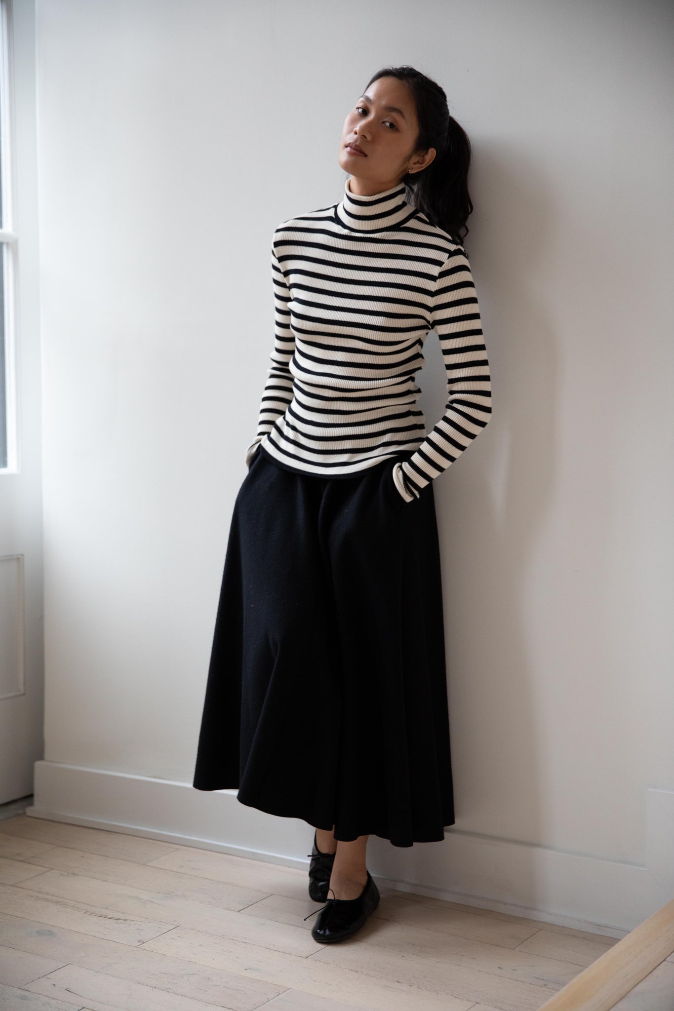 This ribbed turtleneck is made from a soft cotton with a natural and black stripe running across it. It has a mock neck and is great for year round wear.