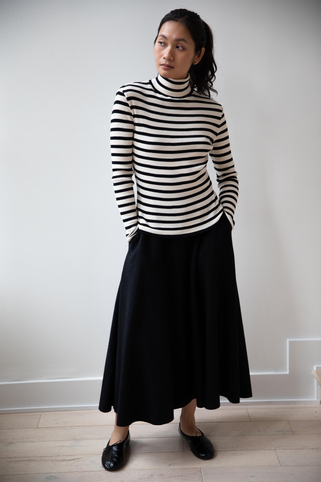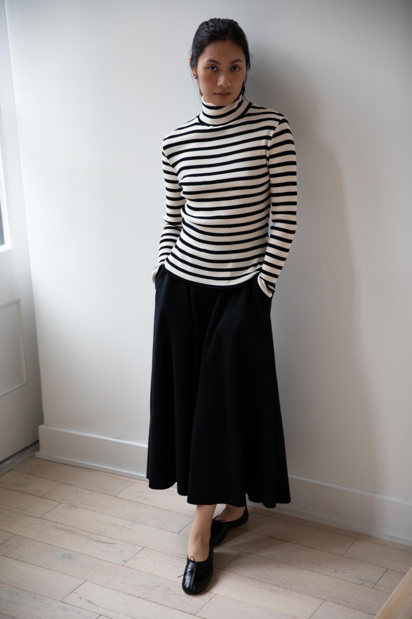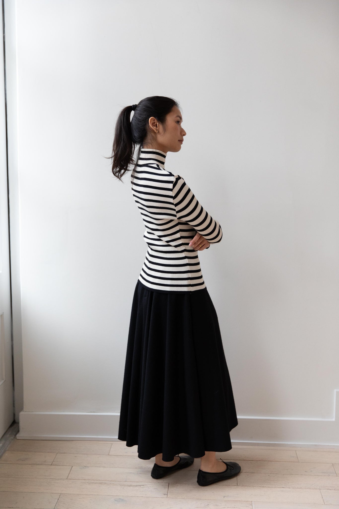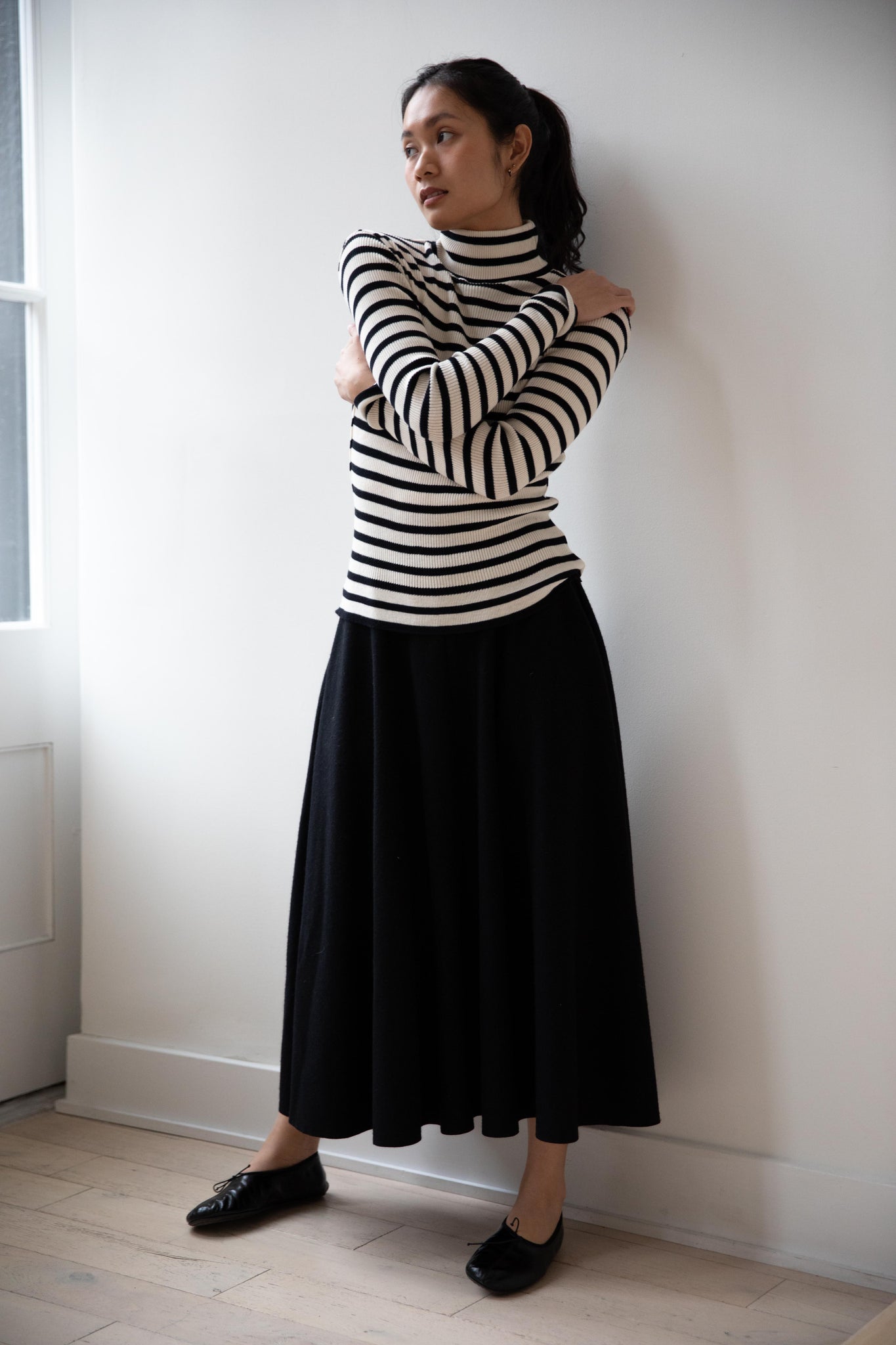 This ribbed turtleneck is made from a soft cotton with a natural and black stripe running across it. It has a mock neck and is great for year round wear.